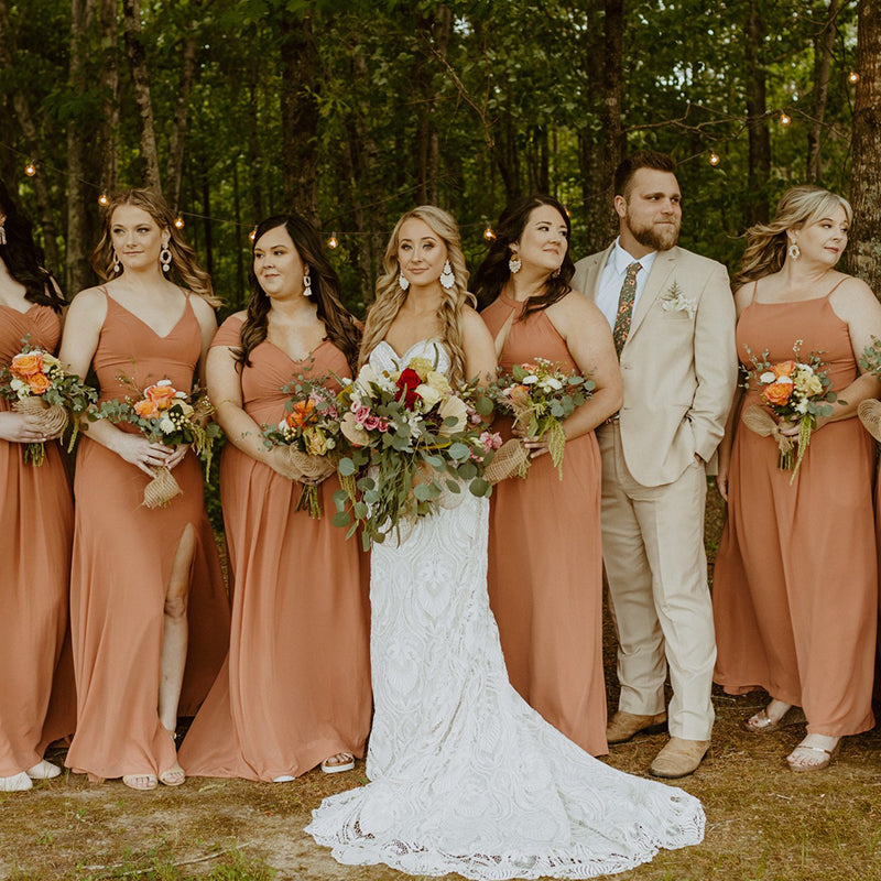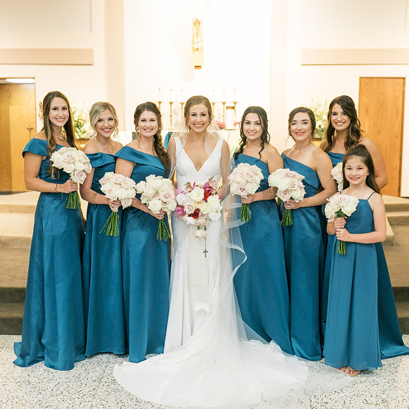 One option is to select a consistent color for all the bridesmaid dresses while allowing each bridesmaid to choose her preferred style. This method ensures a cohesive look among your bridal party while enabling them to showcase their unique personalities. It’s a perfect blend of unity and individuality!