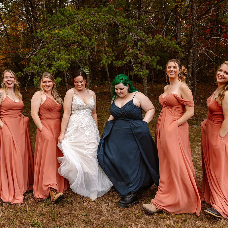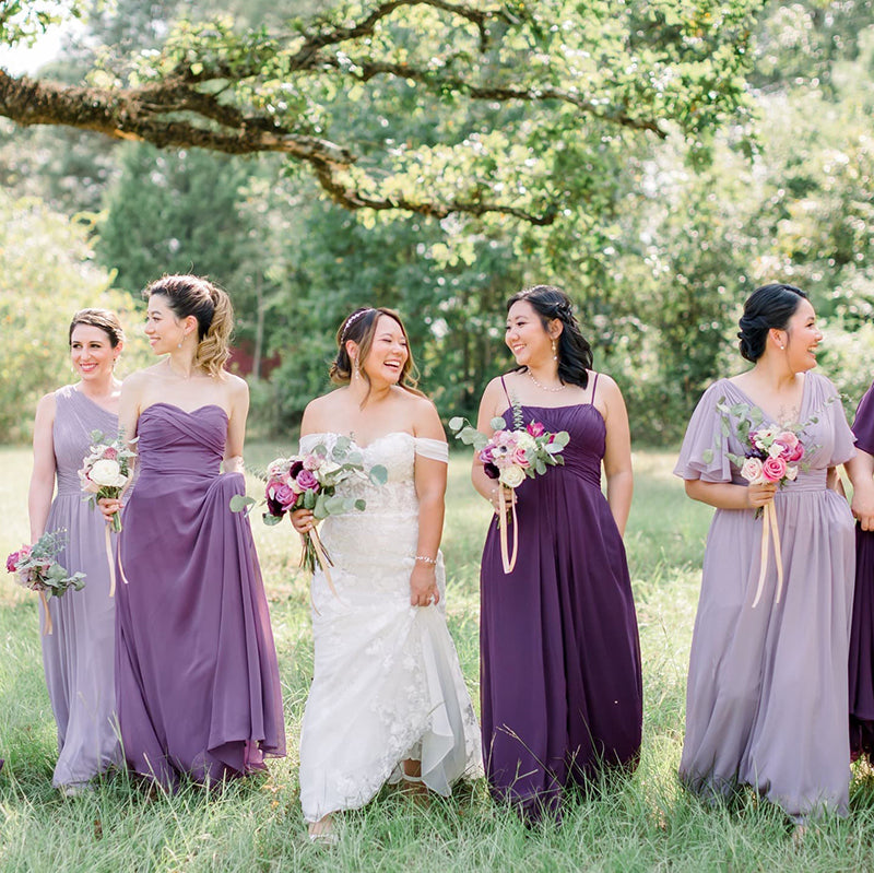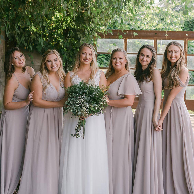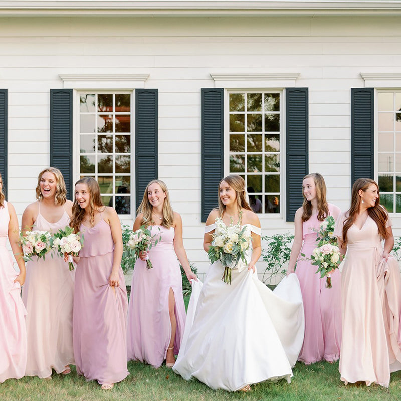 Another approach is to choose the same dress style for all your bridesmaids while allowing them the freedom to select different colors from a shared palette. For example, you could opt for a flowing chiffon dress with a sweetheart neckline and let your bridesmaids choose from various shades of pink, such as blush, rose, and dusty pink. This creates a cohesive look while celebrating each bridesmaid's individuality.
