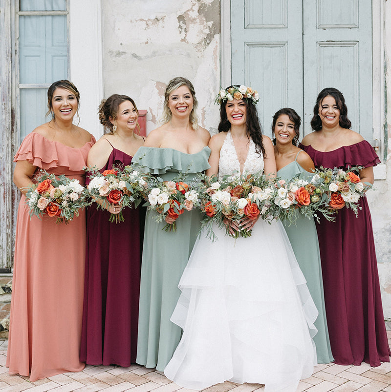The third option is to mix and match different styles and colors of dresses, ideal for brides seeking a more eclectic and unique look for their bridesmaids. You can choose a combination of long and short dresses, various fabrics, and a diverse color palette. This approach adds personality and flair to your bridal party while allowing each bridesmaid to express her individual style.