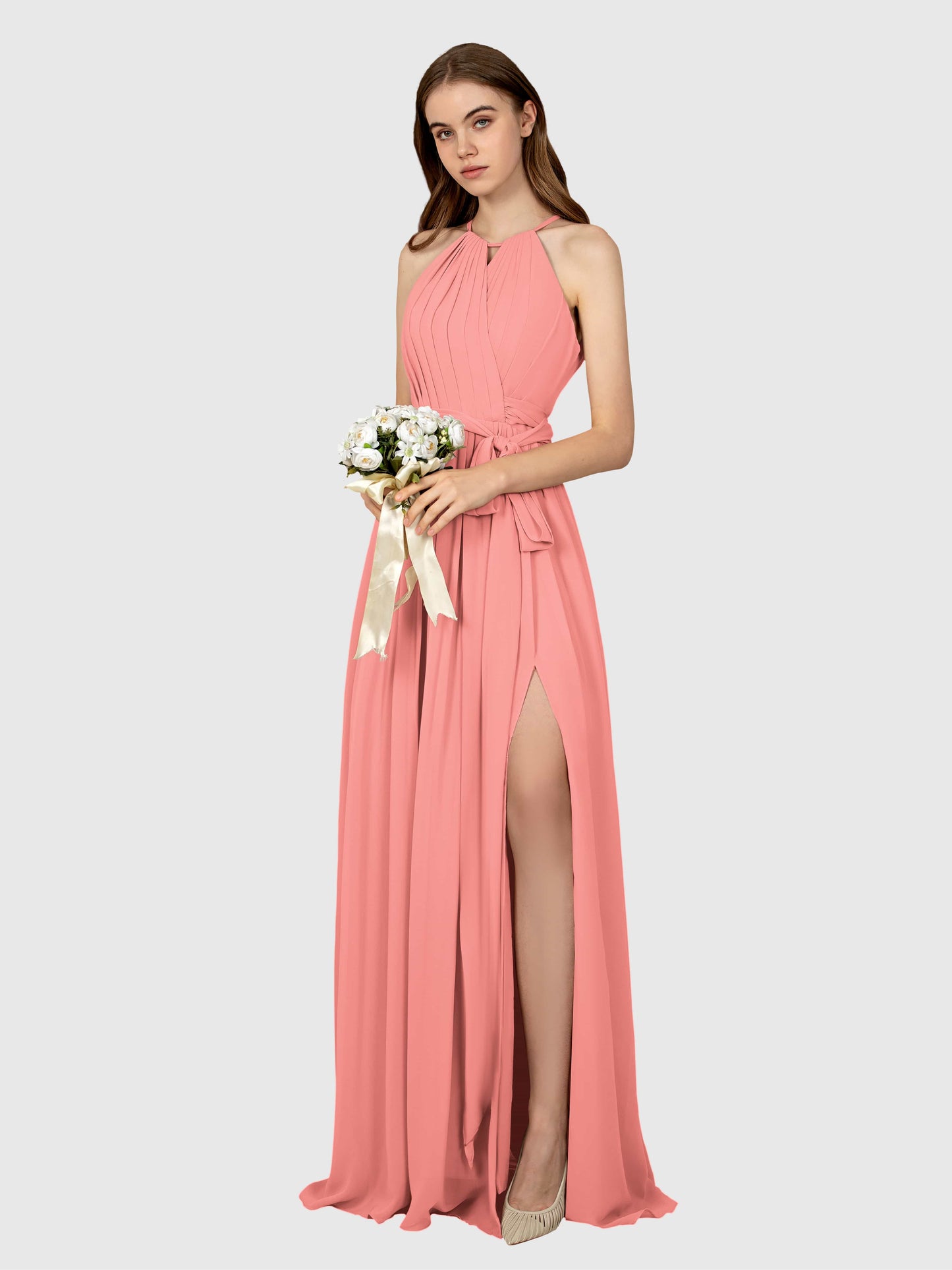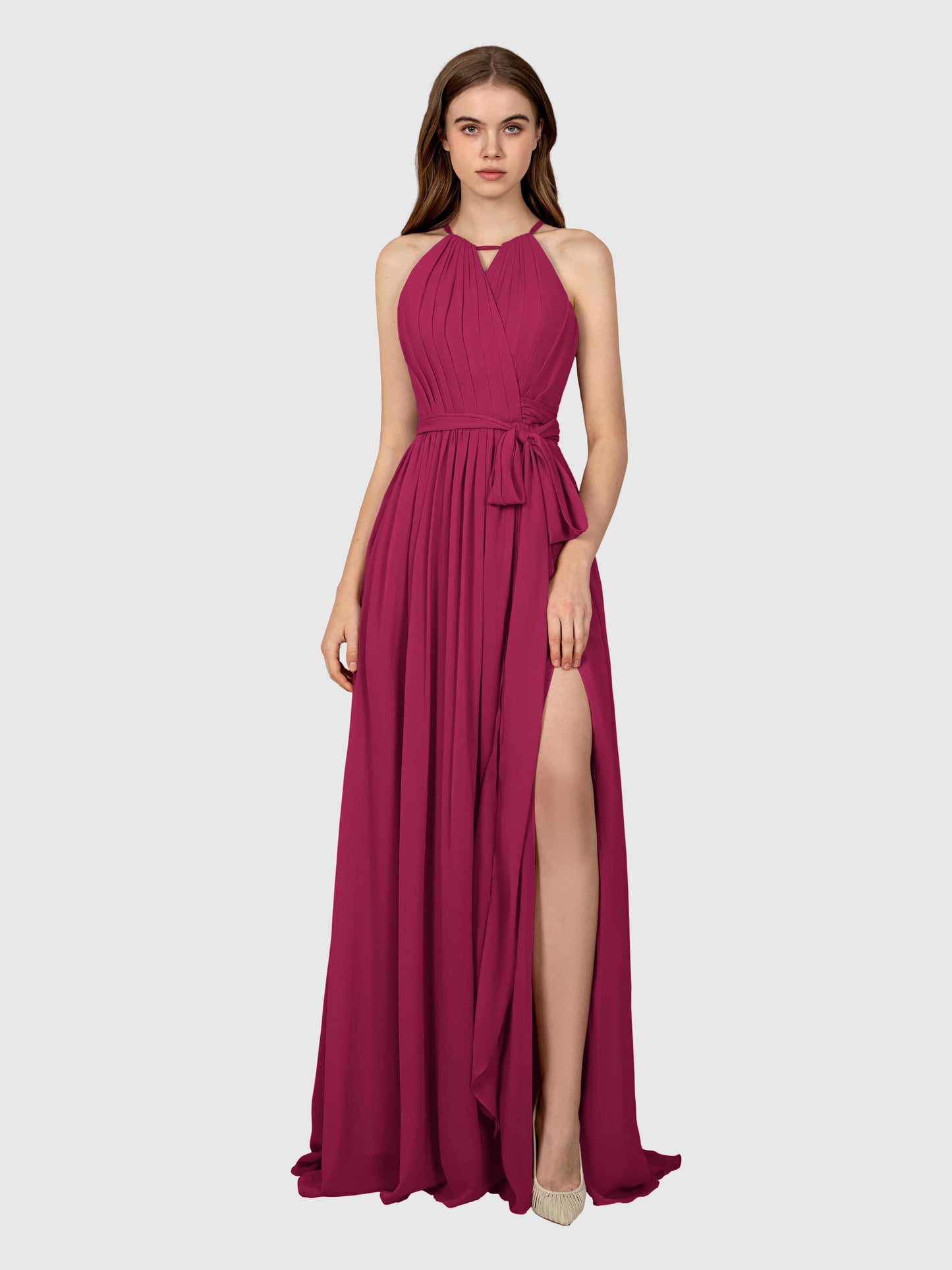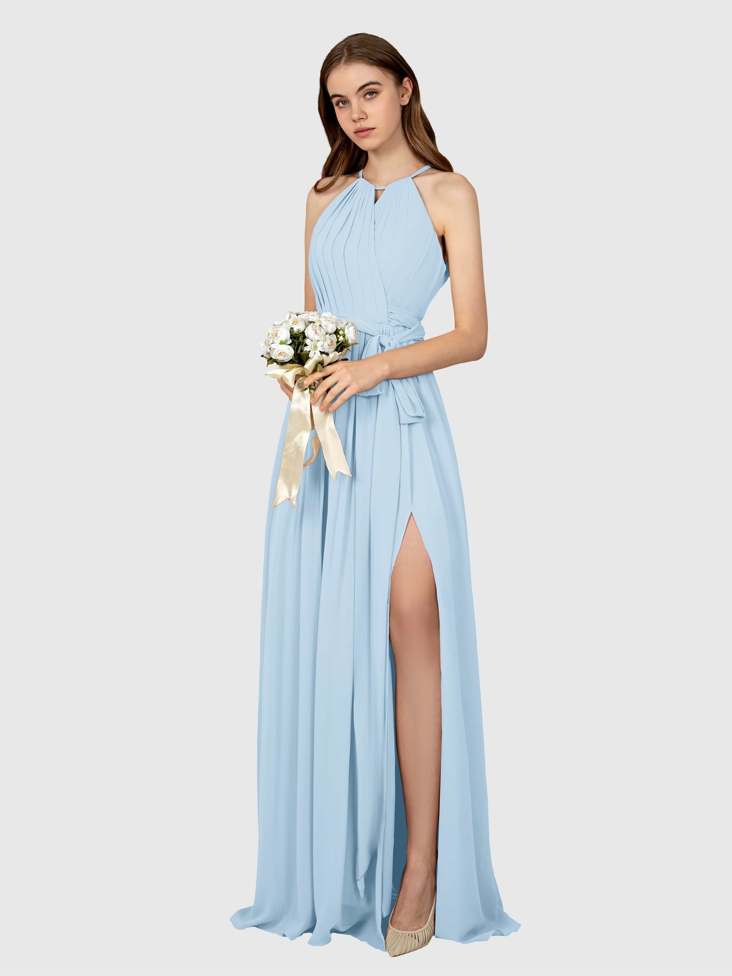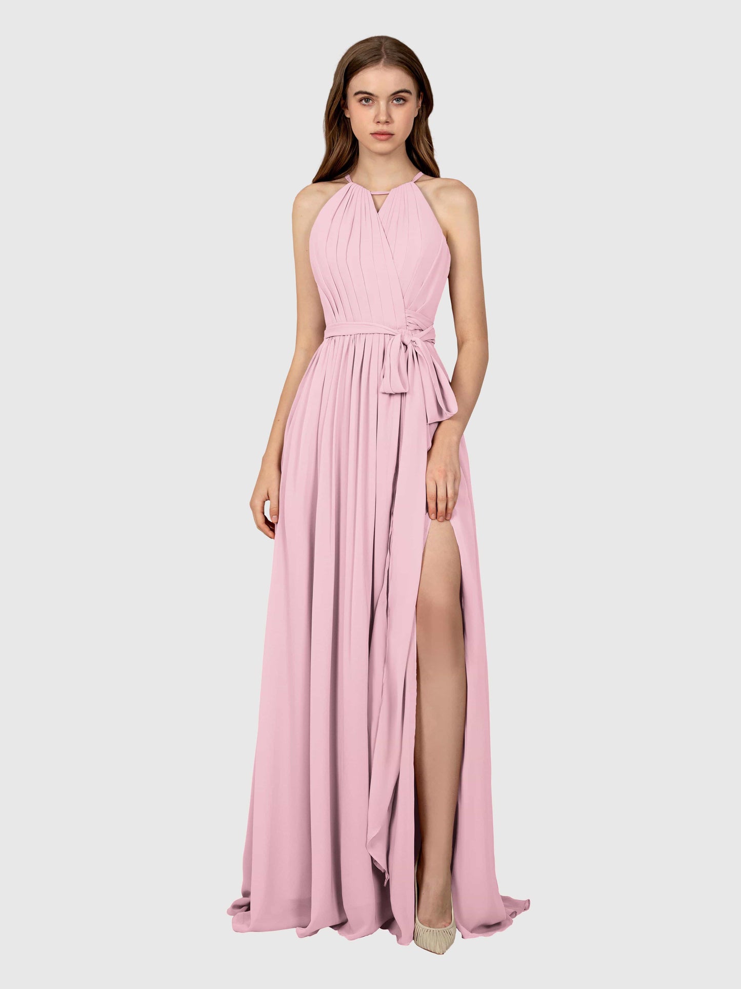 This dress was a total win for my sister's wedding! The chiffon flows so nicely, and the halter neck made it super flattering. Got tons of compliments all night.