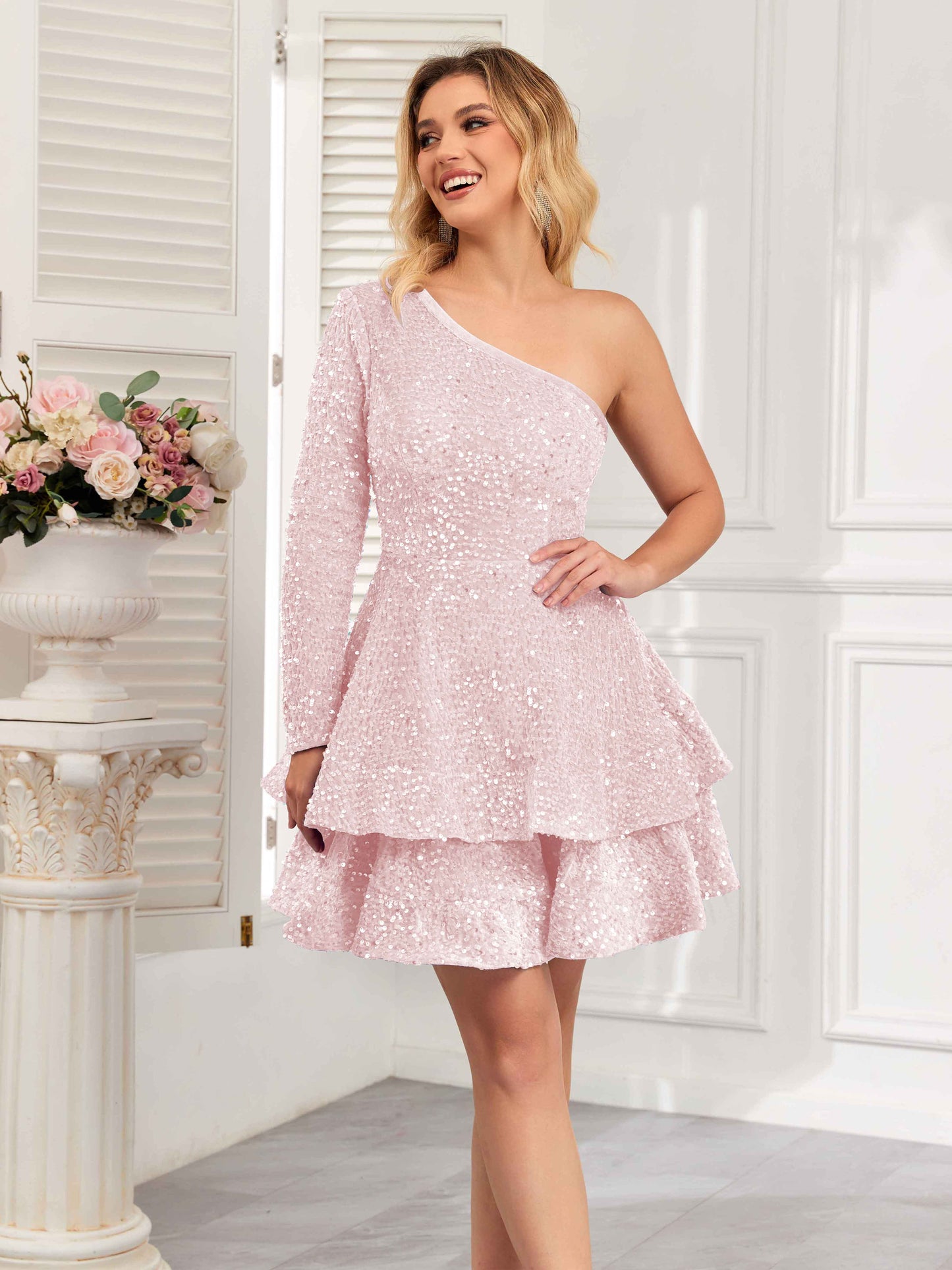 Charming One Shoulder Long Sleeve Tiered Sequin Homecoming Dresses UK
