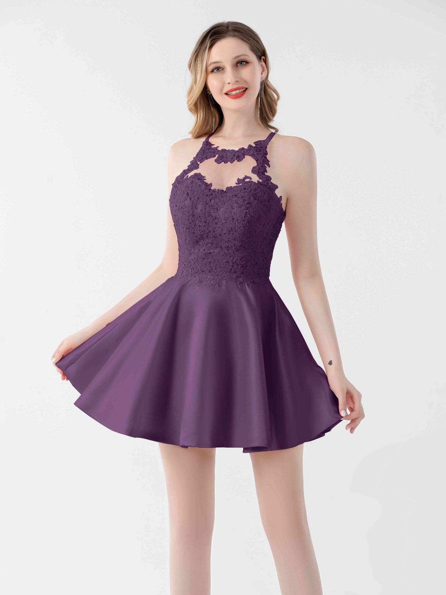 • Exude elegance with Mollevers' Mini Satin Party Dresses. These dresses combine sophistication and allure with their sleeveless design and illusion lace appliques adorned with delicate beading.