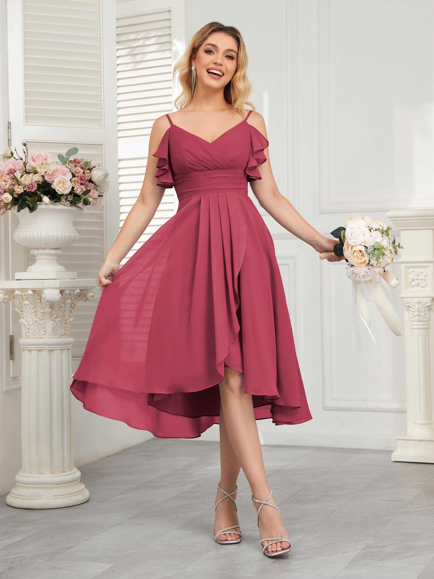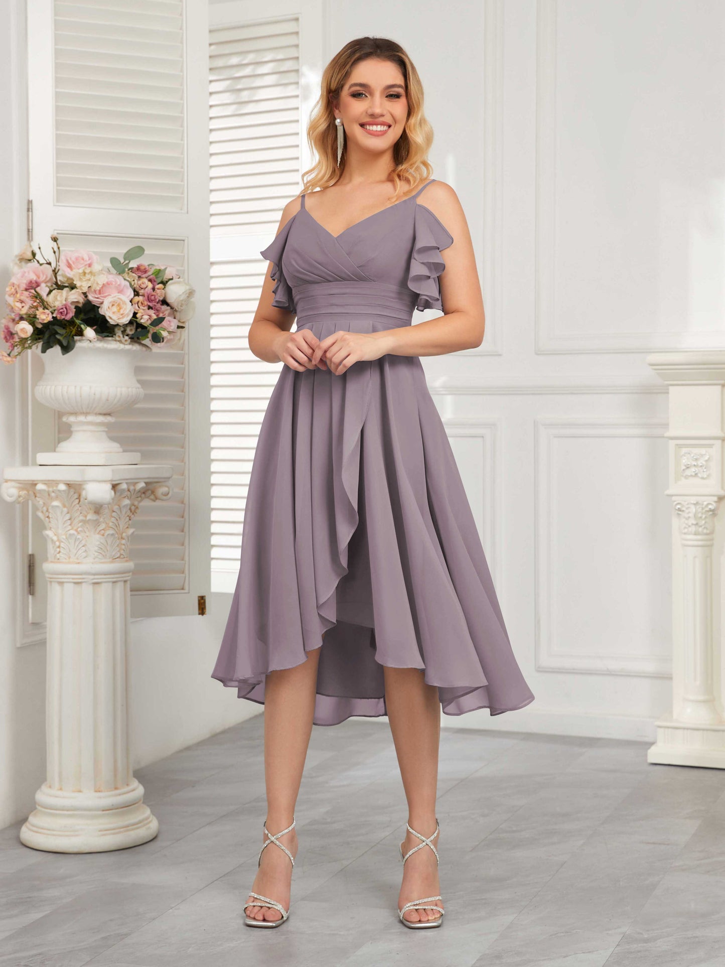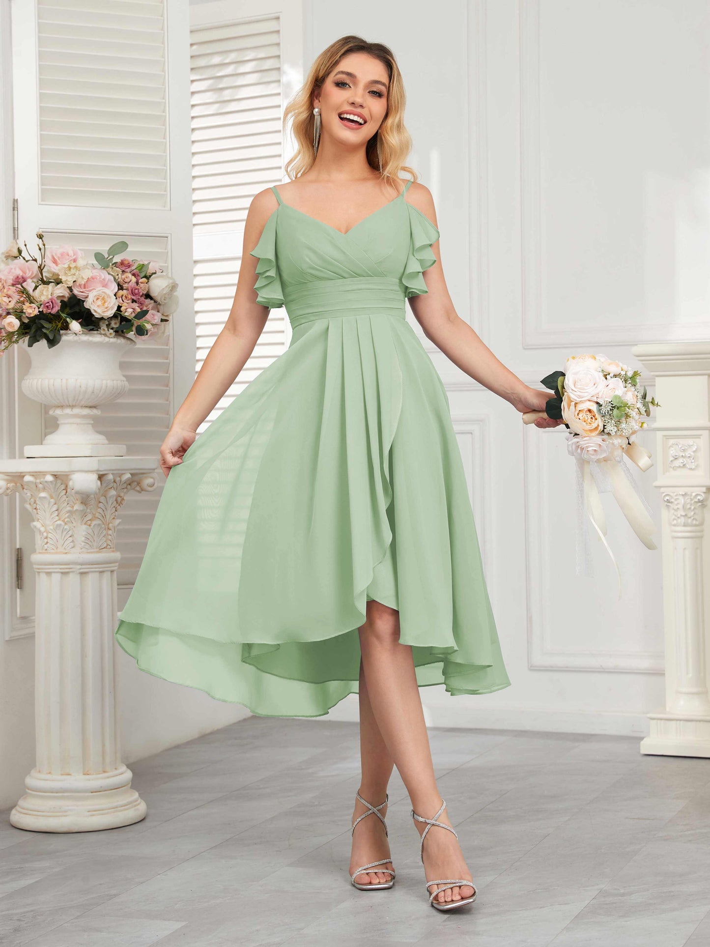 • Grace your special day with the Delicate Sleeveless Ruffles Ruched High Low Chiffon Bridesmaid Dress from Mollyevers. Featuring soft ruffles, a flattering ruched bodice, and a stylish high-low hem, this chiffon dress combines elegance and comfort for a stunning bridesmaid look. Perfect for any wedding.
