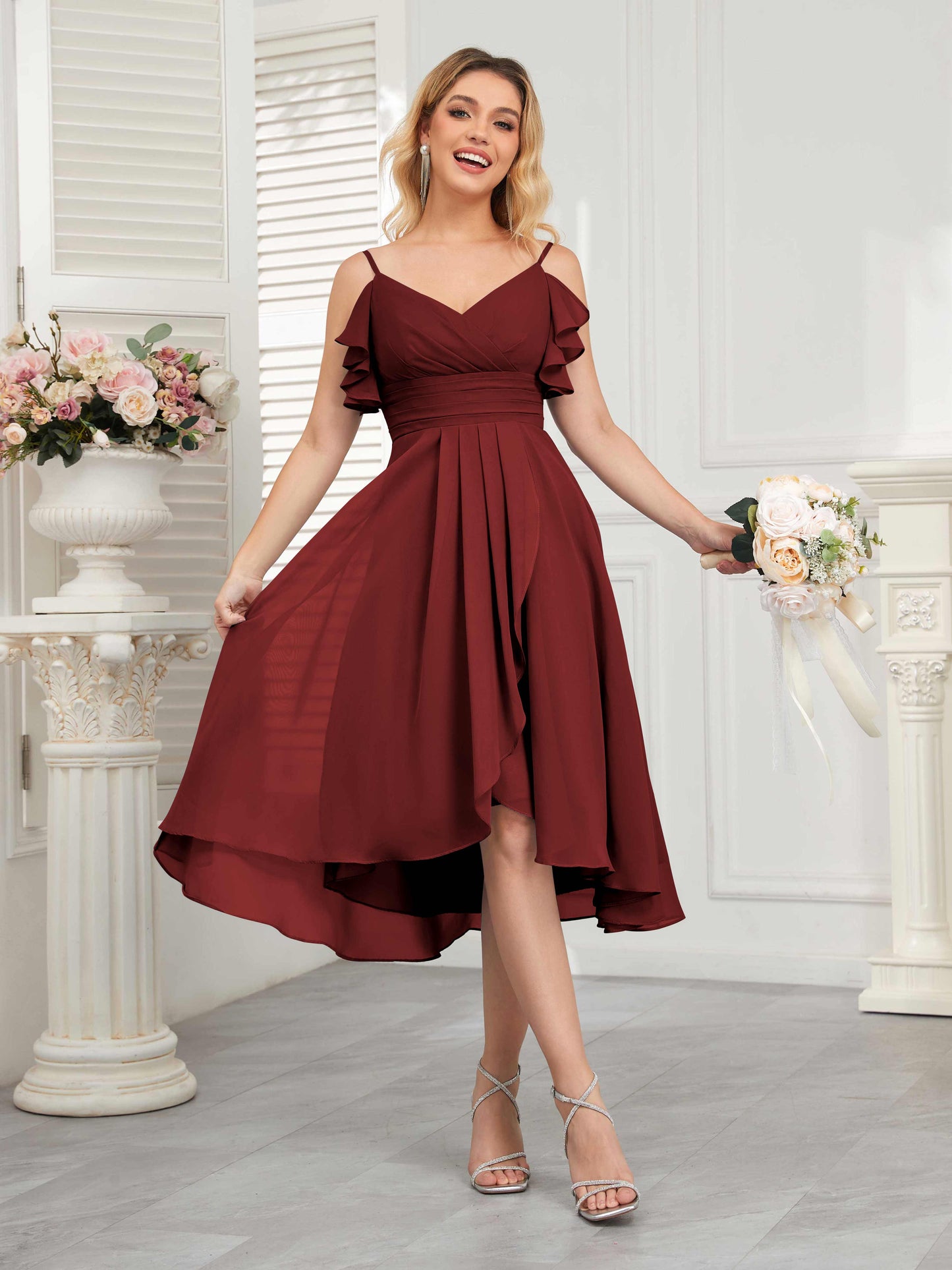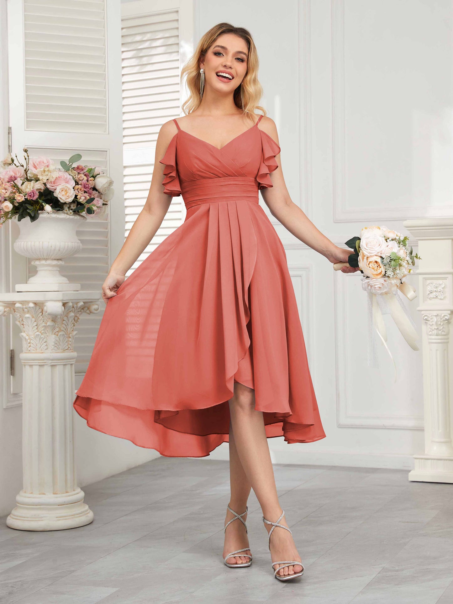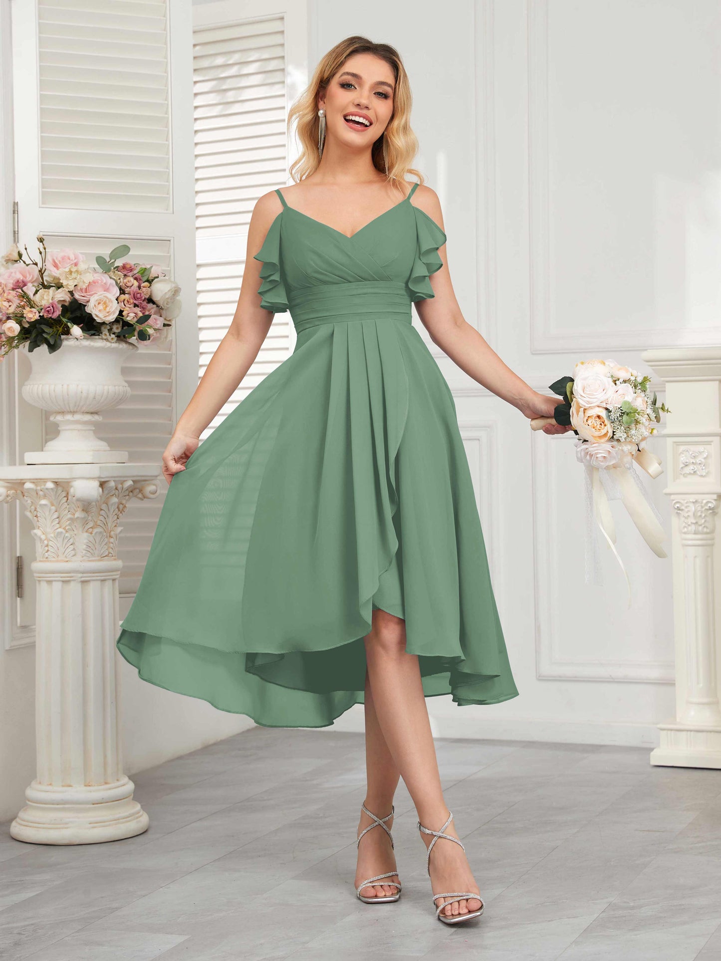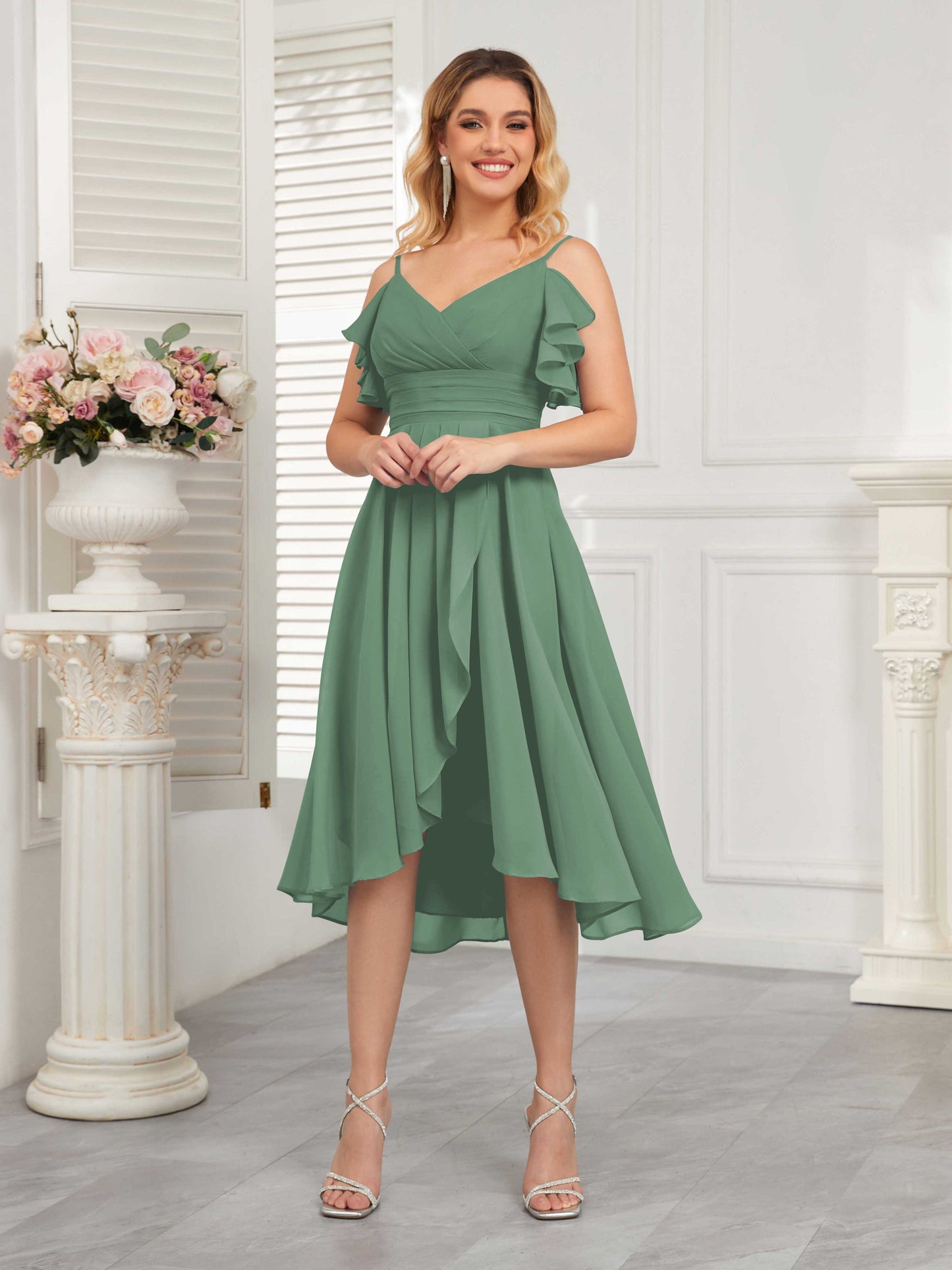 • Grace your special day with the Delicate Sleeveless Ruffles Ruched High Low Chiffon Bridesmaid Dress from Mollyevers. Featuring soft ruffles, a flattering ruched bodice, and a stylish high-low hem, this chiffon dress combines elegance and comfort for a stunning bridesmaid look. Perfect for any wedding.