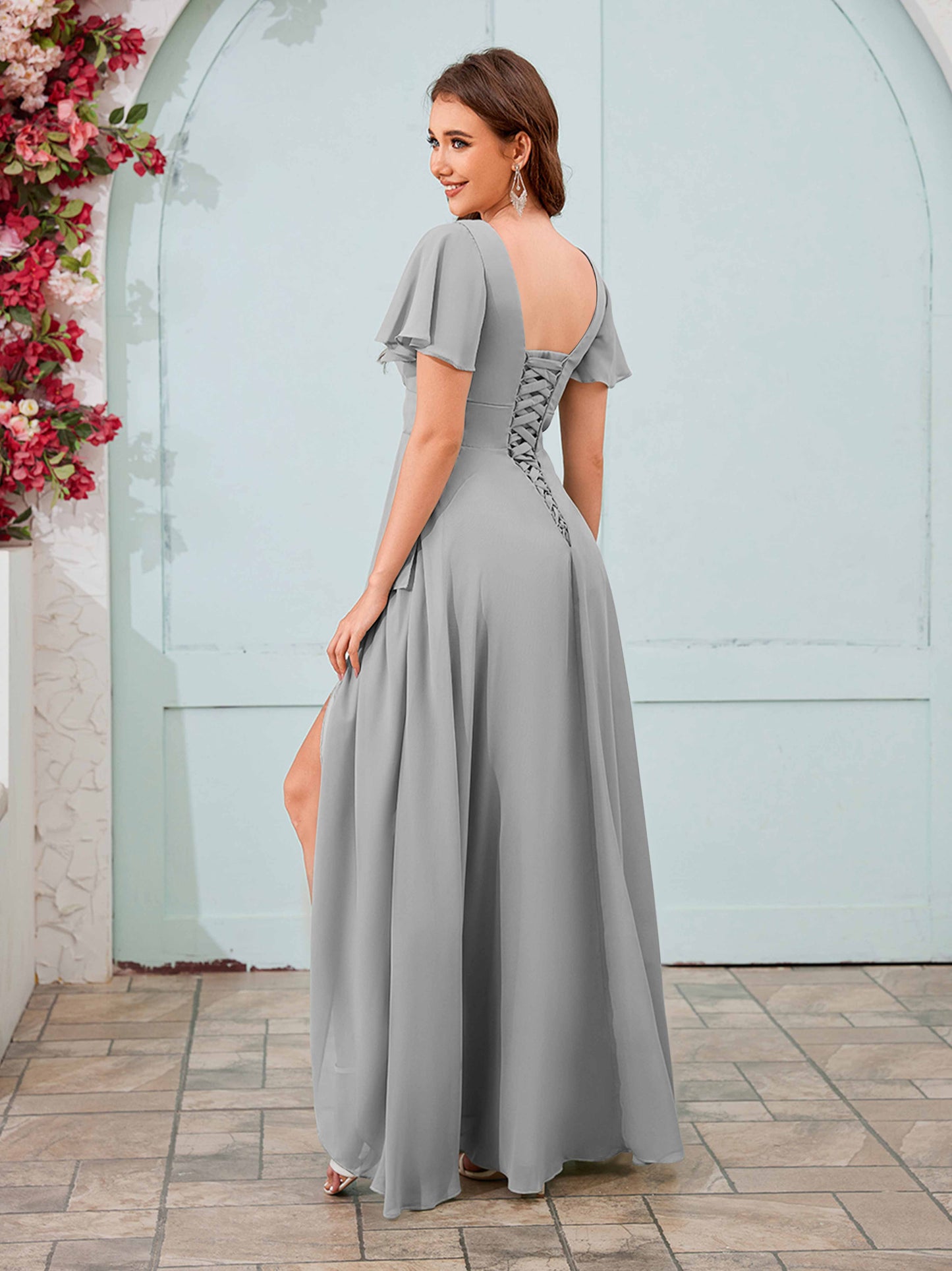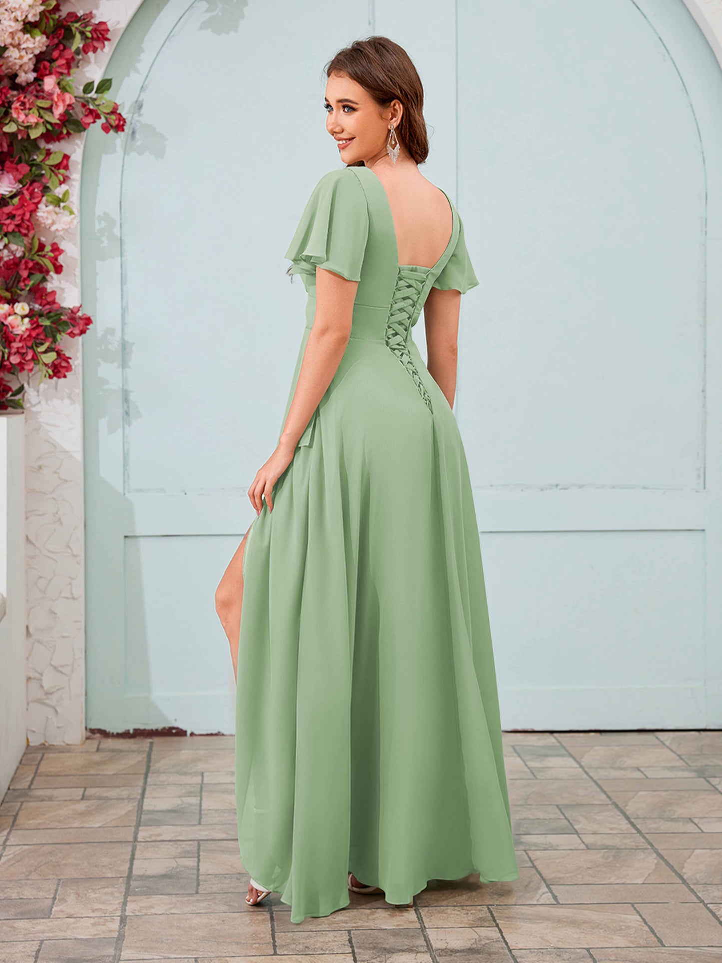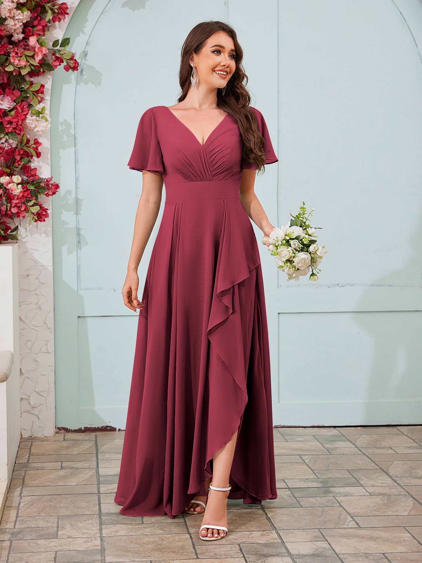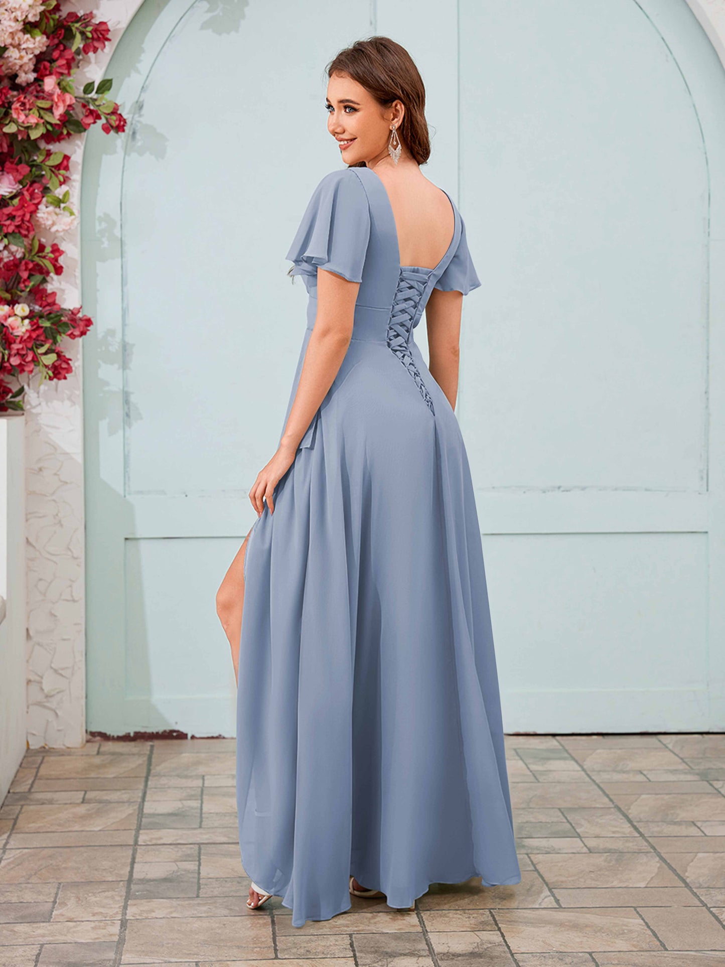 • Discover elegance with Mollyevers' Delicate V-Neck Short Sleeves Slit Maxi Chiffon Bridesmaid Dresses. Designed with a soft V-neckline, airy short sleeves, and a stylish slit, this flowing chiffon gown offers comfort and sophistication, making it perfect for weddings or formal events.