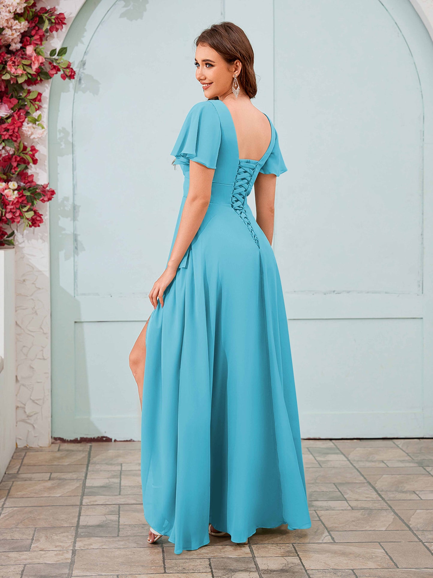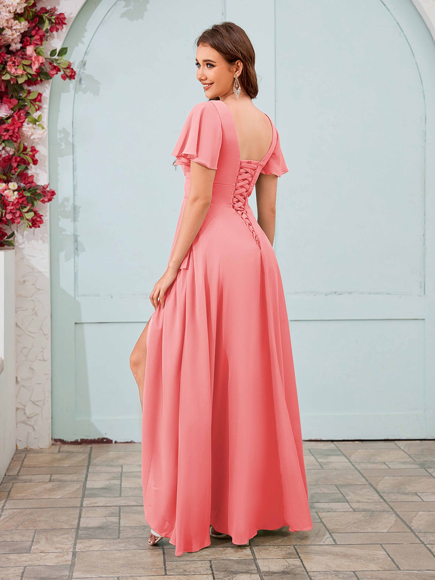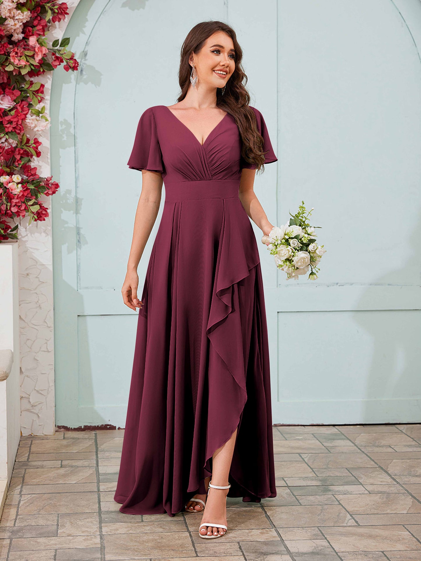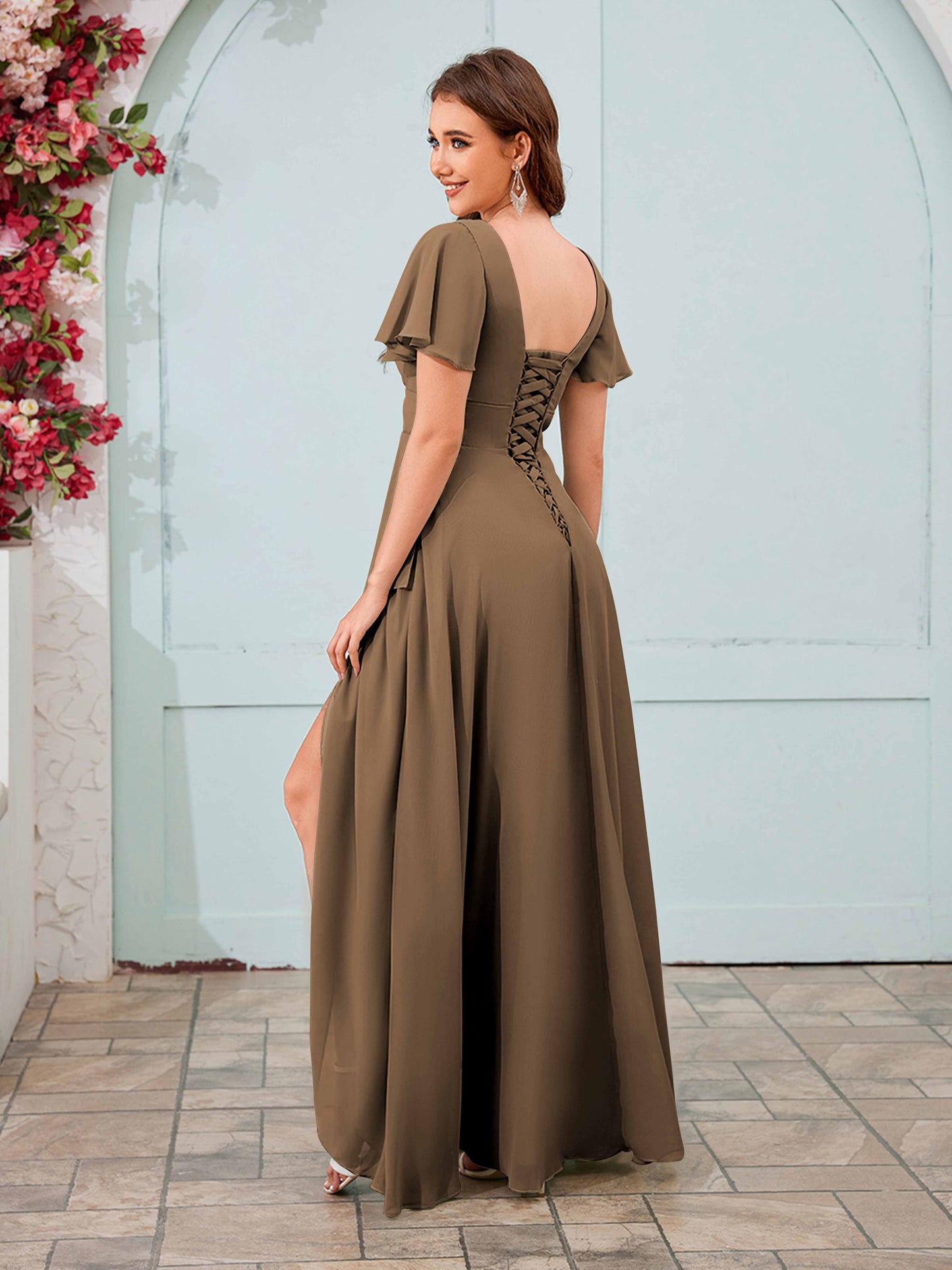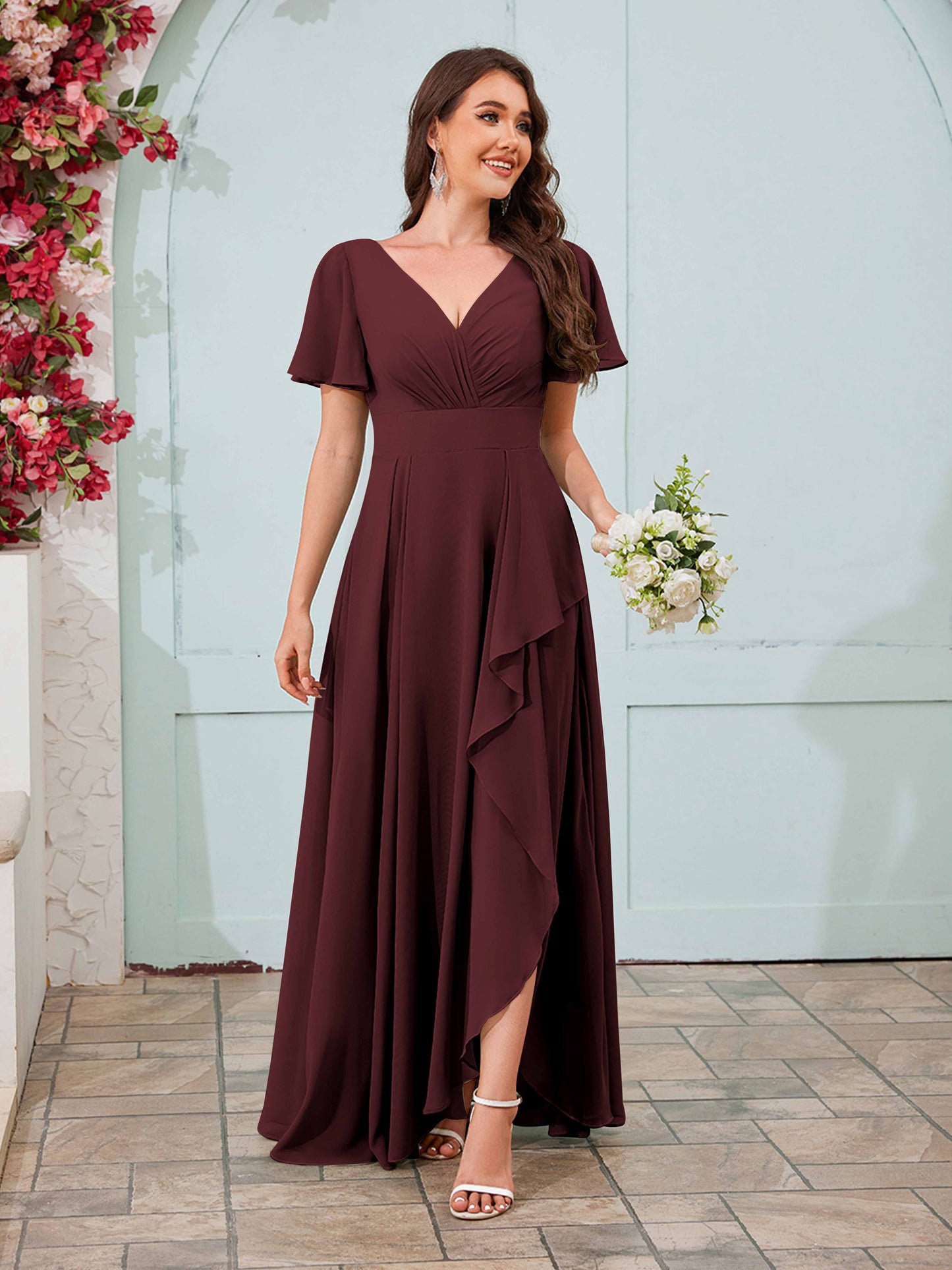 • Discover elegance with Mollyevers' Delicate V-Neck Short Sleeves Slit Maxi Chiffon Bridesmaid Dresses. Designed with a soft V-neckline, airy short sleeves, and a stylish slit, this flowing chiffon gown offers comfort and sophistication, making it perfect for weddings or formal events.