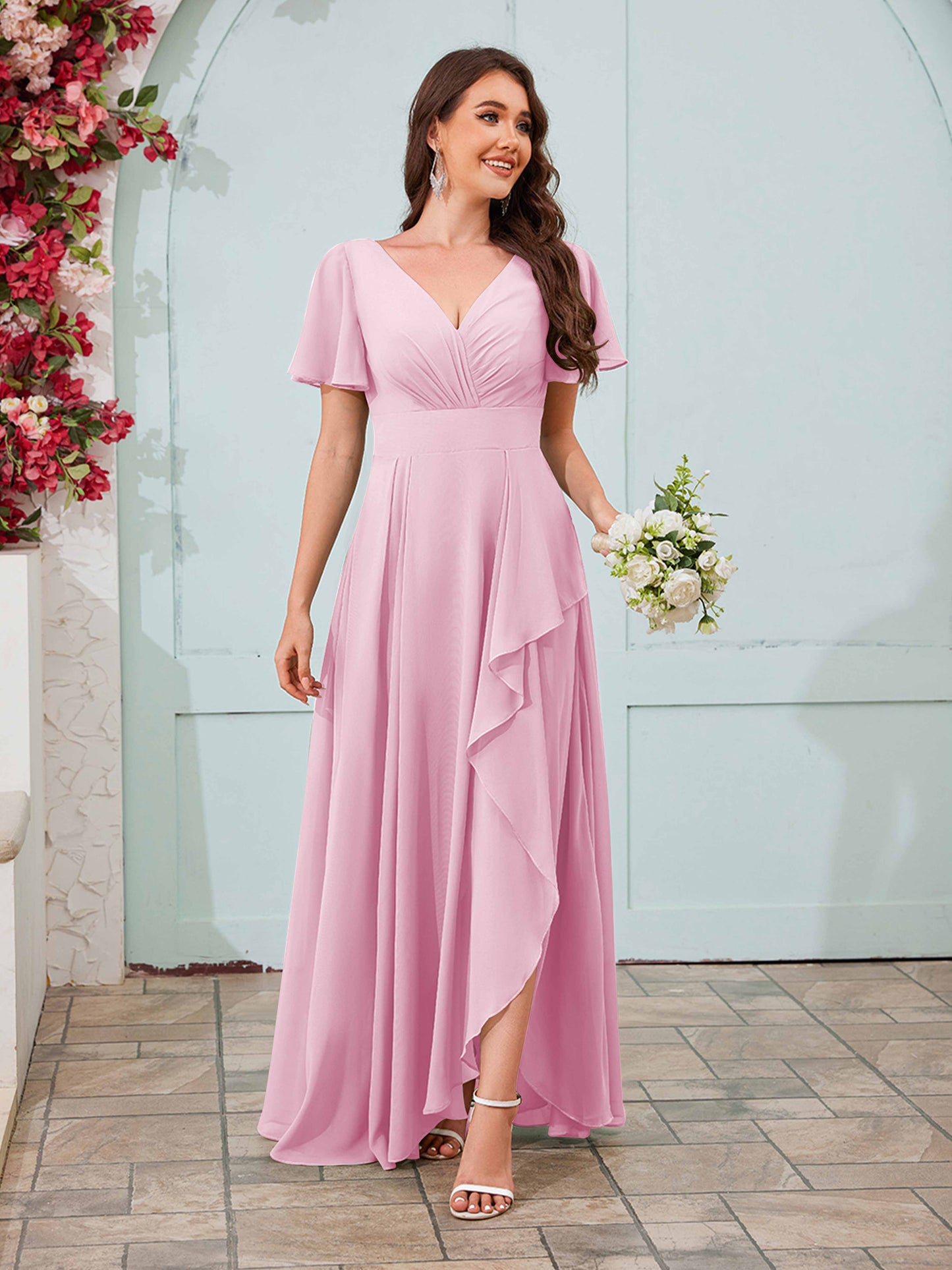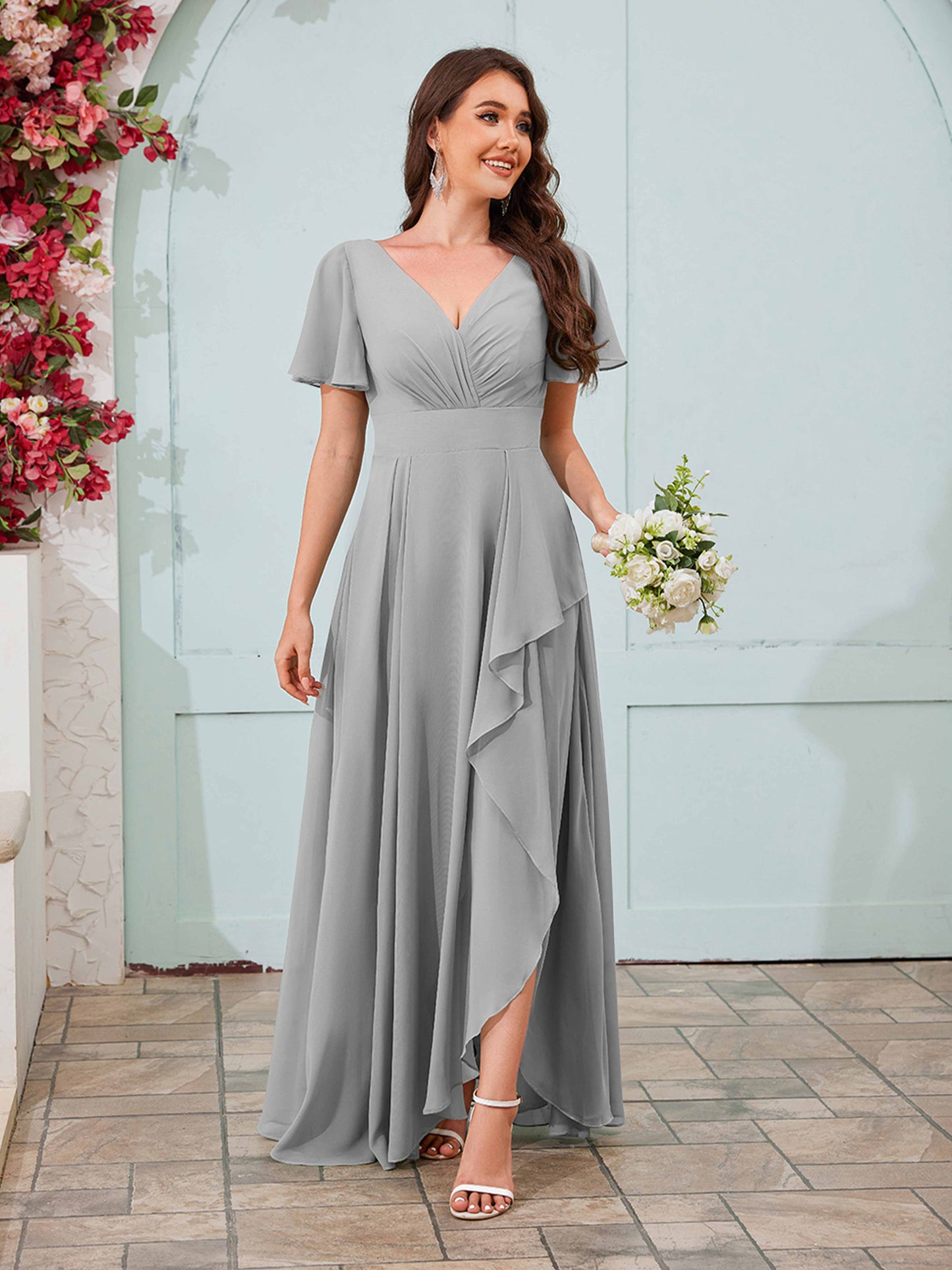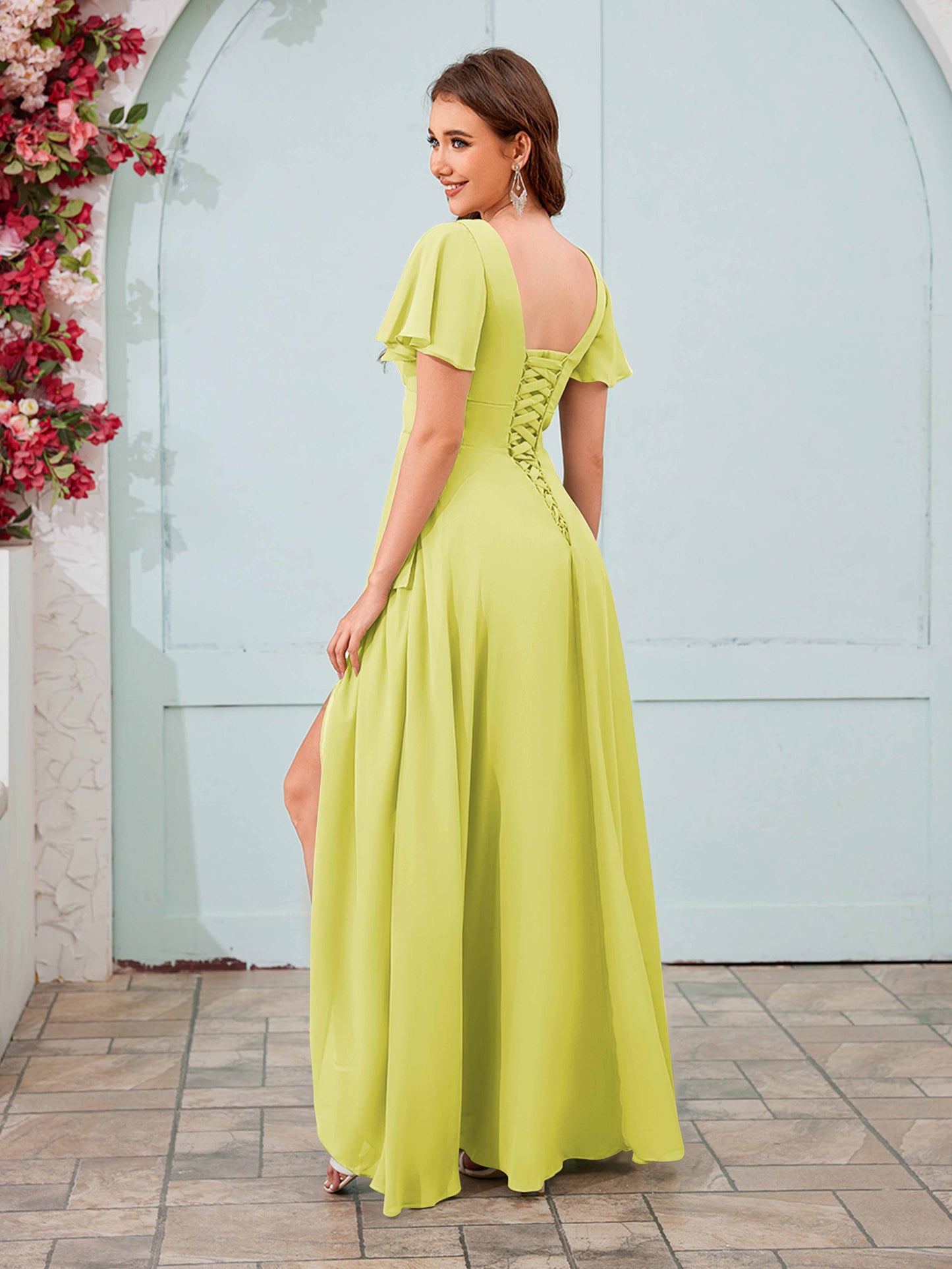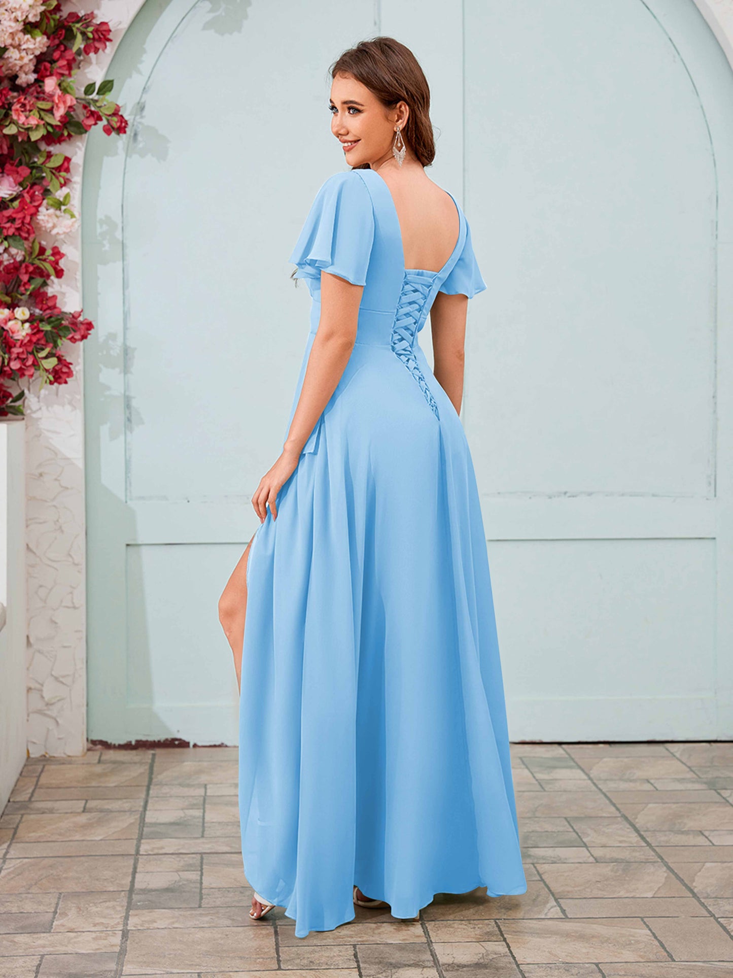 • Discover elegance with Mollyevers' Delicate V-Neck Short Sleeves Slit Maxi Chiffon Bridesmaid Dresses. Designed with a soft V-neckline, airy short sleeves, and a stylish slit, this flowing chiffon gown offers comfort and sophistication, making it perfect for weddings or formal events.