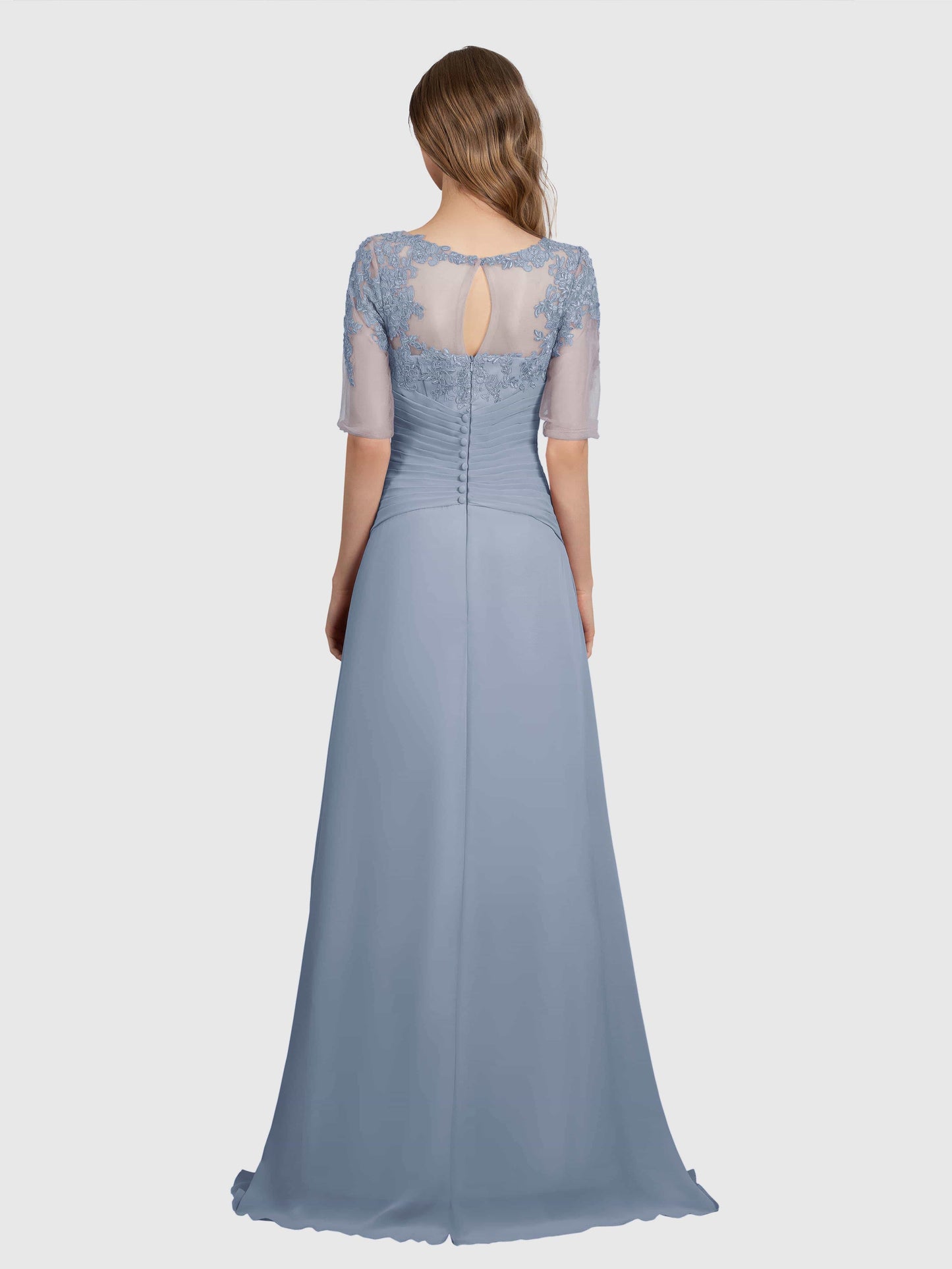 This dress twirls like a dream! The illusion lace neckline keeps it classy but fun, and it looks great in photos. Definitely a hit for the mother of the bride or bridesmaid duties.