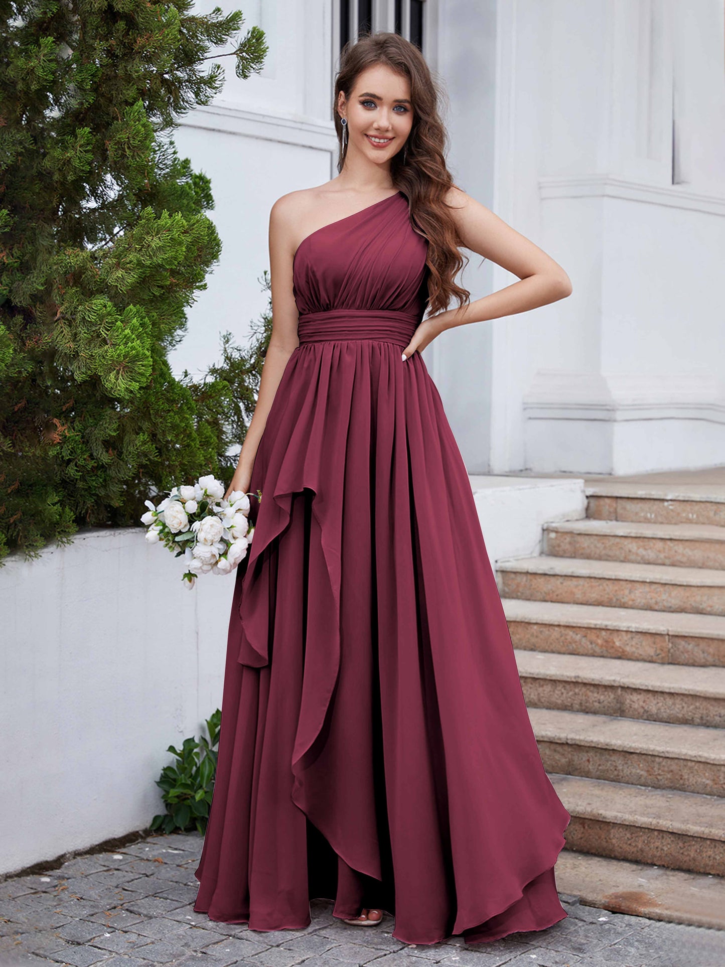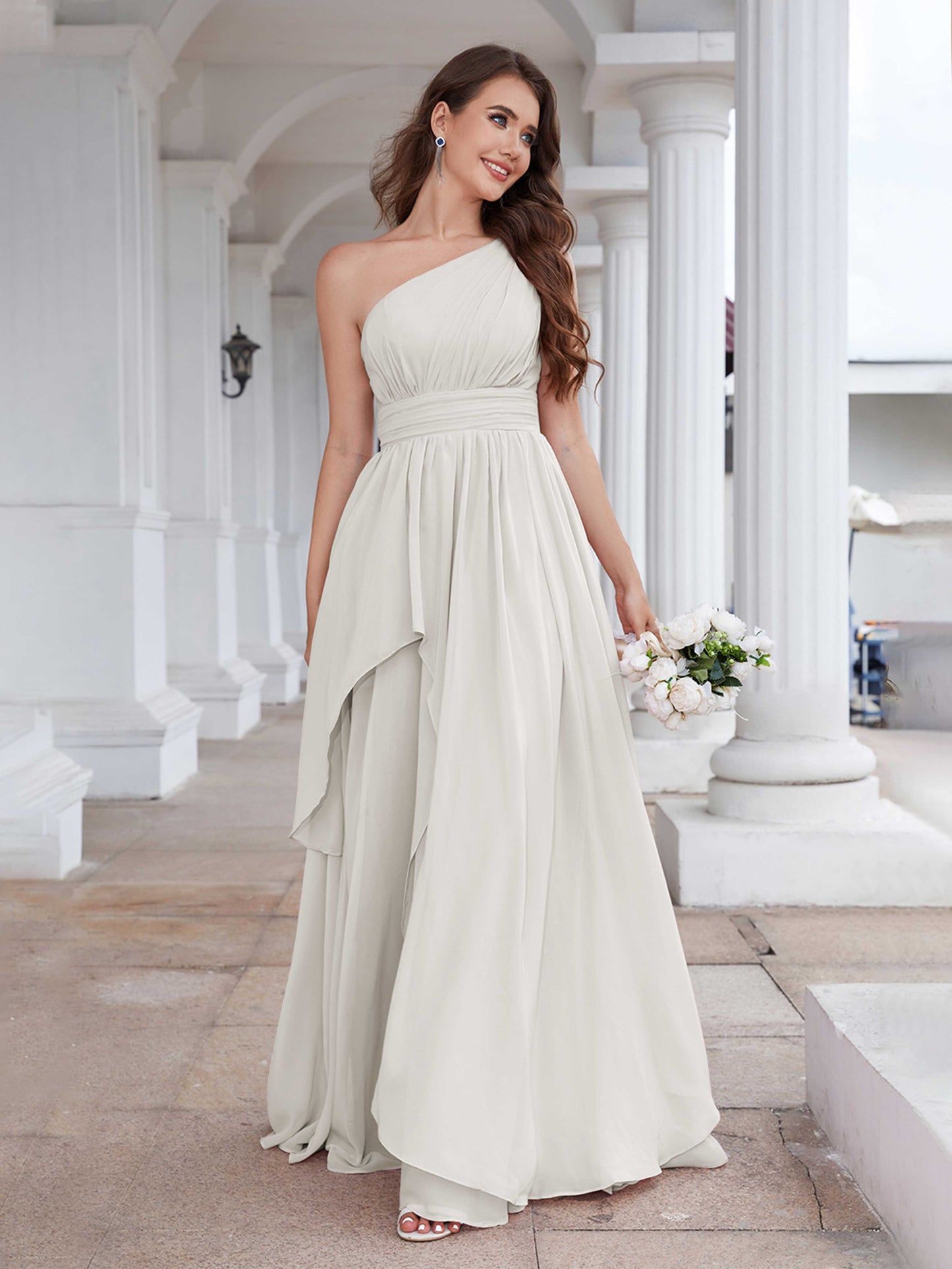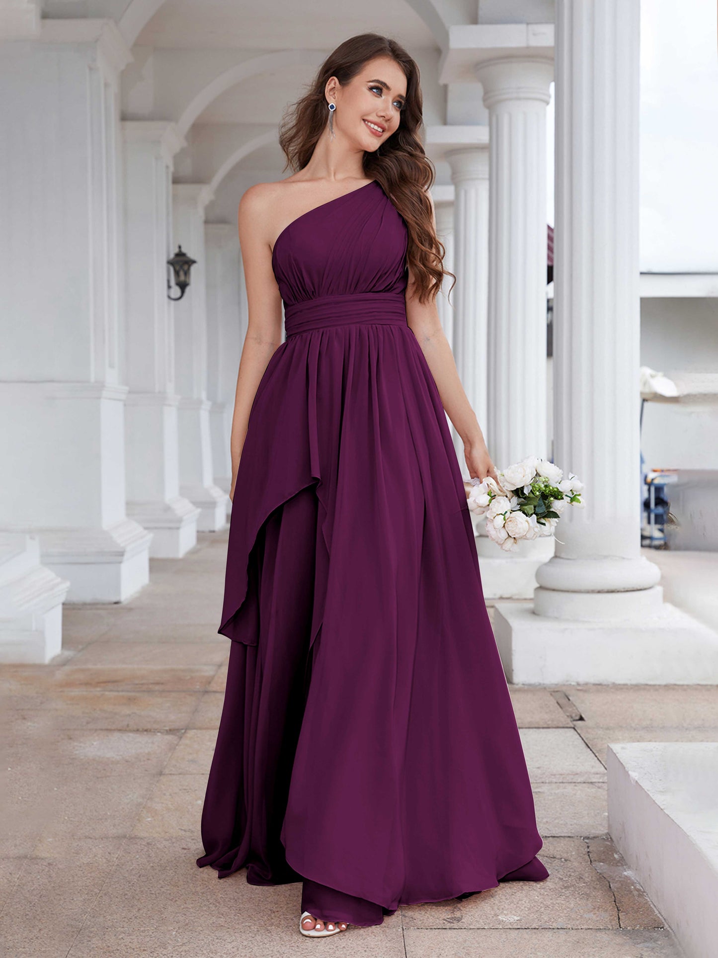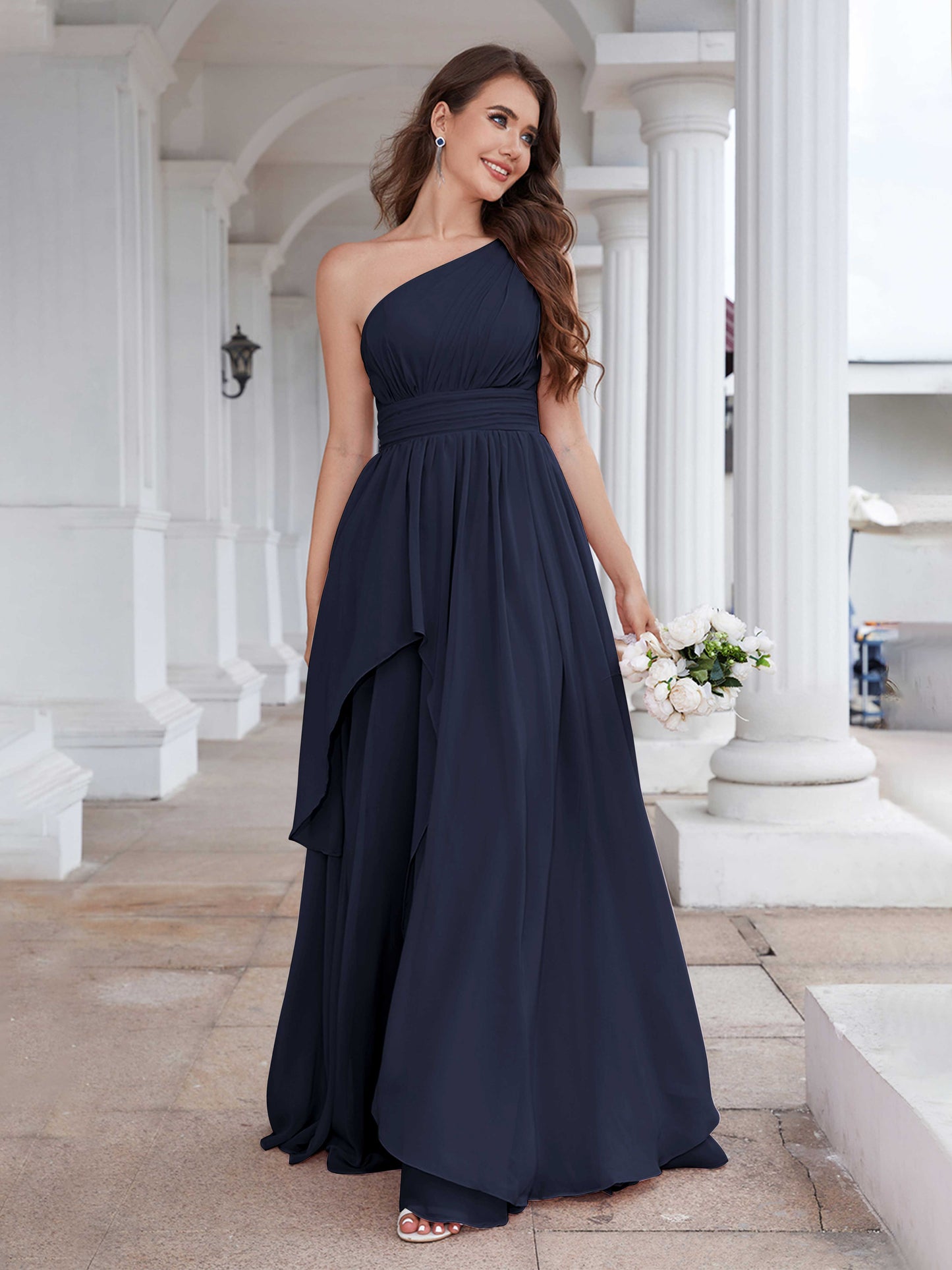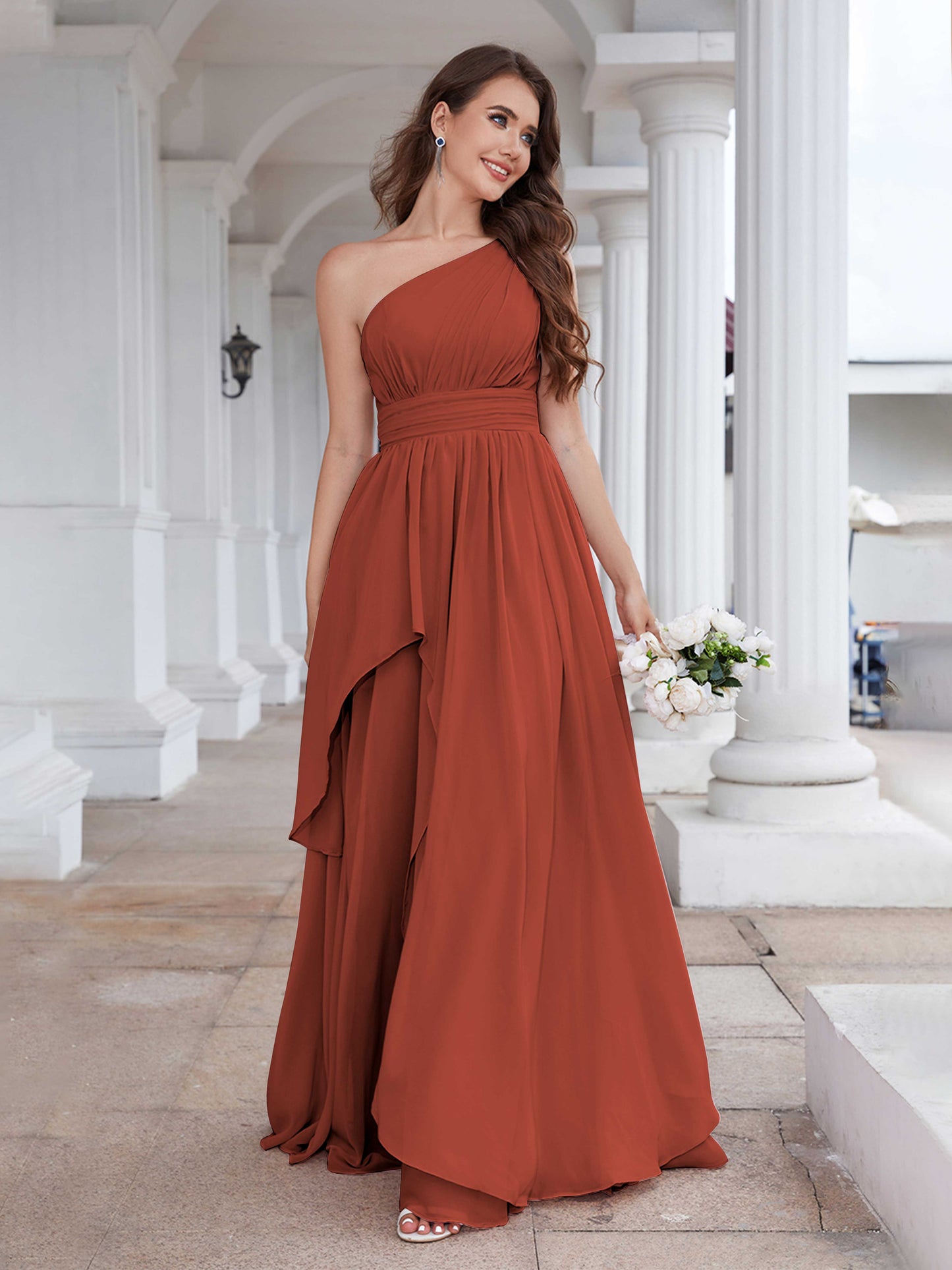 • Radiate sophistication in the Elegant One Shoulder Sleeveless Maxi Chiffon Bridesmaid Dress from Mollyevers. Featuring a sleek one-shoulder design and a flowing maxi skirt, this chiffon dress combines elegance and comfort, making it the perfect choice for bridesmaids looking for a chic and timeless look.