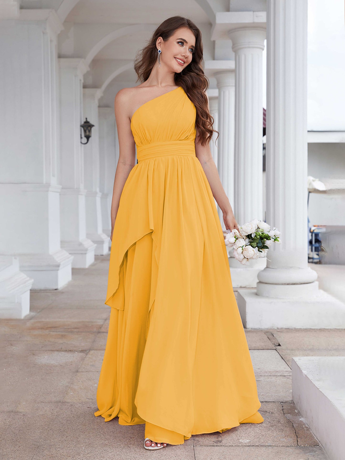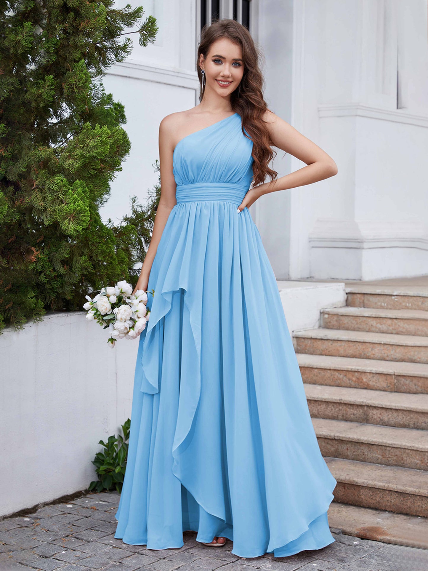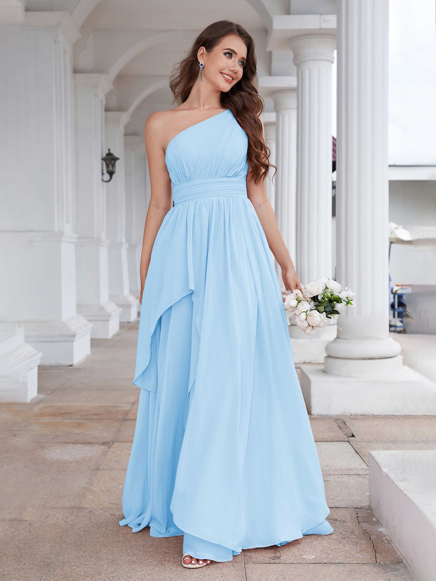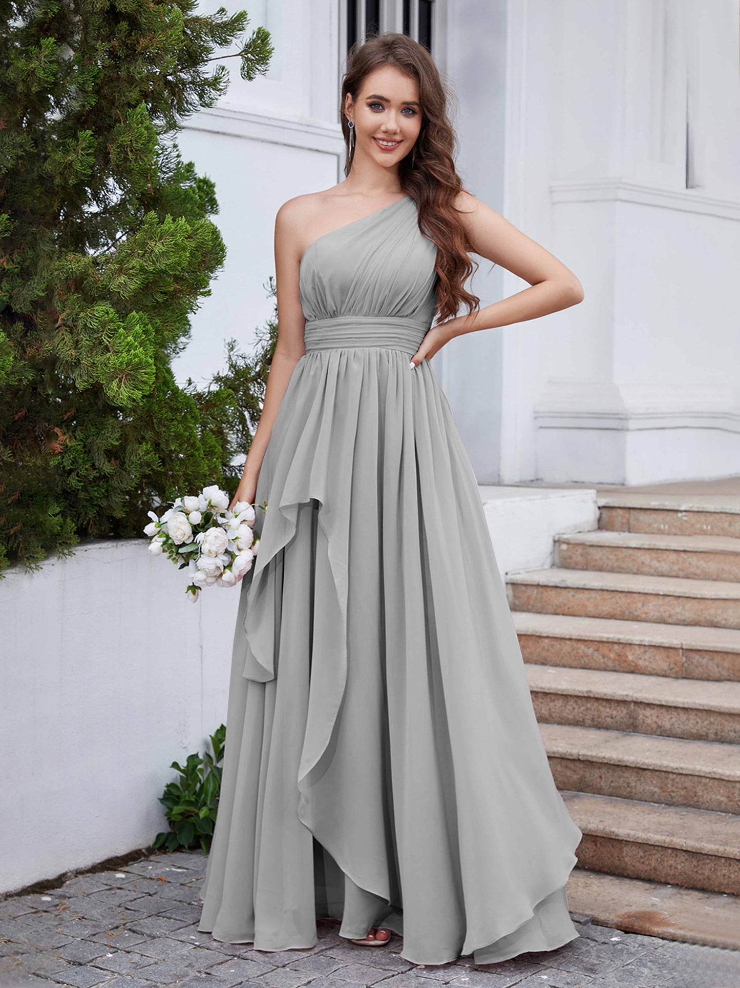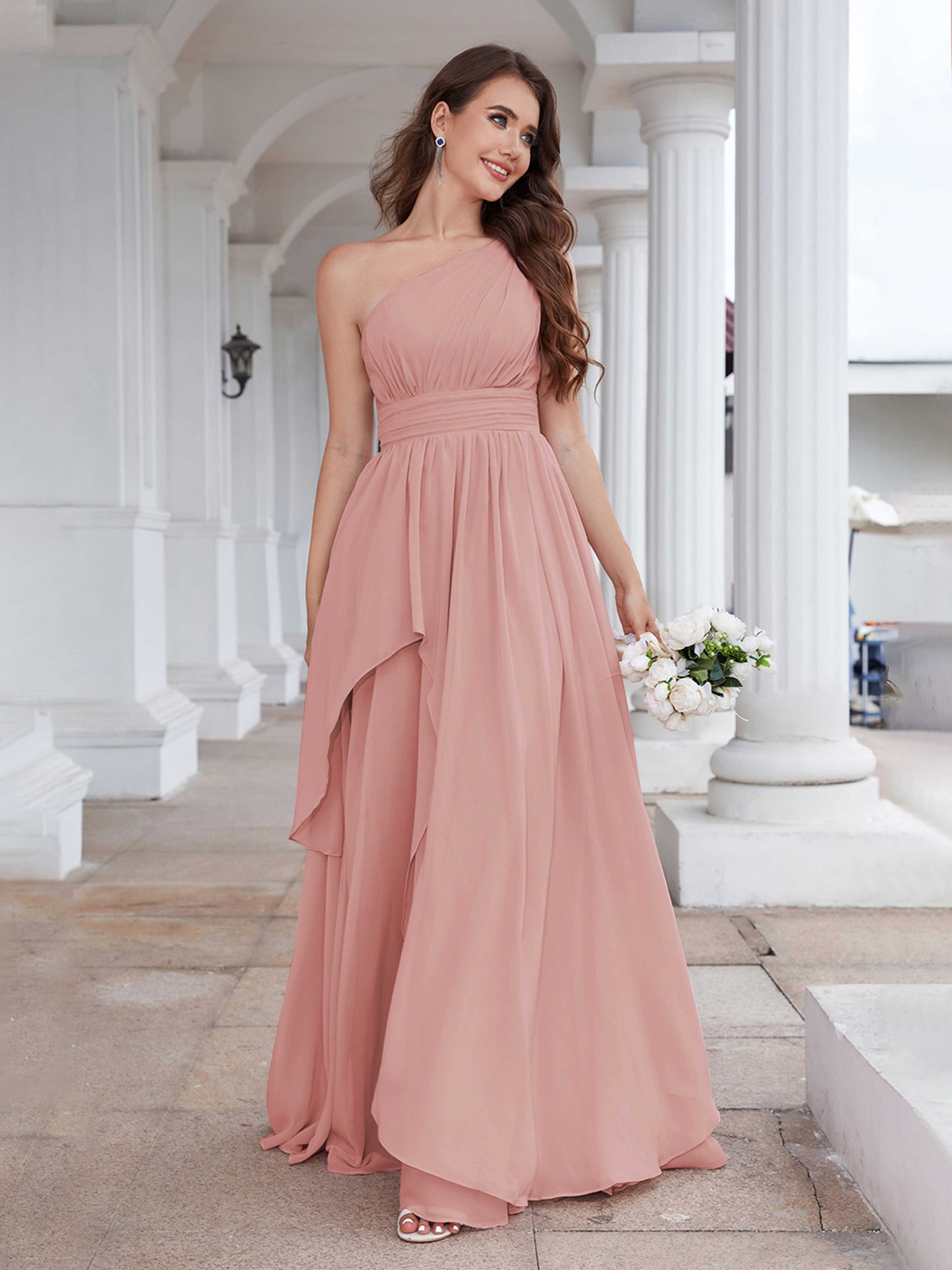 • Radiate sophistication in the Elegant One Shoulder Sleeveless Maxi Chiffon Bridesmaid Dress from Mollyevers. Featuring a sleek one-shoulder design and a flowing maxi skirt, this chiffon dress combines elegance and comfort, making it the perfect choice for bridesmaids looking for a chic and timeless look.