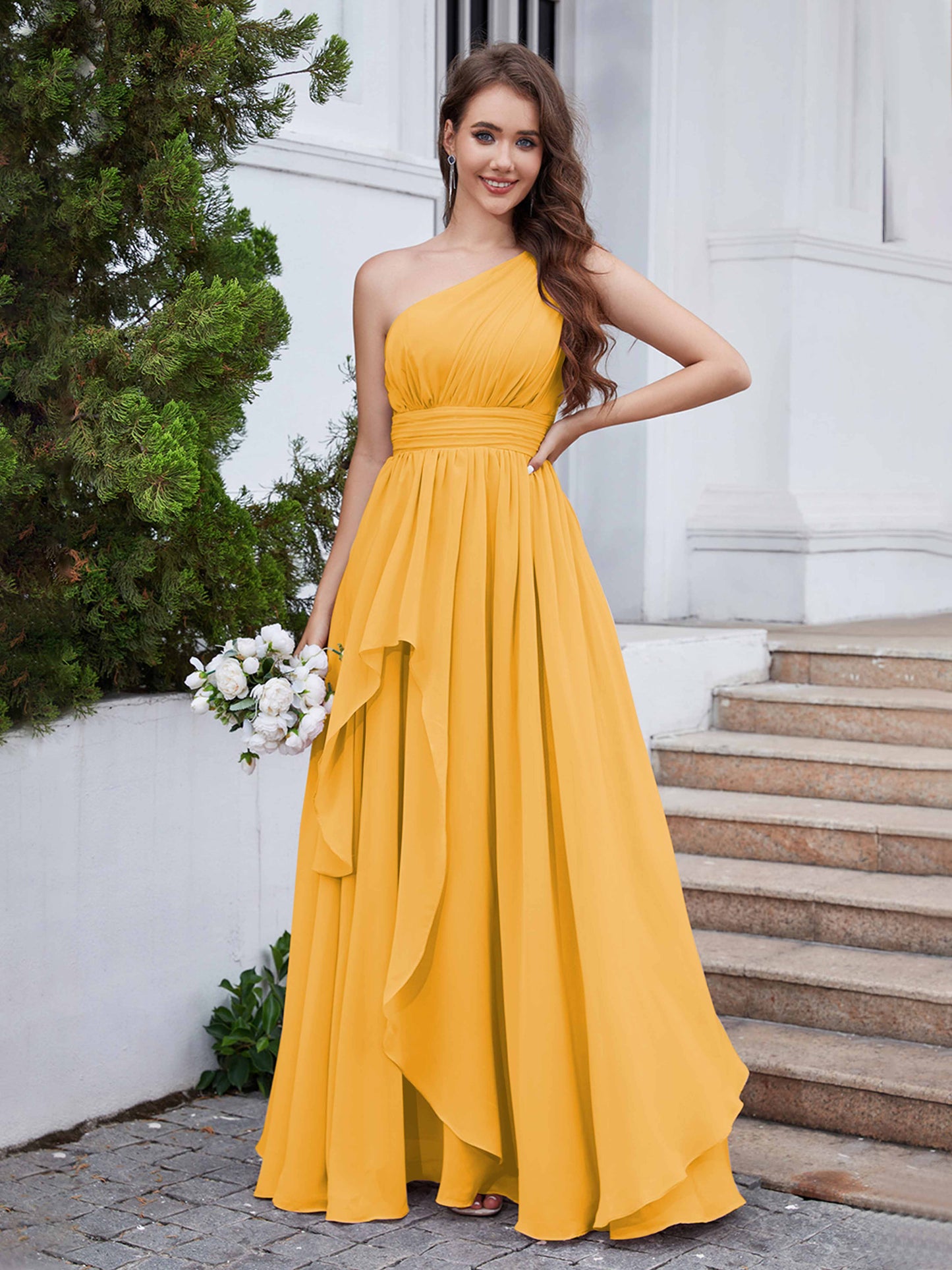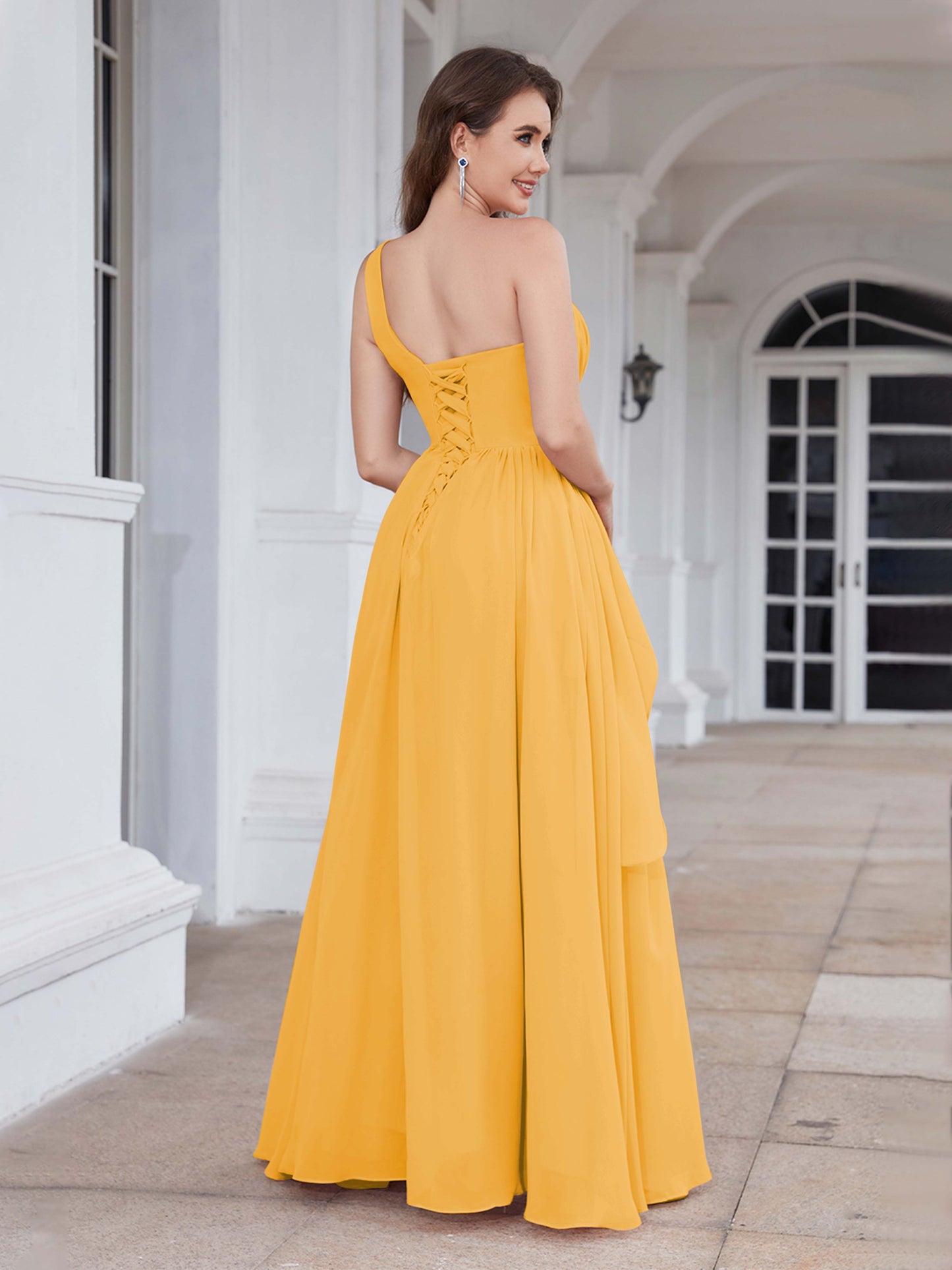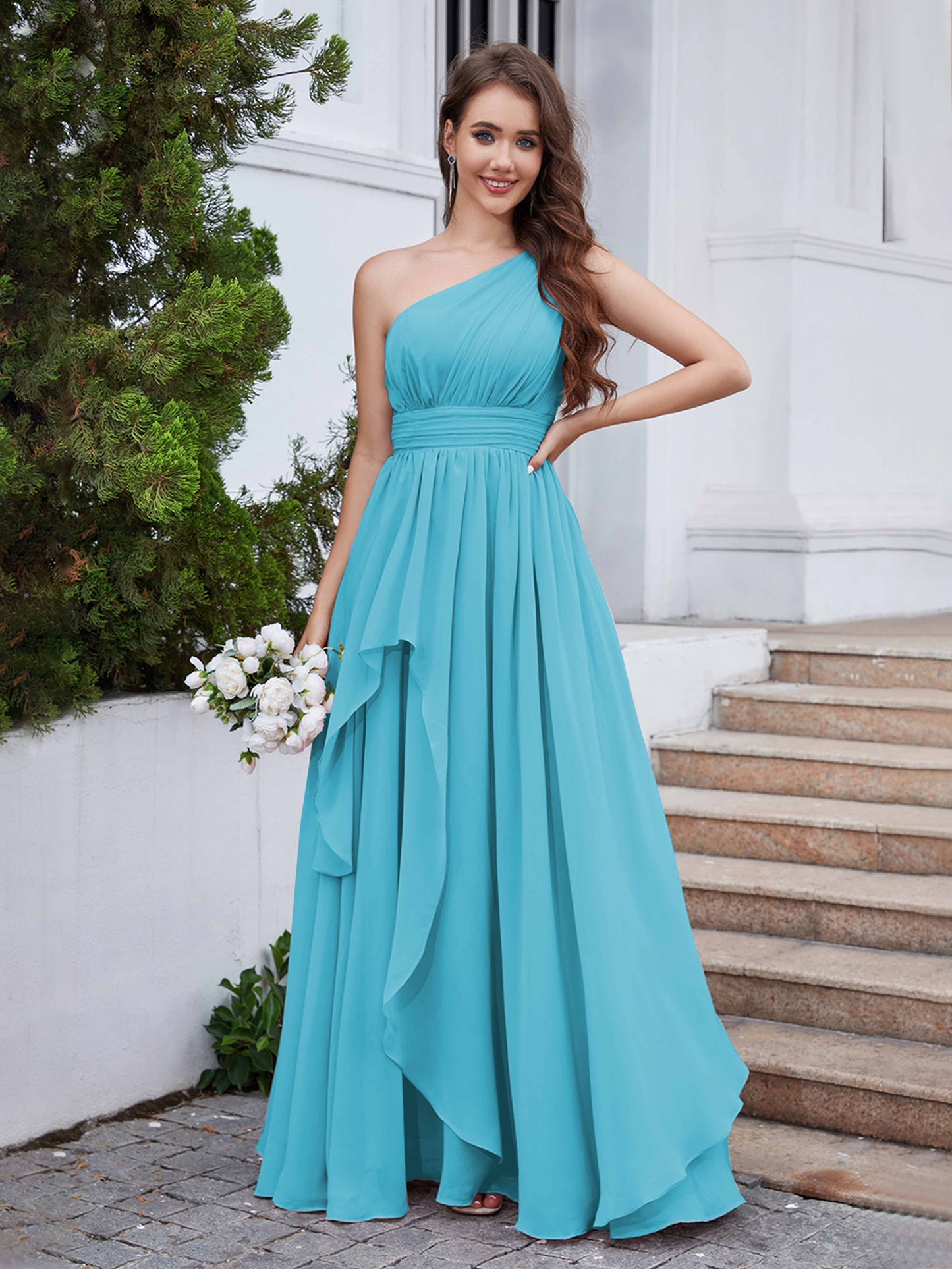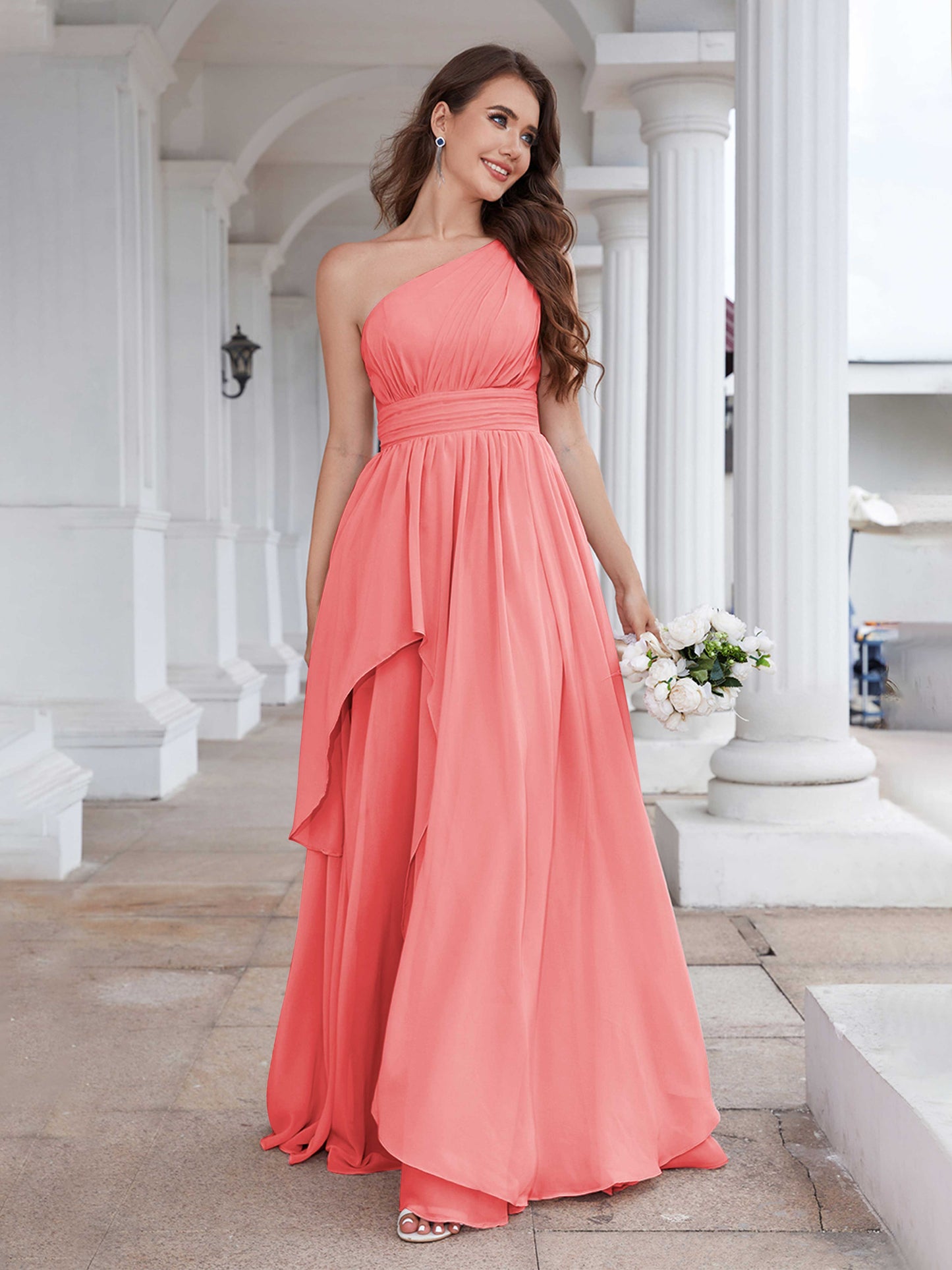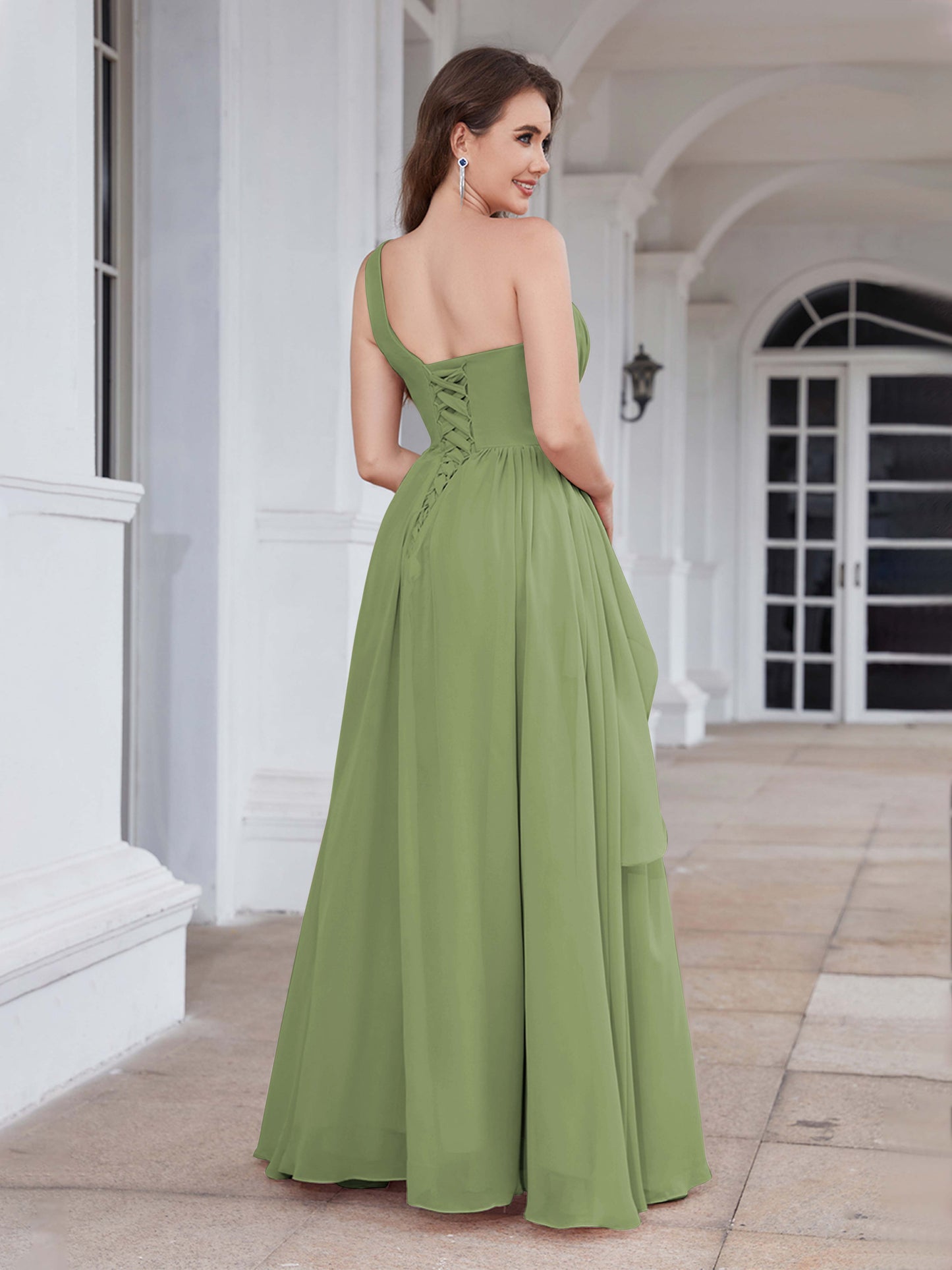 • Radiate sophistication in the Elegant One Shoulder Sleeveless Maxi Chiffon Bridesmaid Dress from Mollyevers. Featuring a sleek one-shoulder design and a flowing maxi skirt, this chiffon dress combines elegance and comfort, making it the perfect choice for bridesmaids looking for a chic and timeless look.