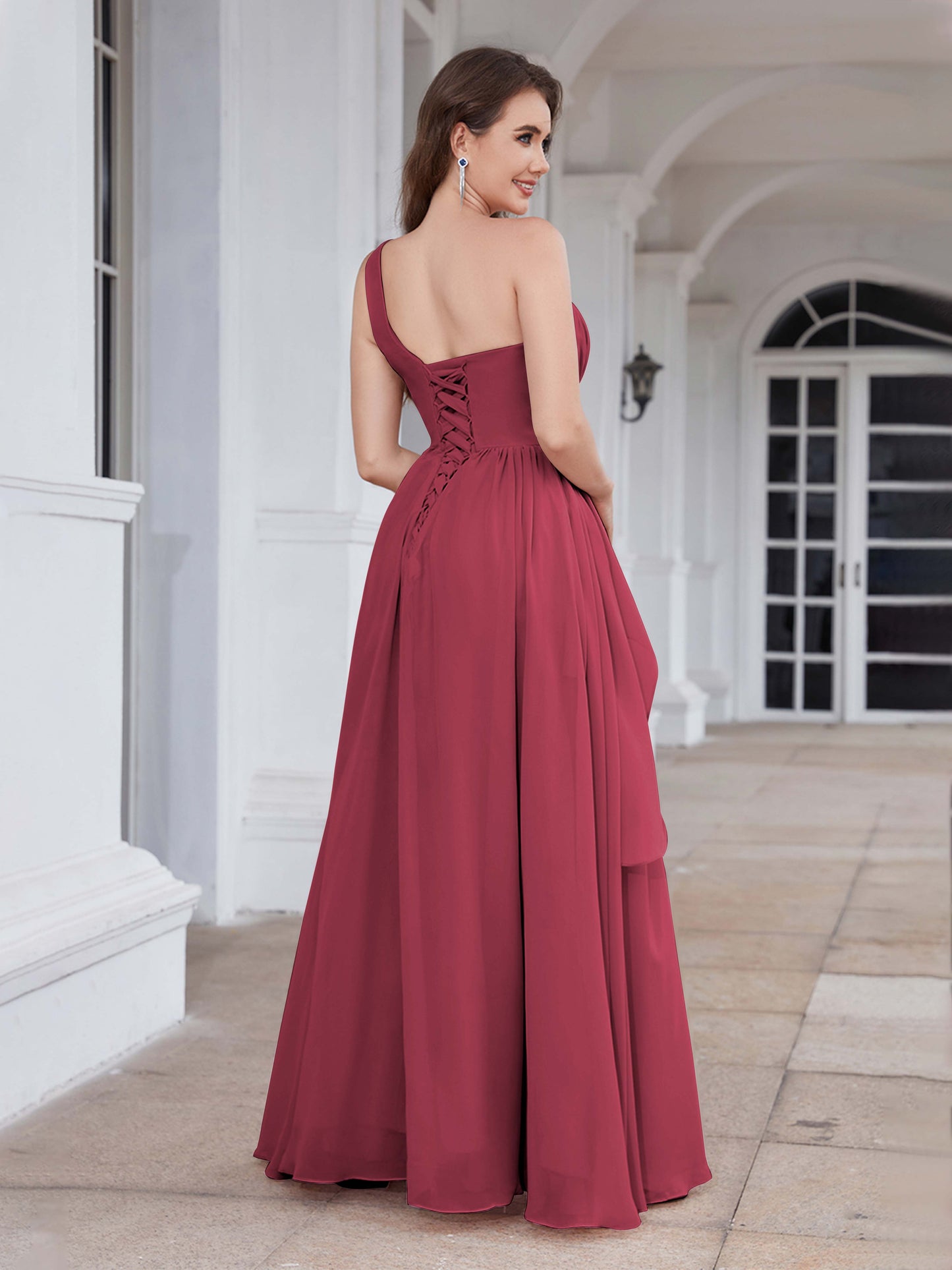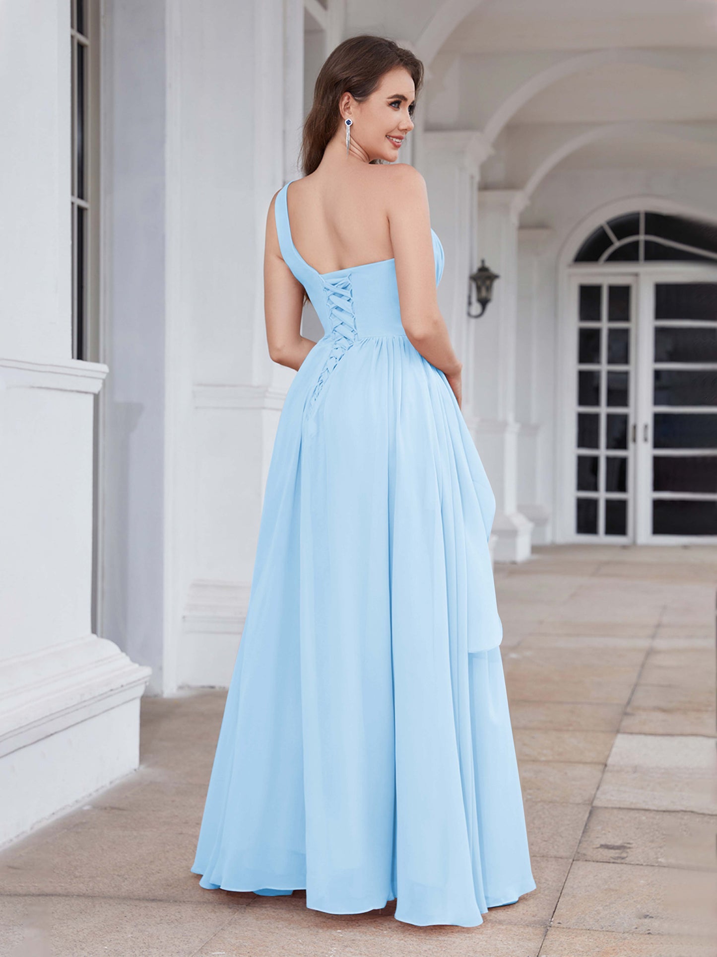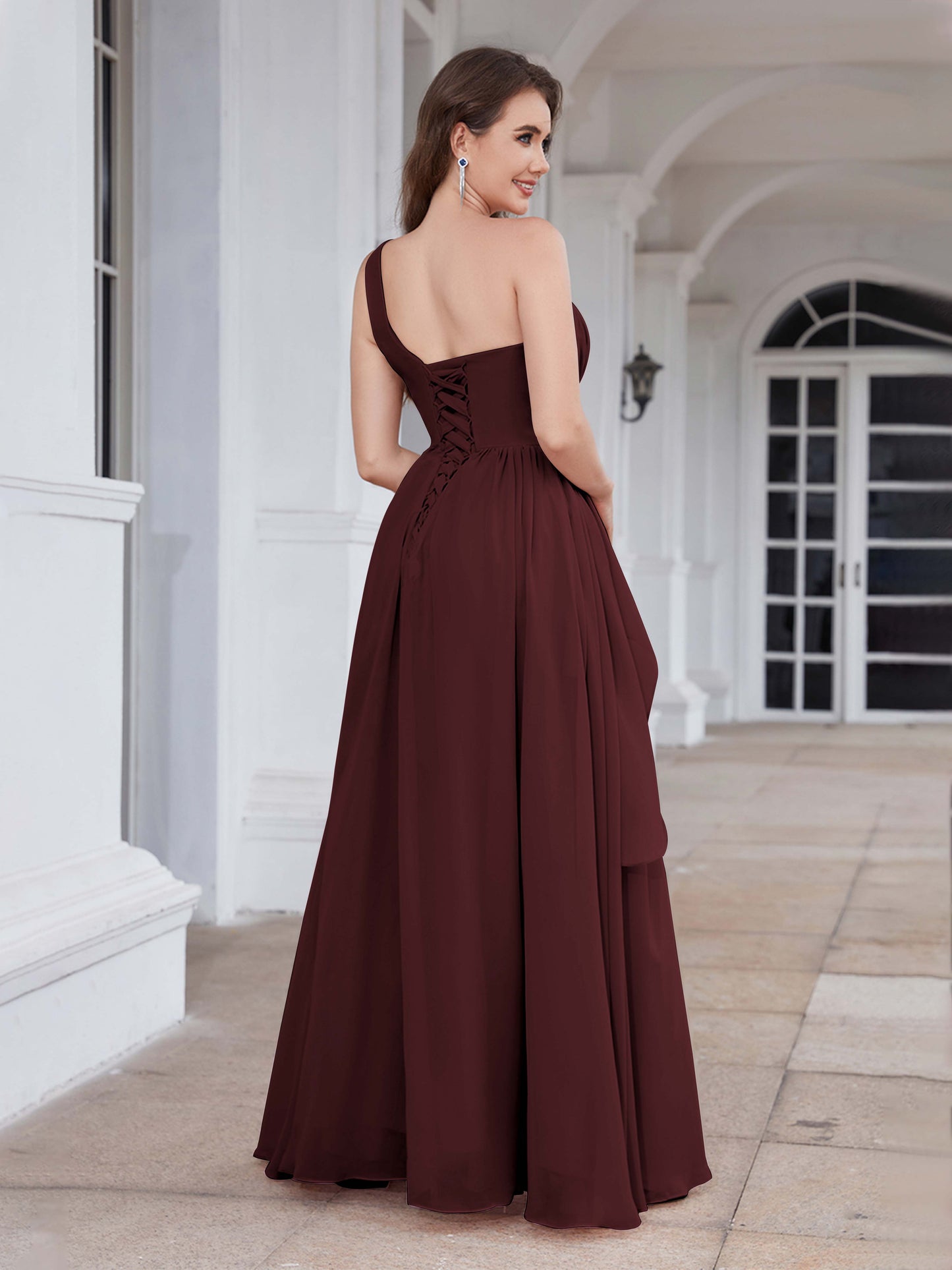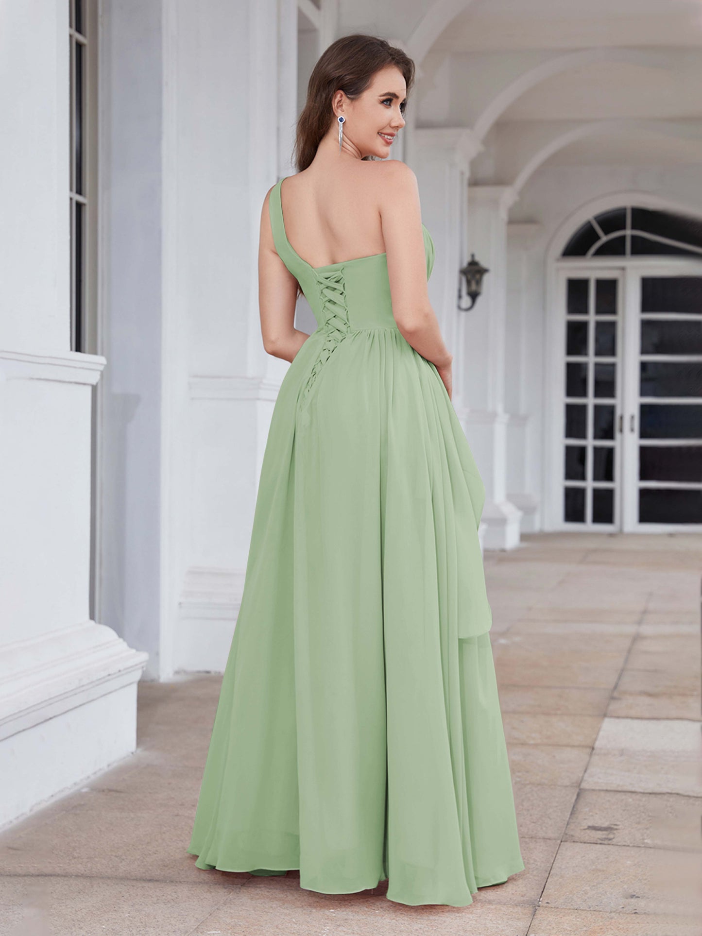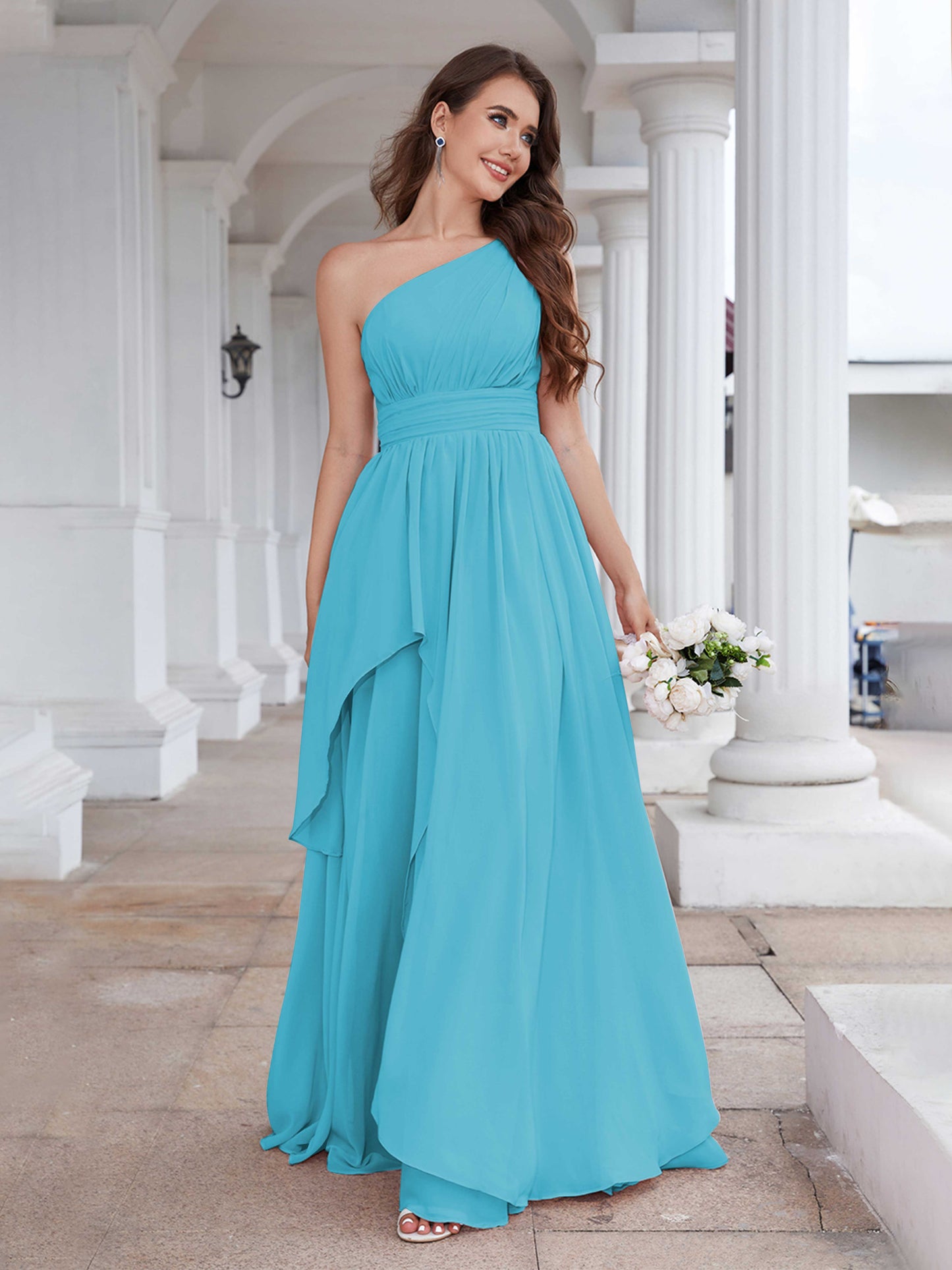 • Radiate sophistication in the Elegant One Shoulder Sleeveless Maxi Chiffon Bridesmaid Dress from Mollyevers. Featuring a sleek one-shoulder design and a flowing maxi skirt, this chiffon dress combines elegance and comfort, making it the perfect choice for bridesmaids looking for a chic and timeless look.