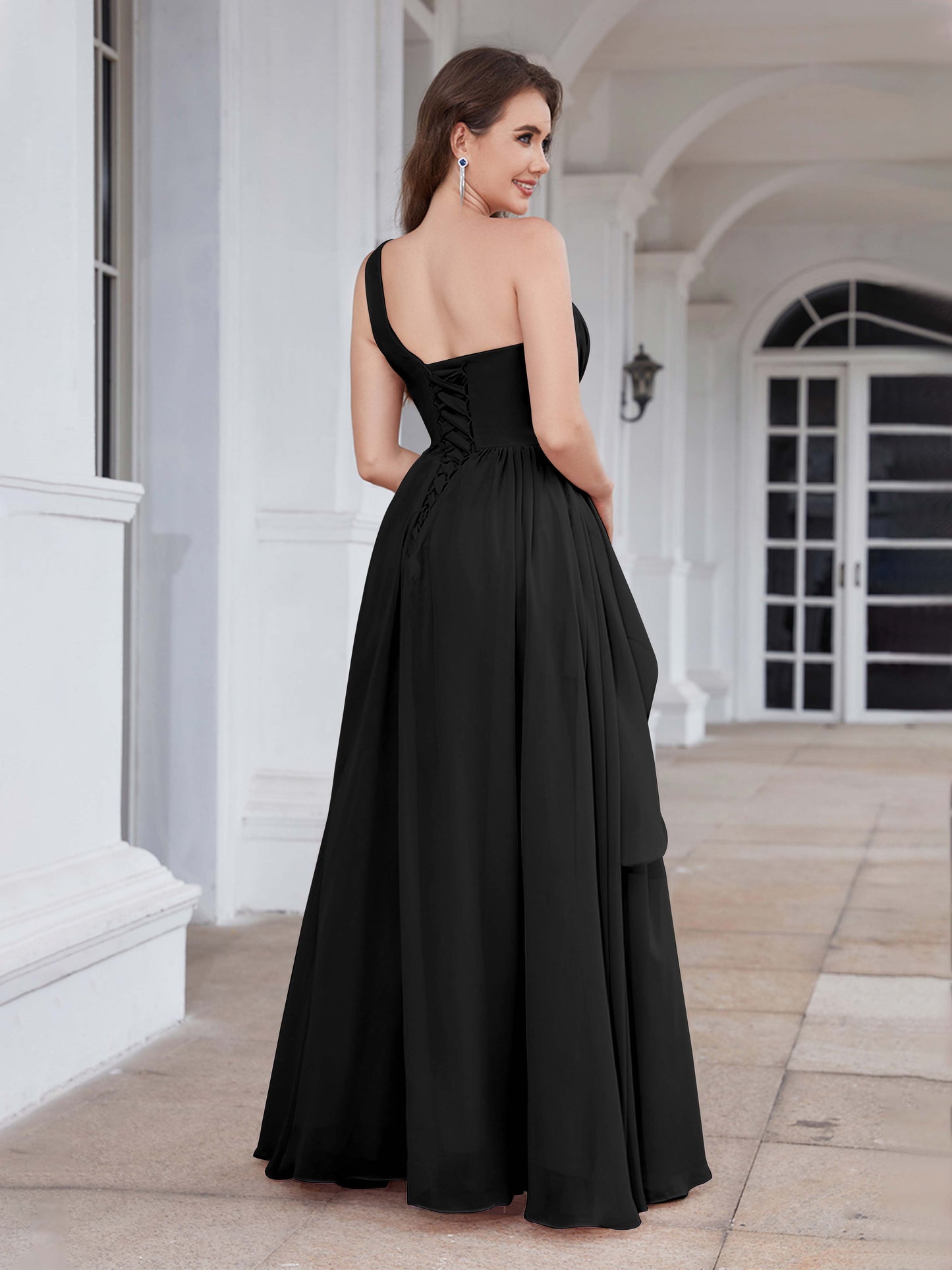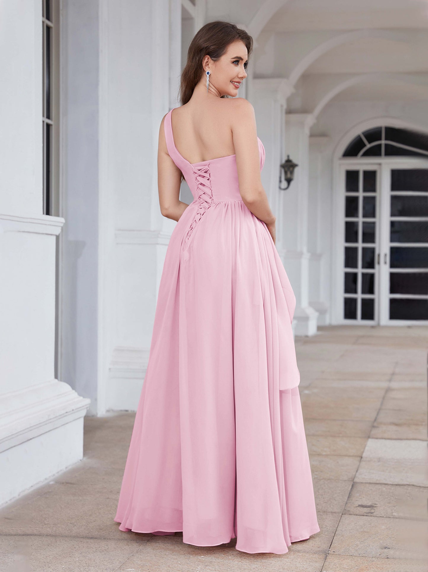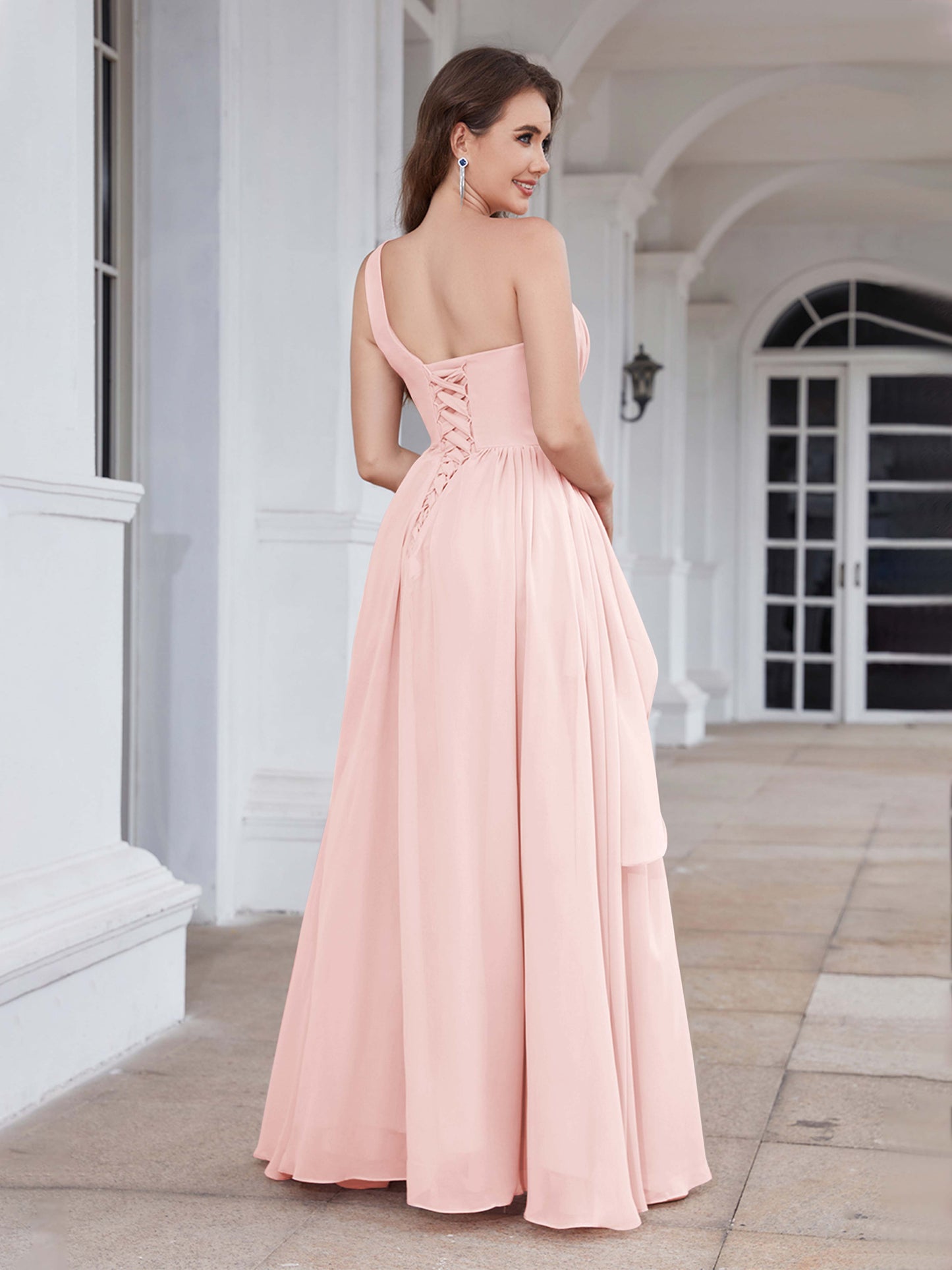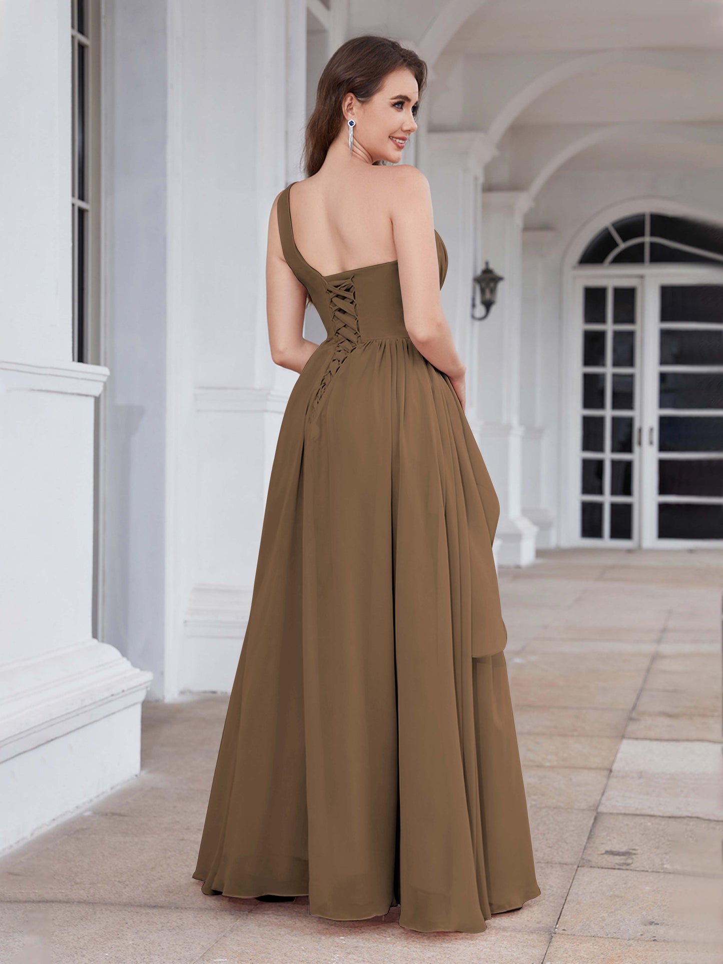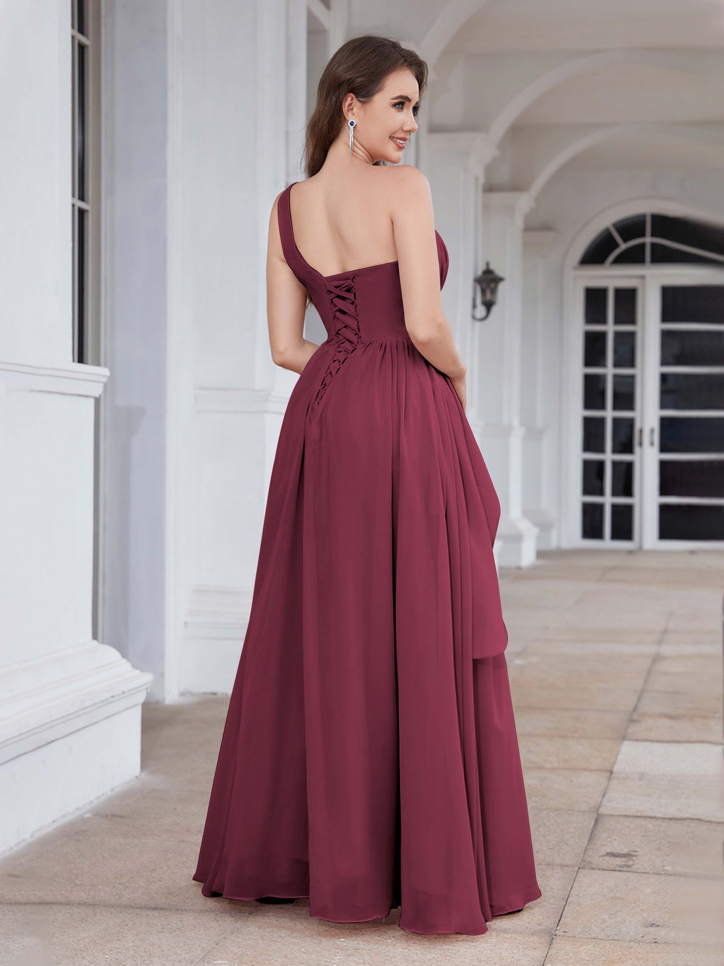 • Radiate sophistication in the Elegant One Shoulder Sleeveless Maxi Chiffon Bridesmaid Dress from Mollyevers. Featuring a sleek one-shoulder design and a flowing maxi skirt, this chiffon dress combines elegance and comfort, making it the perfect choice for bridesmaids looking for a chic and timeless look.