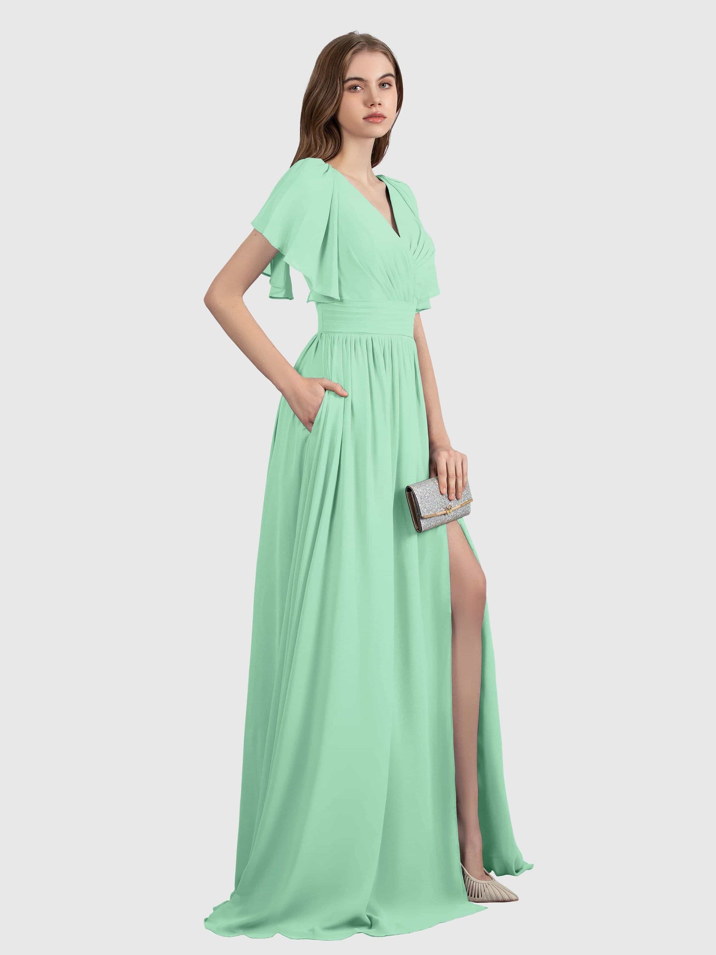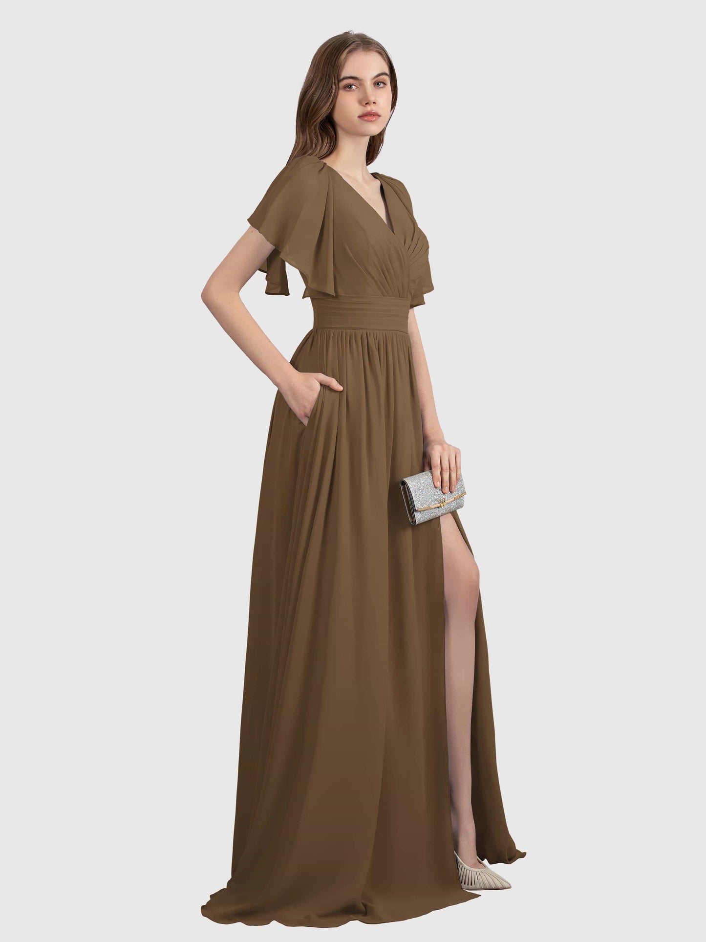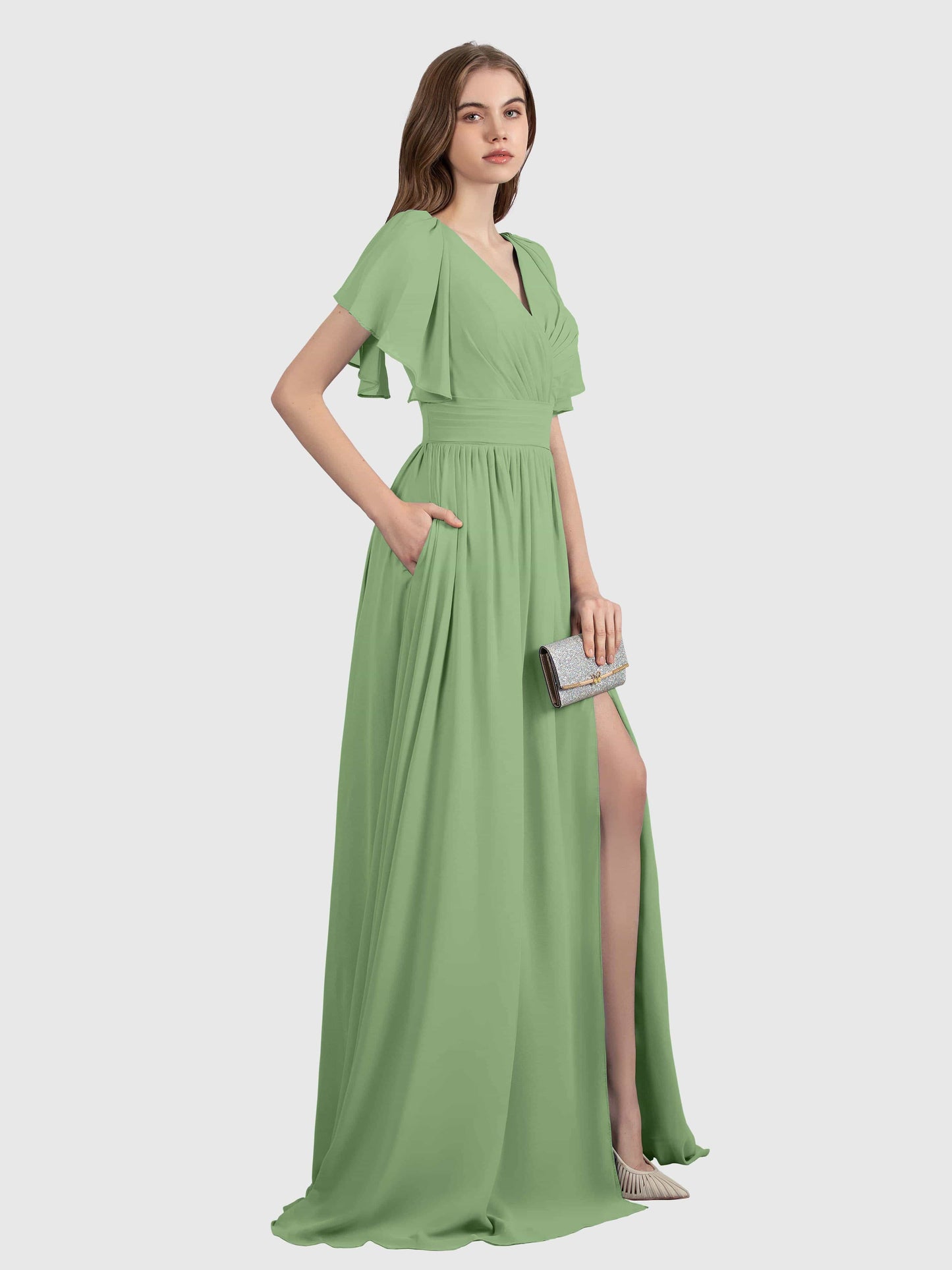 Elegant V Neck Ruffles Slit Chiffon Bridesmaid Dresses UK
