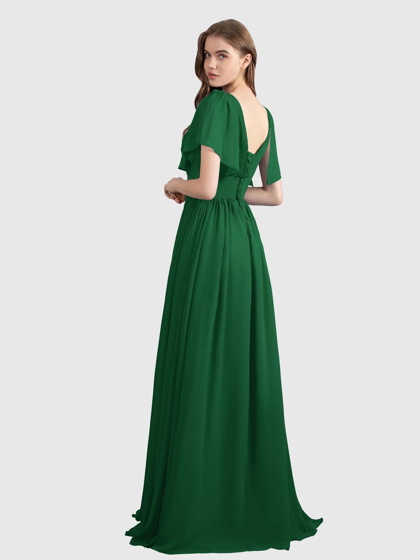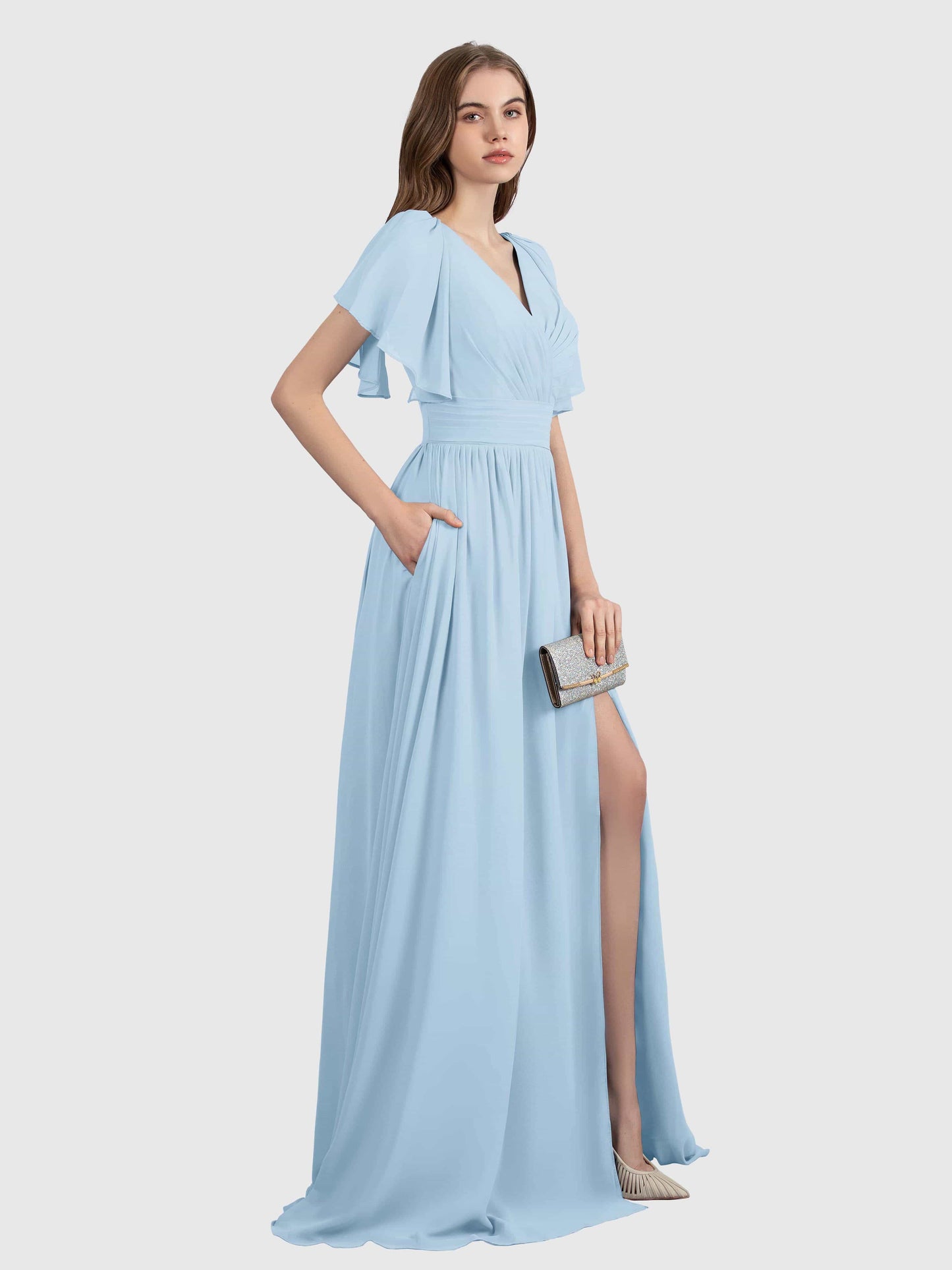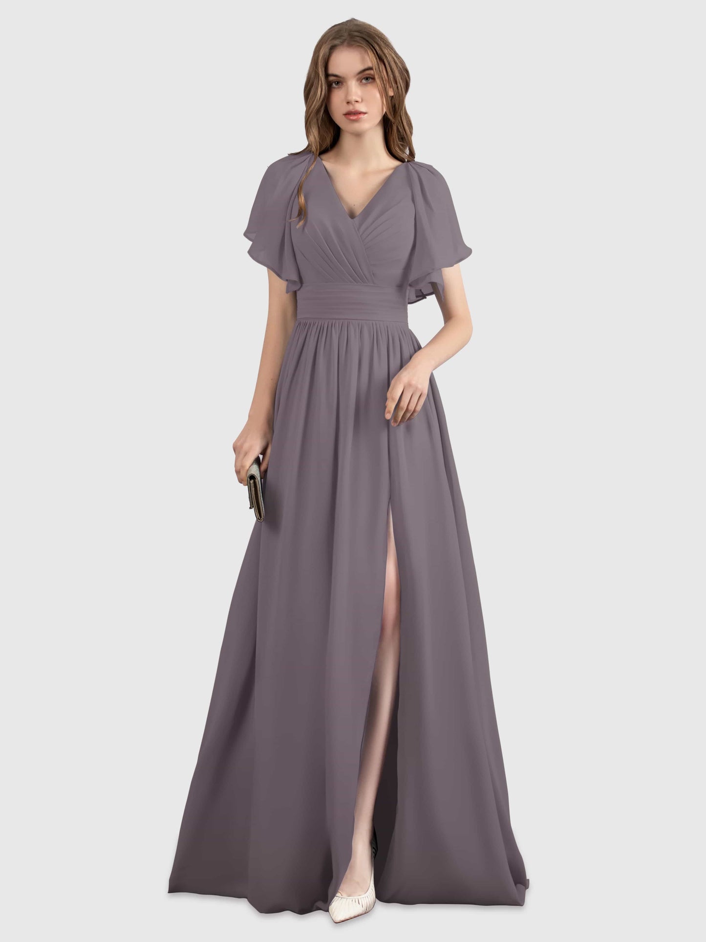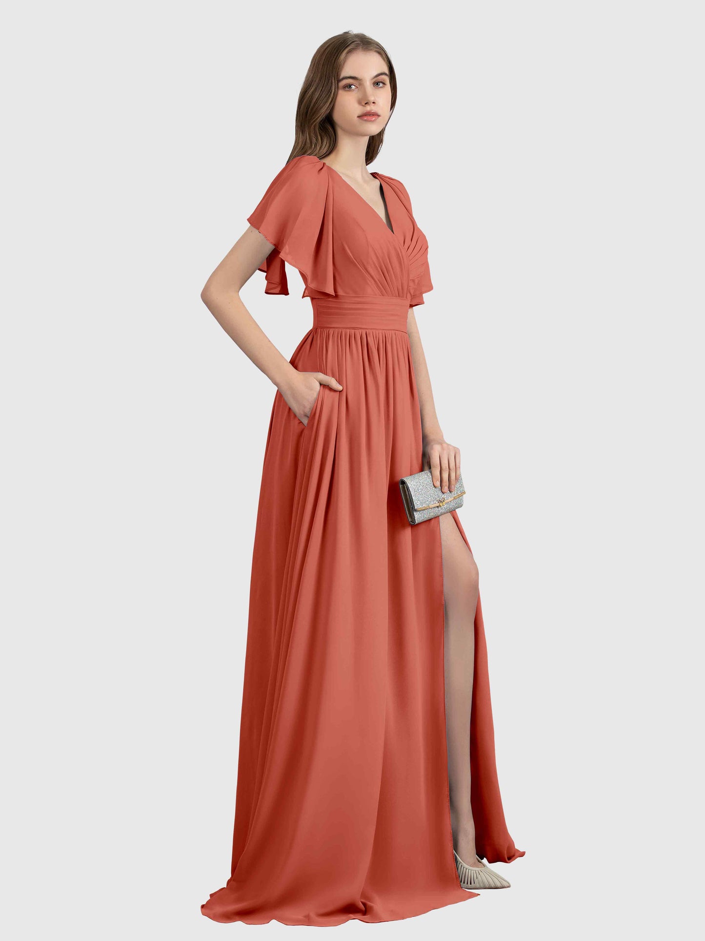 Elegant V Neck Ruffles Slit Chiffon Bridesmaid Dresses UK