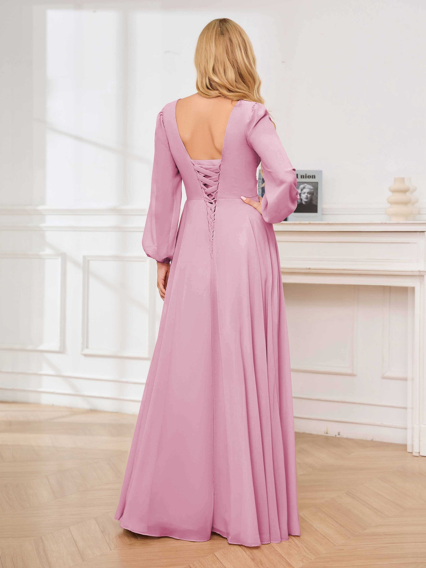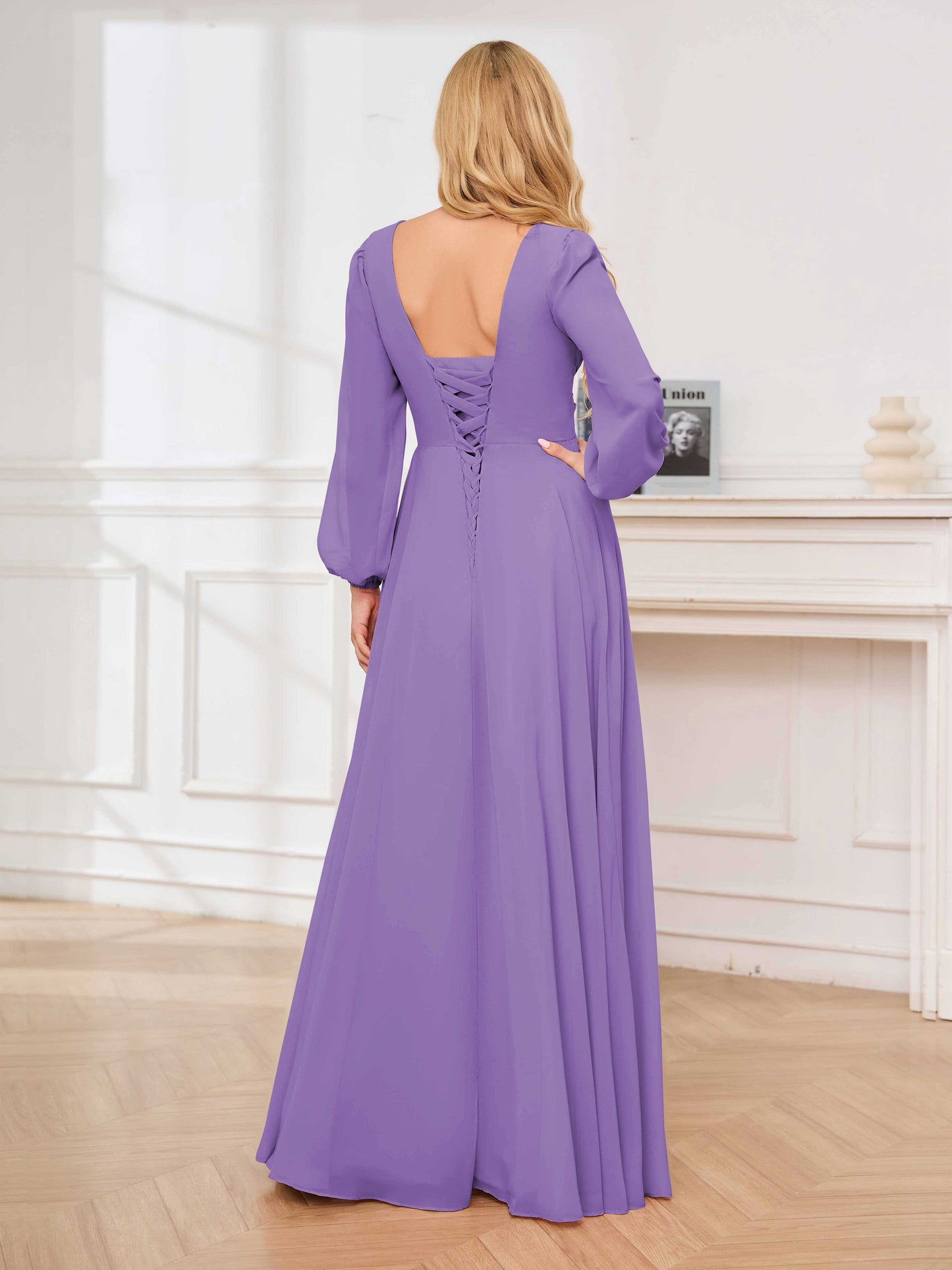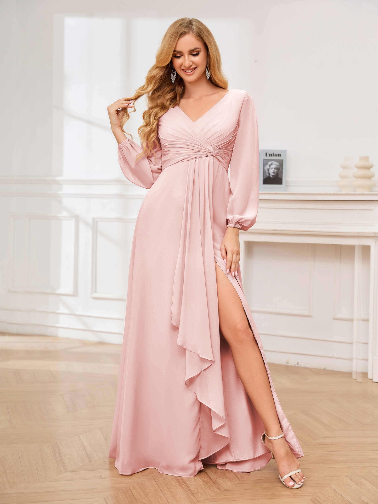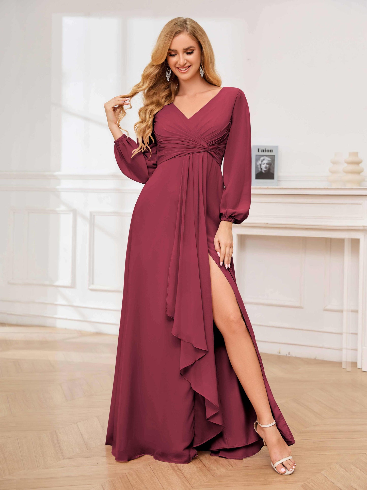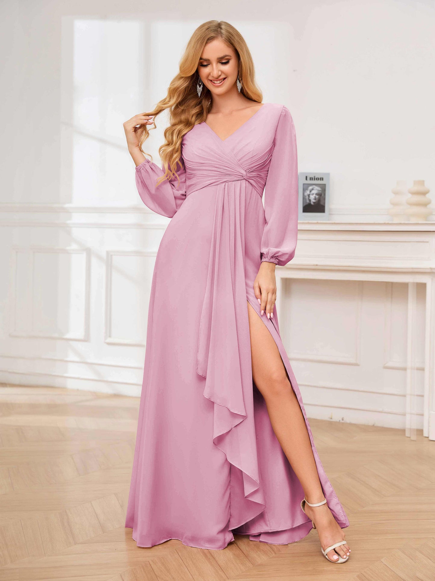 Feminine Pleats Long Sleeves Slit Chiffon Bridesmaid Dresses UK