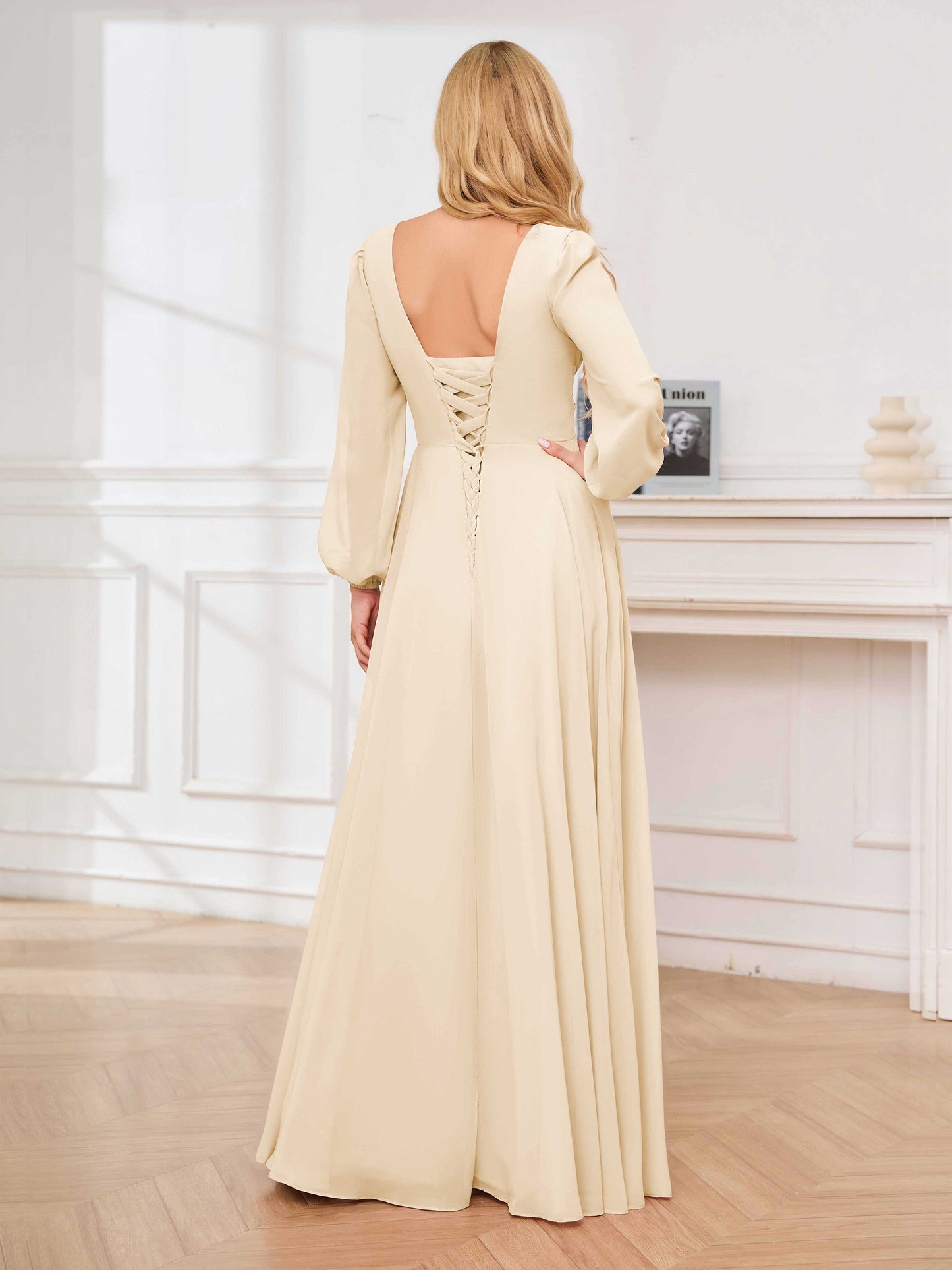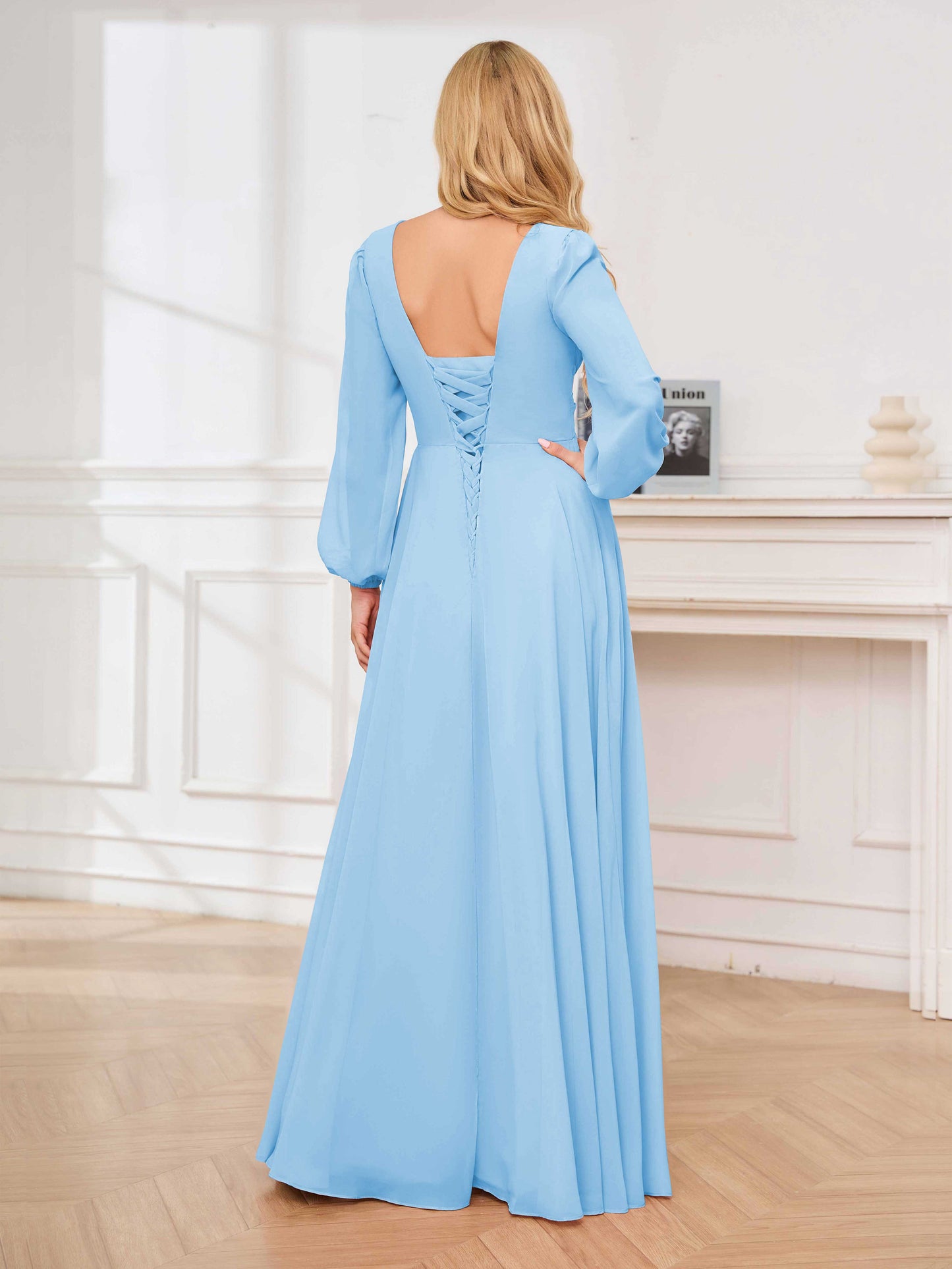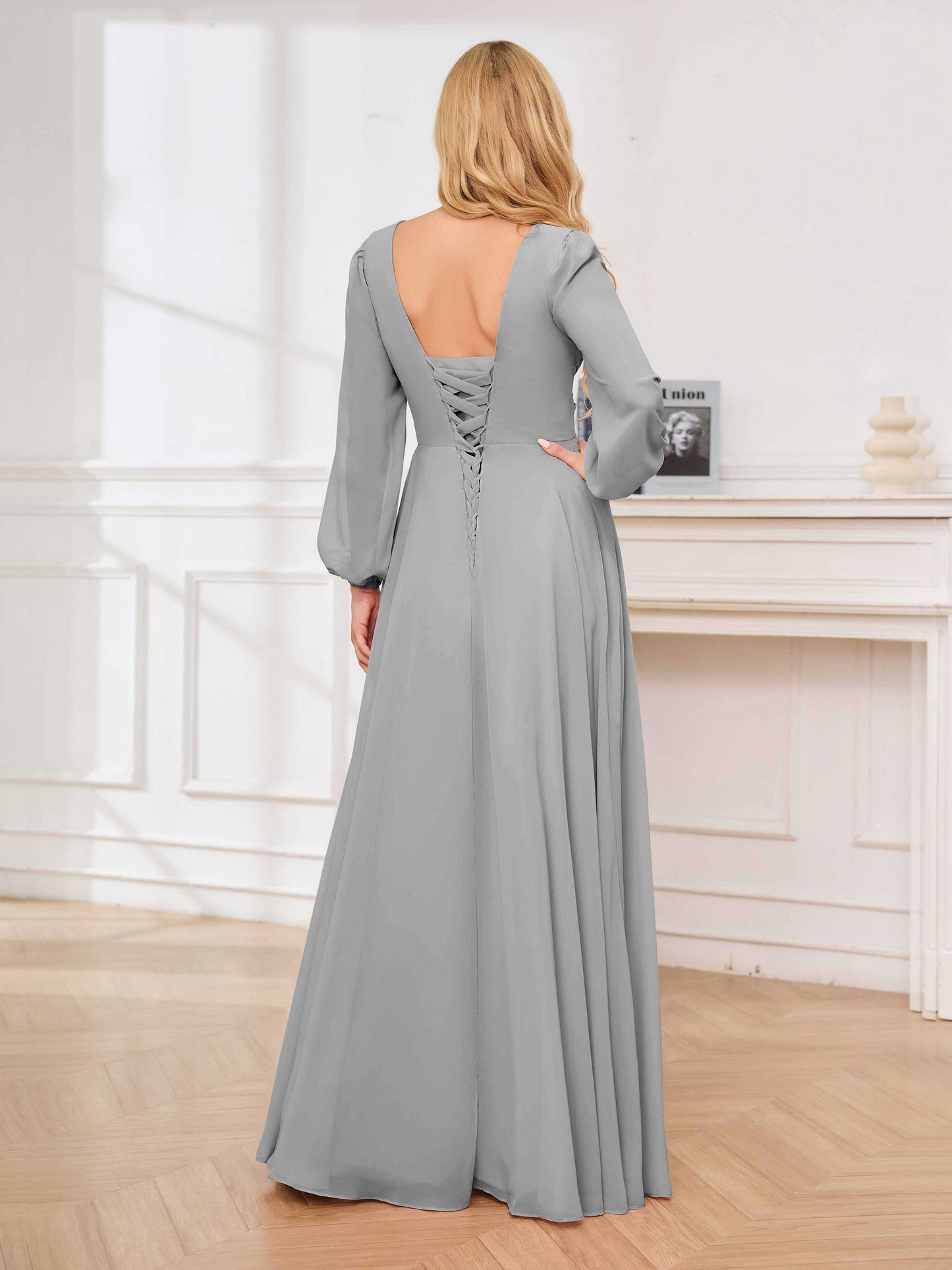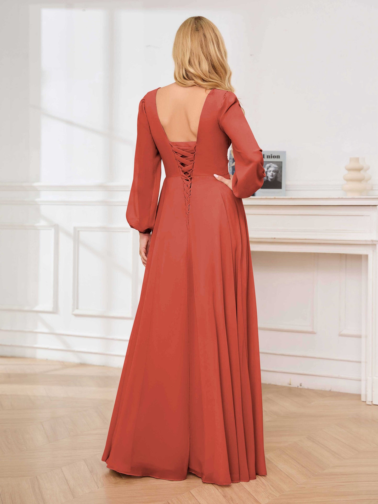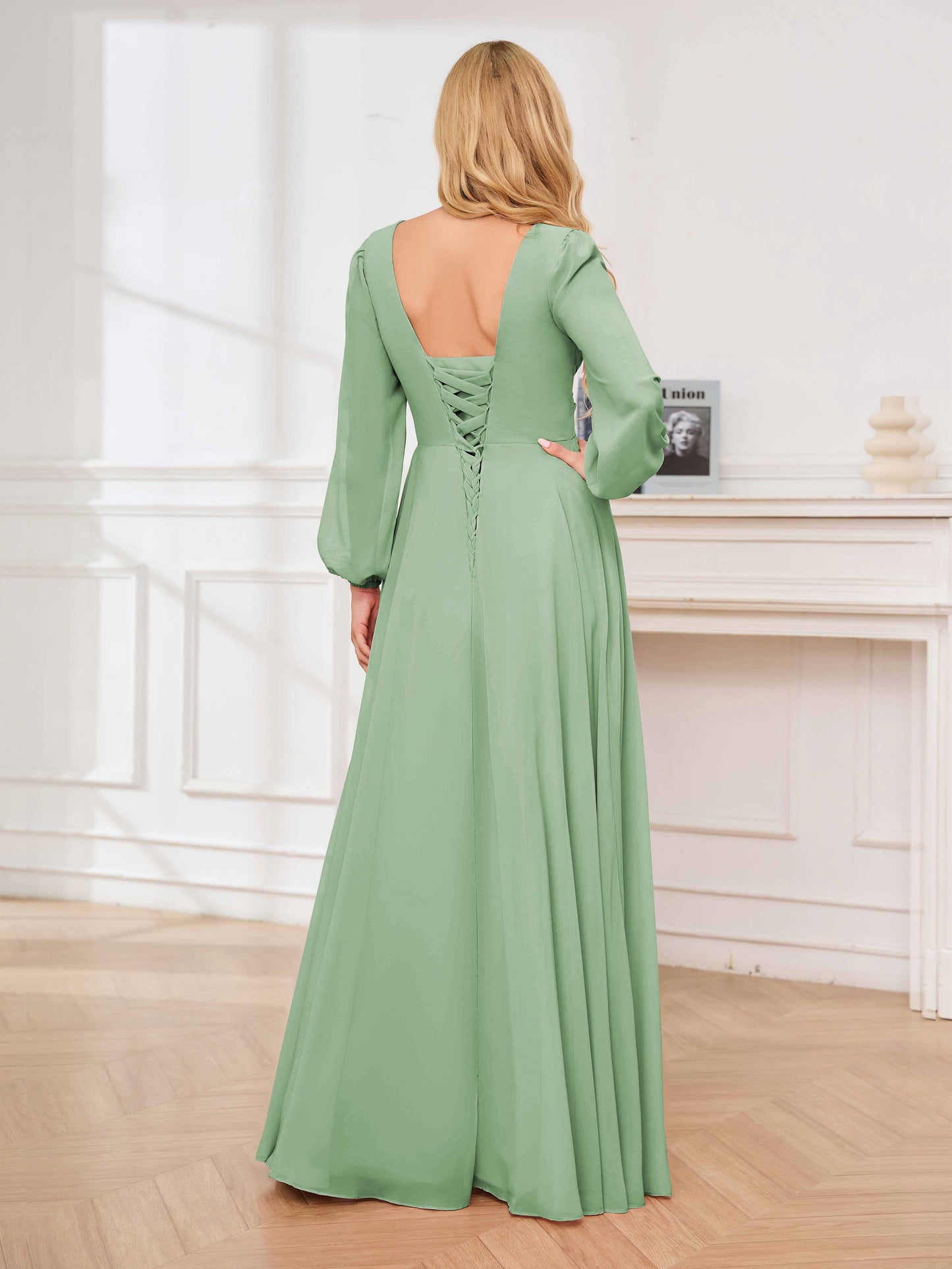 Feminine Pleats Long Sleeves Slit Chiffon Bridesmaid Dresses UK