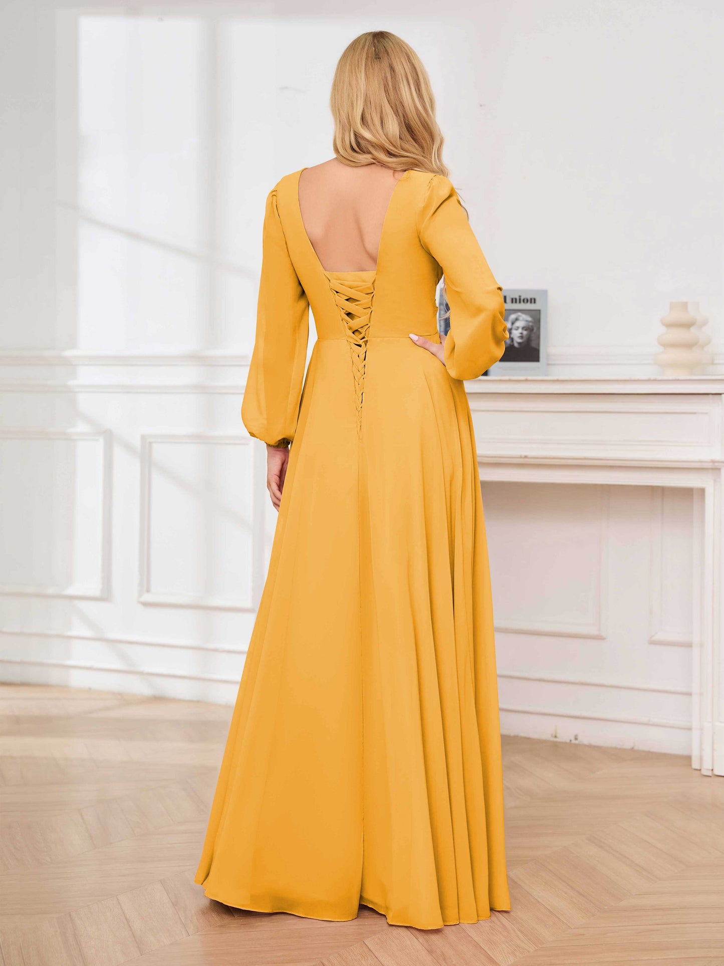 • Embrace femininity with these pleated long-sleeve slit chiffon bridesmaid dresses. Designed for UK plus-size women, these dresses offer a romantic and elegant look. Perfect for a vintage-inspired wedding, these dresses will make your bridesmaids look effortlessly feminine.