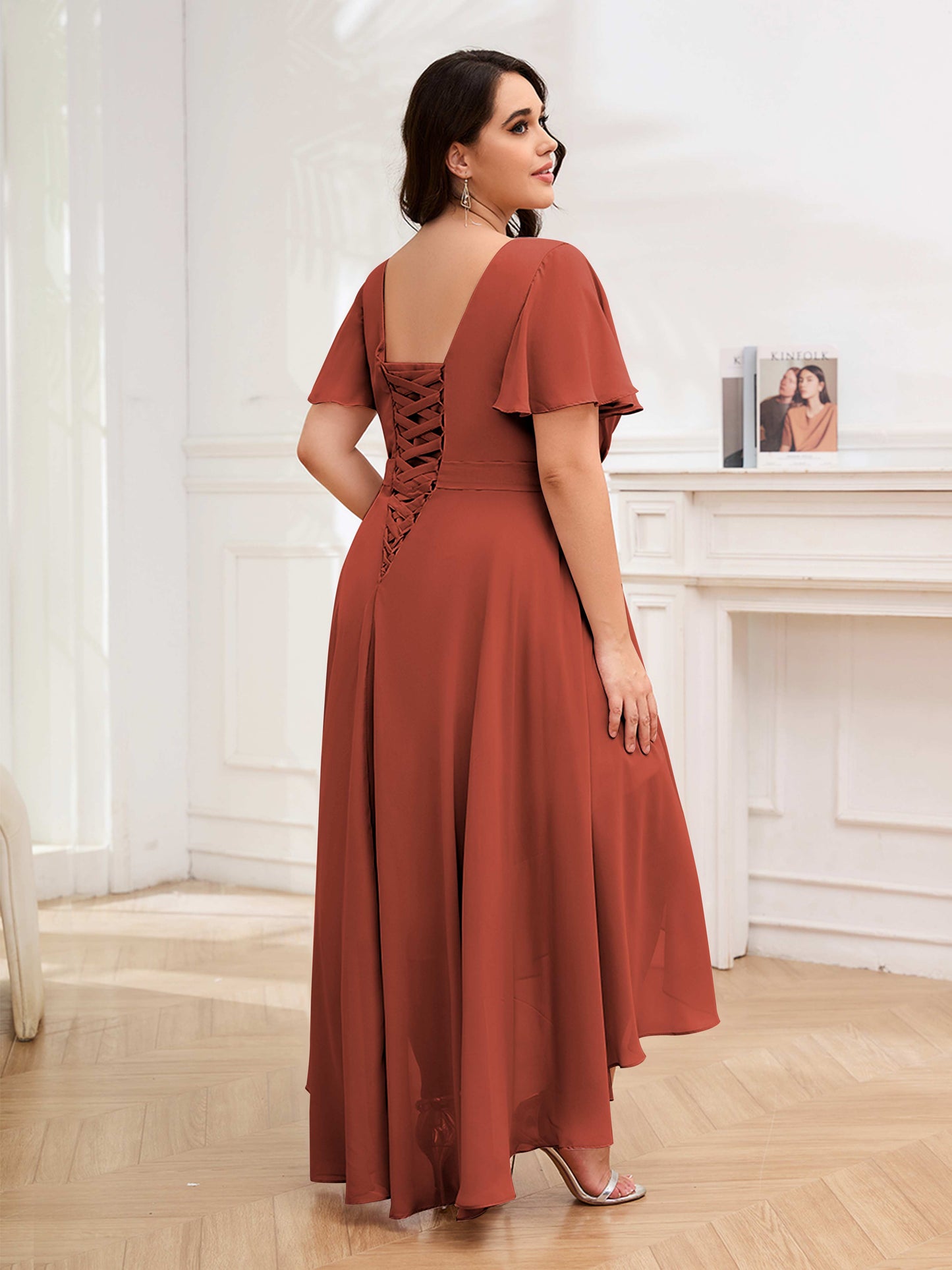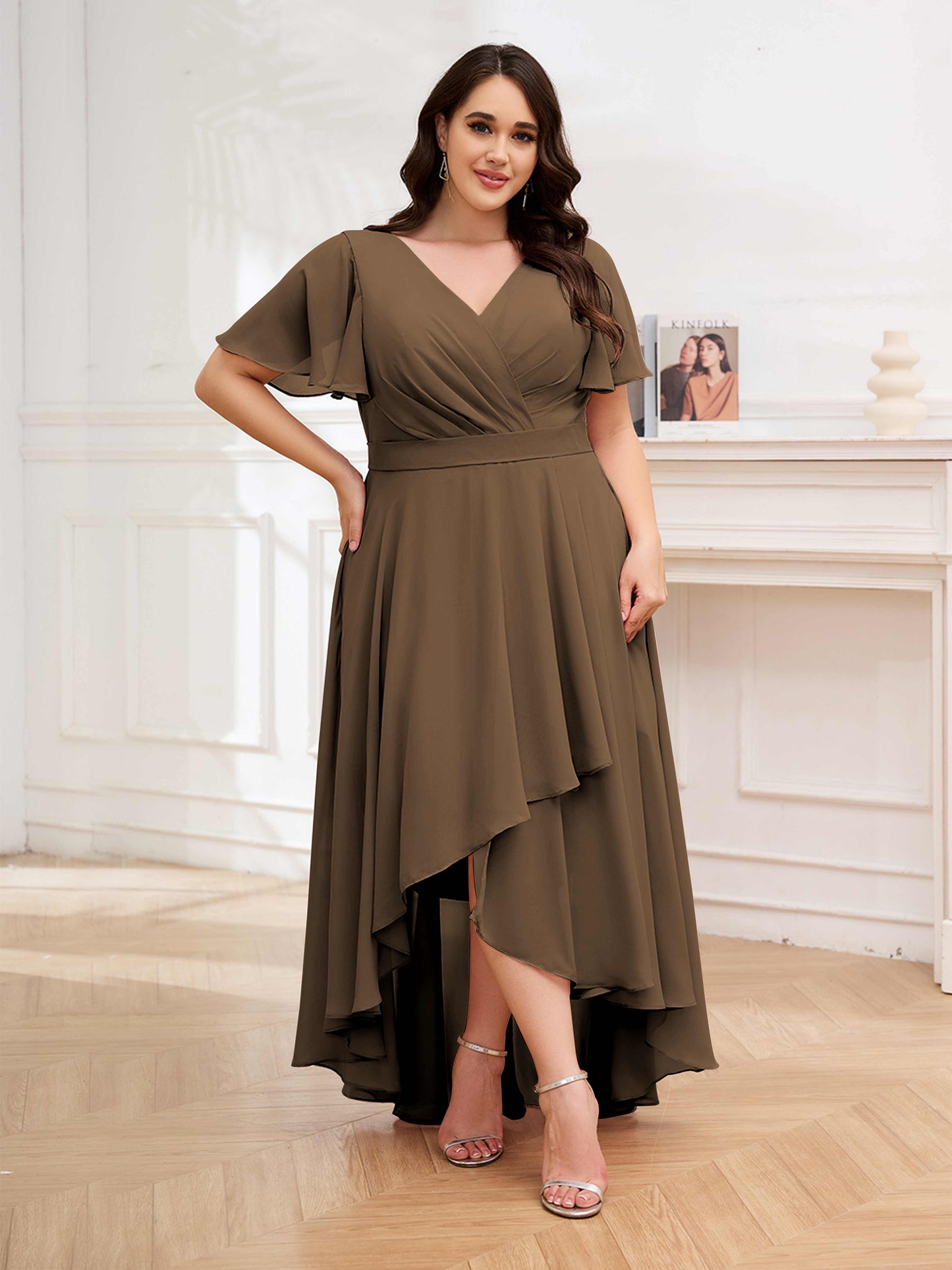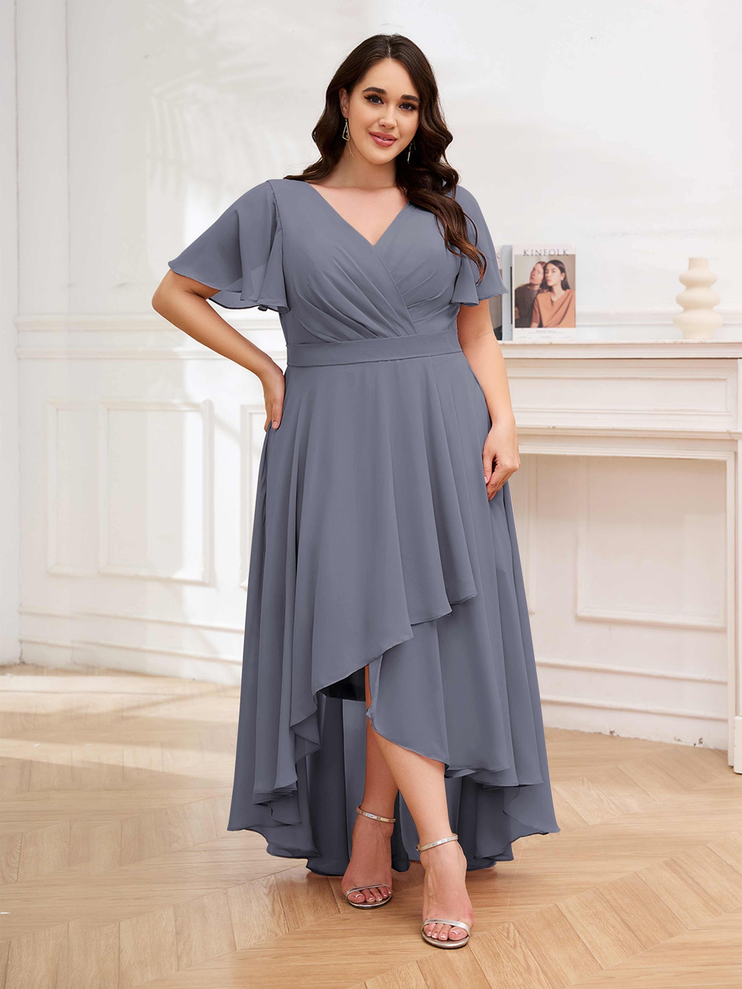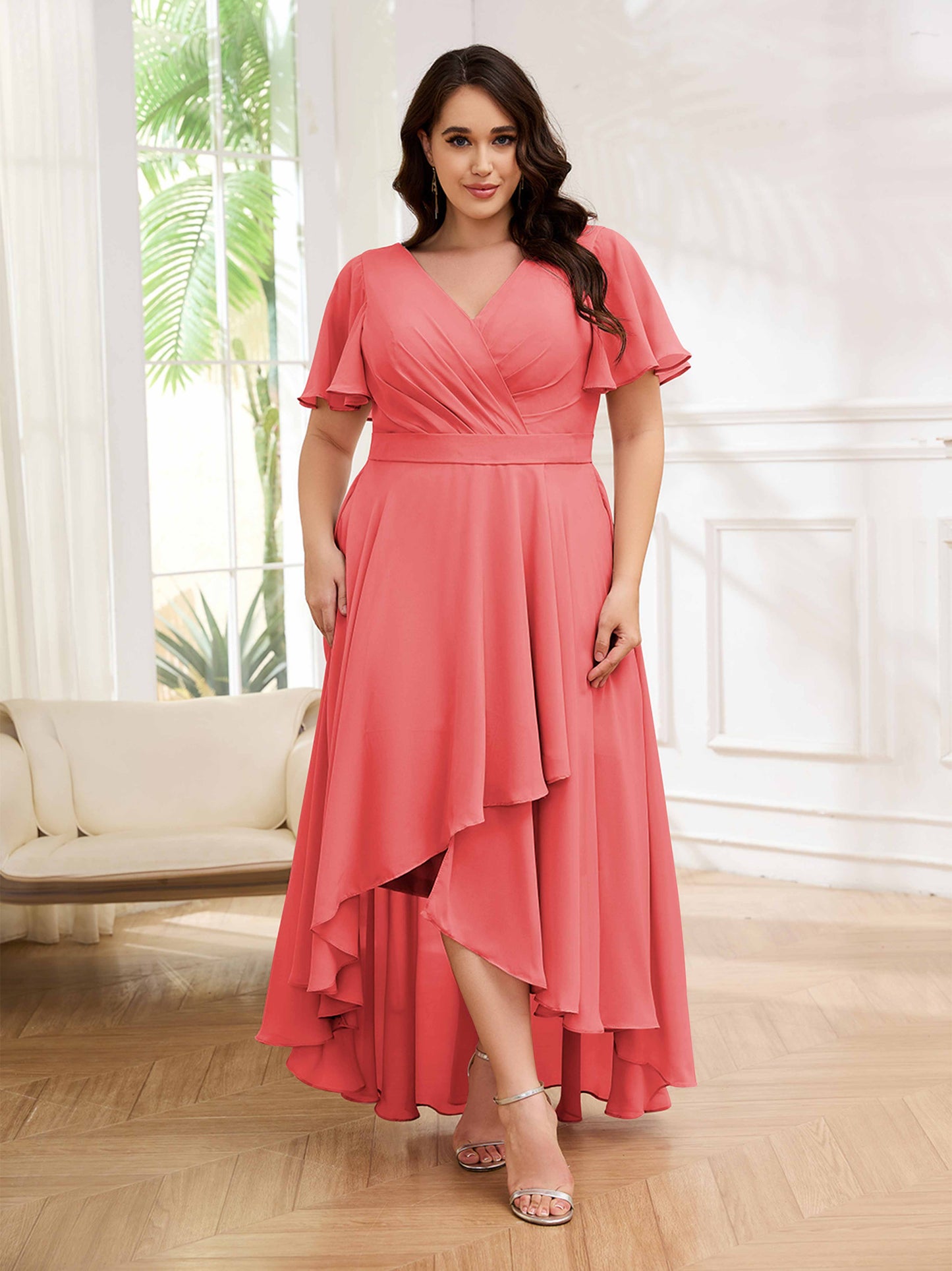 • Flatter your figure with these high-low ruched chiffon bridesmaid dresses. Designed for UK plus-size women, these dresses offer a flattering silhouette and stylish look. Perfect for a modern wedding, these dresses will make your bridesmaids look effortlessly chic.