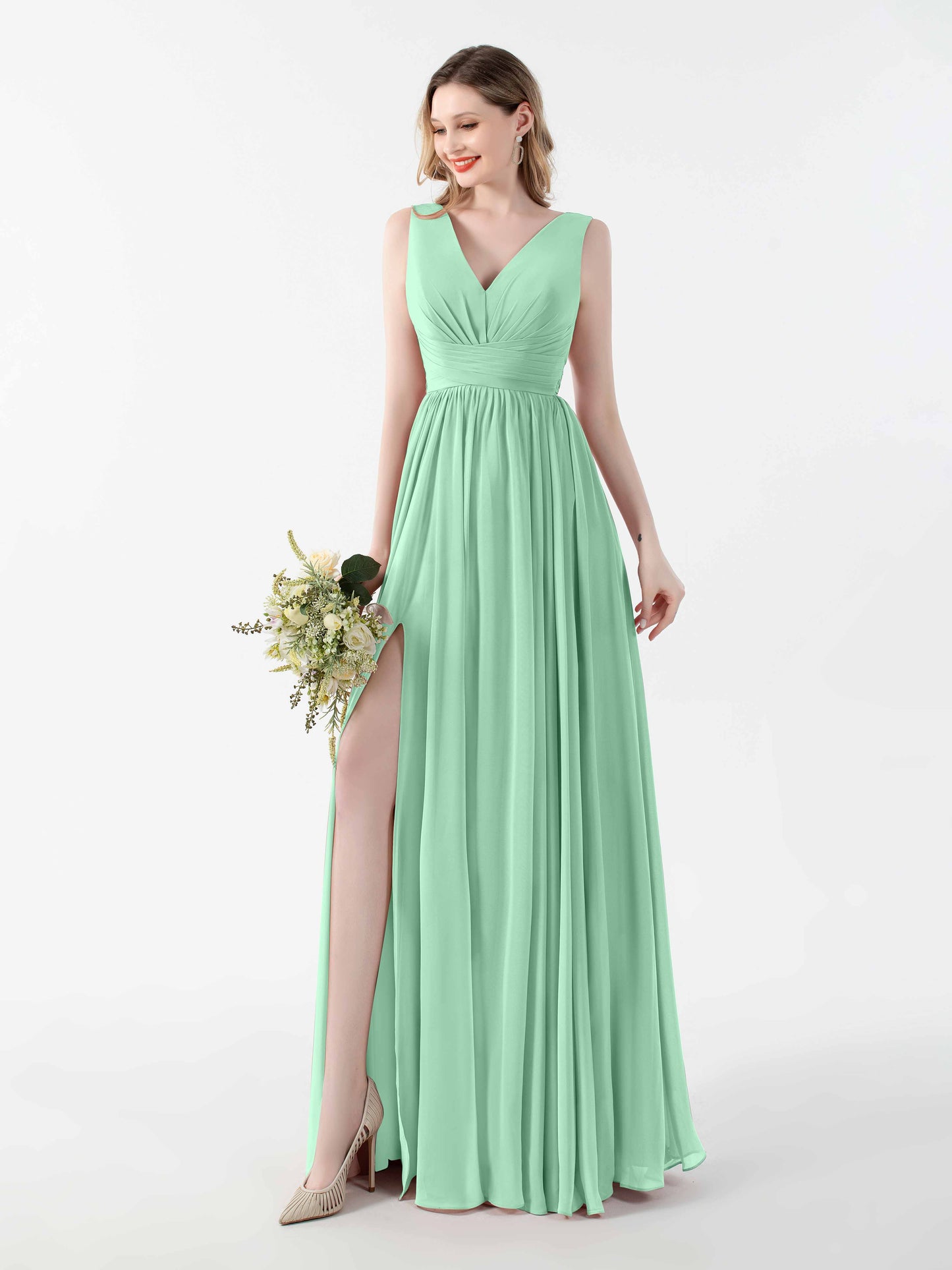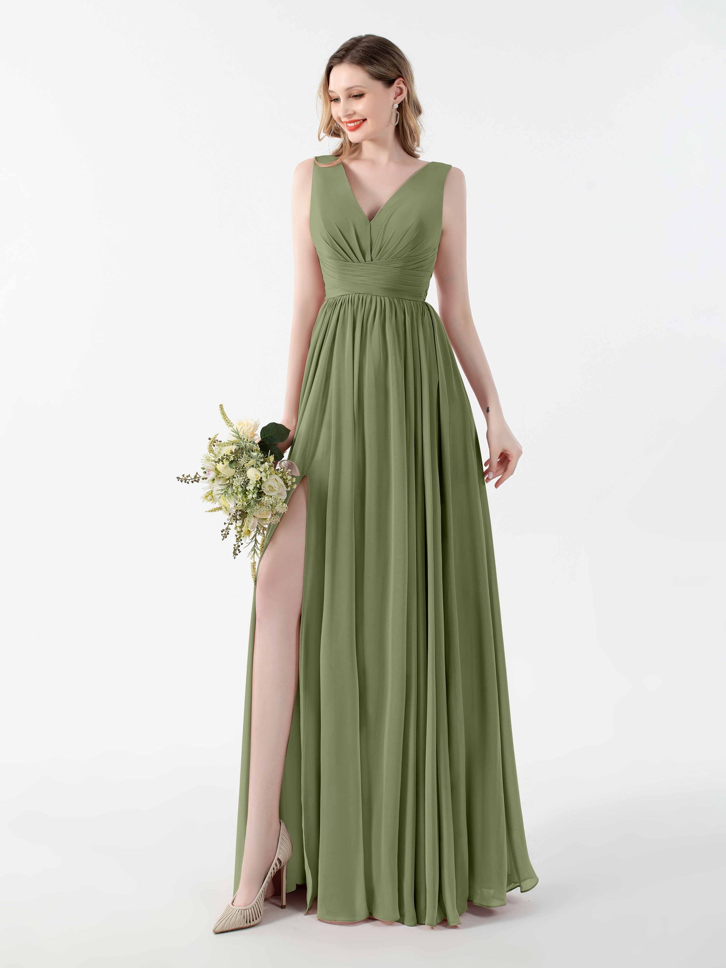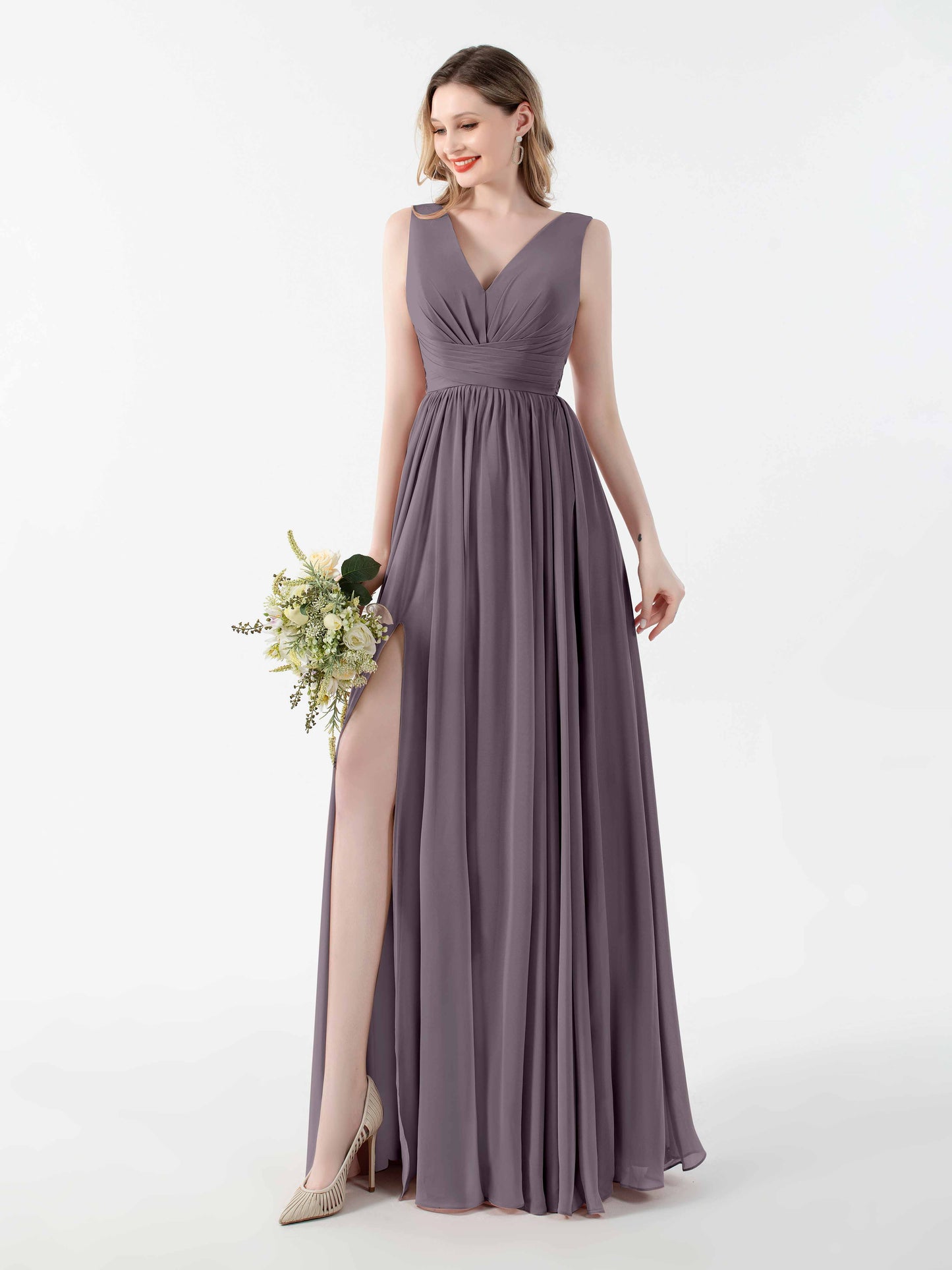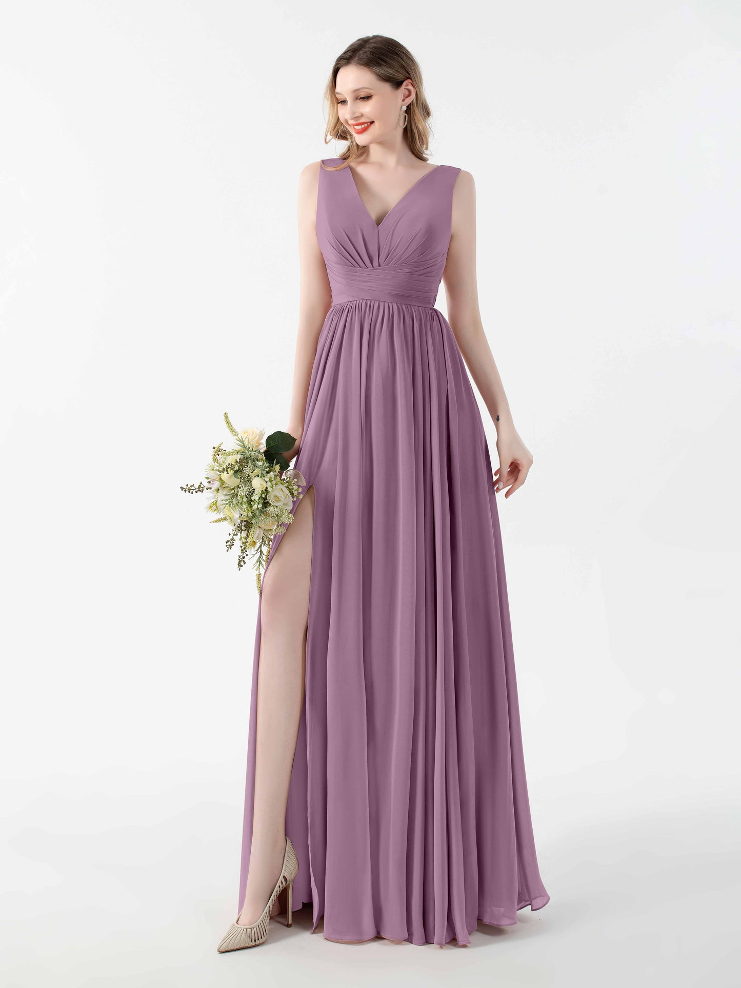 • Flatter your figure with Mollyevers'bridesmaid dresses. These dresses feature a flattering V-back design, a graceful floor-length silhouette, and a seductive slit, adding a touch of allure to your look. Crafted from delicate chiffon fabric, they offer both style and comfort. Dress your bridesmaids in elegance and sophistication with Mollyevers.