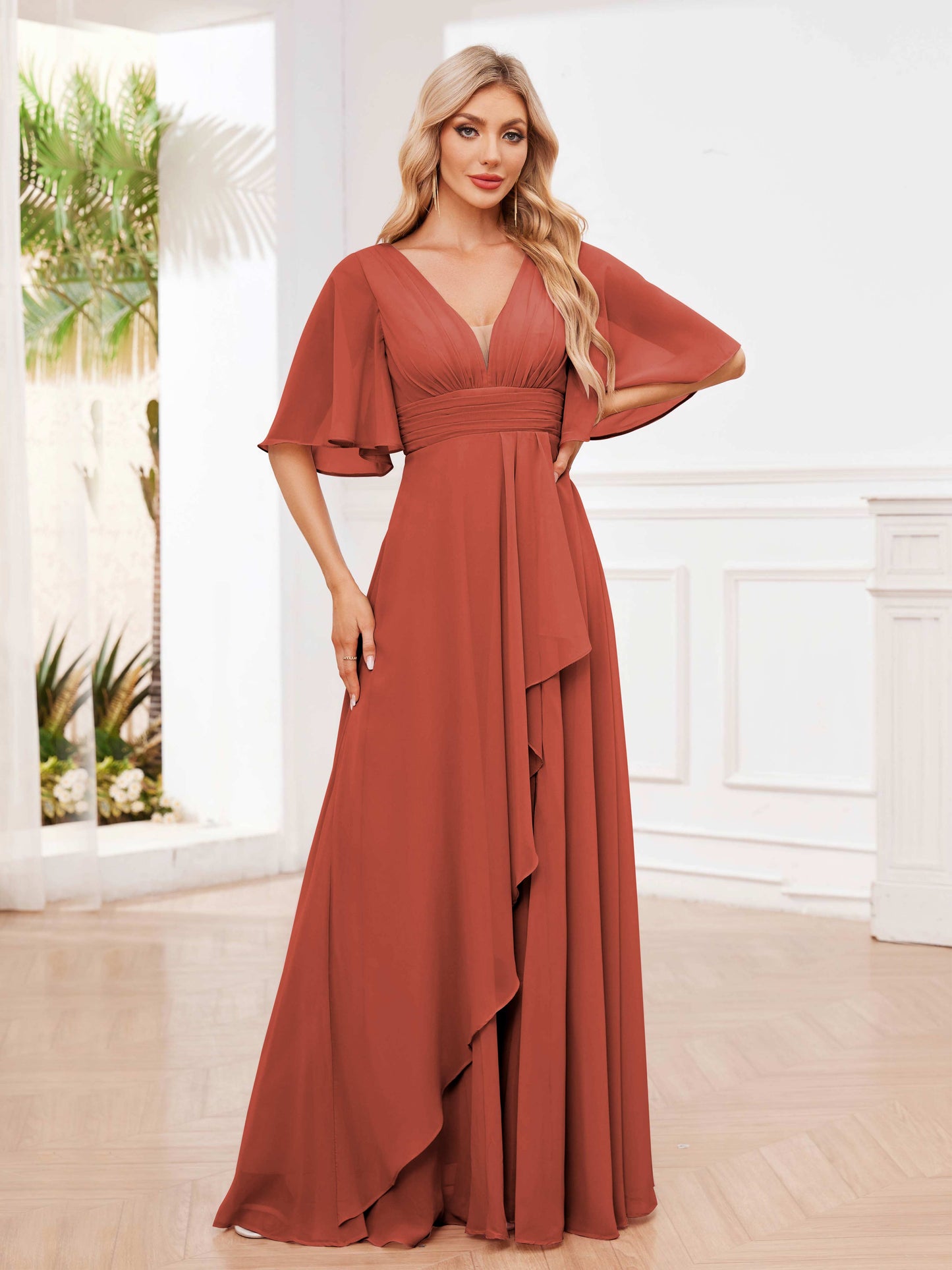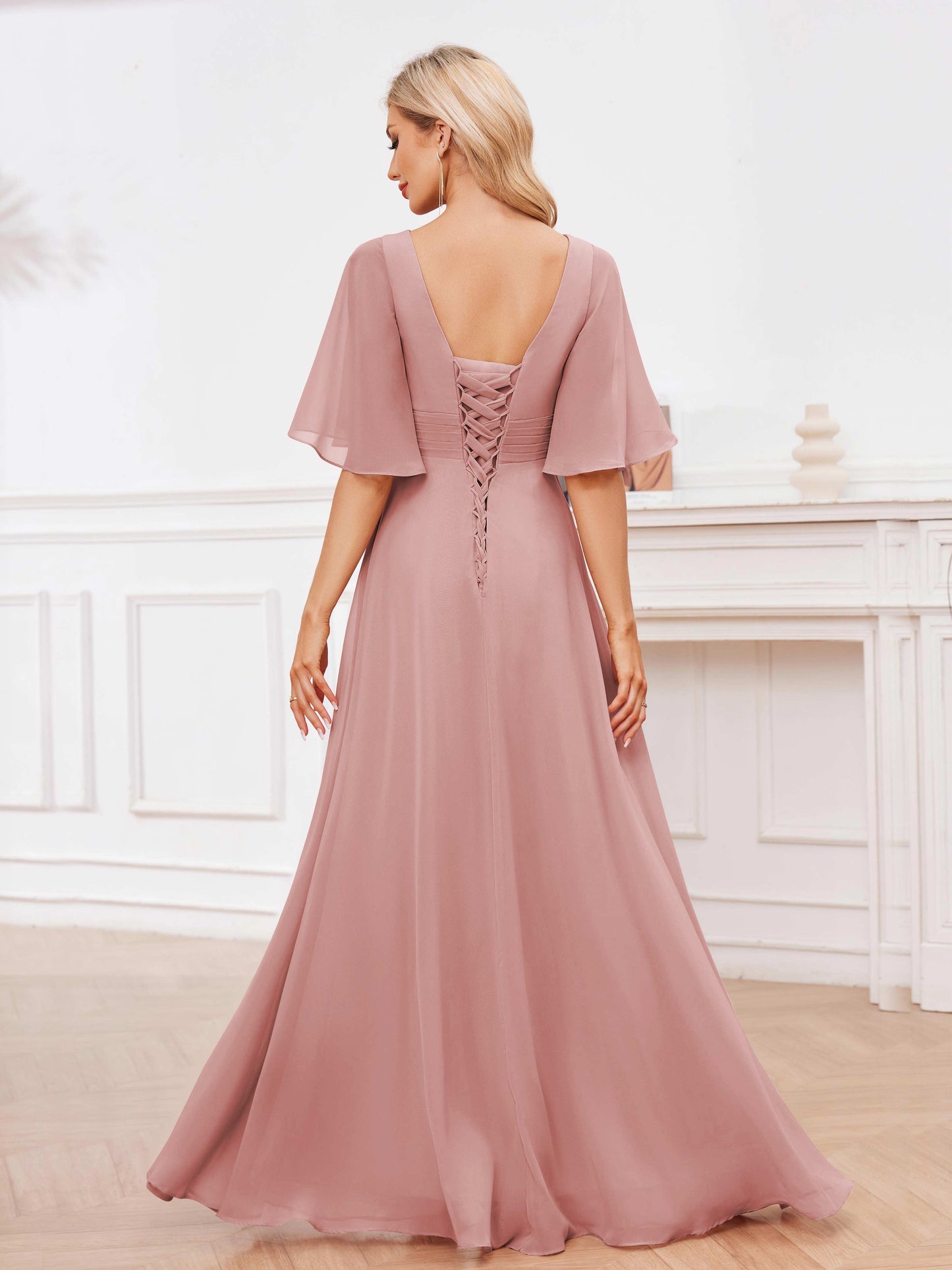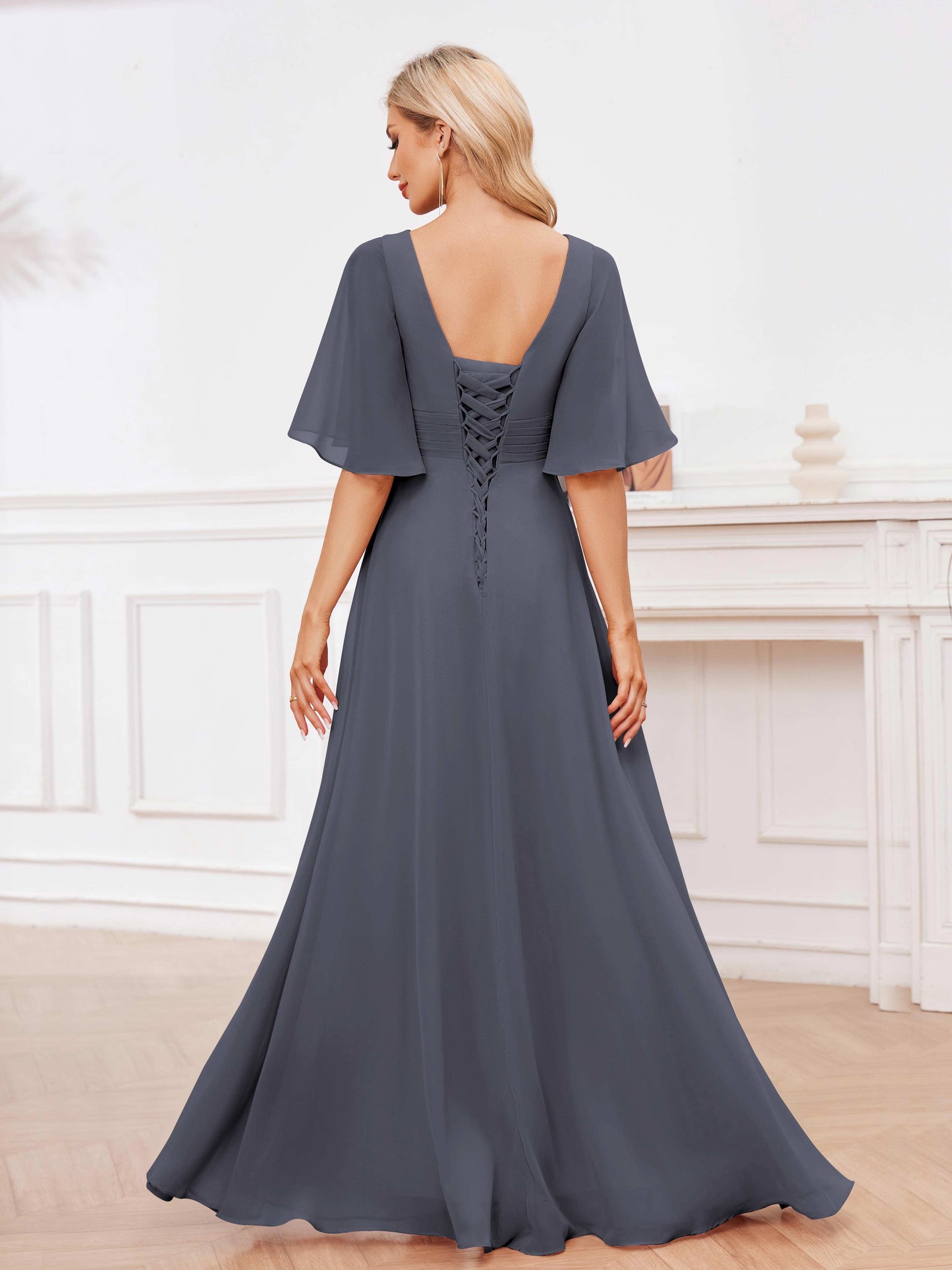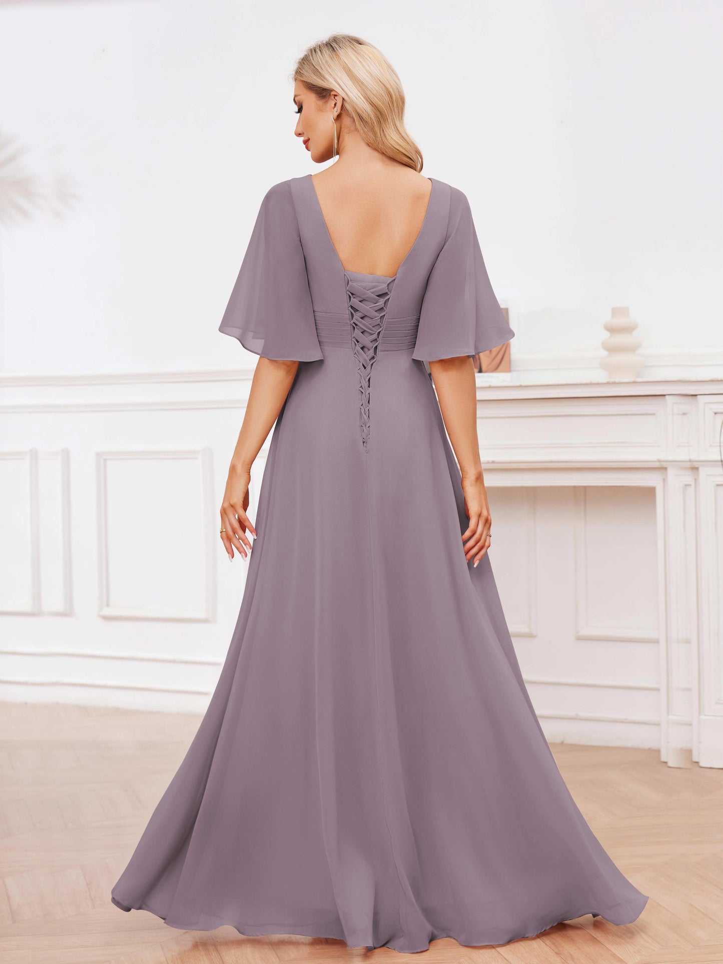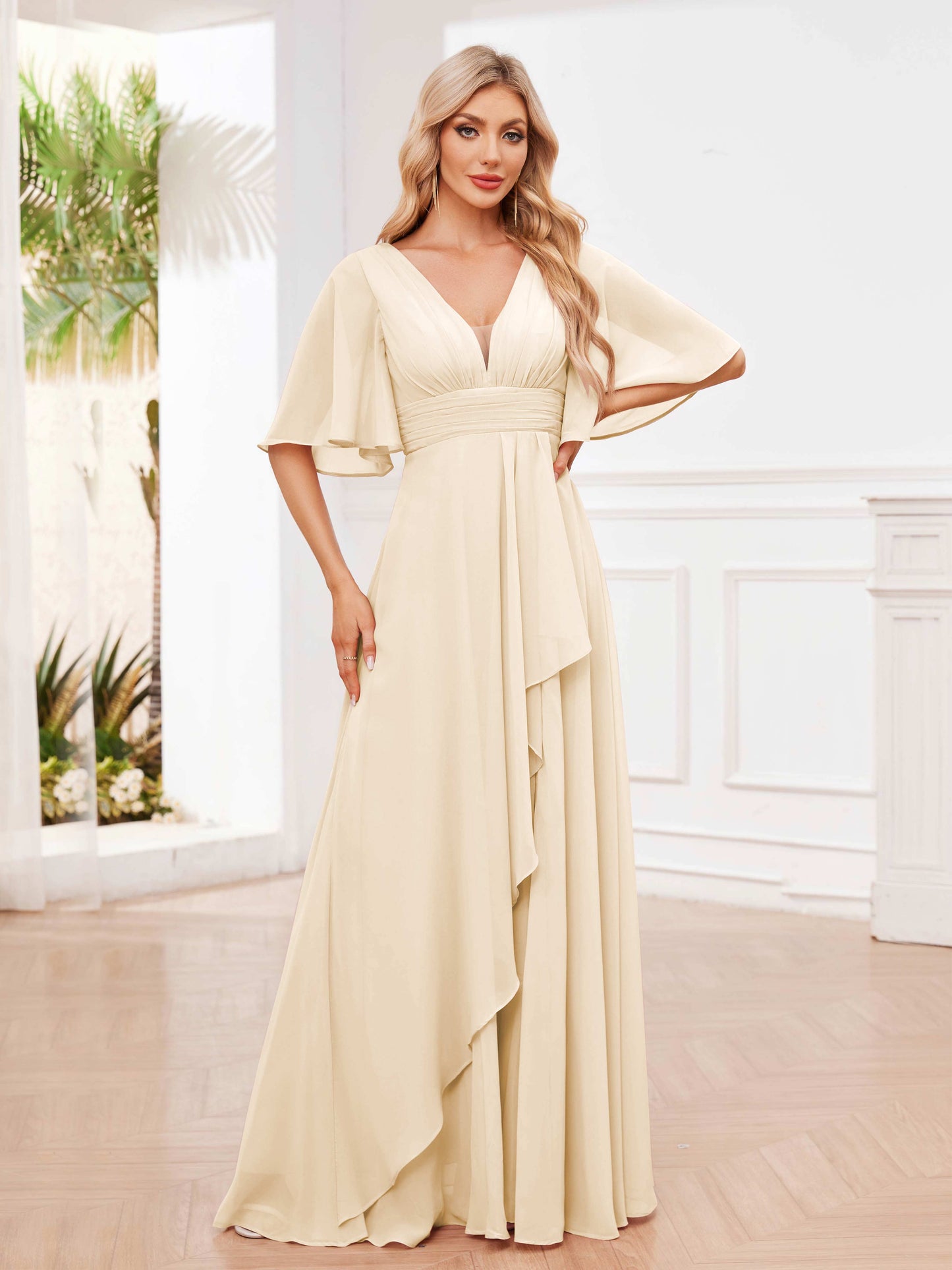 • Embrace effortless elegance in the Flowing A-Line Short Sleeves Floor-Length Chiffon Bridesmaid Dress from Mollyevers. Featuring delicate short sleeves, a flattering A-line silhouette, and a flowing chiffon skirt, this floor-length dress offers a timeless, sophisticated look, making it perfect for bridesmaids at any wedding or formal occasion.
