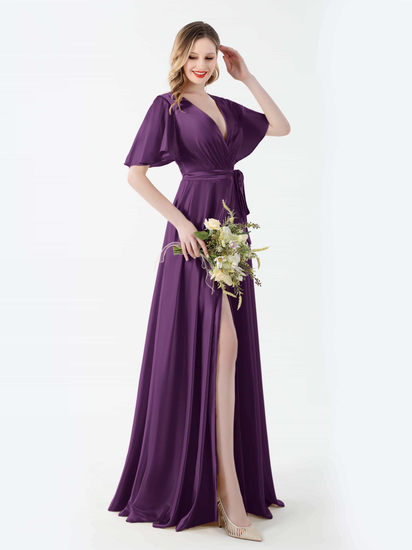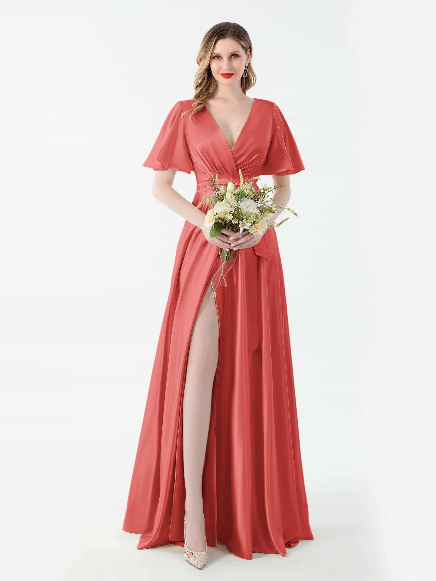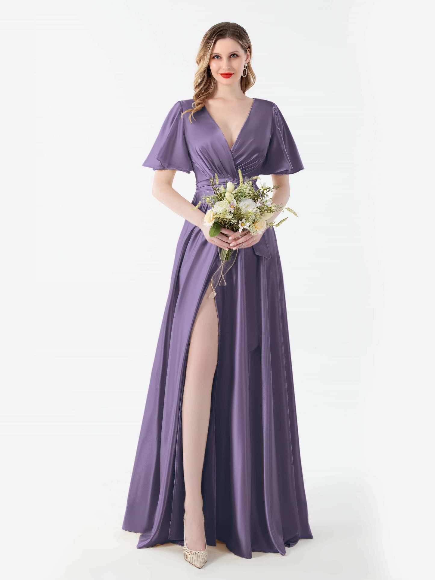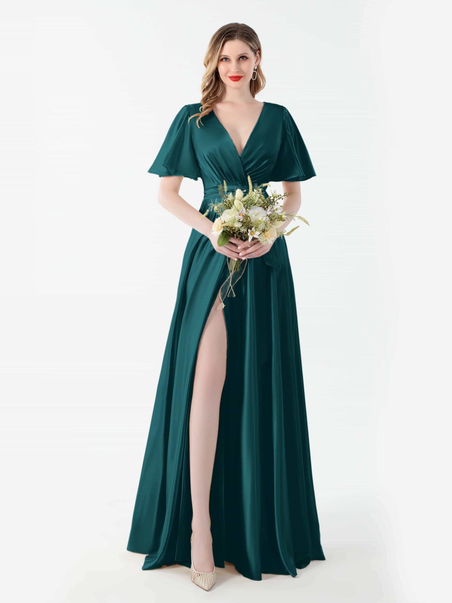 • Radiate glamour with the Nora Glamorous V Neck Slit Floor Length Satin Bridesmaid Dress by Mollyevers. Featuring a glamorous V-neckline and a striking floor-length silhouette, this dress is a true showstopper.