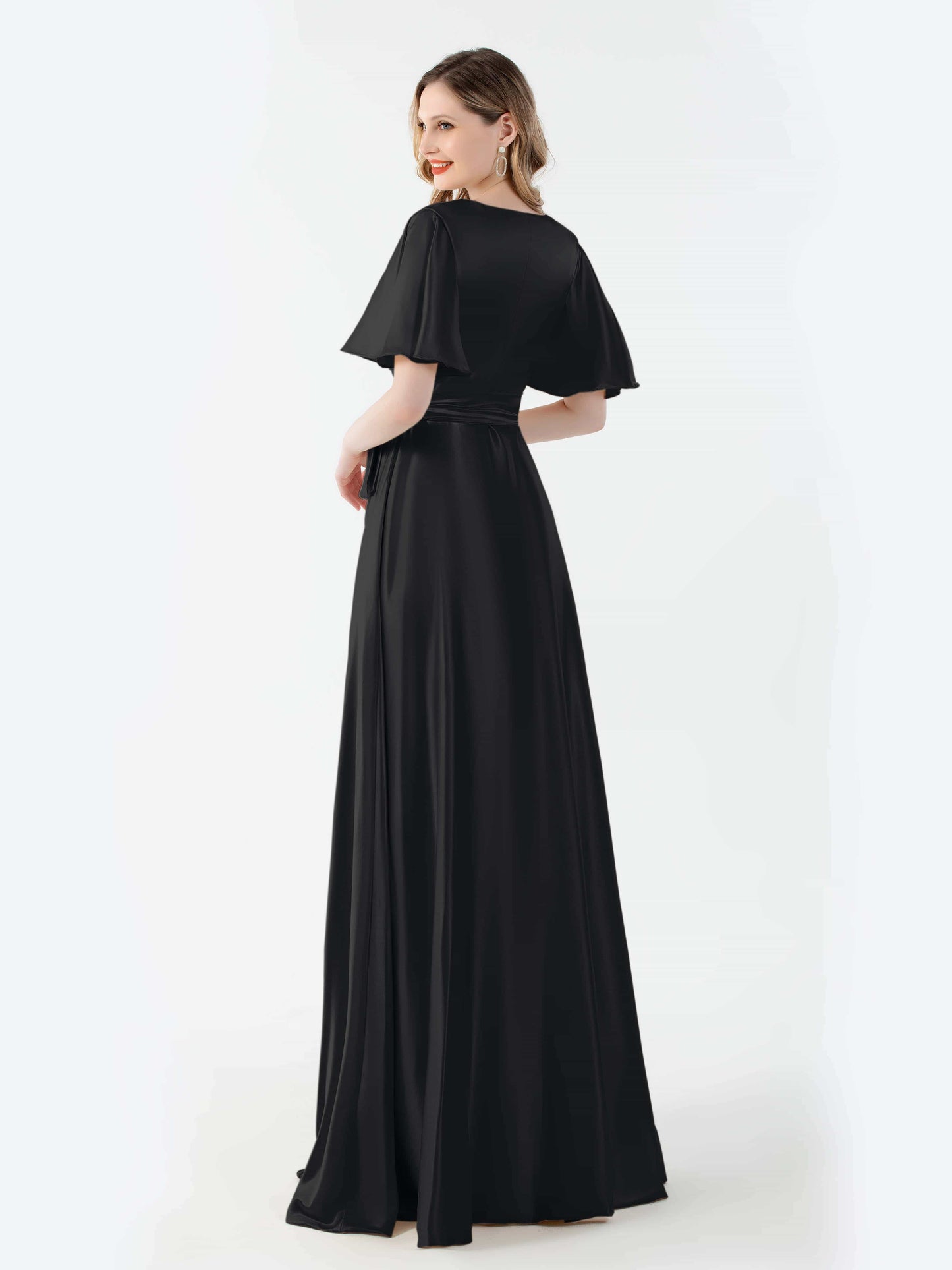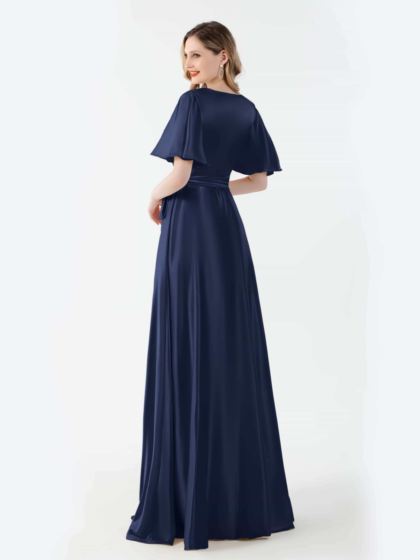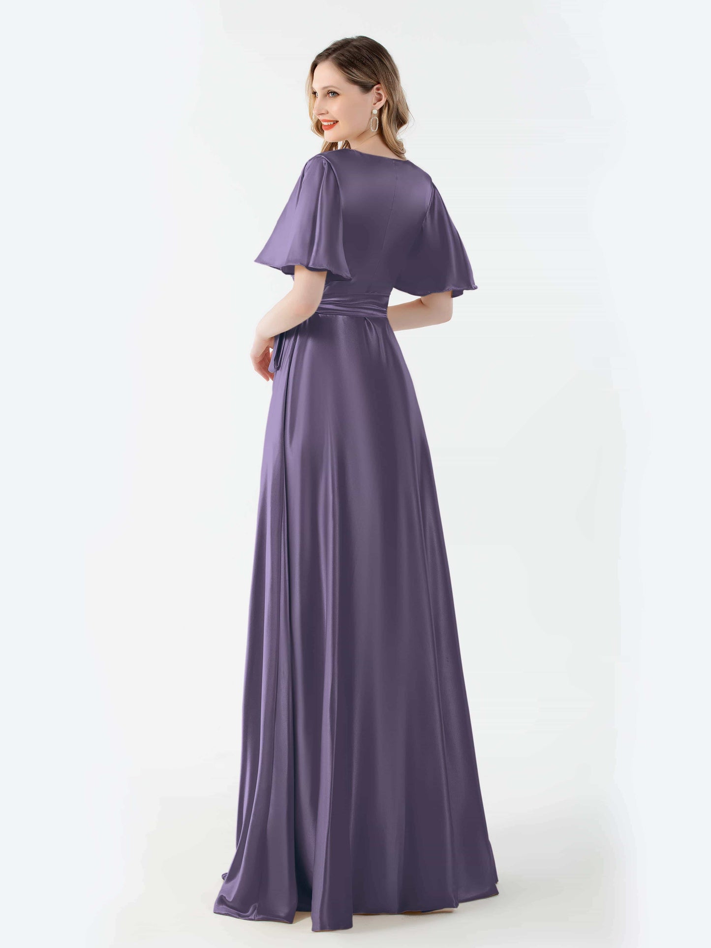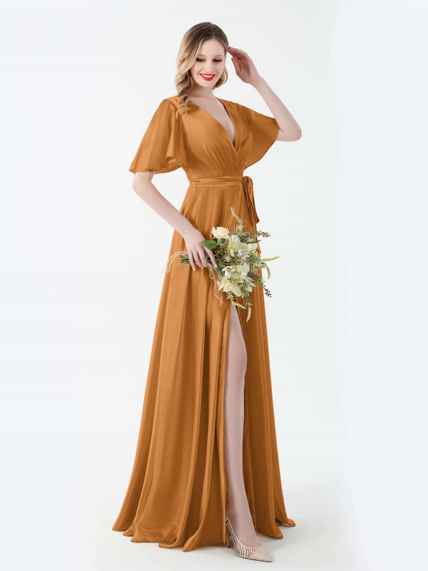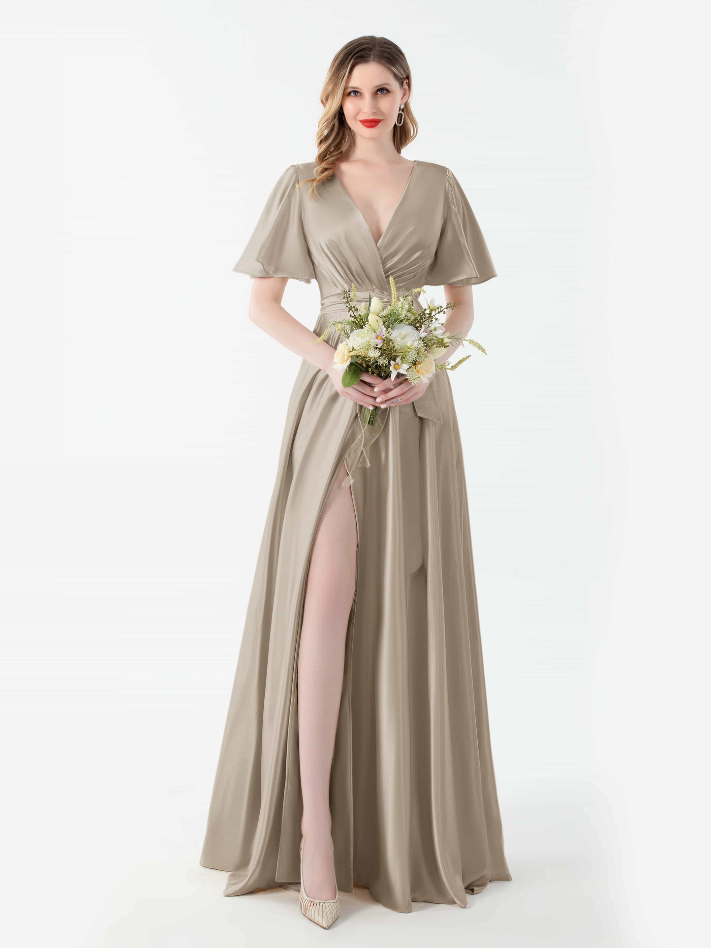 • Radiate glamour with the Nora Glamorous V Neck Slit Floor Length Satin Bridesmaid Dress by Mollyevers. Featuring a glamorous V-neckline and a striking floor-length silhouette, this dress is a true showstopper.