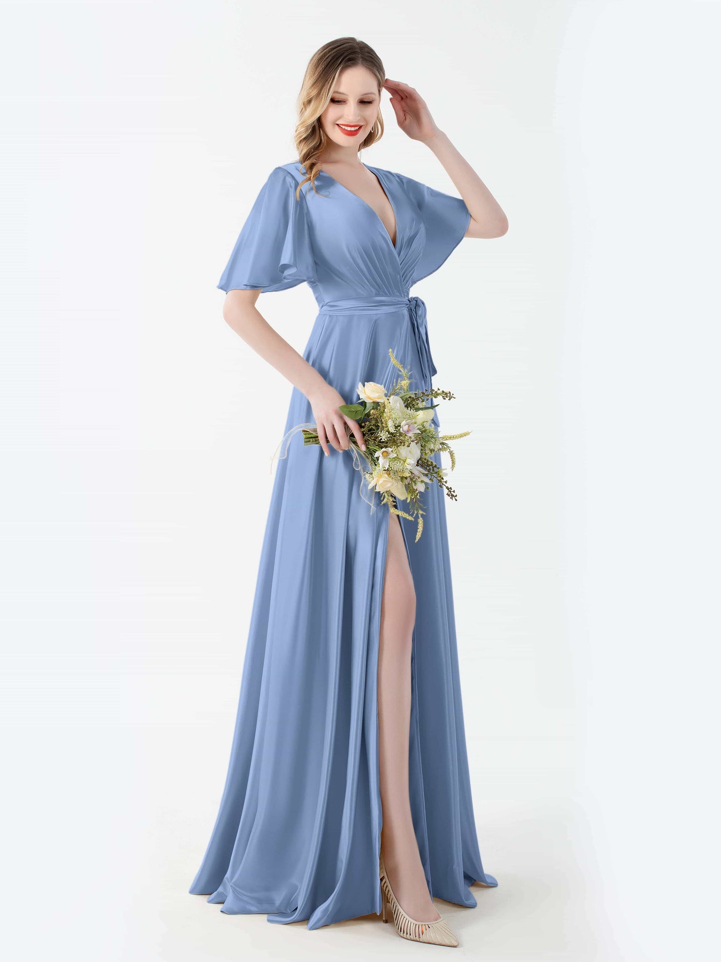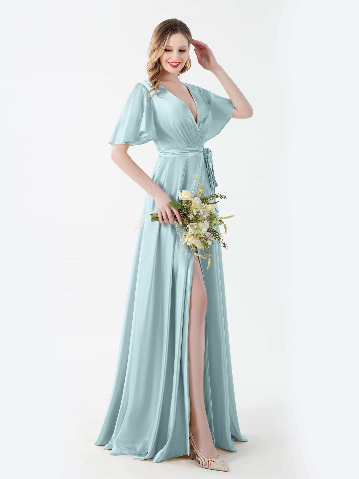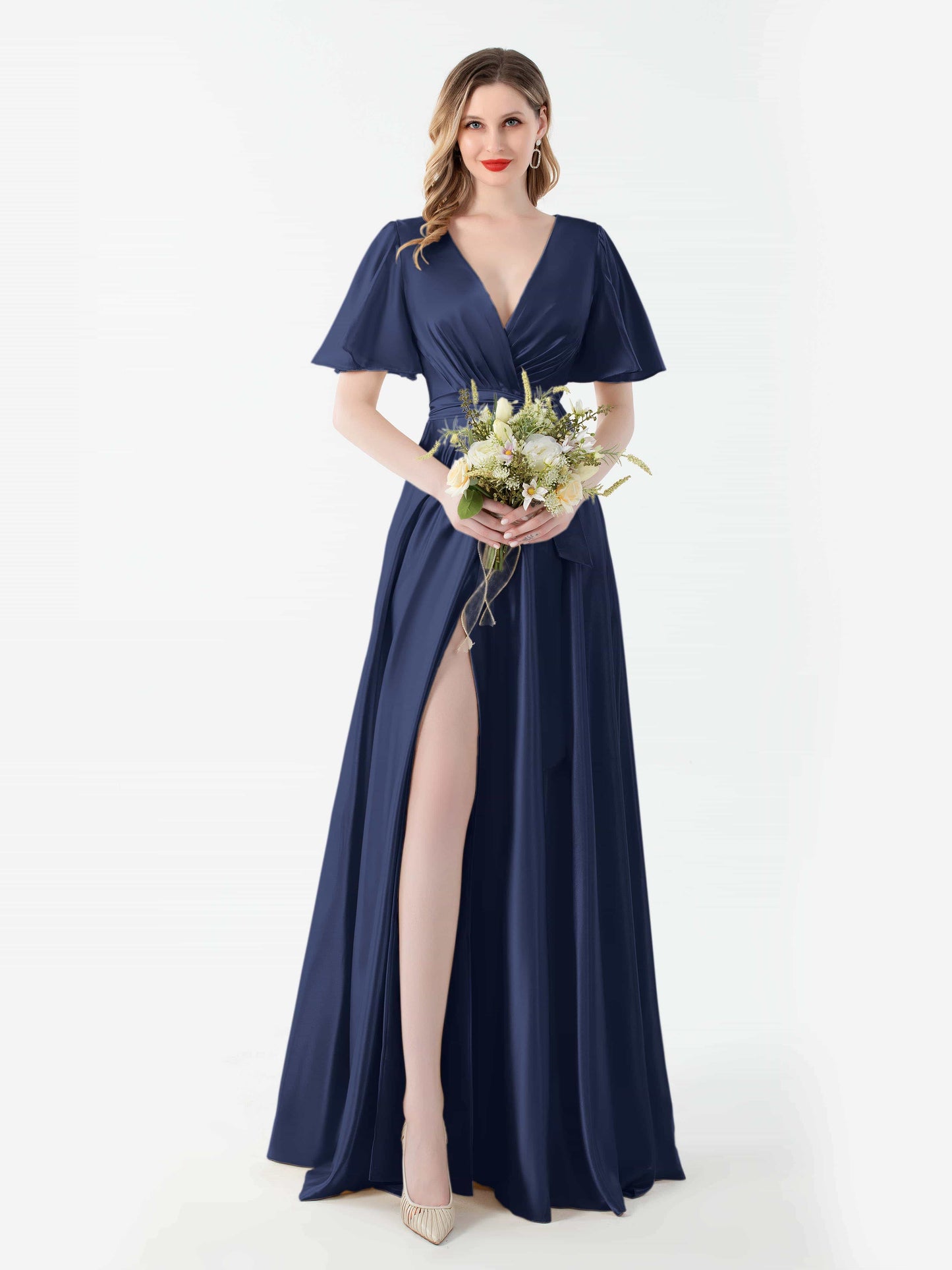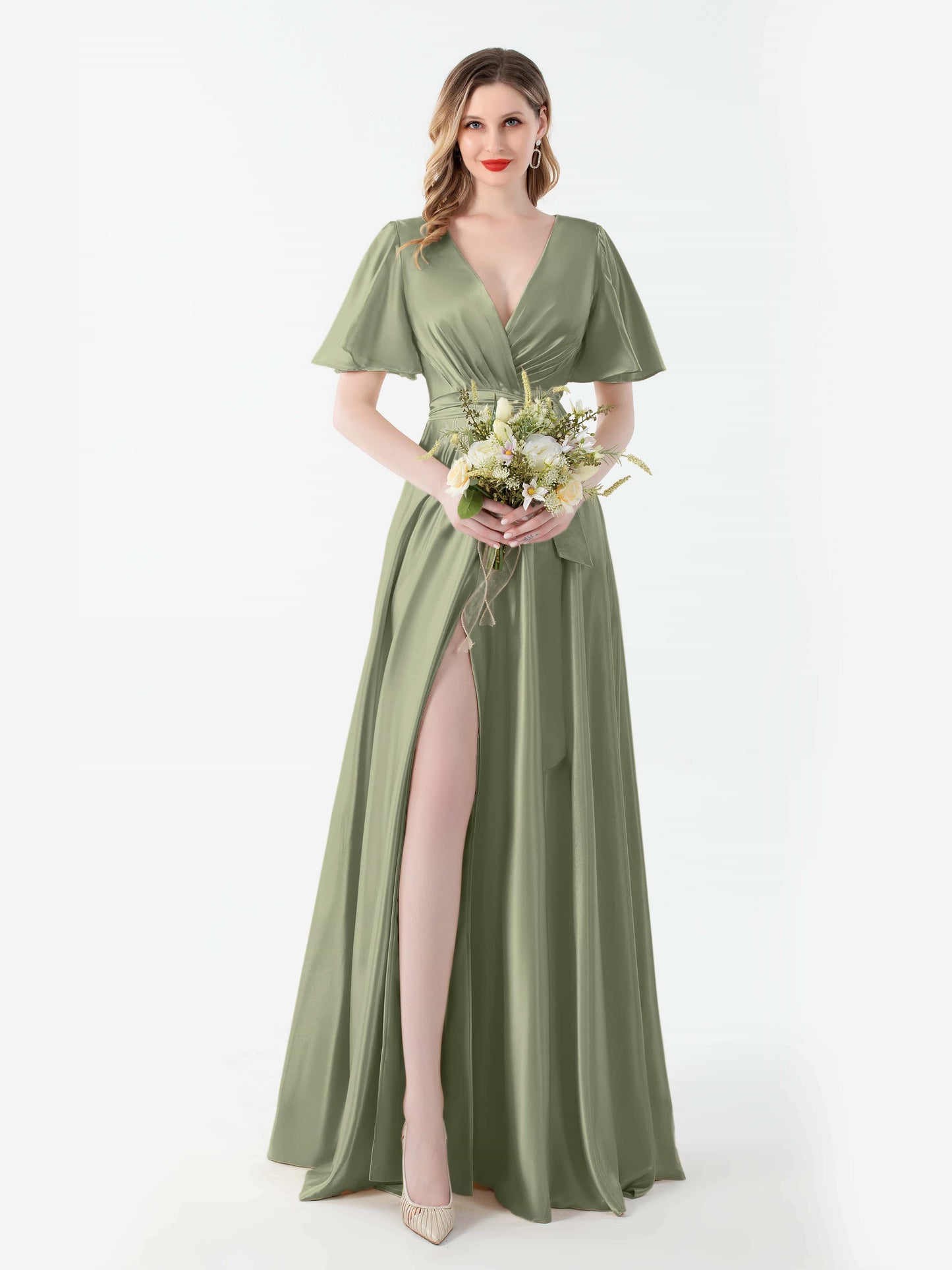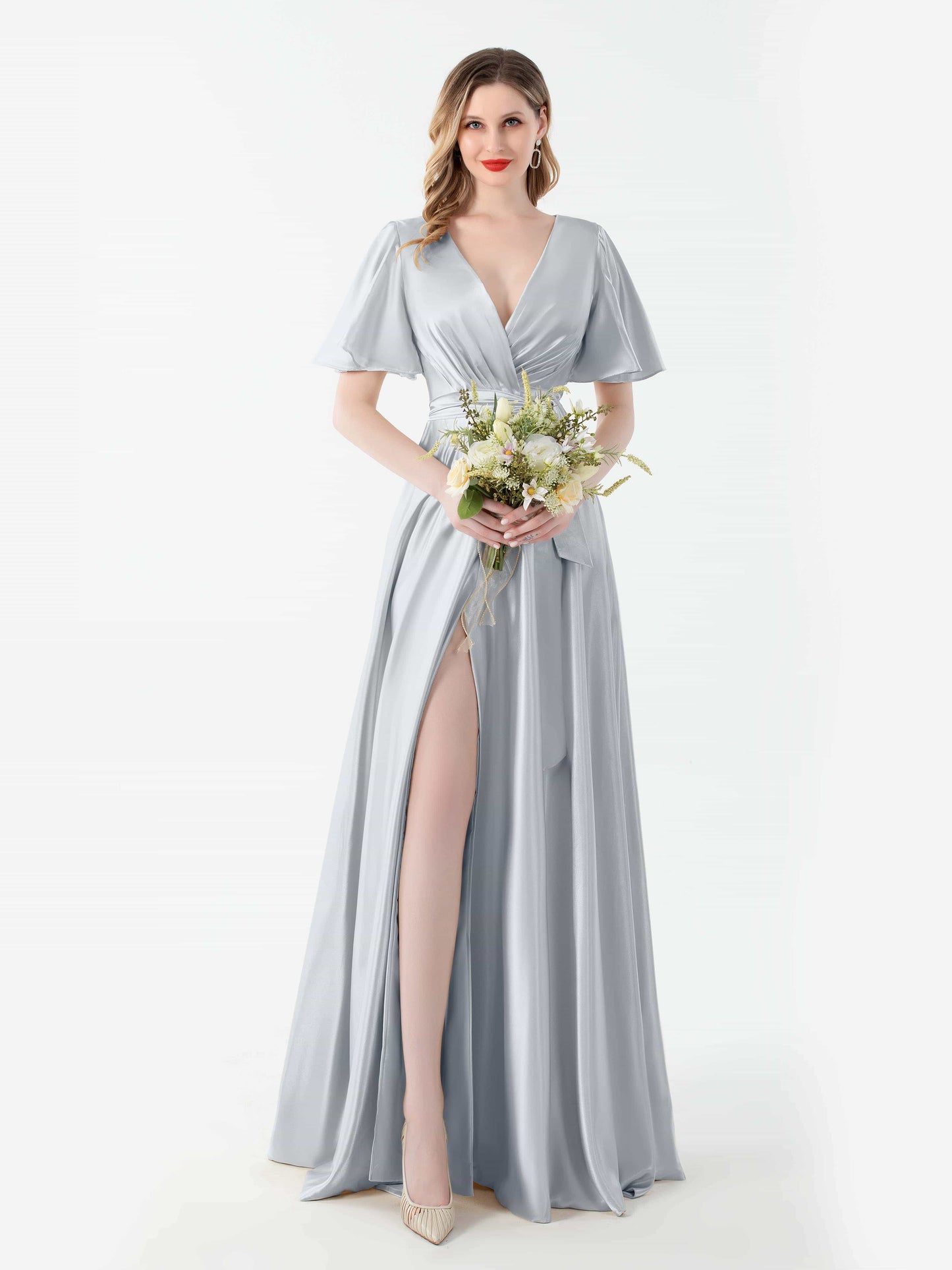 Glamorous V Neck Slit Floor Length Satin Bridesmaid Dresses UK