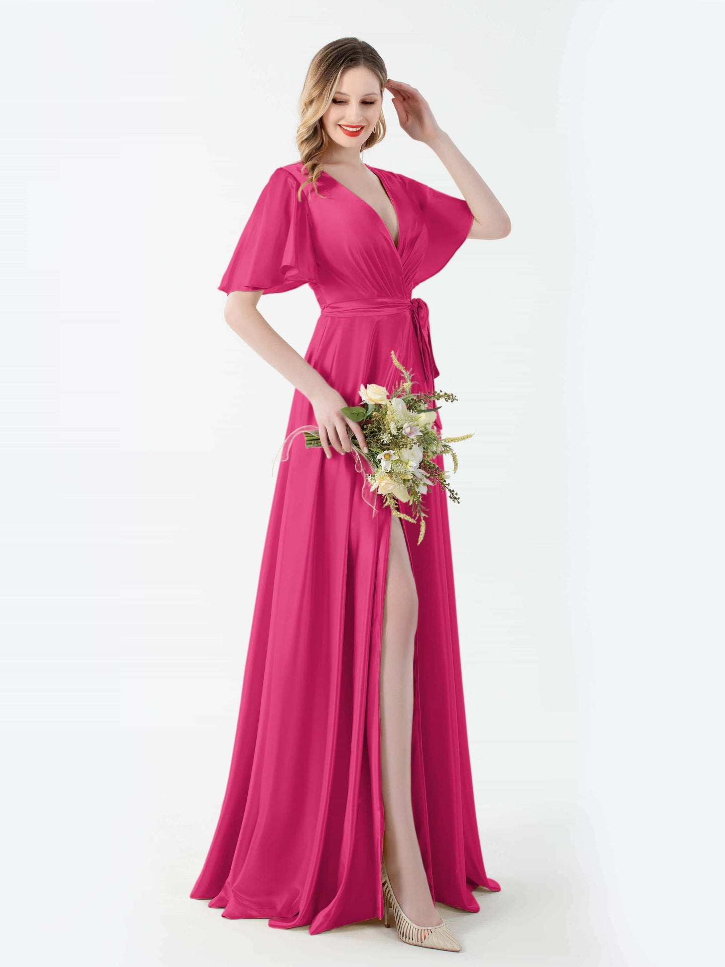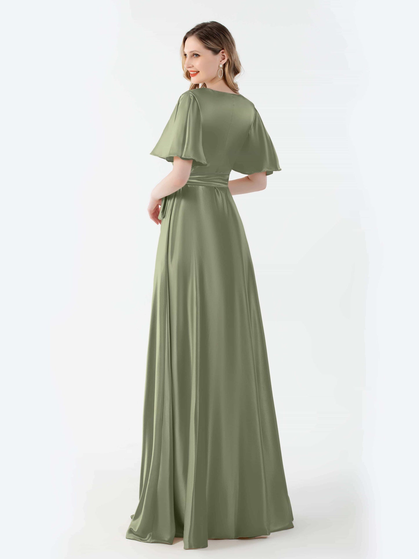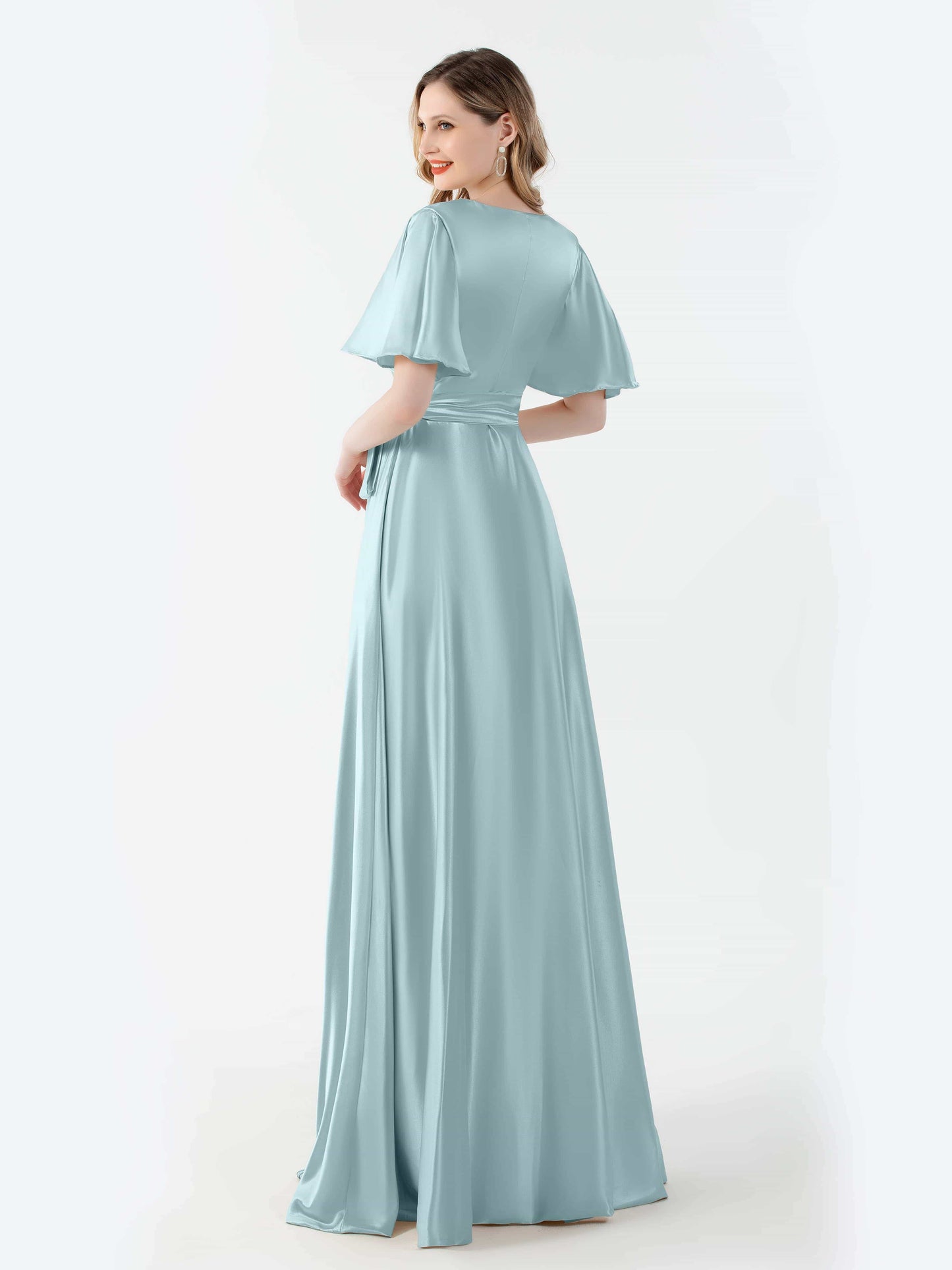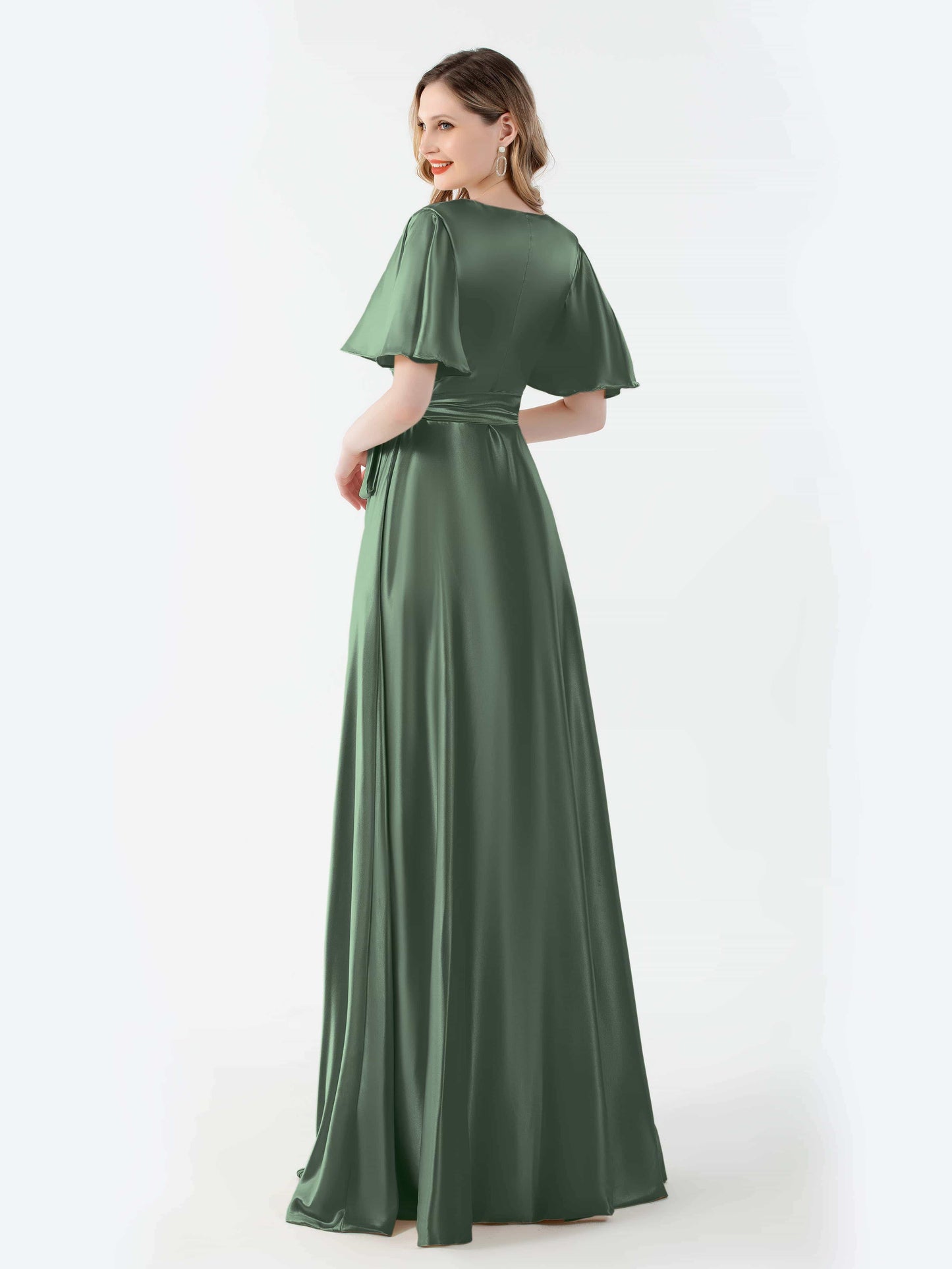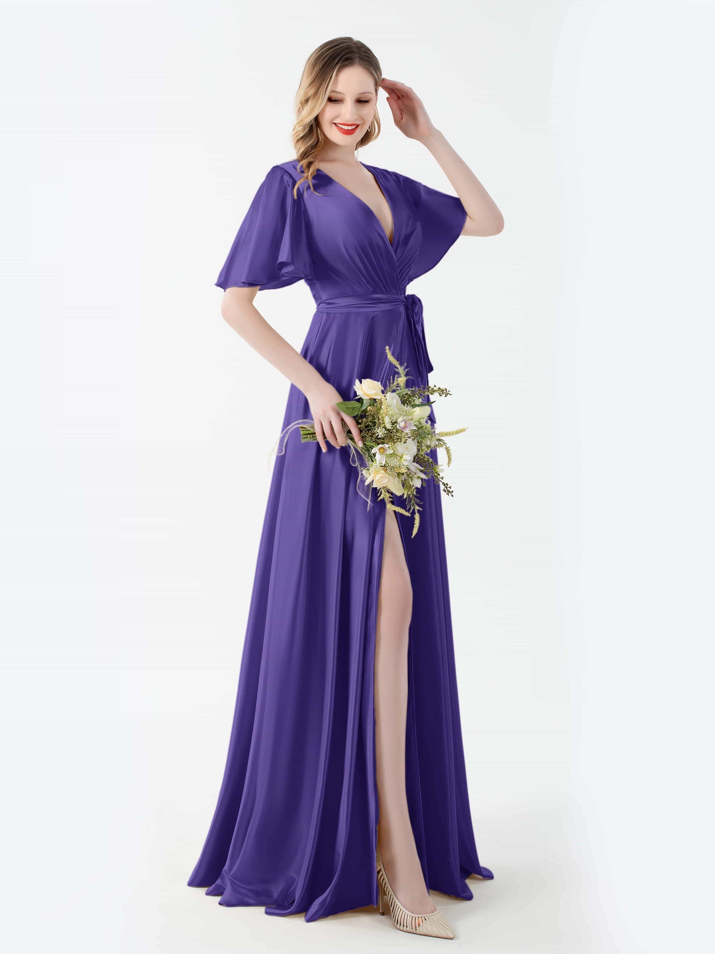 Glamorous V Neck Slit Floor Length Satin Bridesmaid Dresses UK