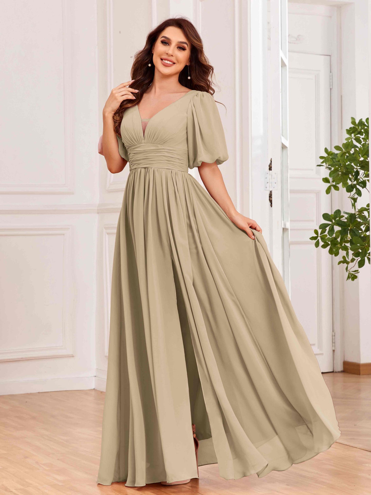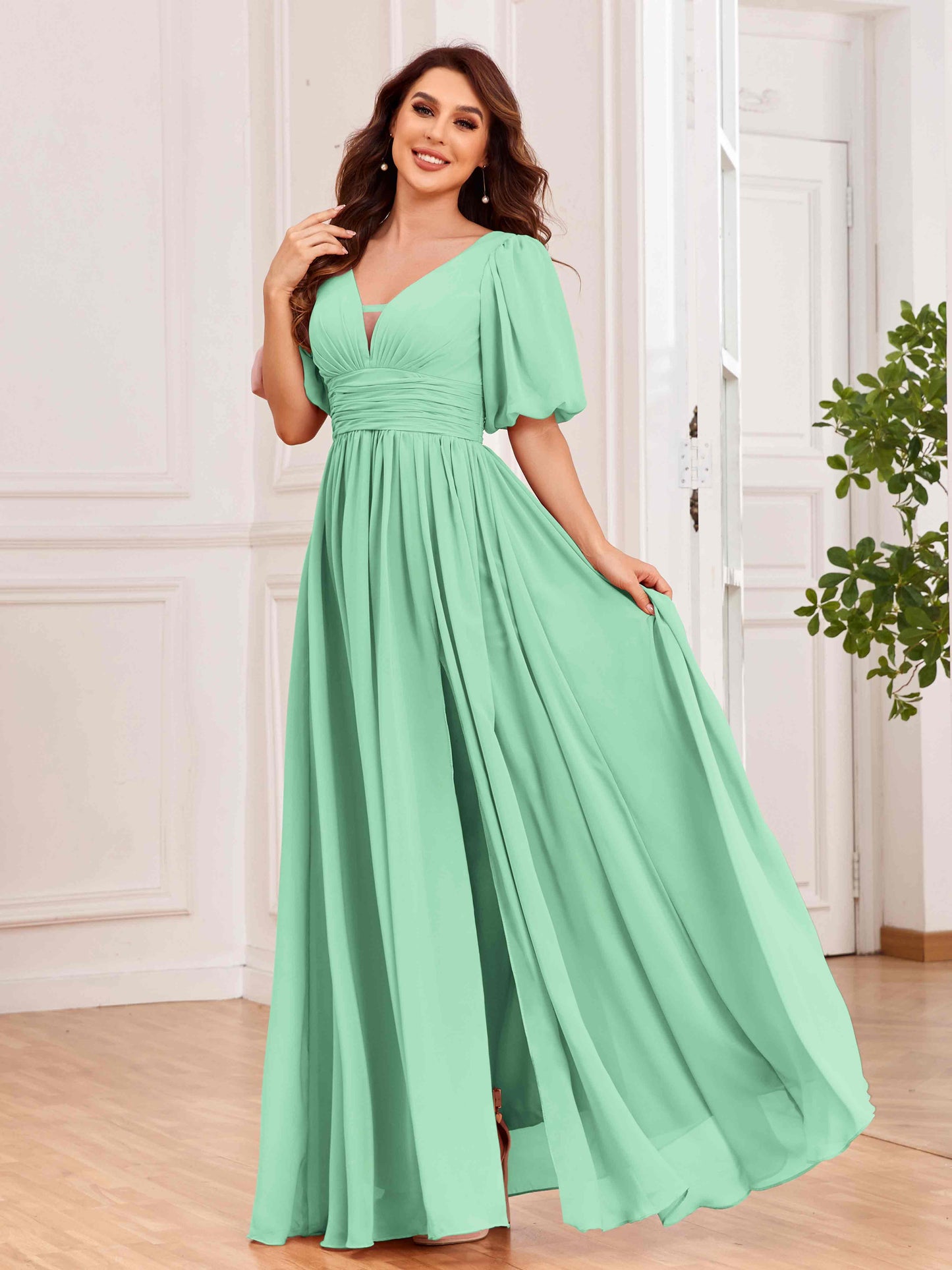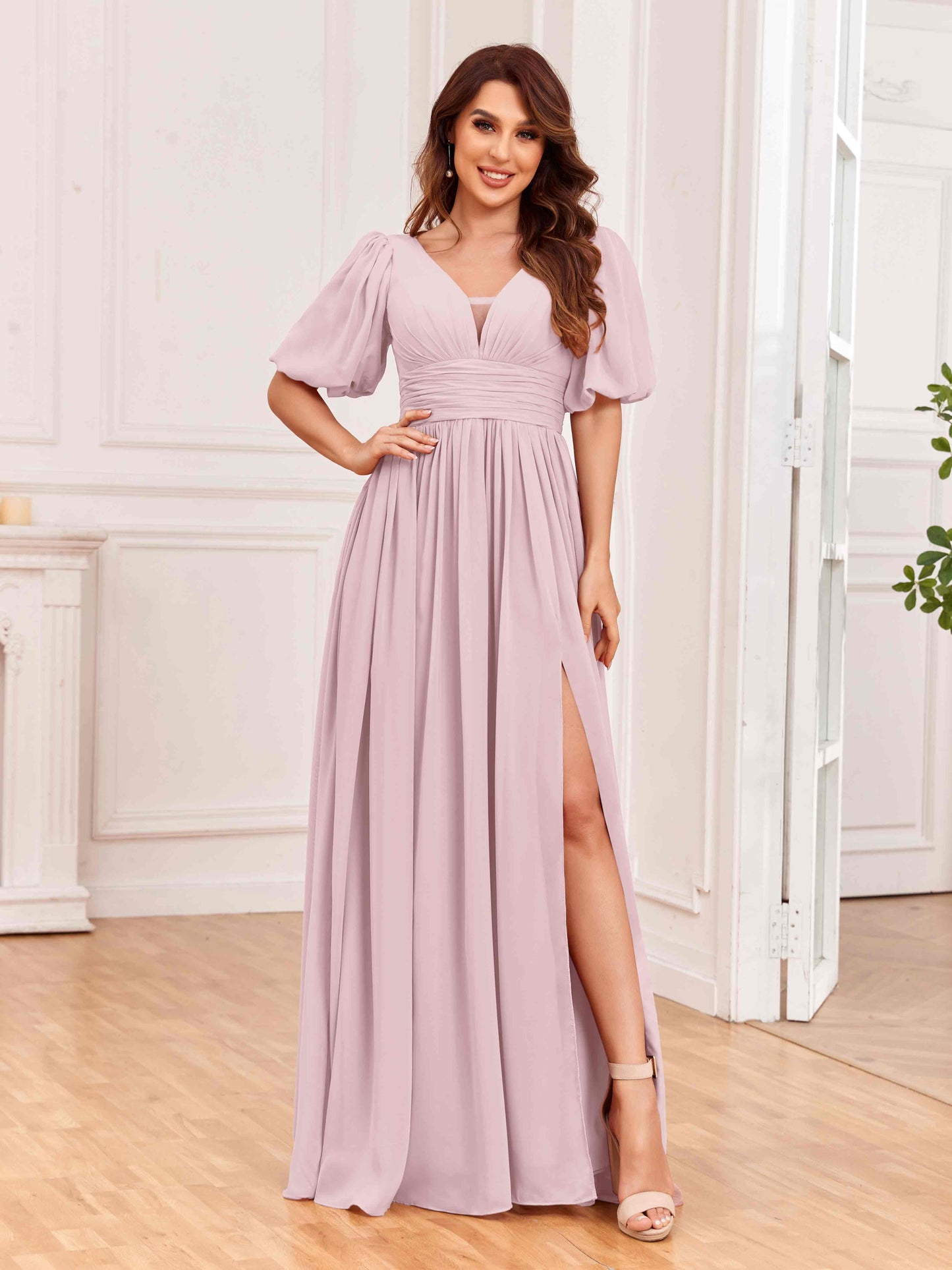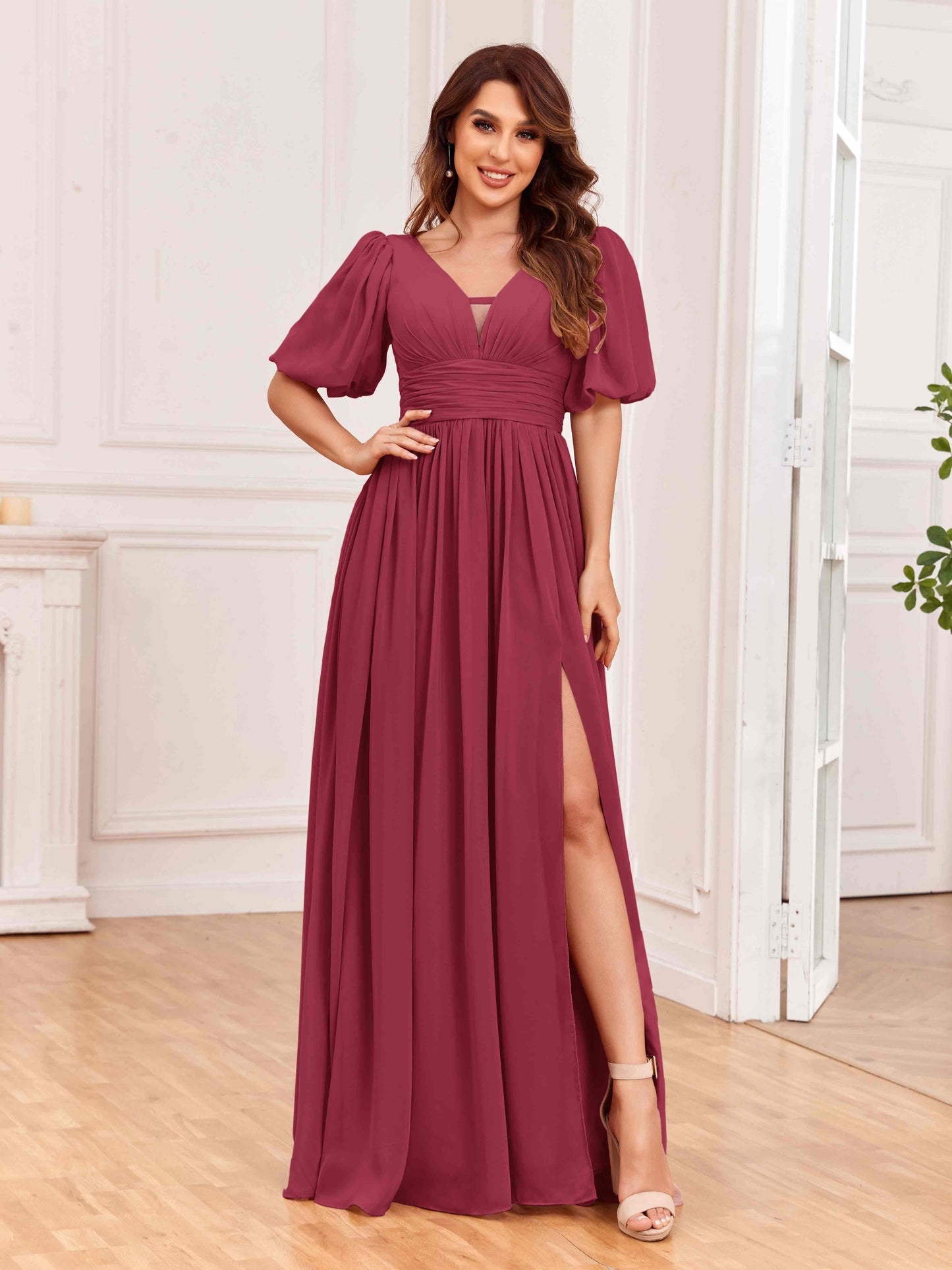 Gleaming V Neck Lantern Sleeves Slit Chiffon Bridesmaid Dresses UK