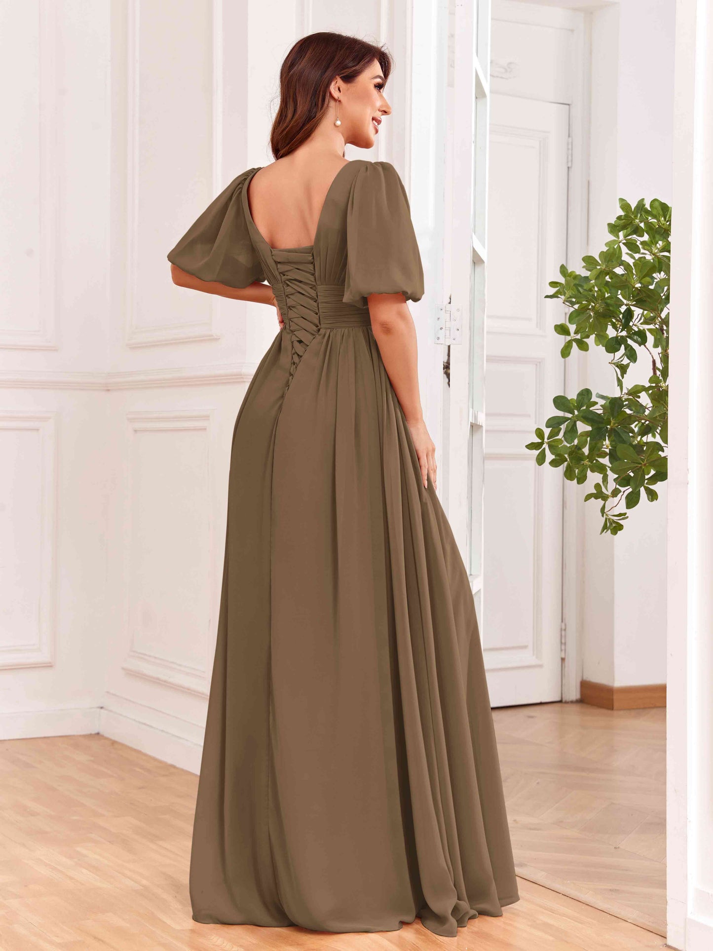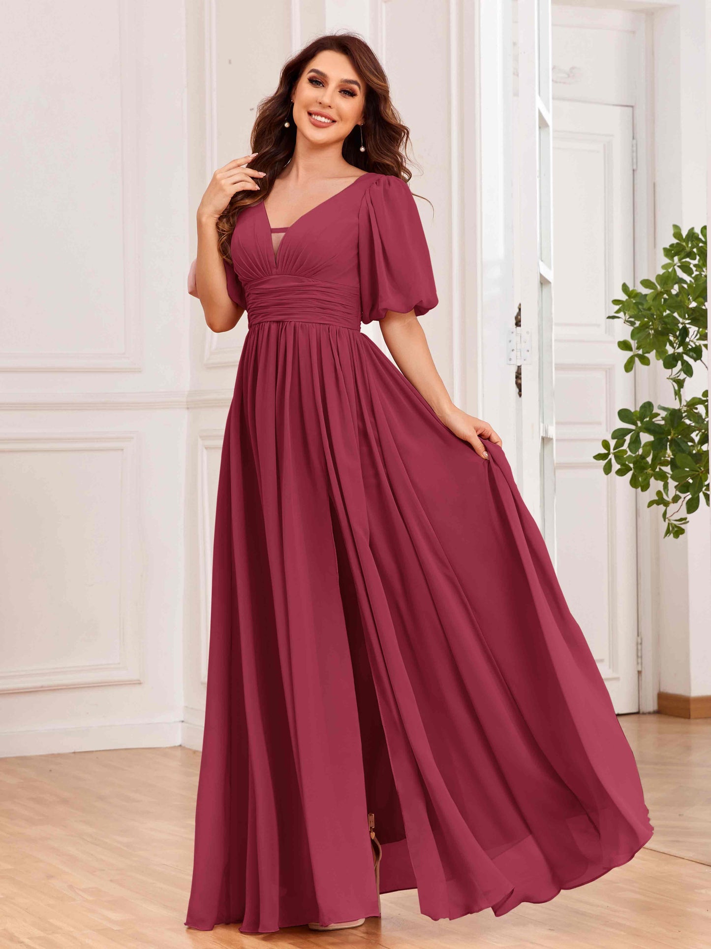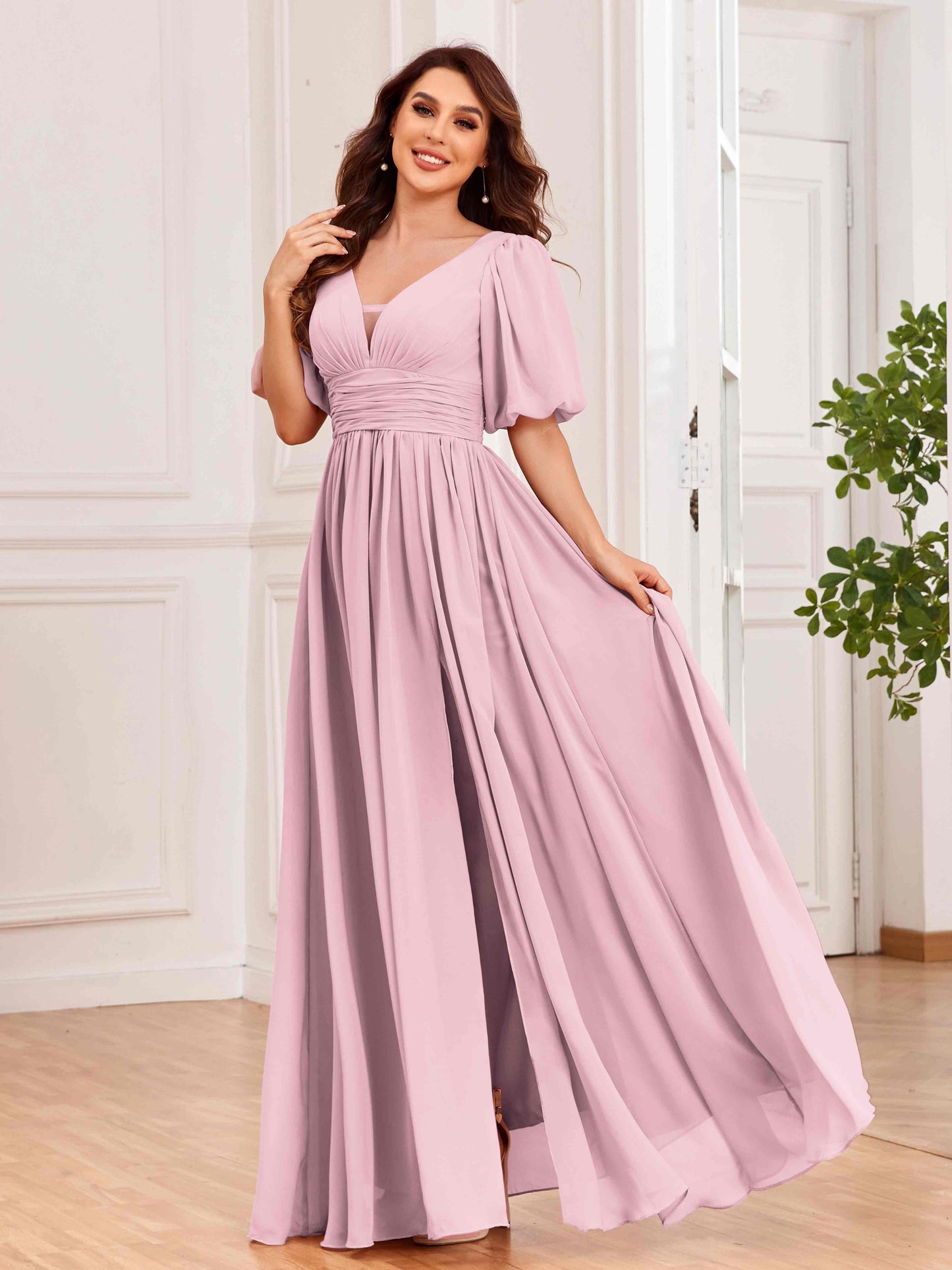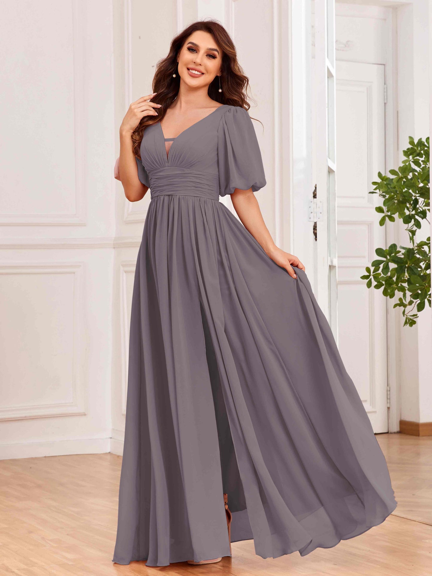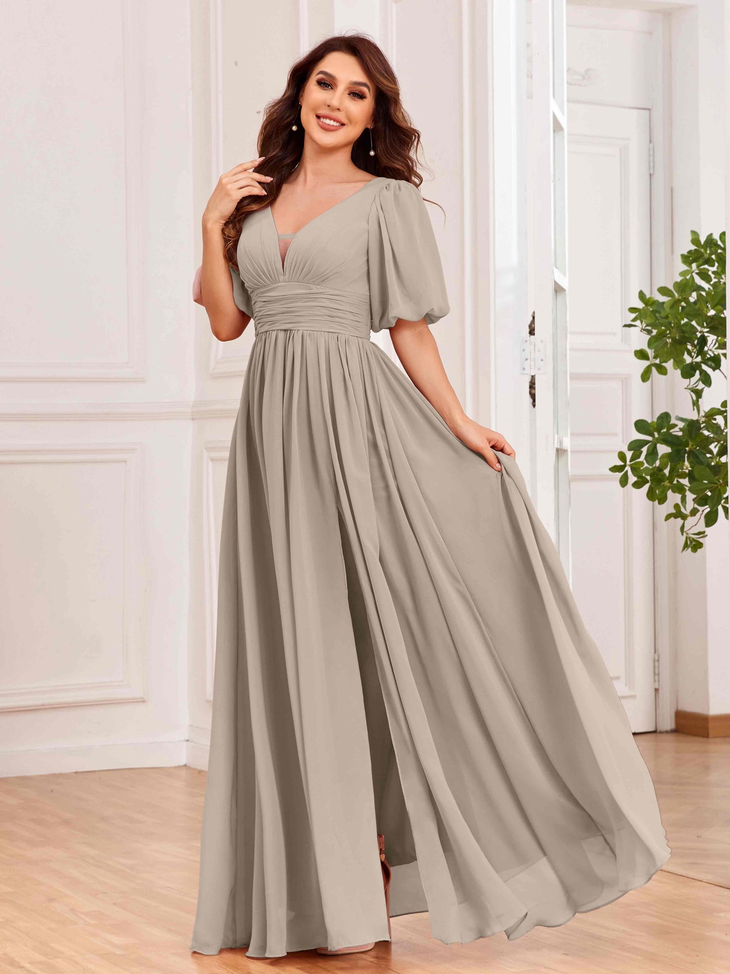 Gleaming V Neck Lantern Sleeves Slit Chiffon Bridesmaid Dresses UK