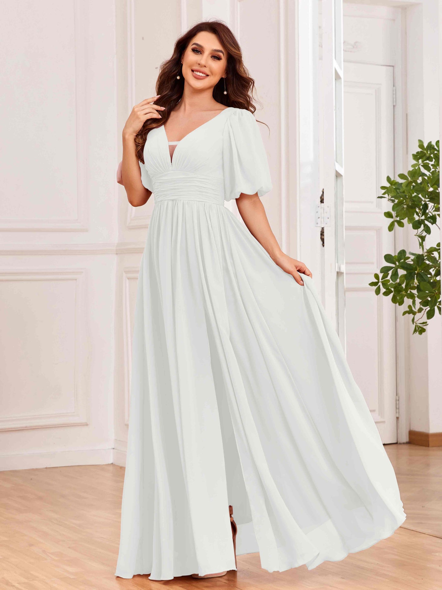 This chiffon dress is everything I hoped for. It floats beautifully when you walk and the V-neck isn't too revealing. I did spill a bit of champagne on it (classic wedding moment) but it seemed easy to dab off. The lantern sleeves make it feel extra special, and honestly, I felt like I belonged on a magazine cover.