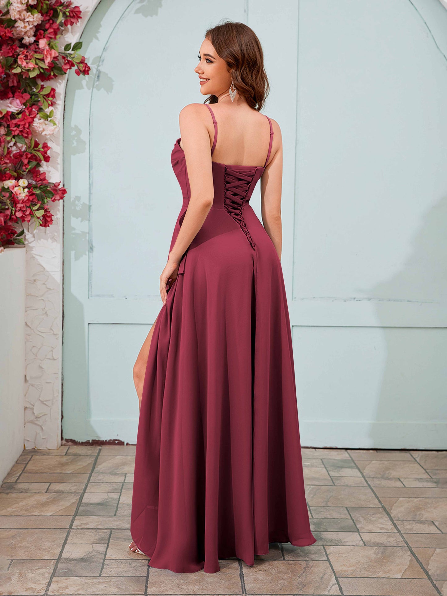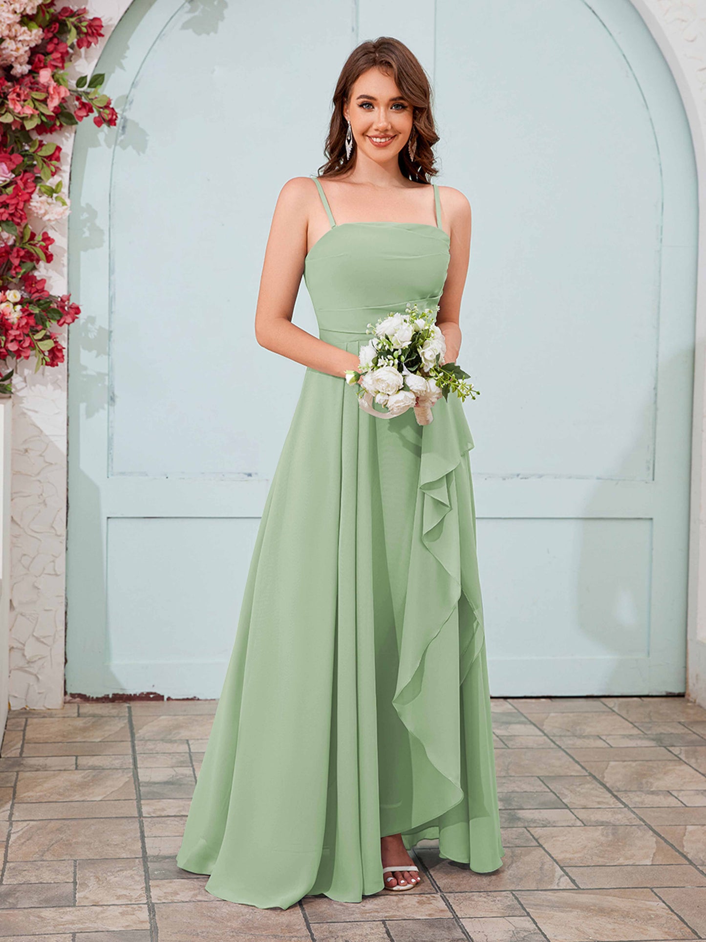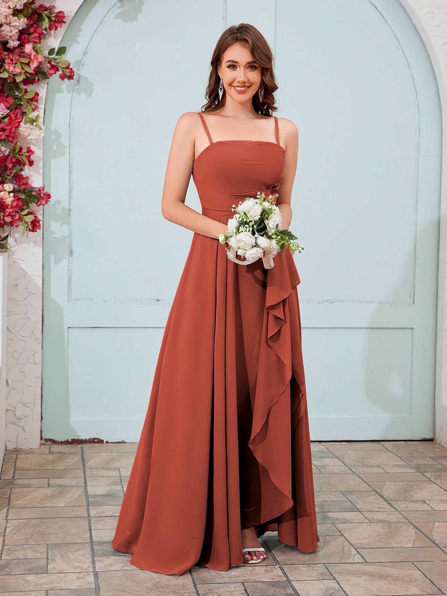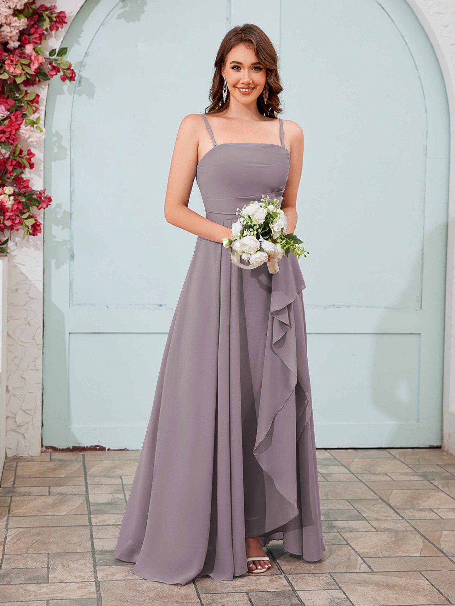 • Elevate your bridal party with Mollyevers' Graceful A-Line Slit Ruched Maxi Chiffon Bridesmaid Dresses. Featuring a flattering ruched bodice, thigh-high slit, and flowing chiffon design, this elegant dress ensures timeless beauty and comfort for any wedding or formal occasion. Perfectly chic and graceful.