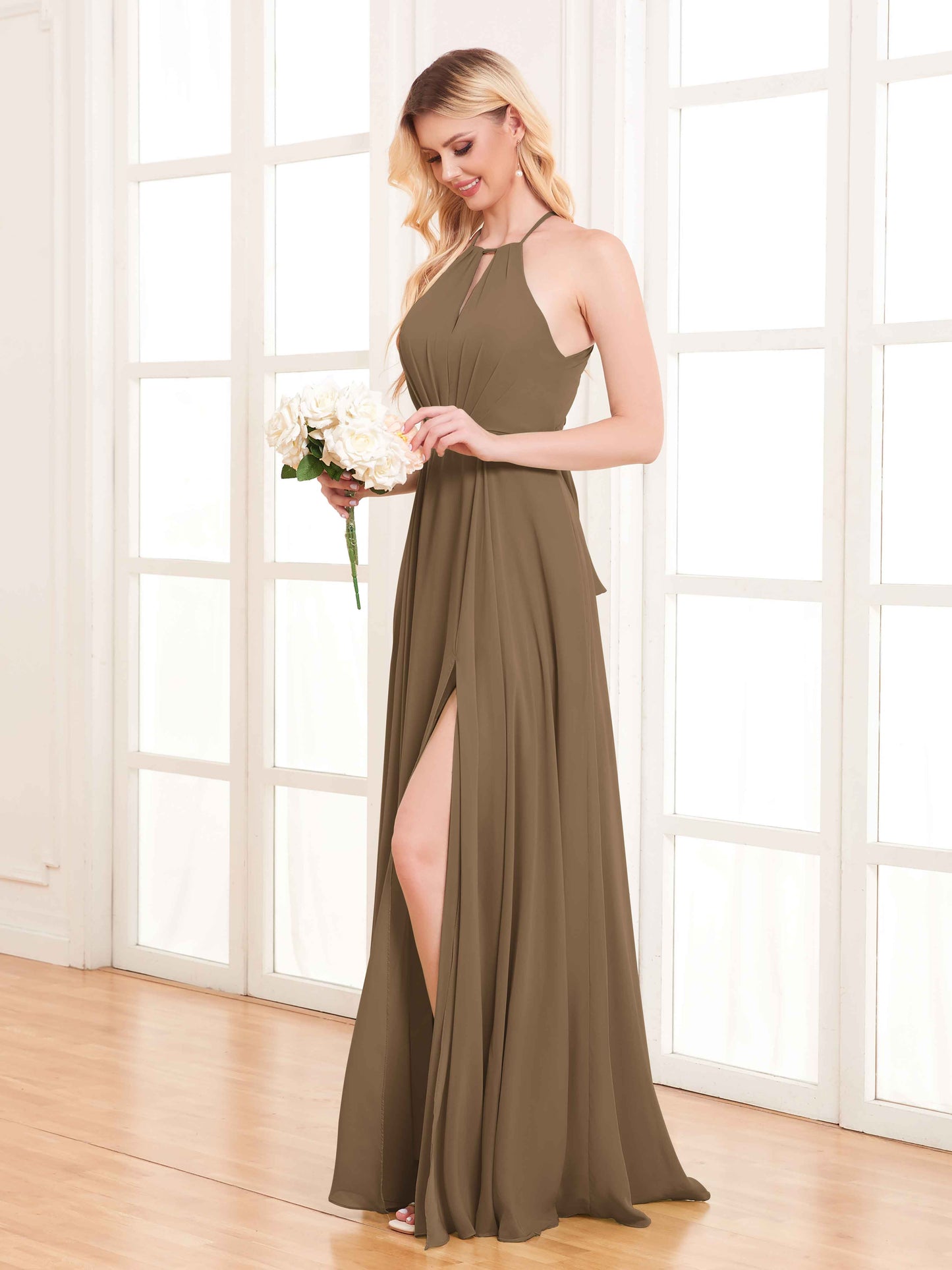• Embrace the grace of Mollyevers' Halter Bridesmaid Dresses. These dresses showcase a halter neckline and a captivating bow back detail, adding a touch of elegance. The flowing chiffon fabric drapes beautifully, while the daring slit adds a hint of allure.