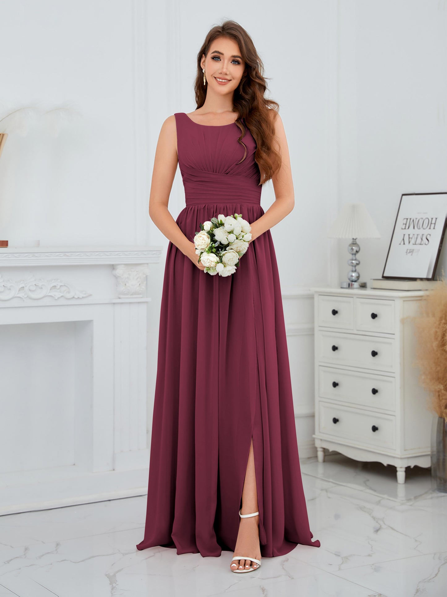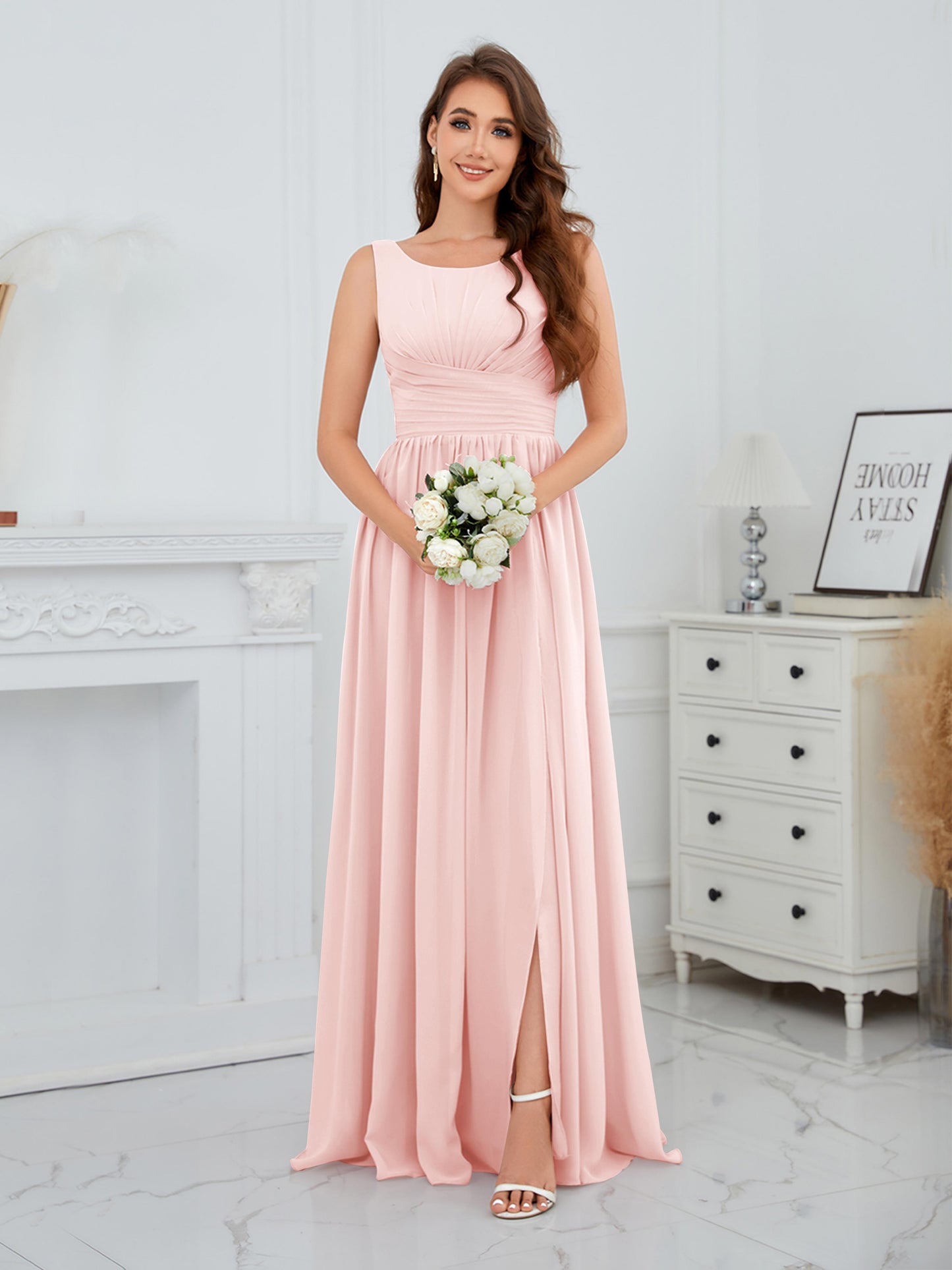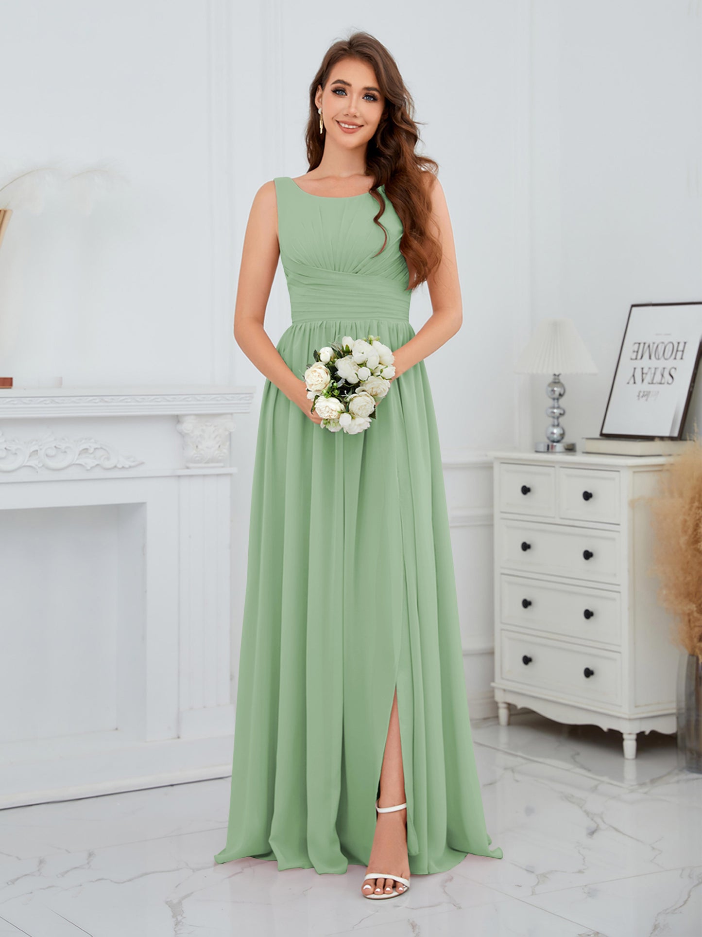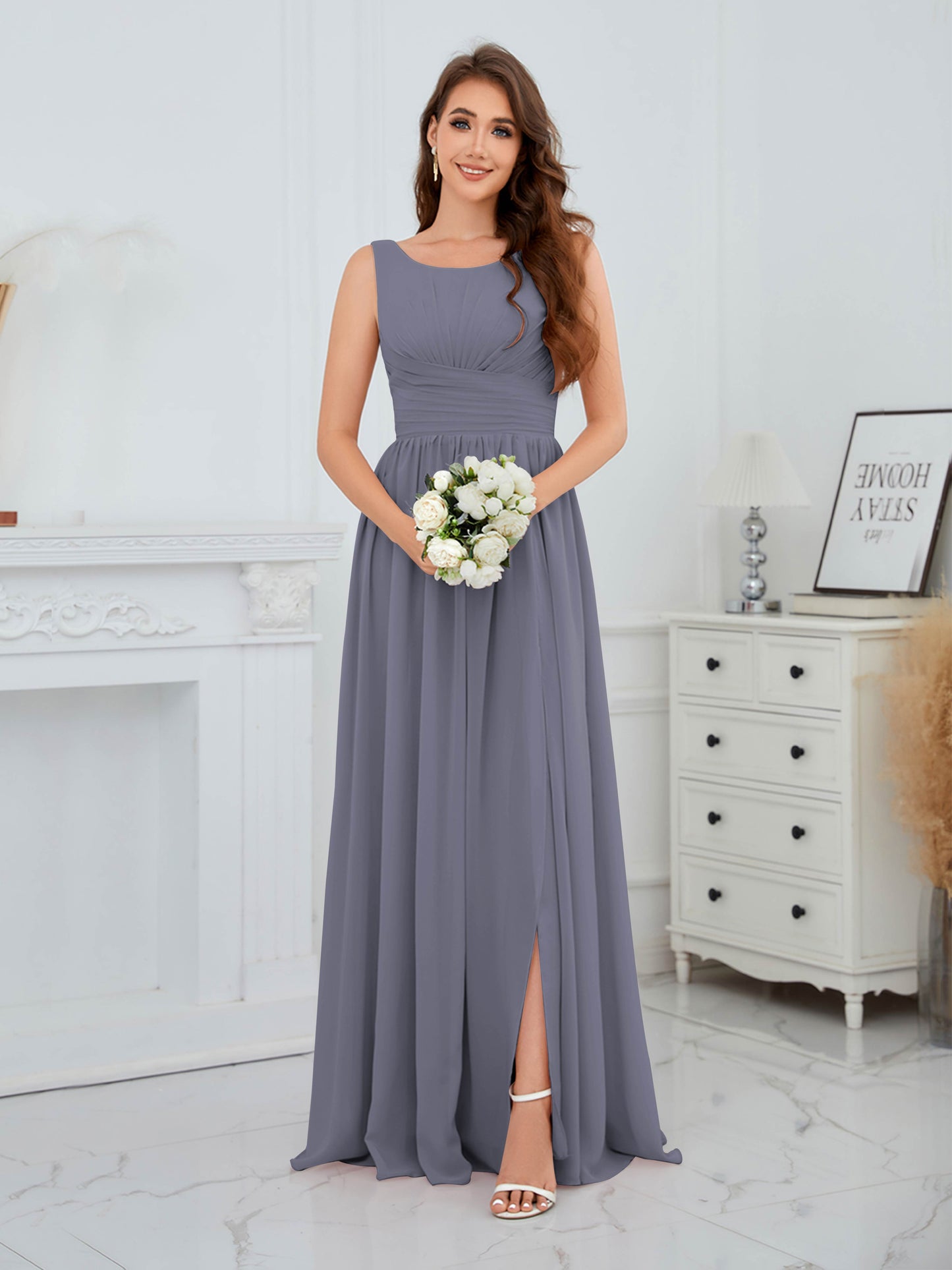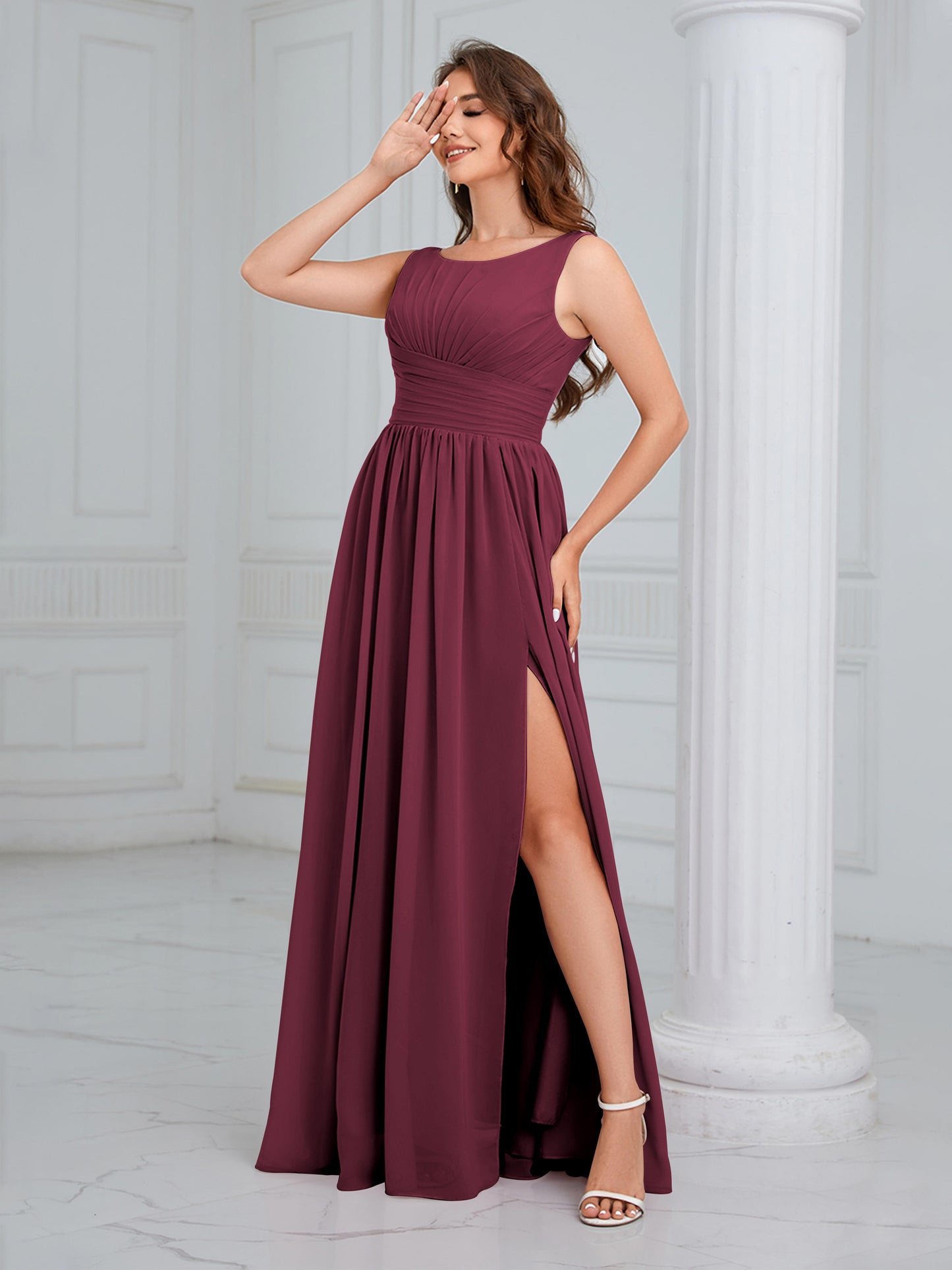 • Exude elegance in the Graceful Sleeveless Pleated Slit Floor-Length Chiffon Bridesmaid Dress from Mollyevers. This beautiful dress features delicate pleating, a flattering sleeveless design, and a chic side slit, offering a graceful and sophisticated look that's perfect for bridesmaids at any wedding or formal occasion.