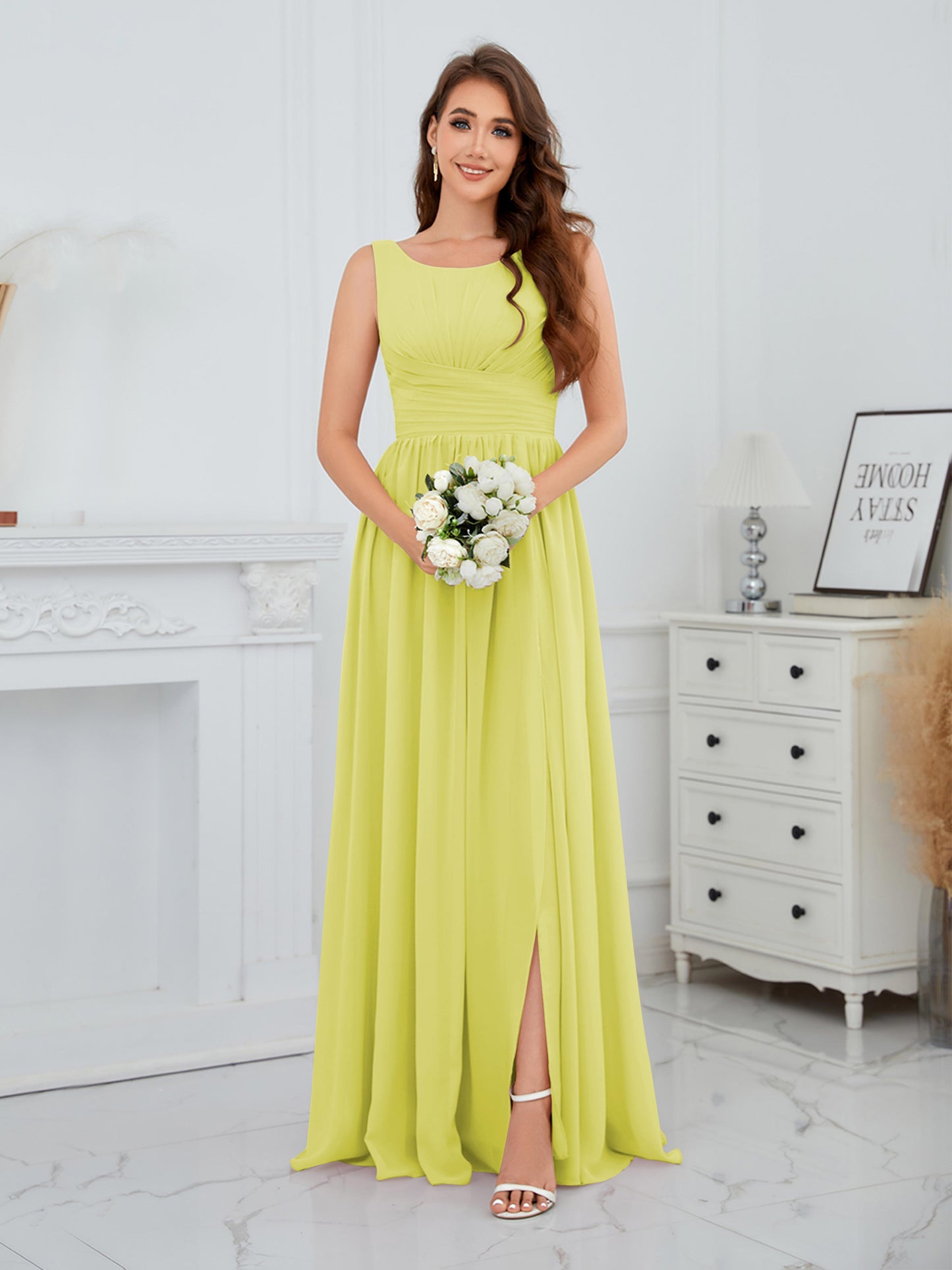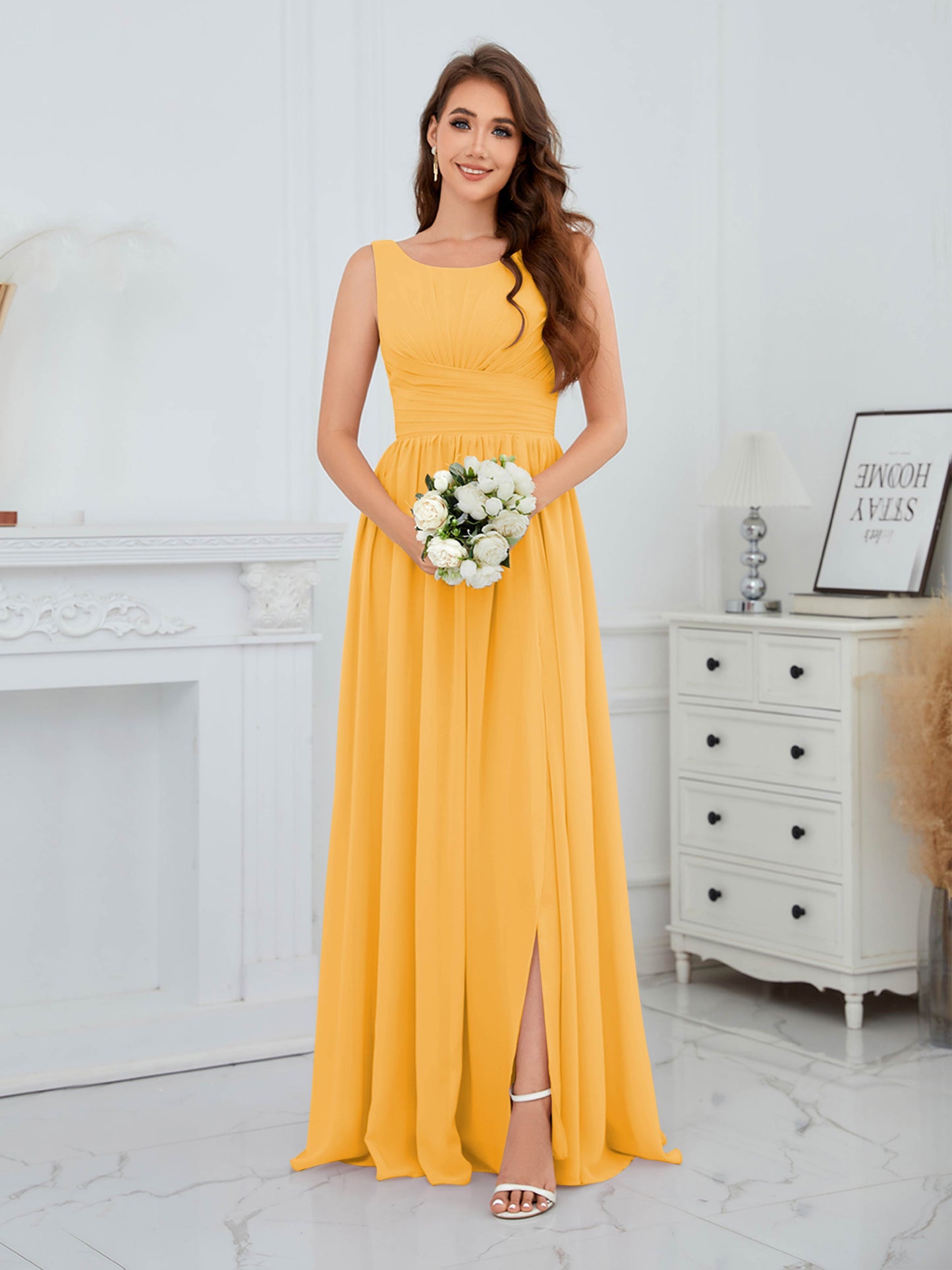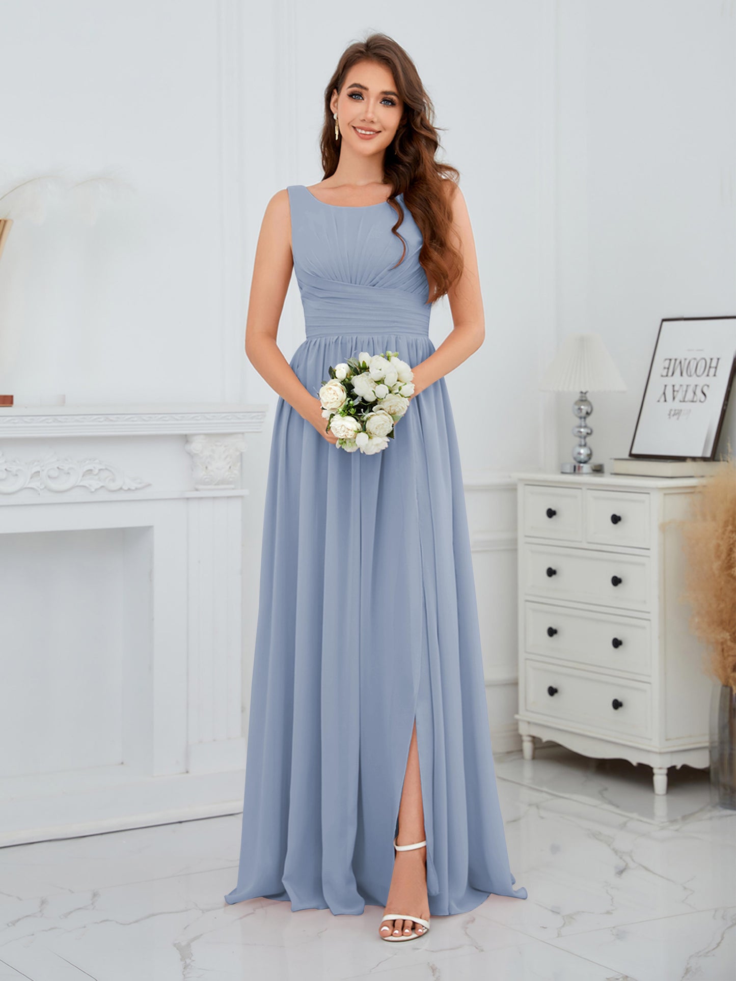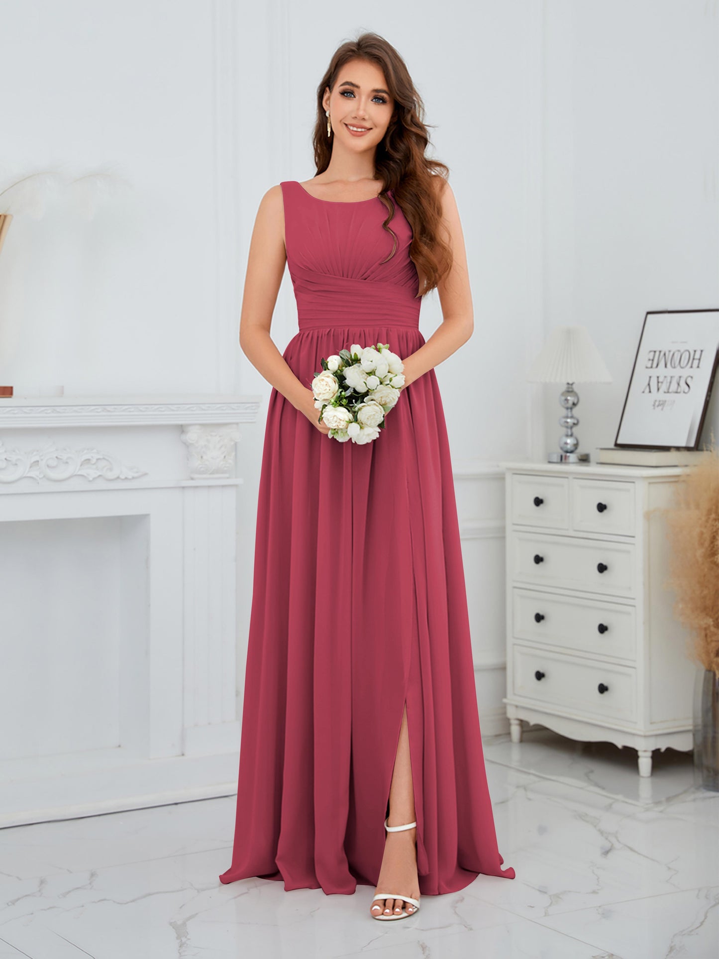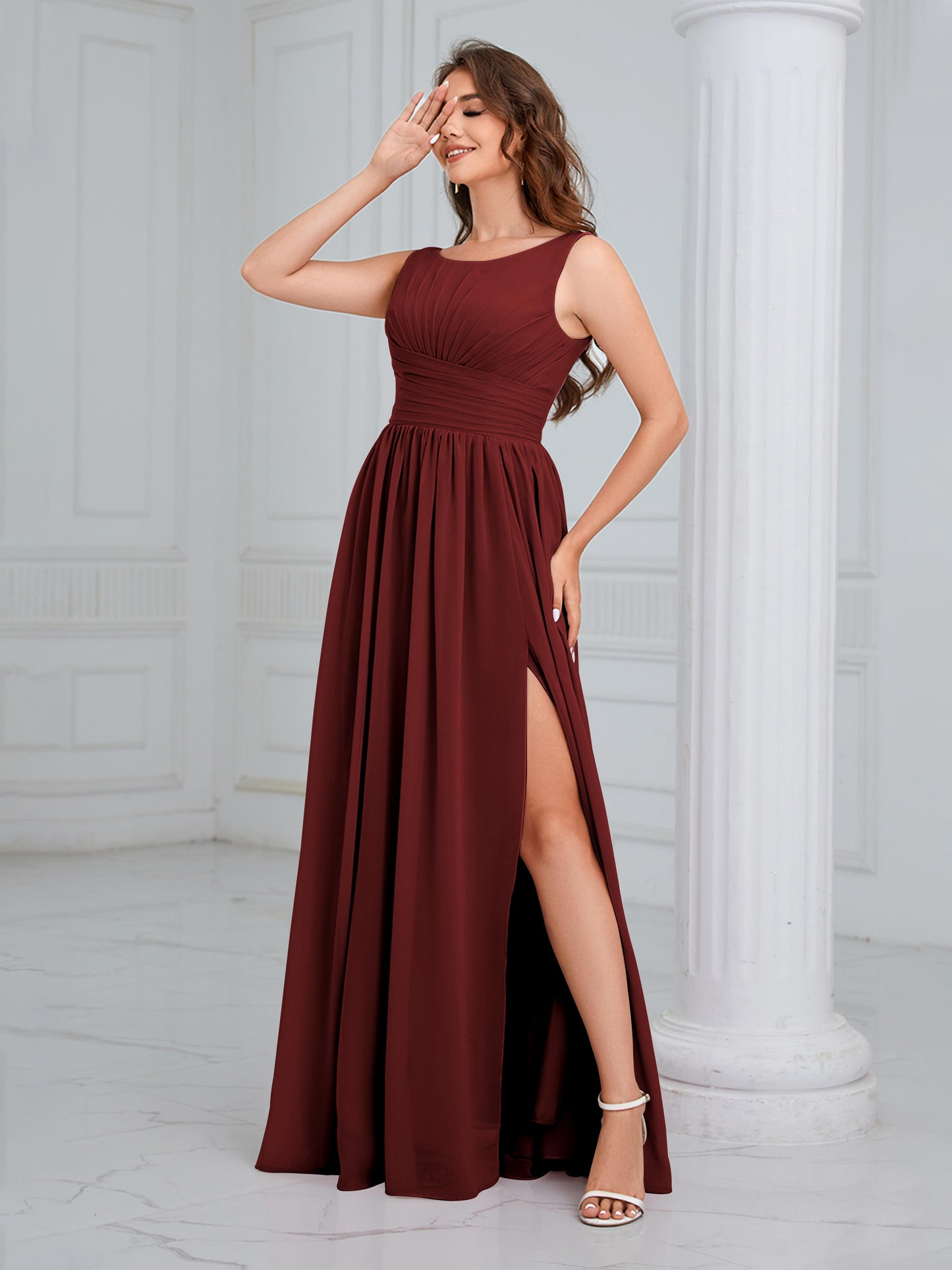 • Exude elegance in the Graceful Sleeveless Pleated Slit Floor-Length Chiffon Bridesmaid Dress from Mollyevers. This beautiful dress features delicate pleating, a flattering sleeveless design, and a chic side slit, offering a graceful and sophisticated look that's perfect for bridesmaids at any wedding or formal occasion.