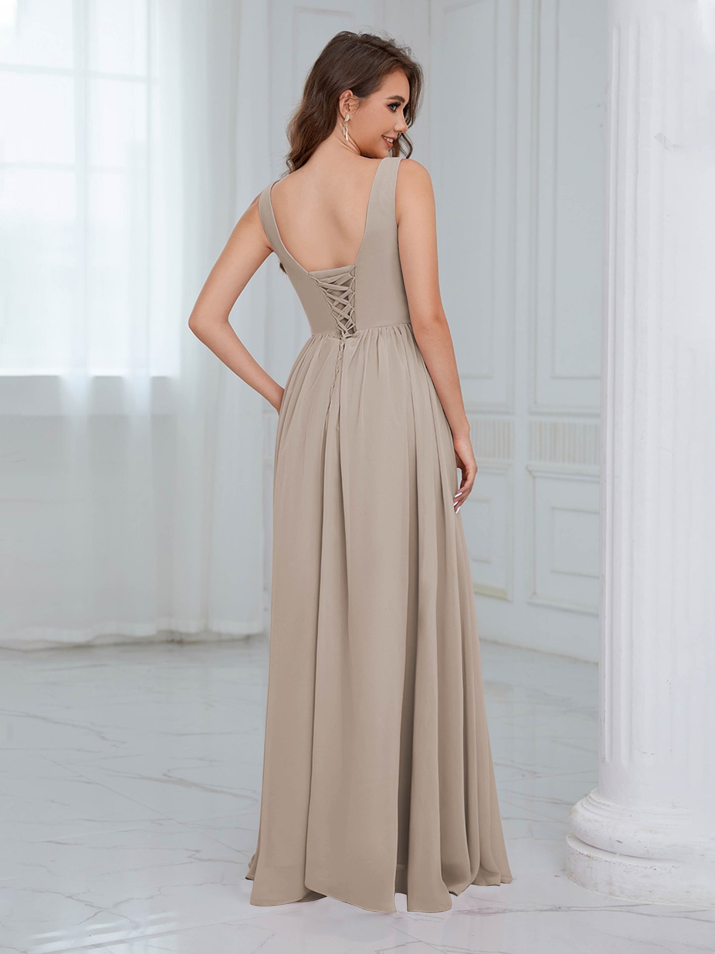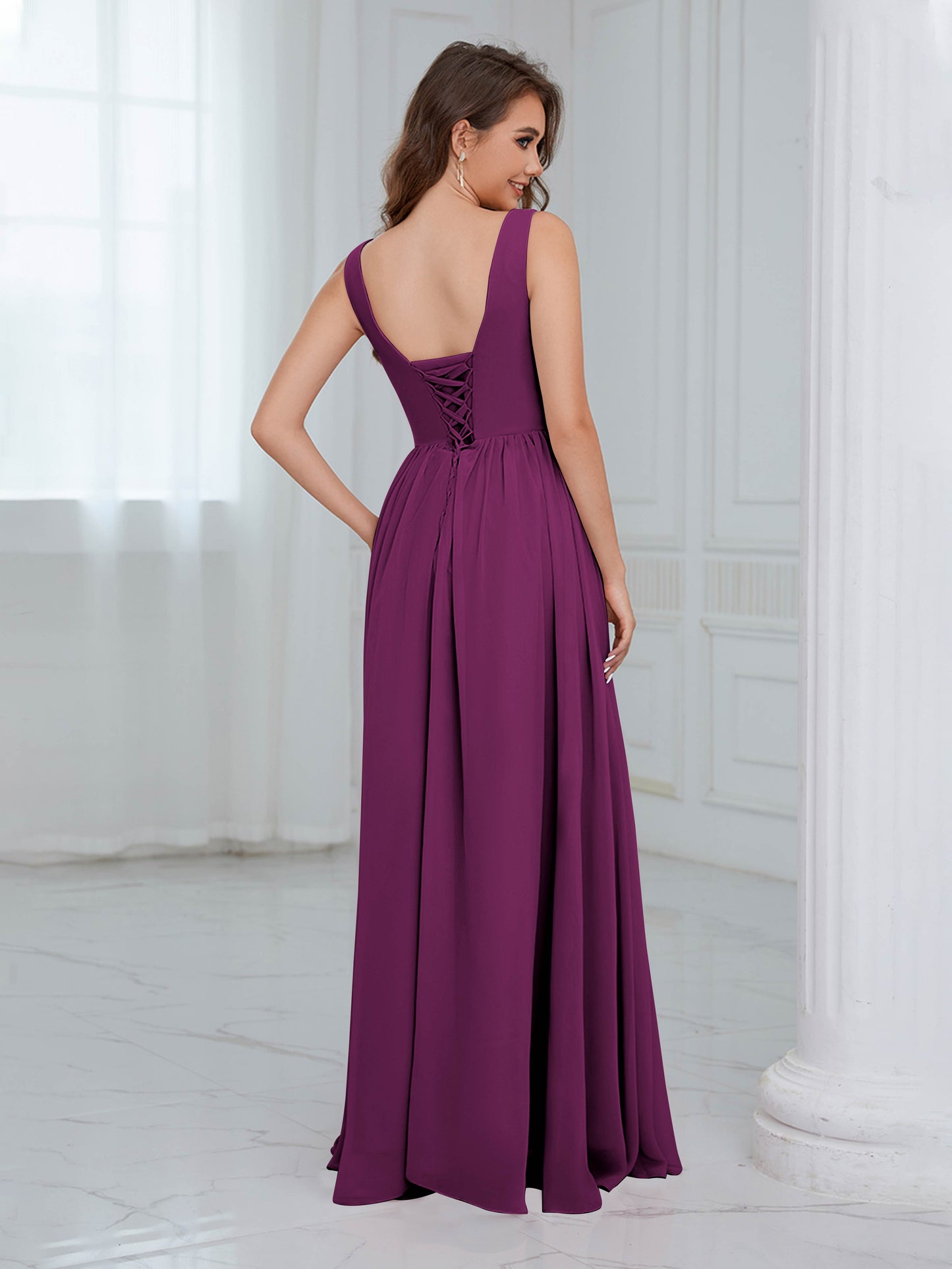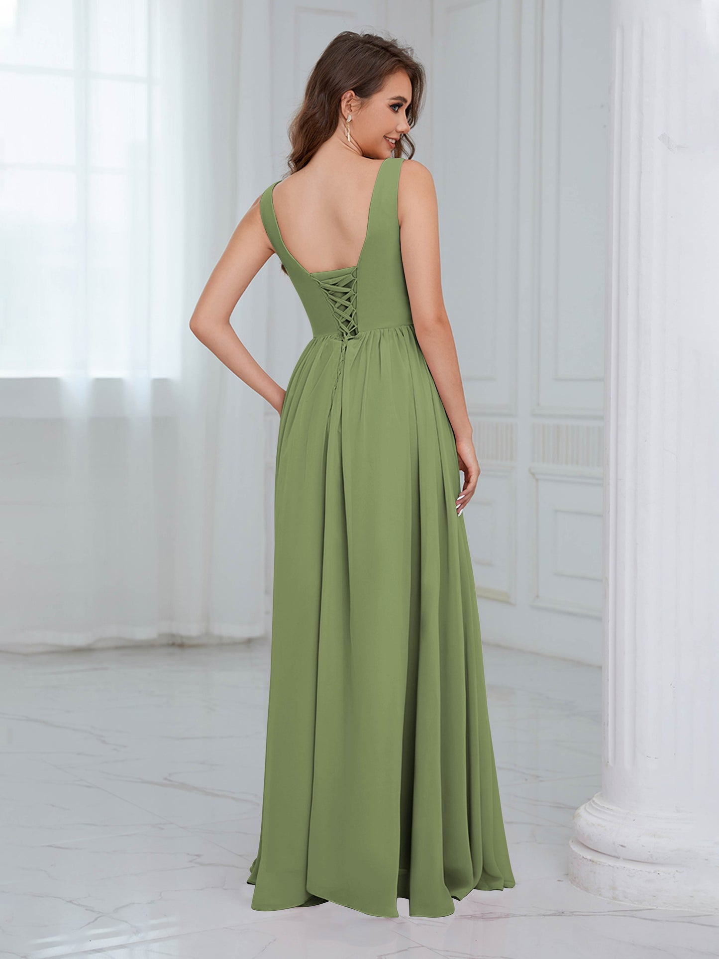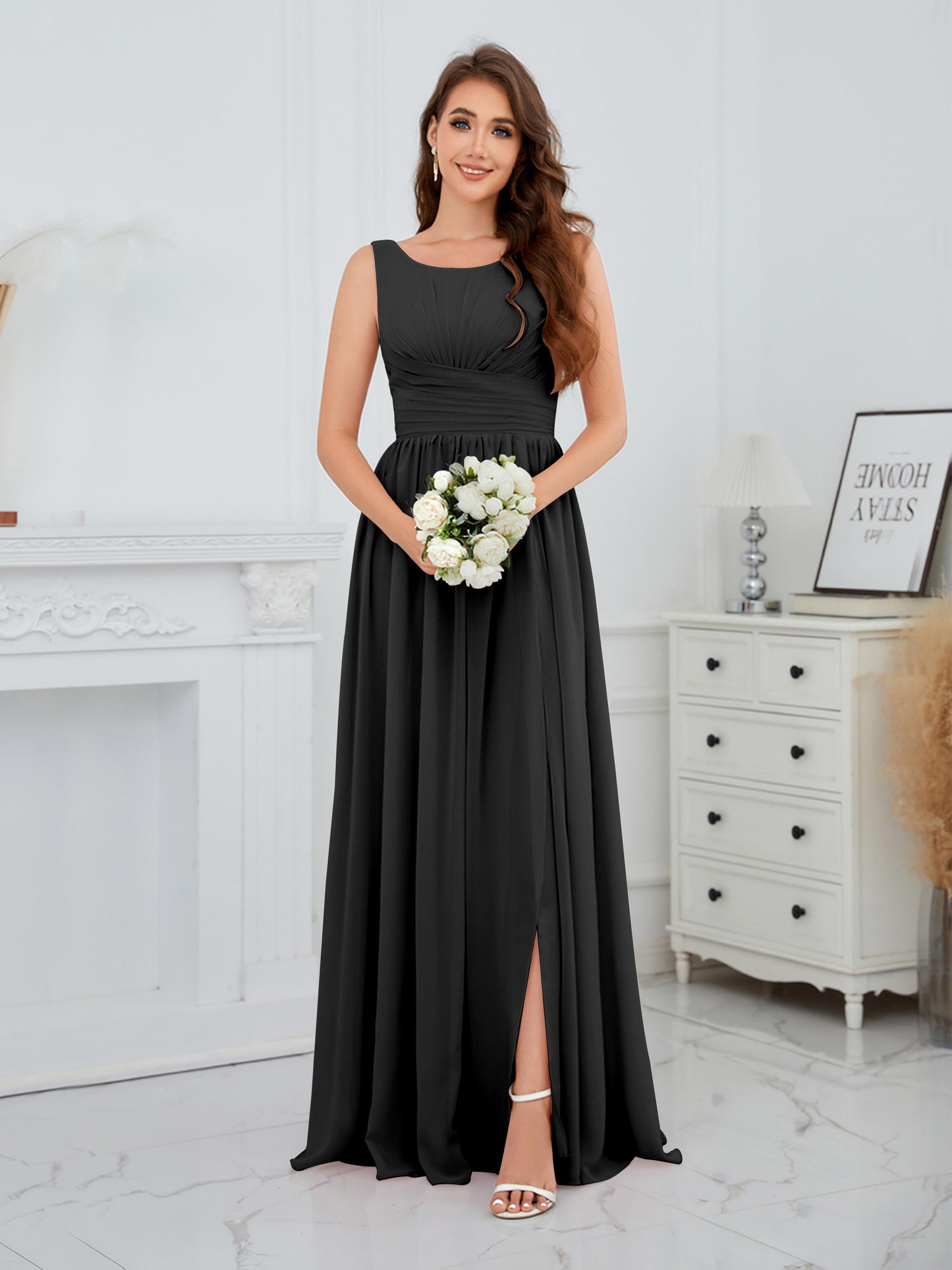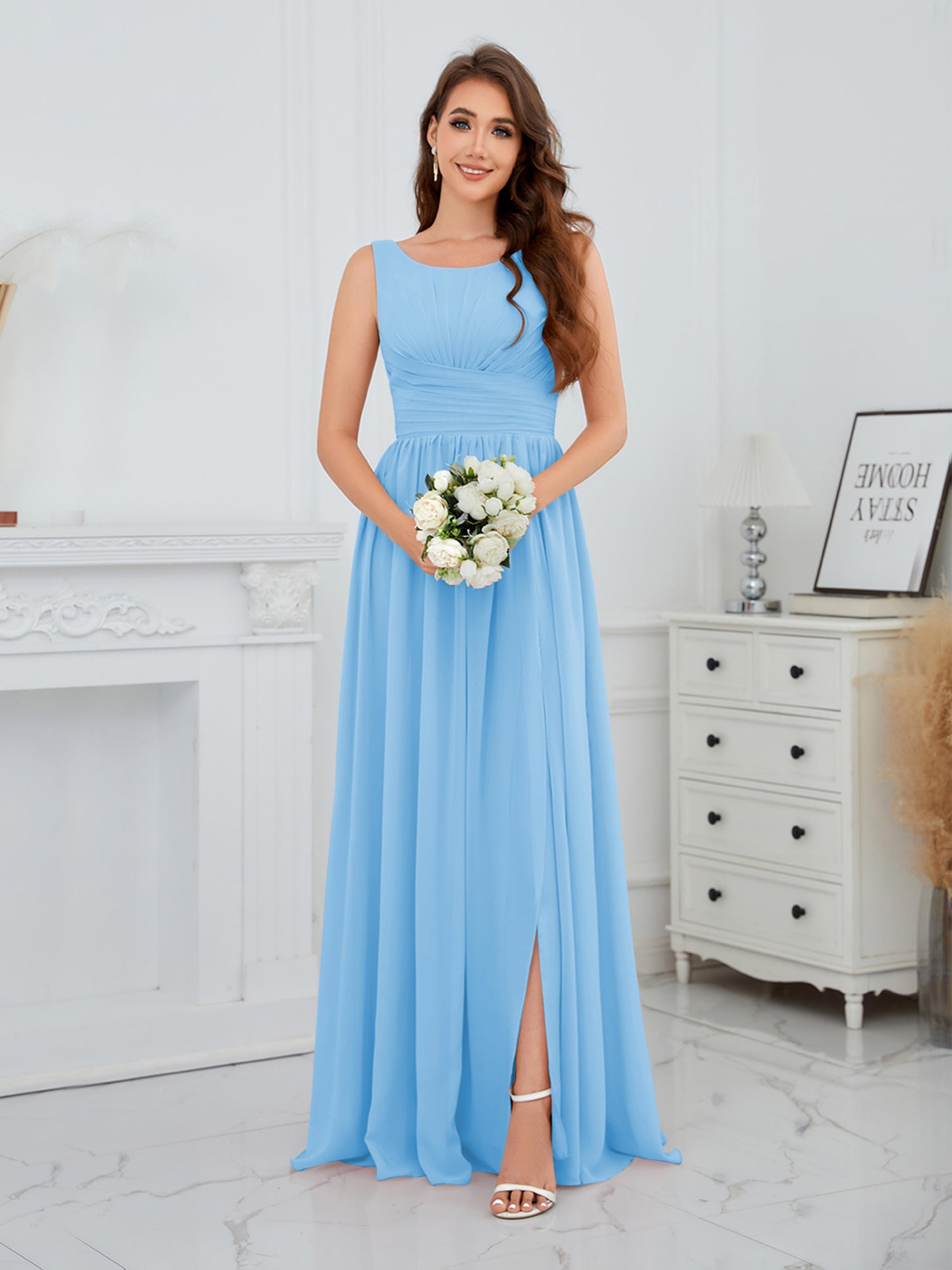 • Exude elegance in the Graceful Sleeveless Pleated Slit Floor-Length Chiffon Bridesmaid Dress from Mollyevers. This beautiful dress features delicate pleating, a flattering sleeveless design, and a chic side slit, offering a graceful and sophisticated look that's perfect for bridesmaids at any wedding or formal occasion.