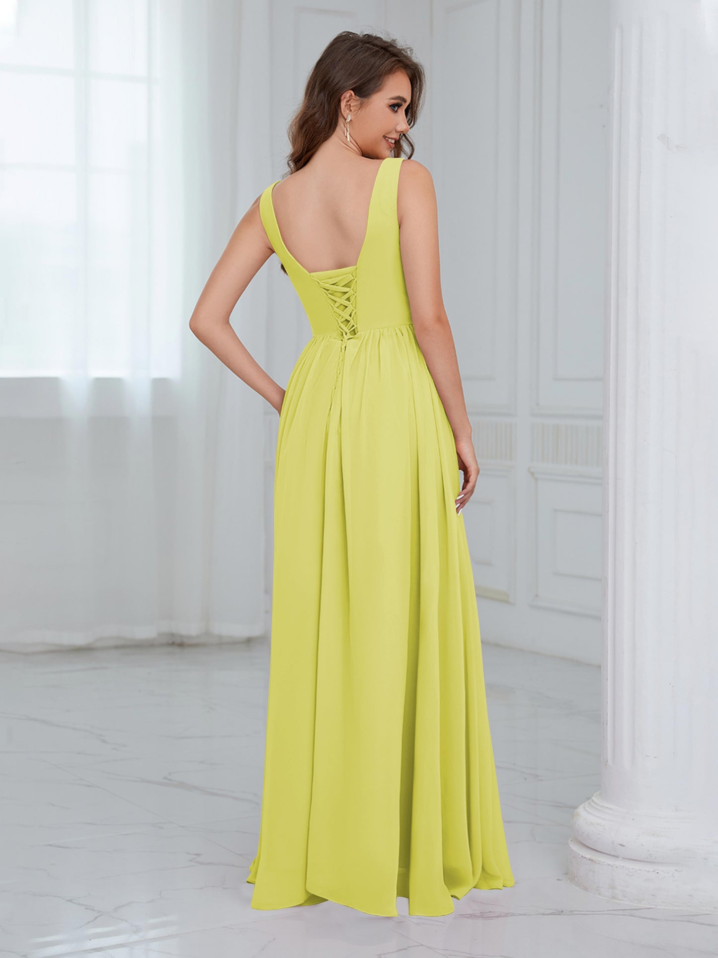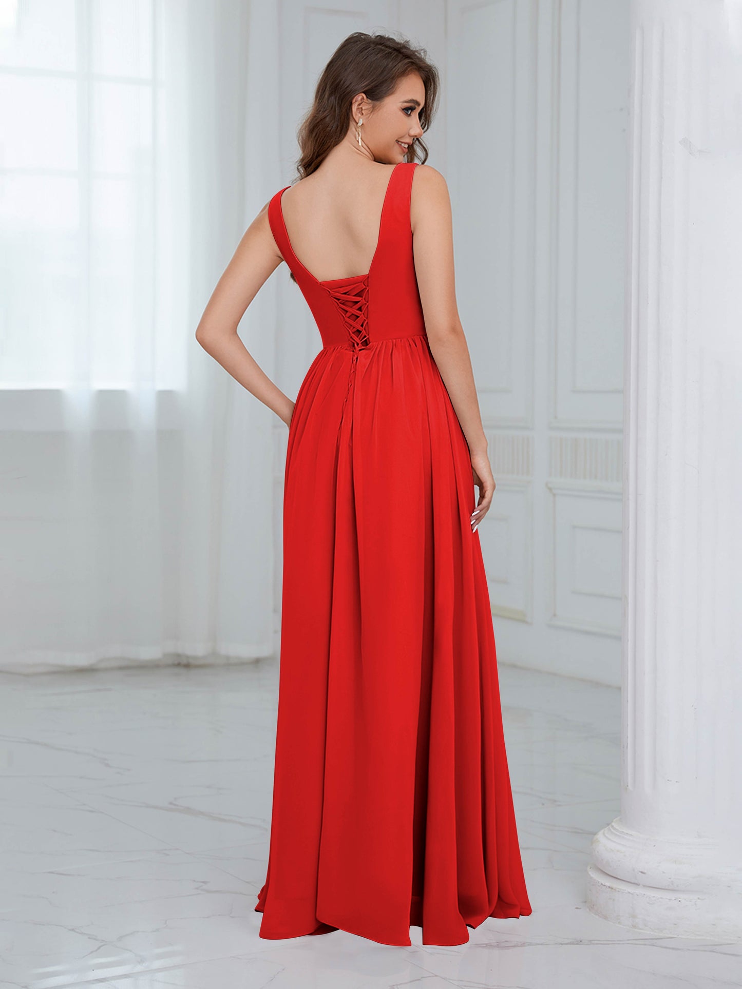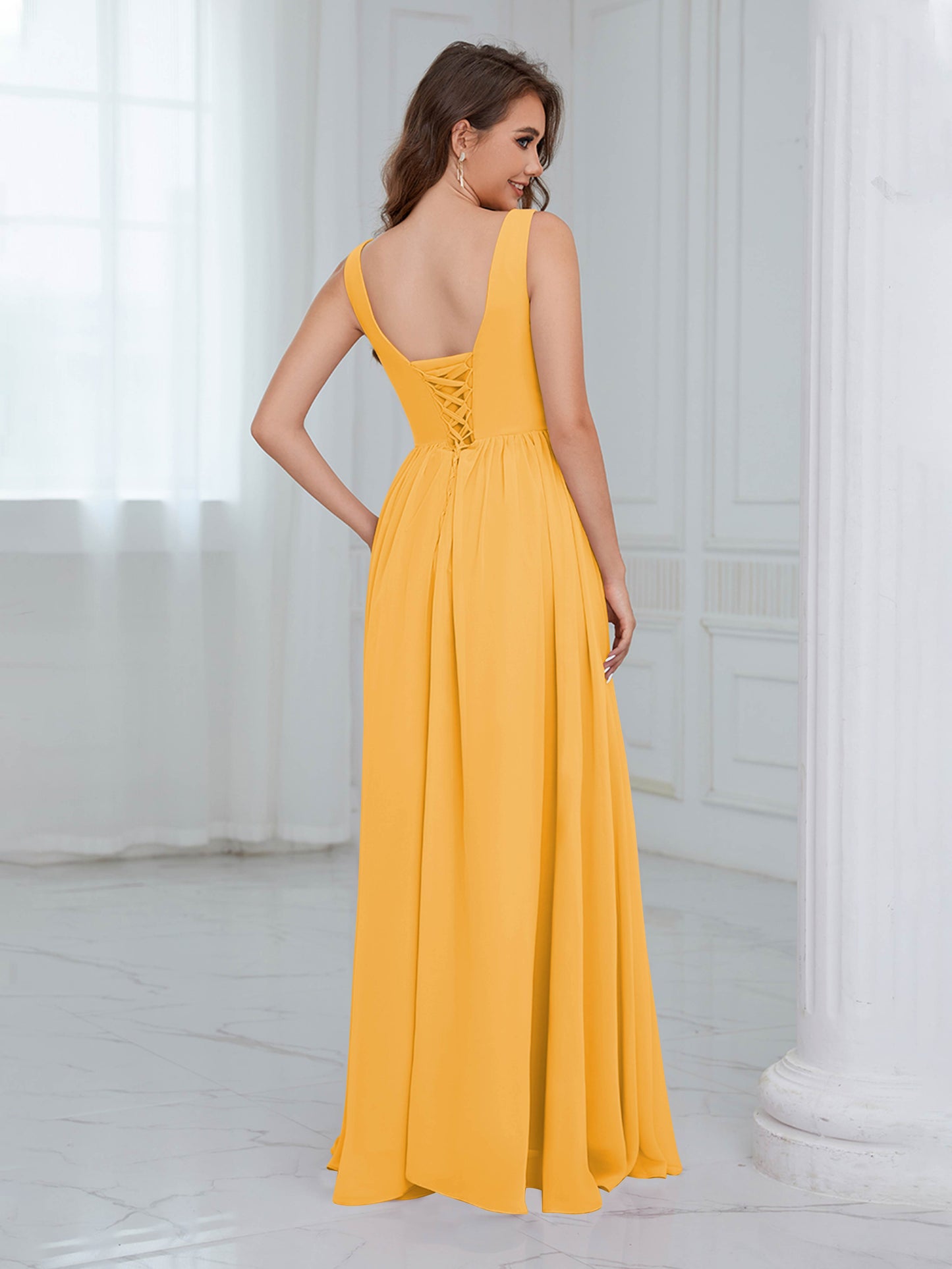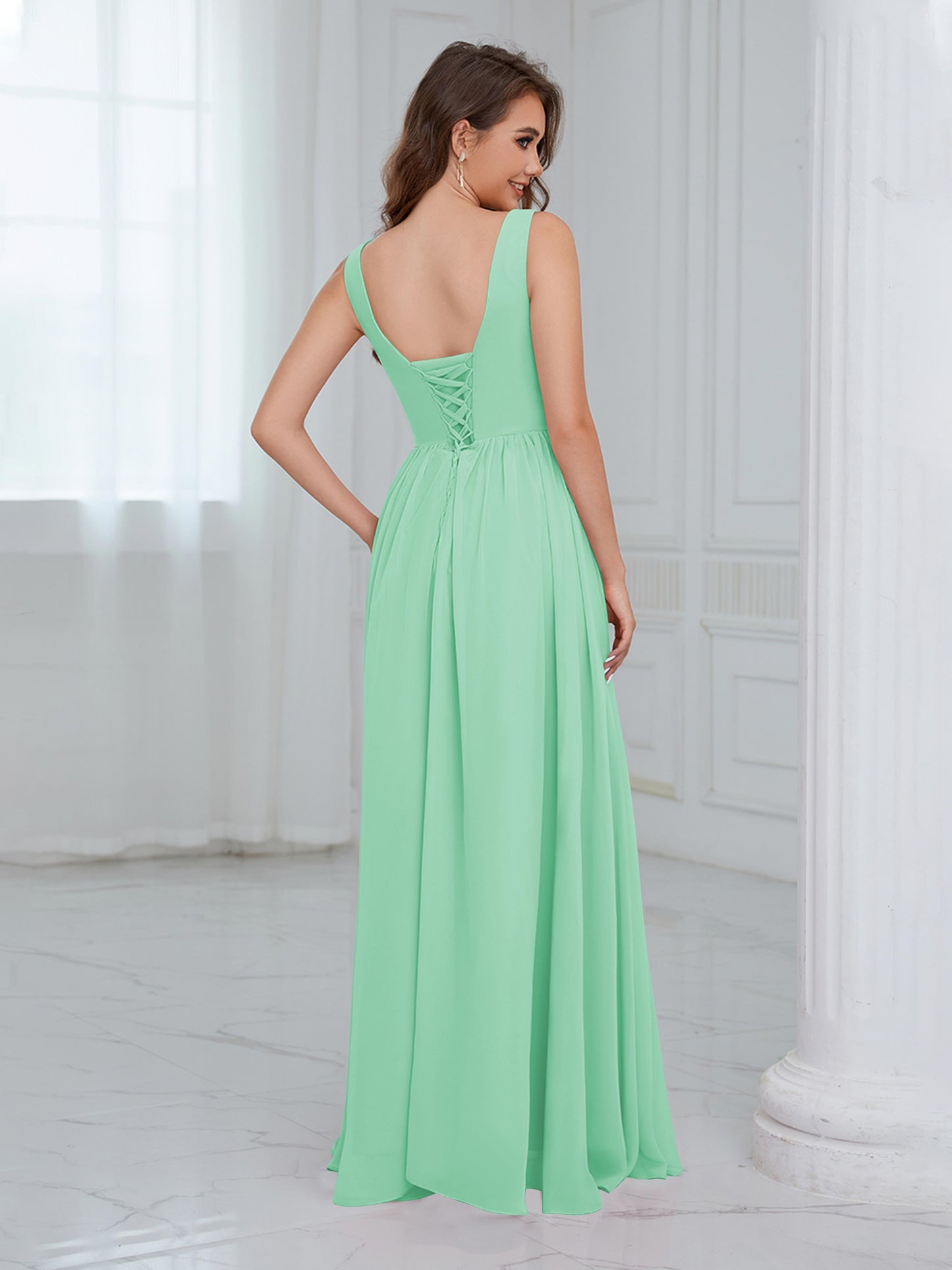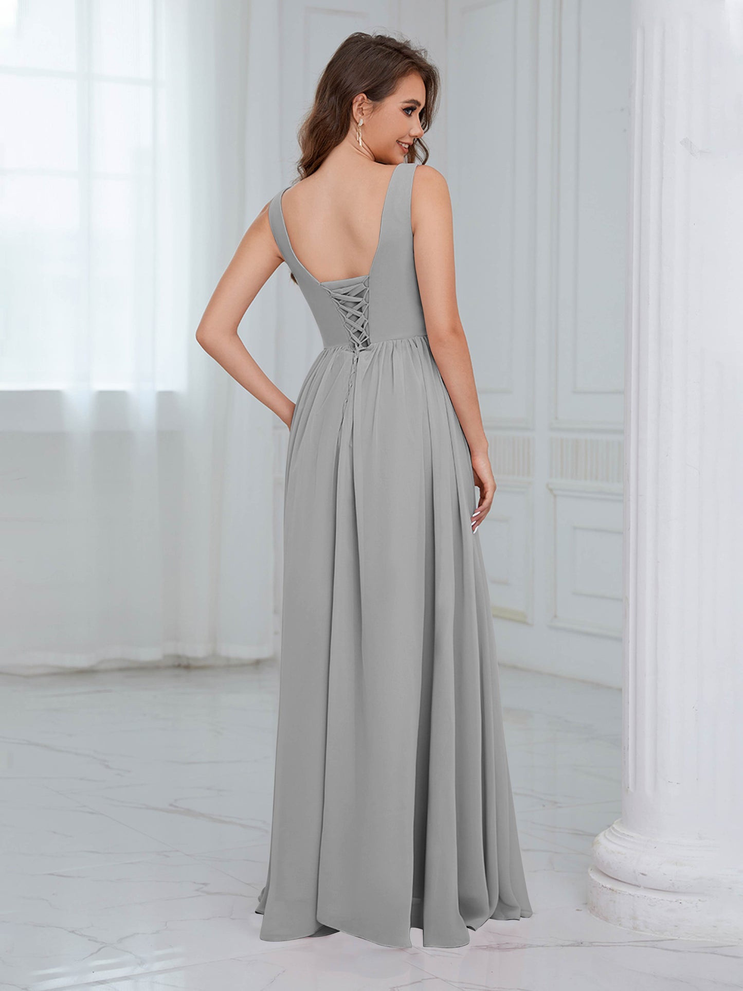 • Exude elegance in the Graceful Sleeveless Pleated Slit Floor-Length Chiffon Bridesmaid Dress from Mollyevers. This beautiful dress features delicate pleating, a flattering sleeveless design, and a chic side slit, offering a graceful and sophisticated look that's perfect for bridesmaids at any wedding or formal occasion.
