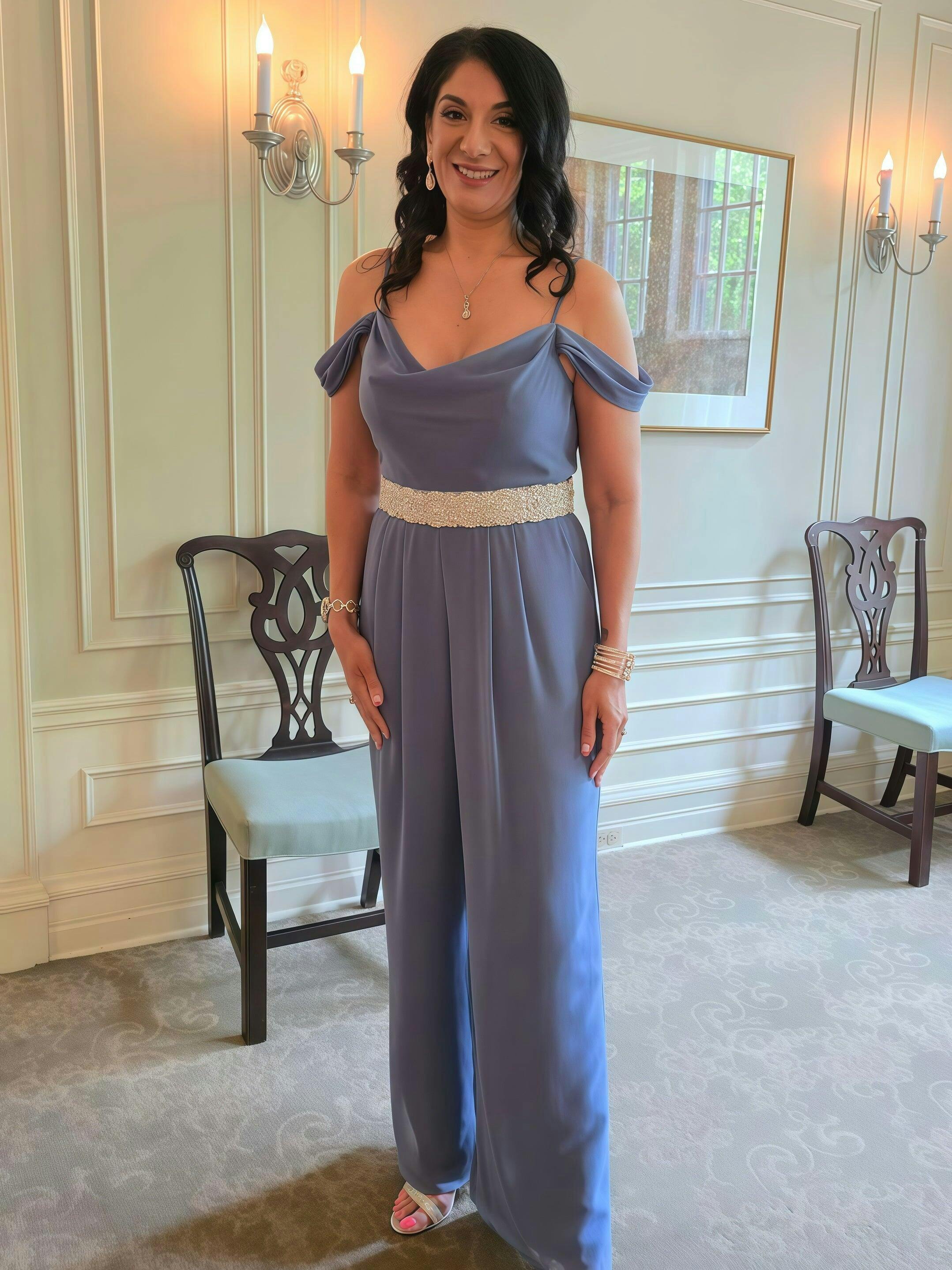 Jumpsuits Spaghetti Straps Cowl Neck Sleeveless Floor-Length Chiffon Plus Size Bridesmaid Dresses with Ruched, Pockets & Bowknot UK