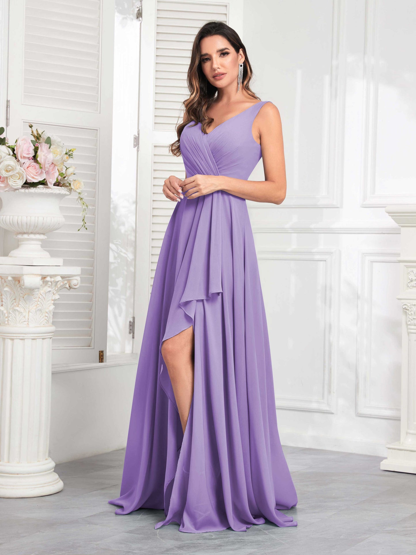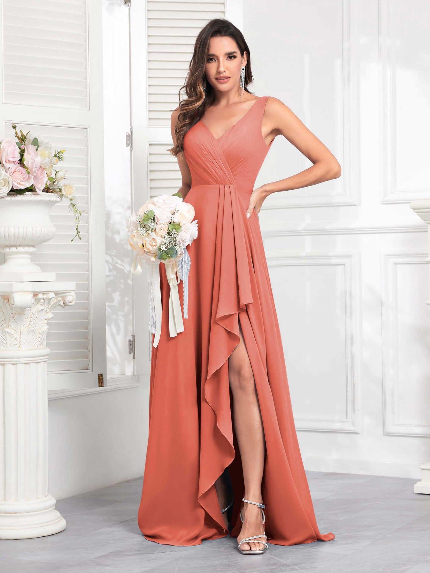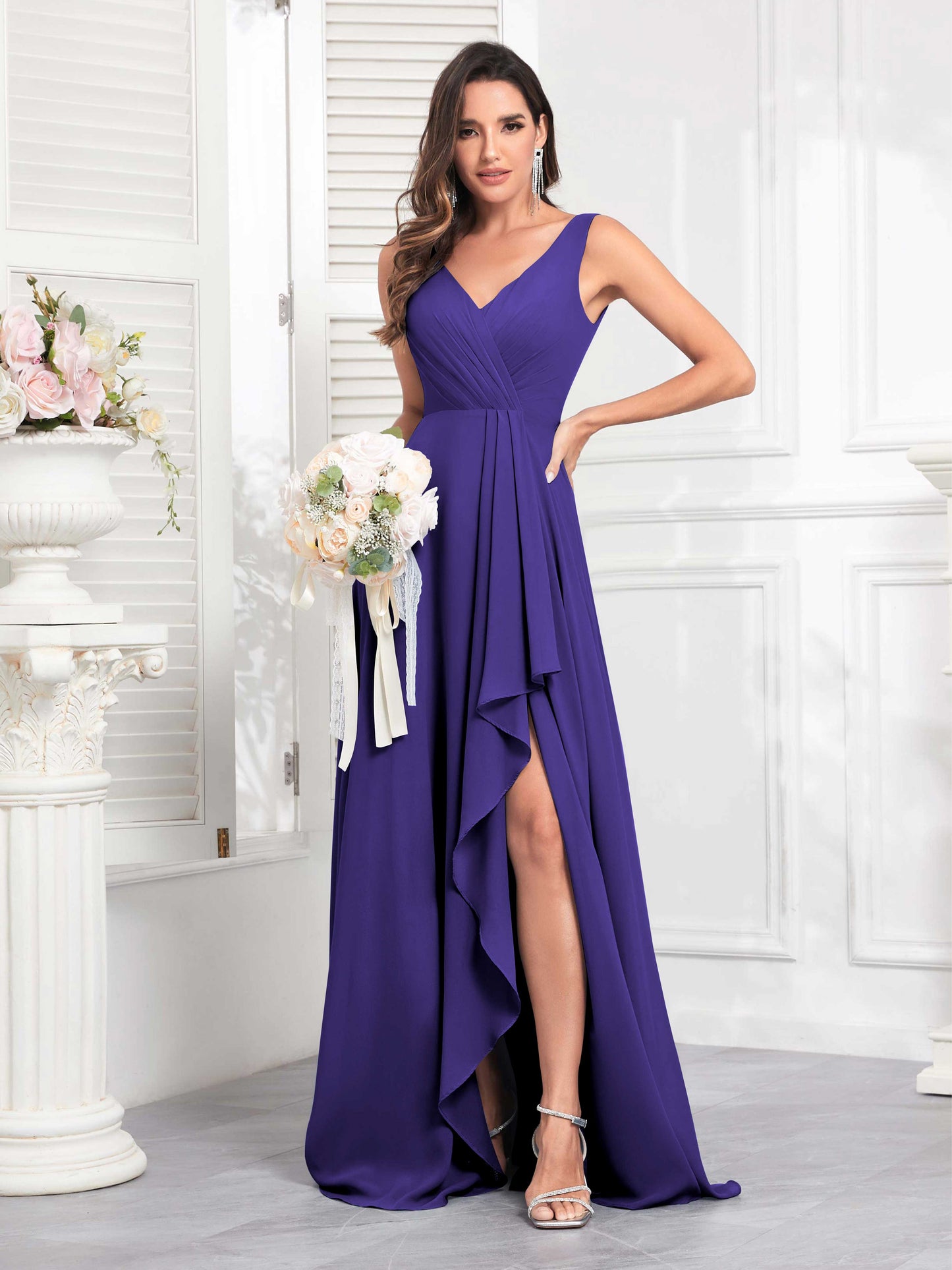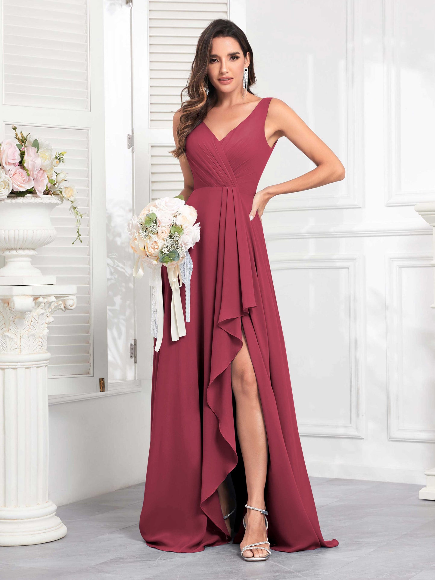 • Enhance your bridal party's style with Mollyevers' Modern A-Line V-Neck Sleeveless Slit Ruched Chiffon Bridesmaid Dress. Featuring a flattering V-neck, elegant ruching, and a chic side slit, this dress combines contemporary design with timeless charm for a stunning look on your special day.