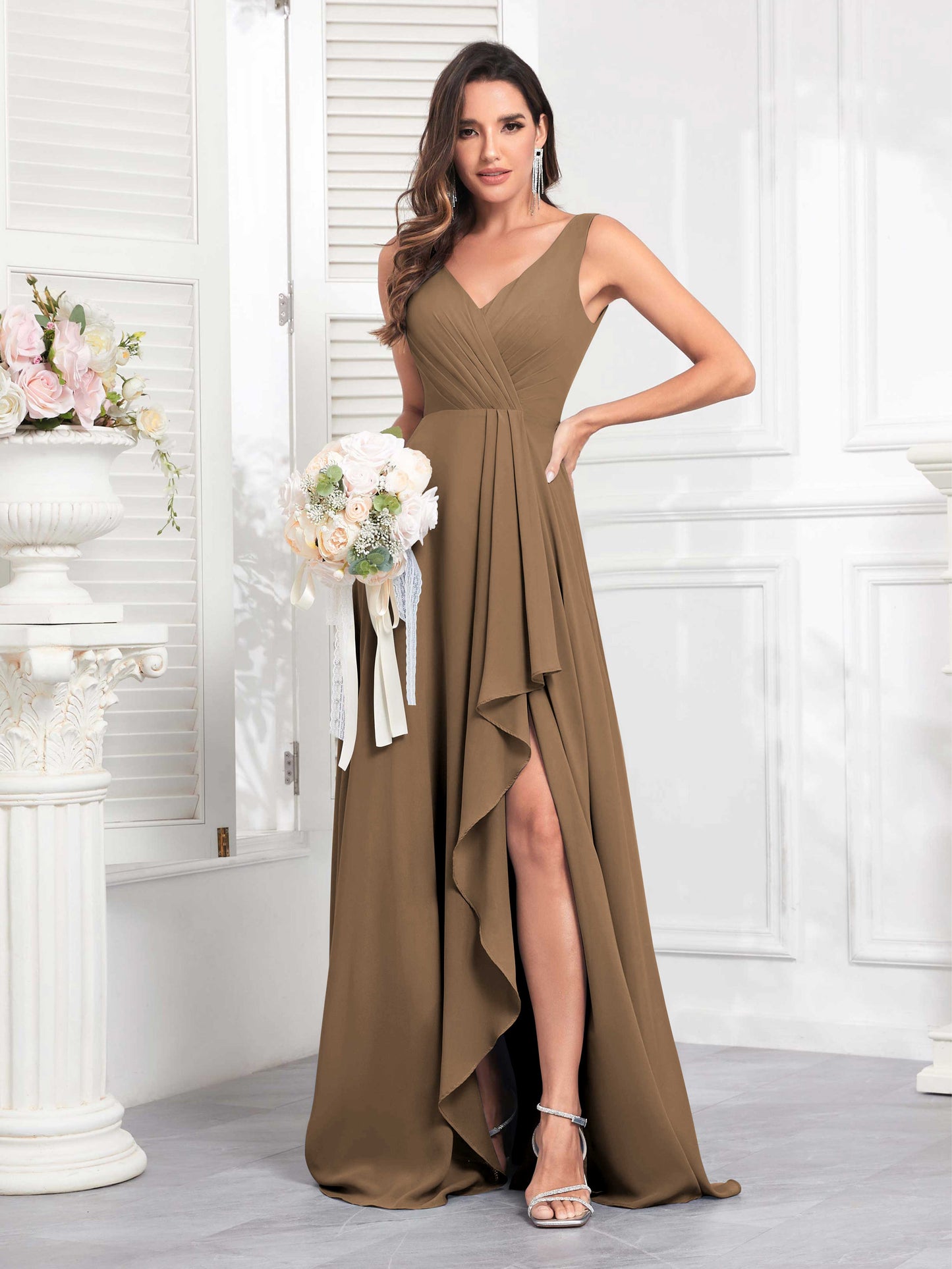 Modern A Line V Neck Sleeveless Slit Ruched Chiffon Bridesmaid Dresses UK