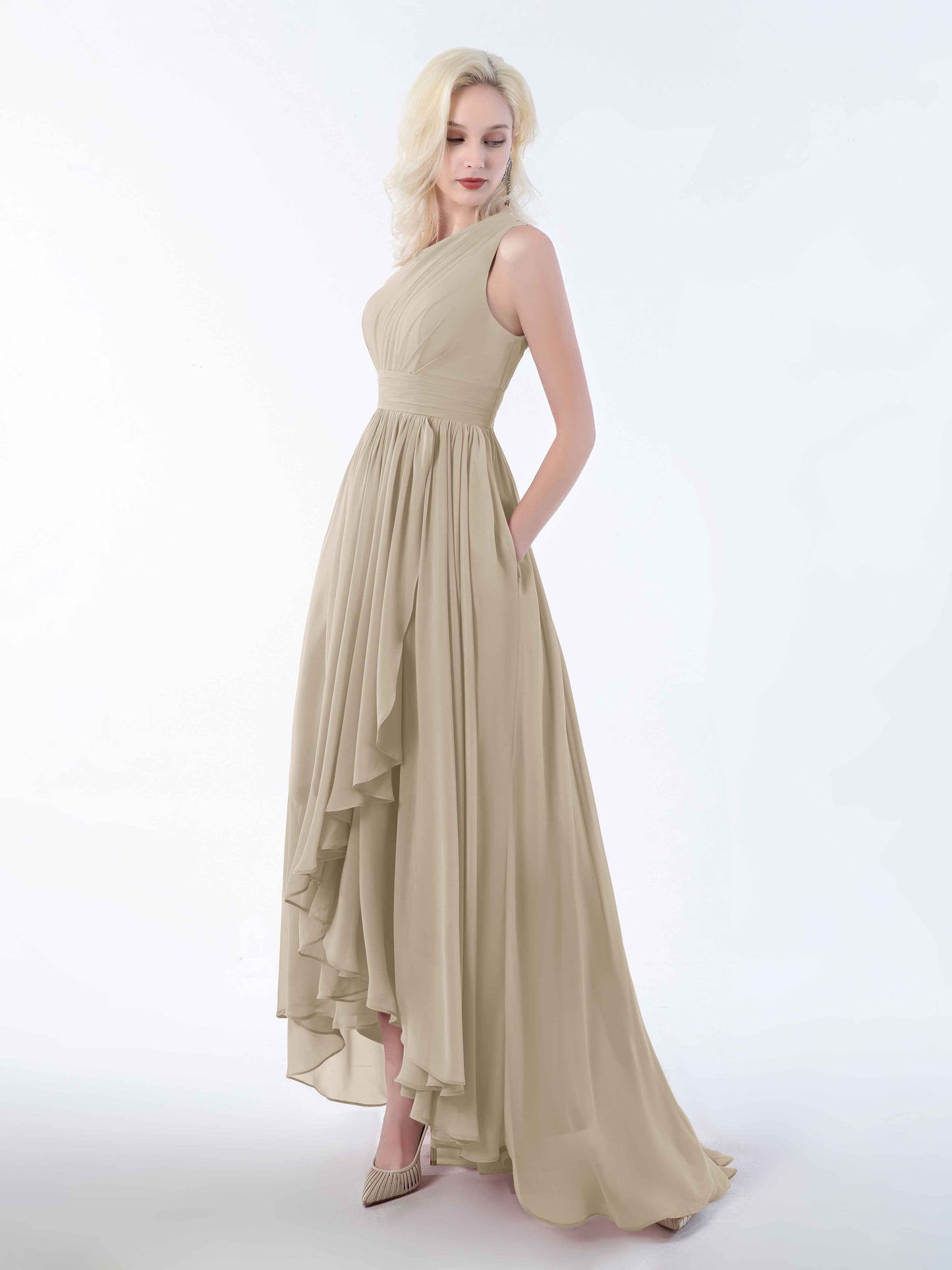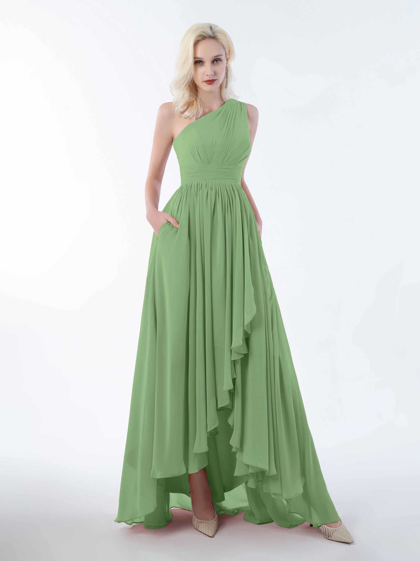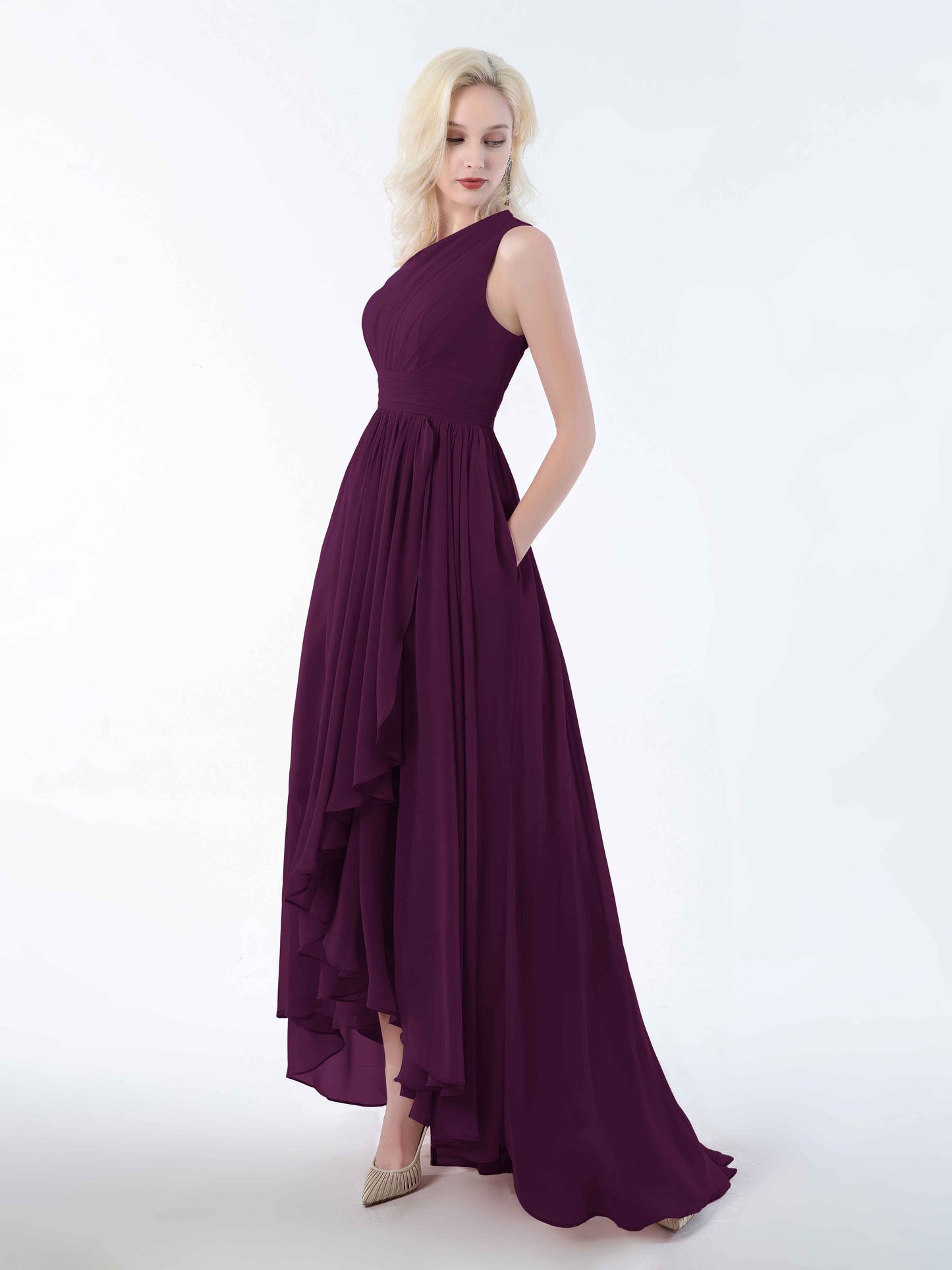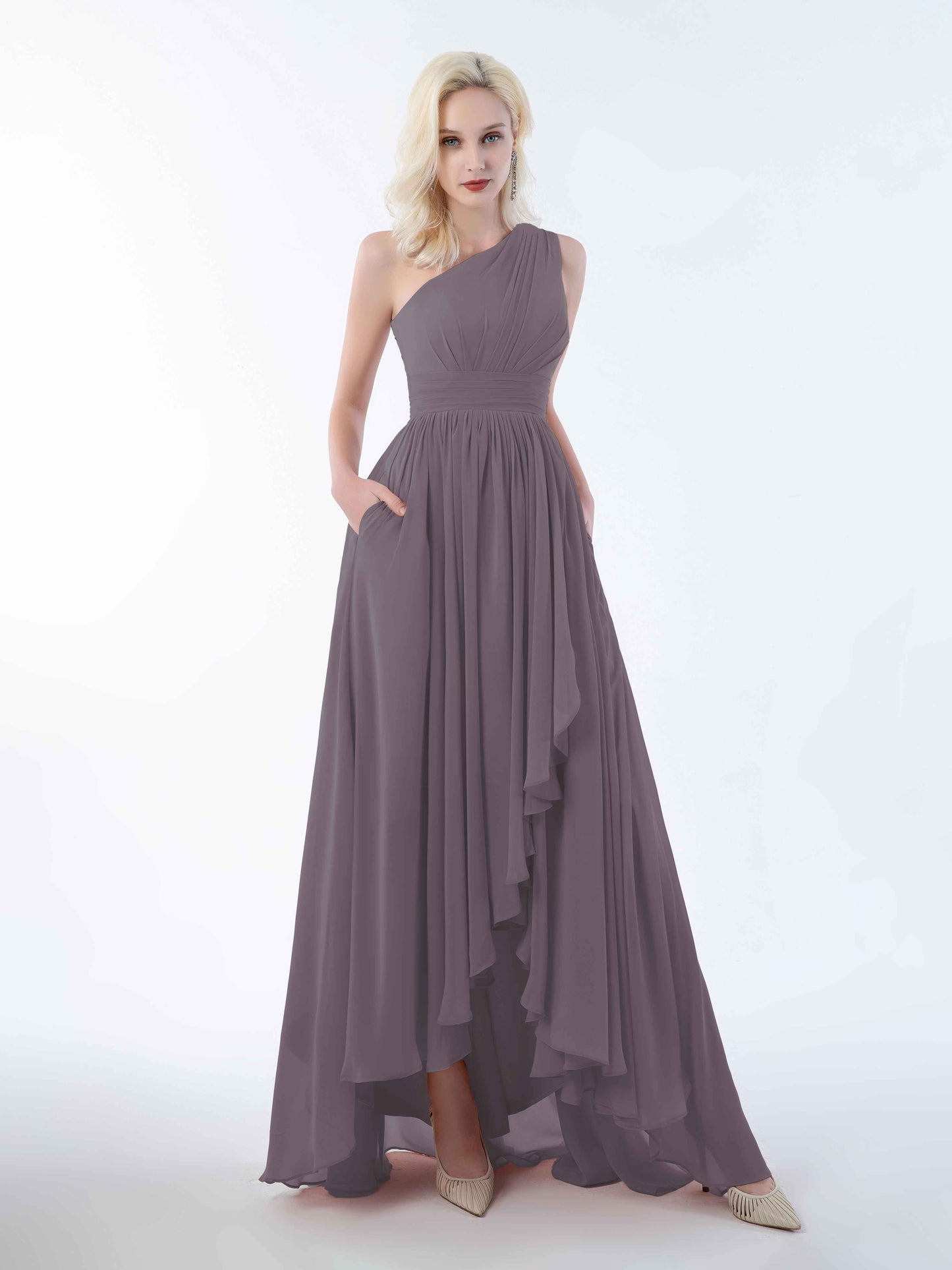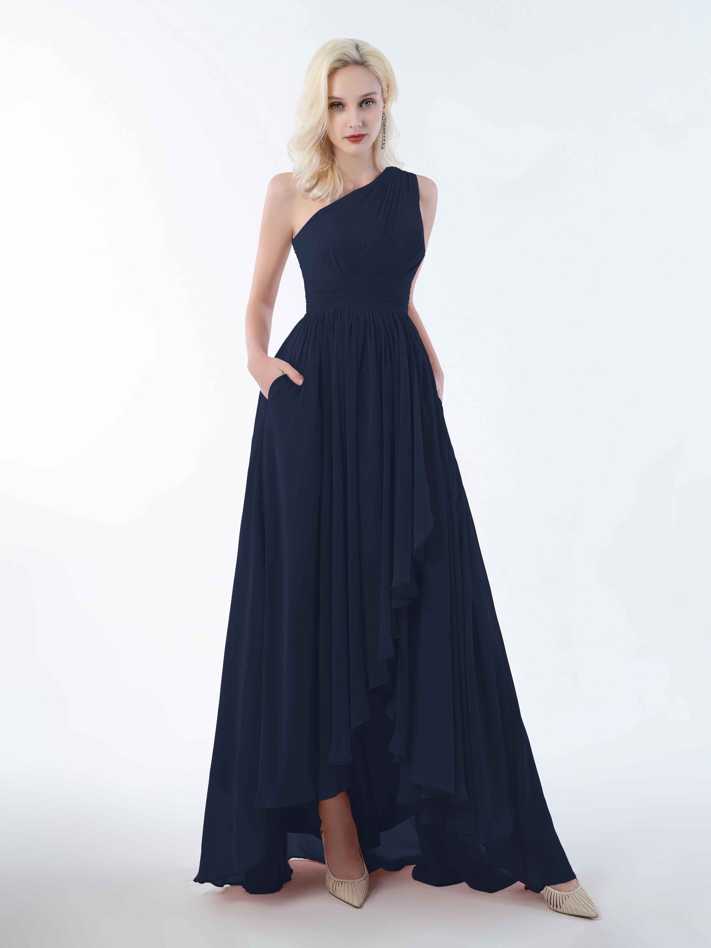 Absolutely loved this dress for my sister's wedding! The one-shoulder cut is elegant but not too fussy, and the high-low hem made twirling down the aisle ridiculously fun. The chiffon is soft and breathable, even in the slightly sweaty church pews. And honestly, the pockets? Game changer. I could carry my lipstick and tissues without looking like I was sneaking snacks into the ceremony!