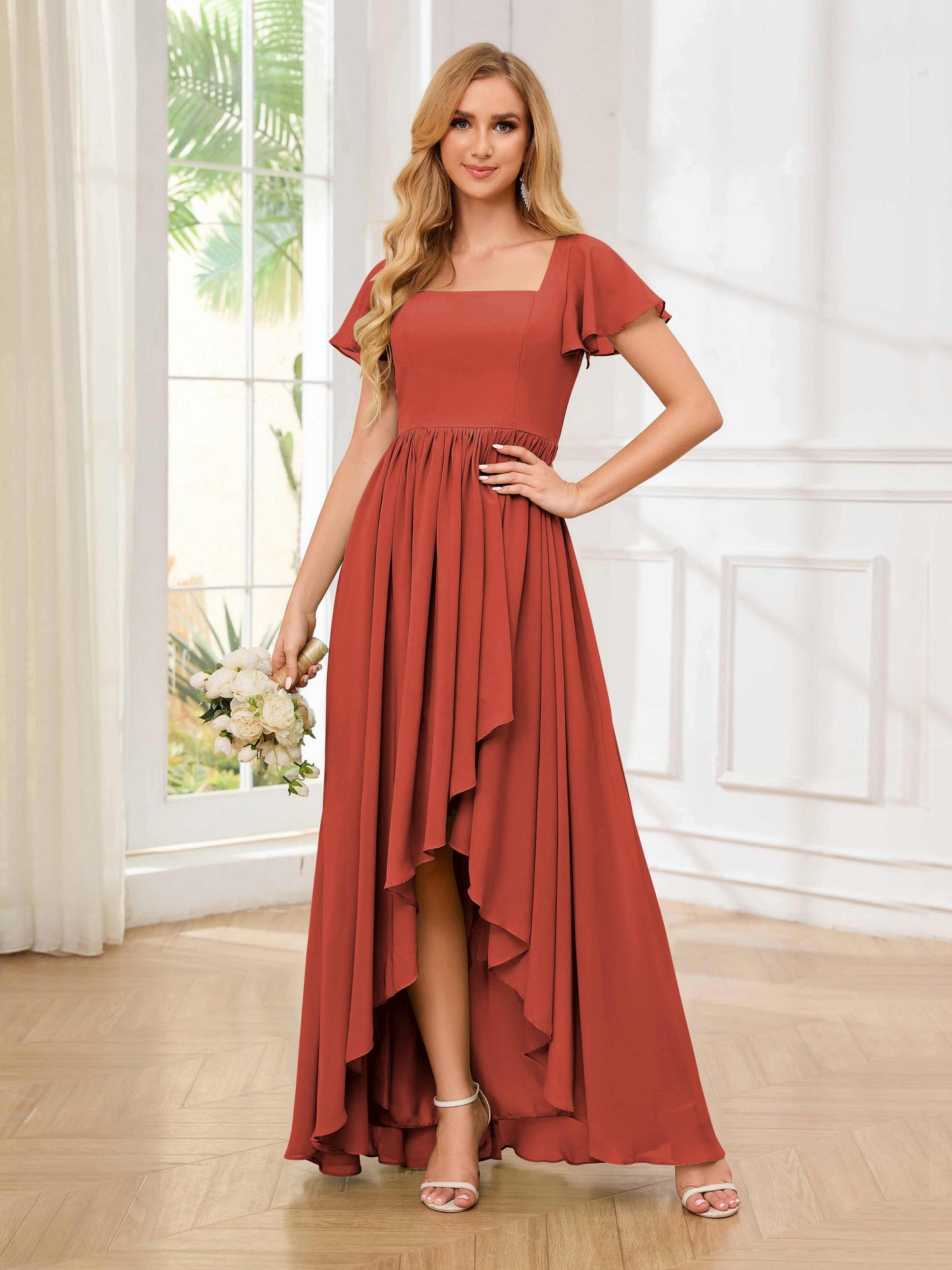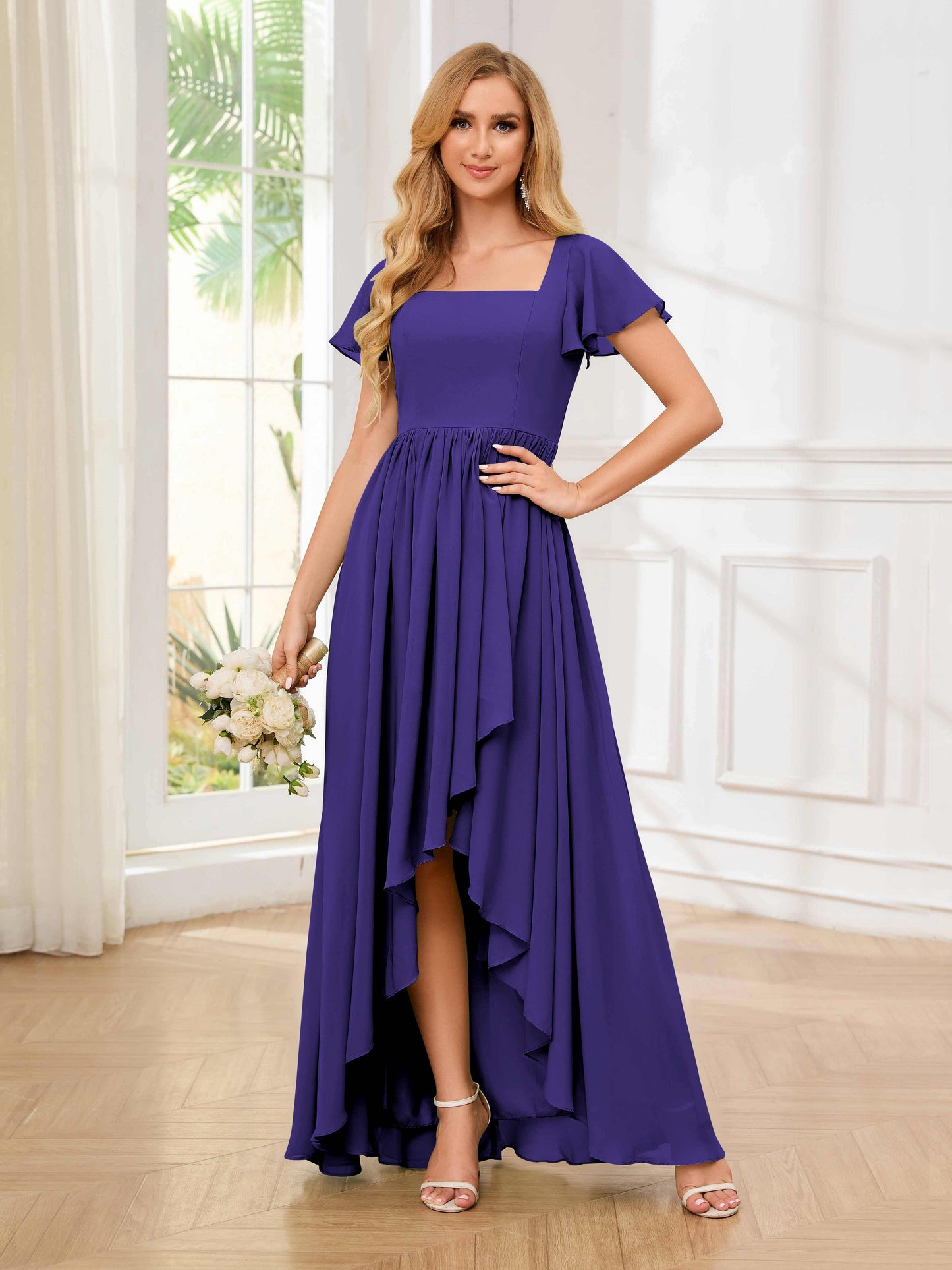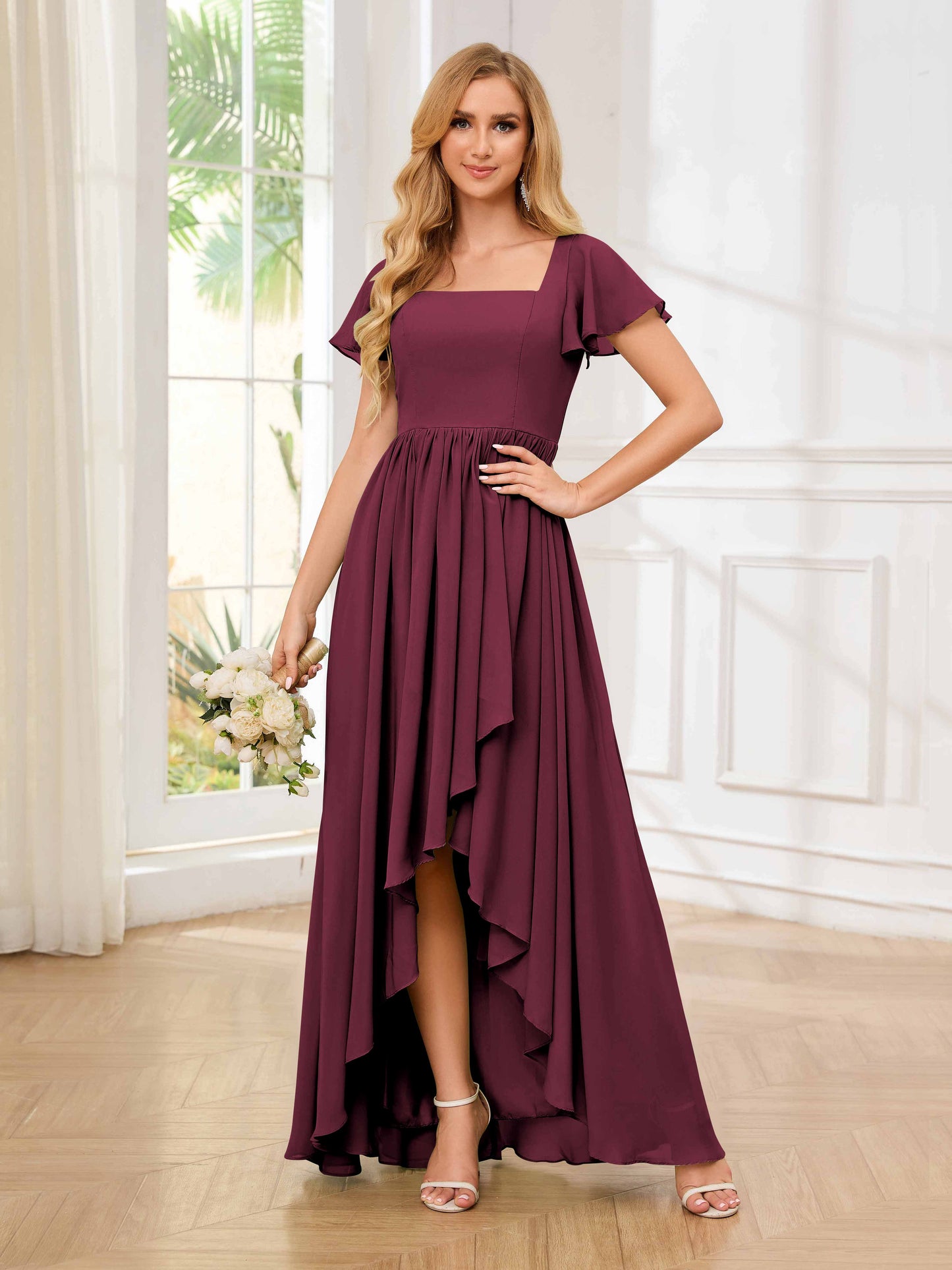 Modern Square Neck Ruffles High-Low Chiffon Bridesmaid Dresses UK
