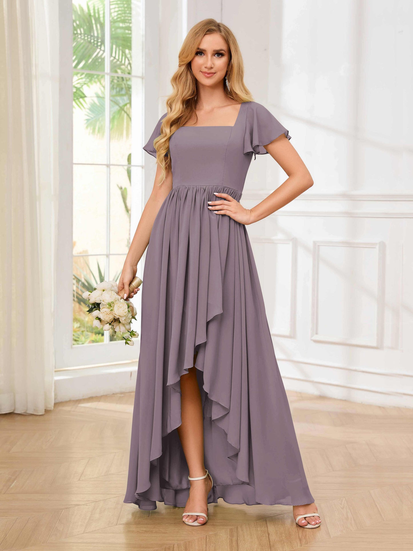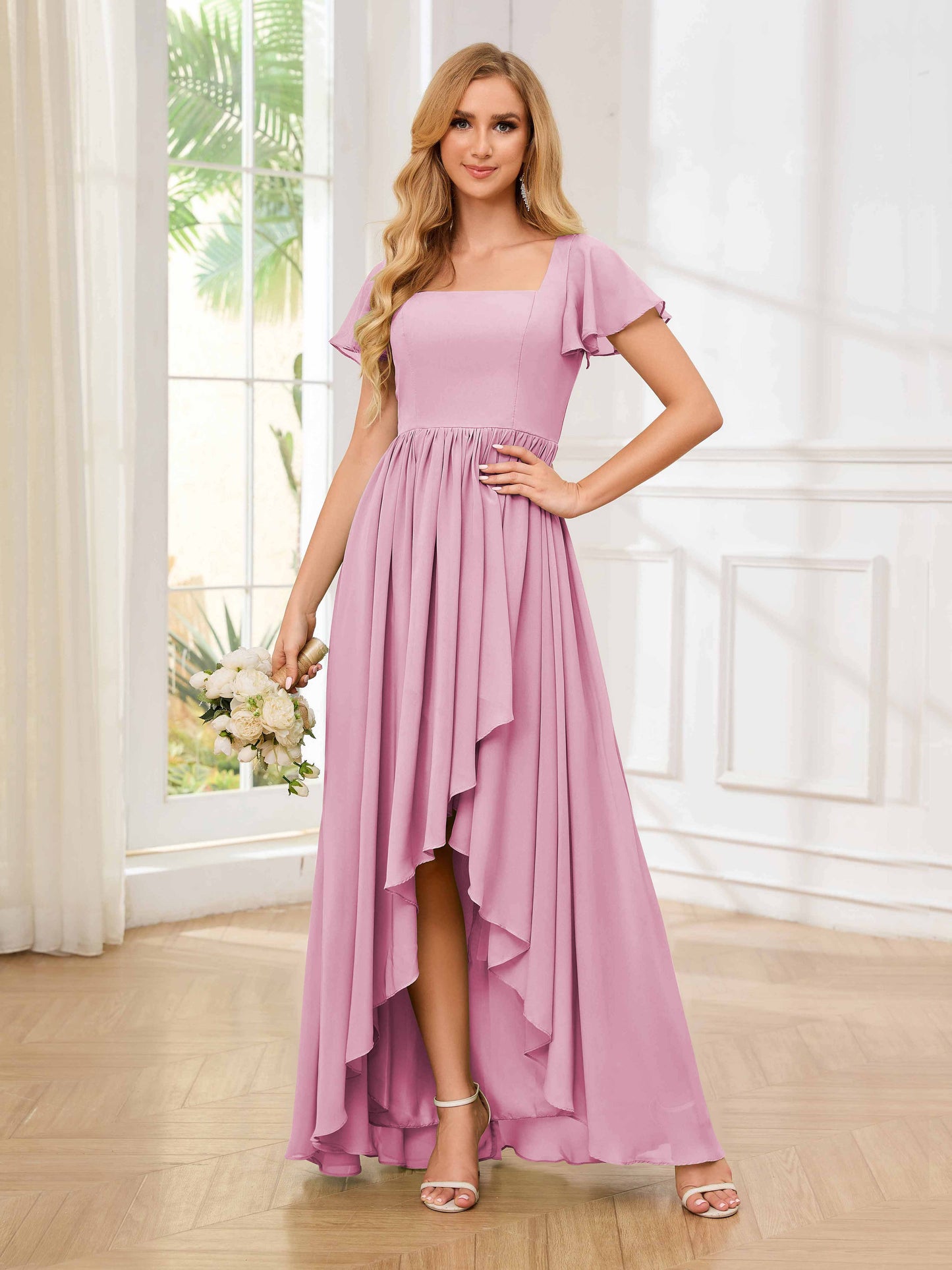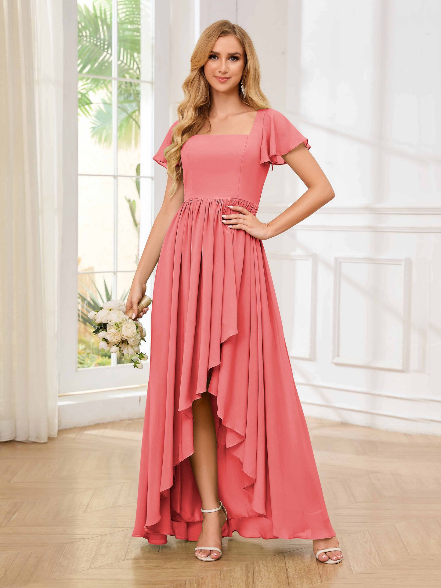 Modern Square Neck Ruffles High-Low Chiffon Bridesmaid Dresses UK