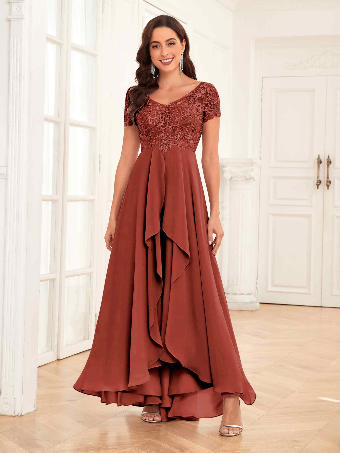 Modern V Neck Ruffles Lace Appliques Maxi Mother Of The Bride & Groom Dresses
