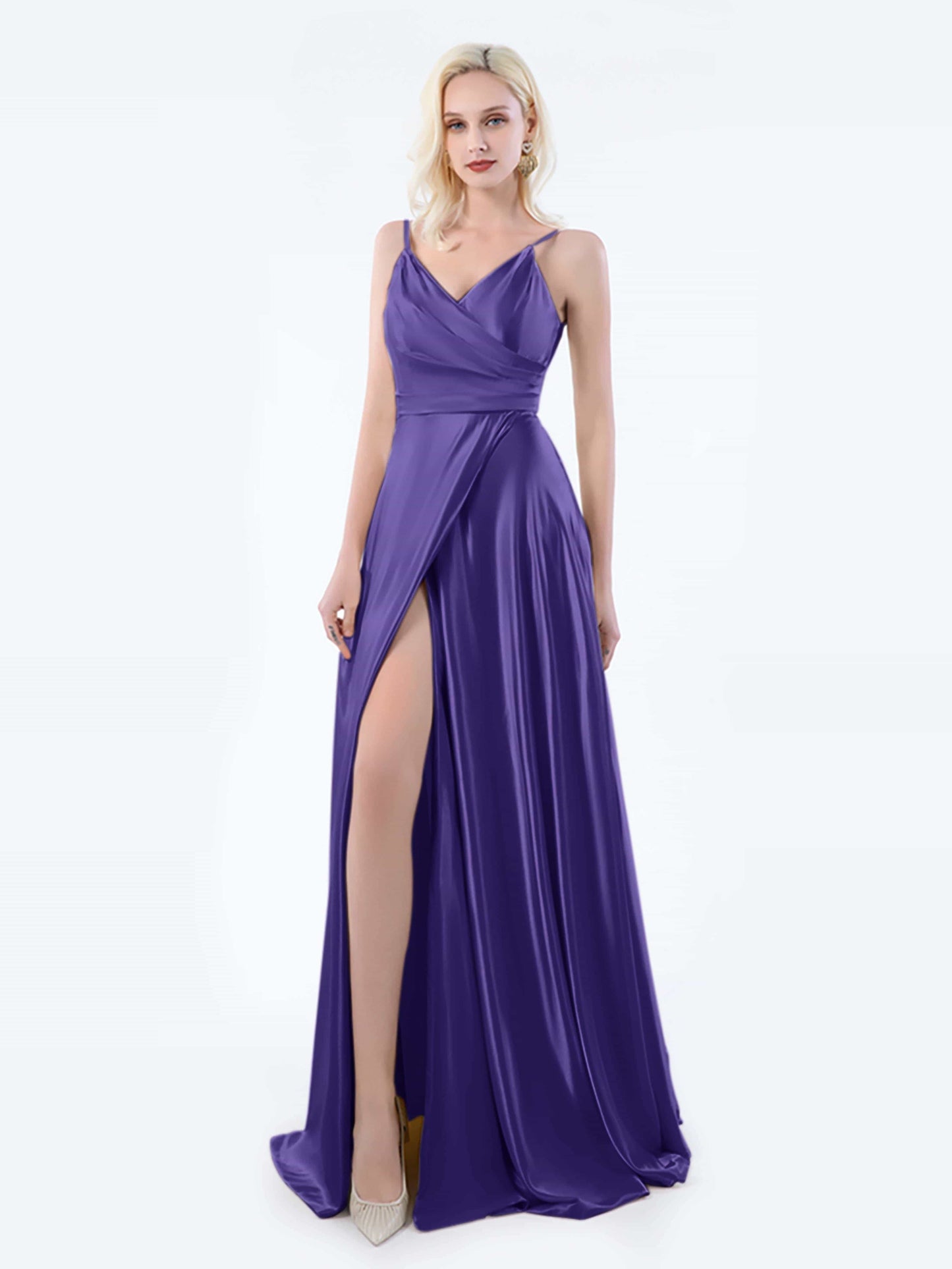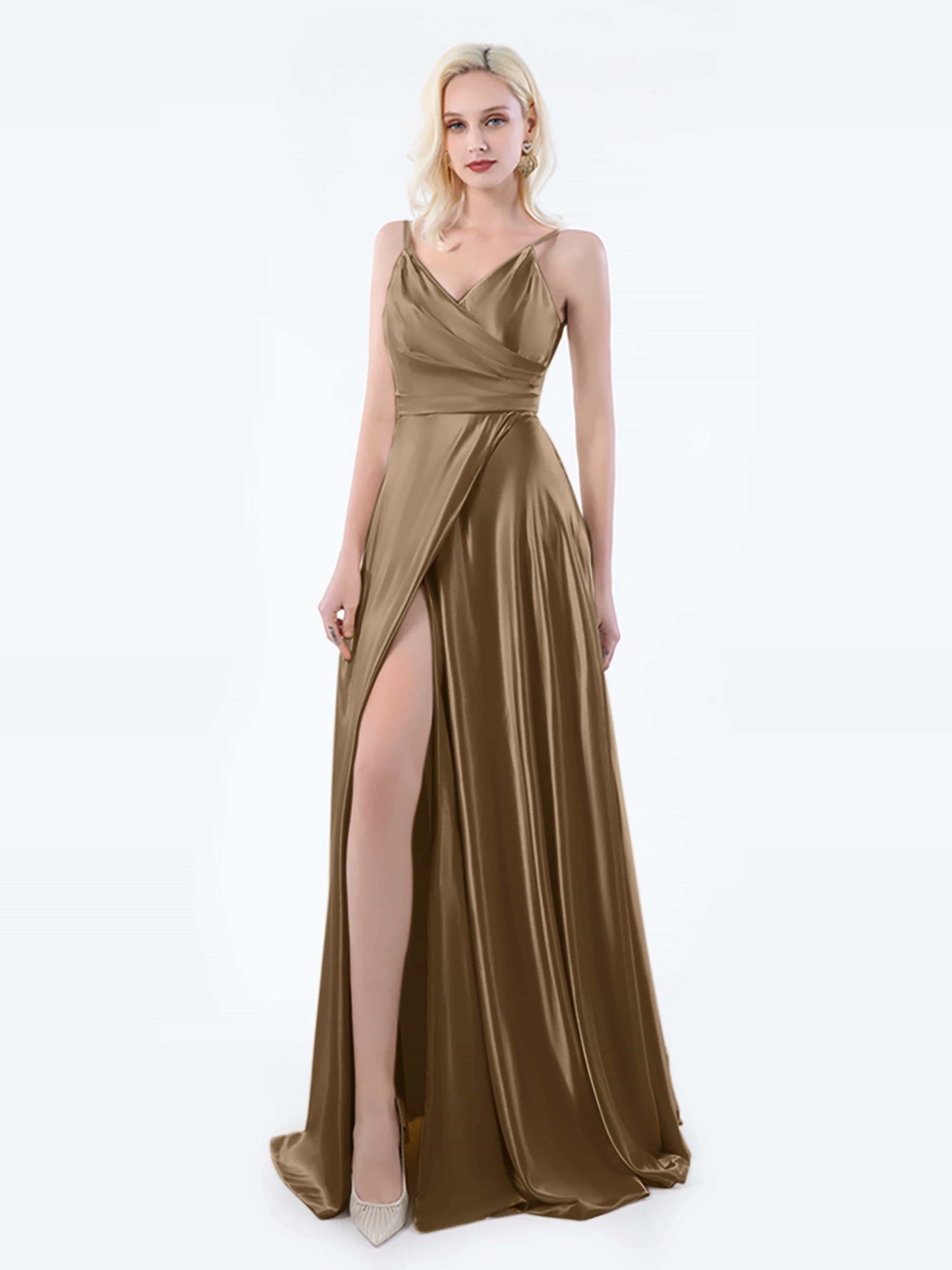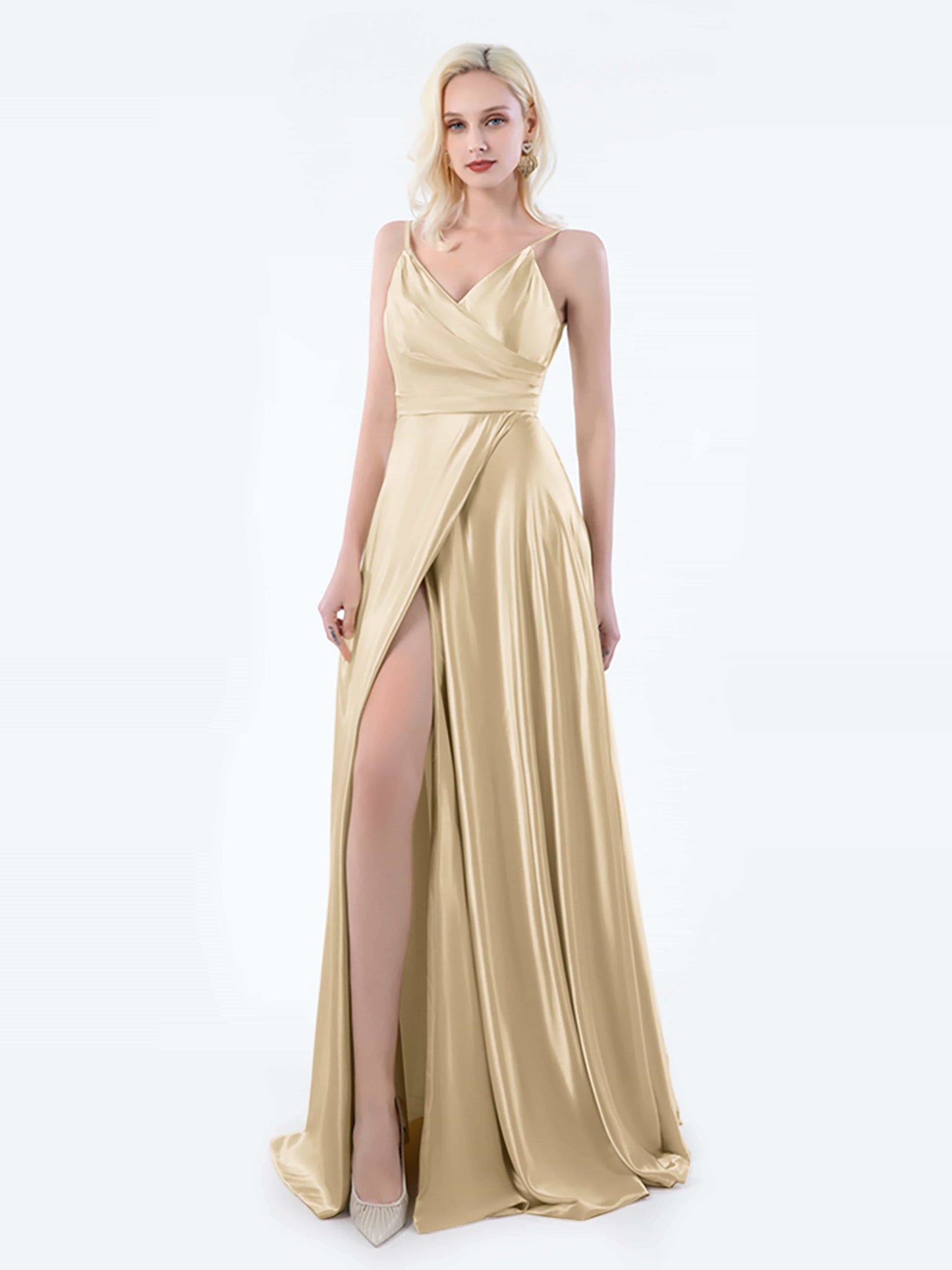 Modern V Neck Spaghetti Straps Slit Satin Bridesmaid Dresses UK