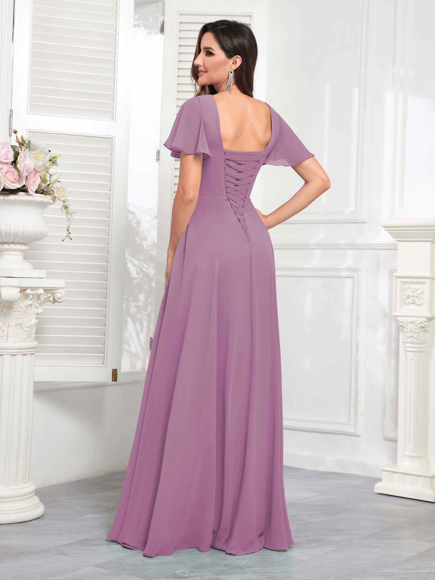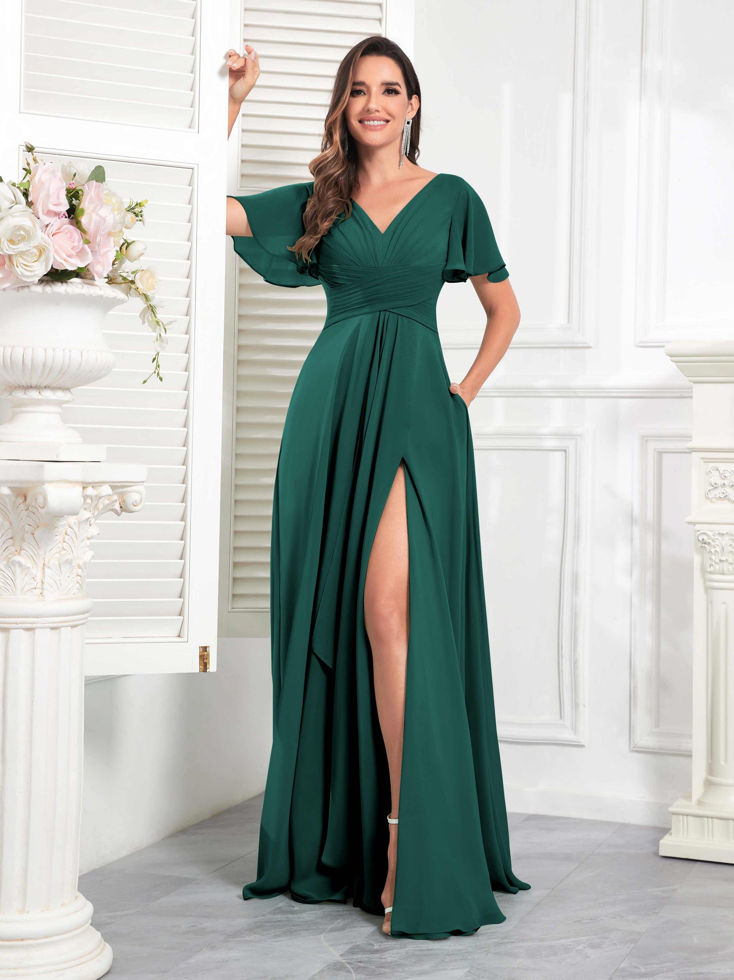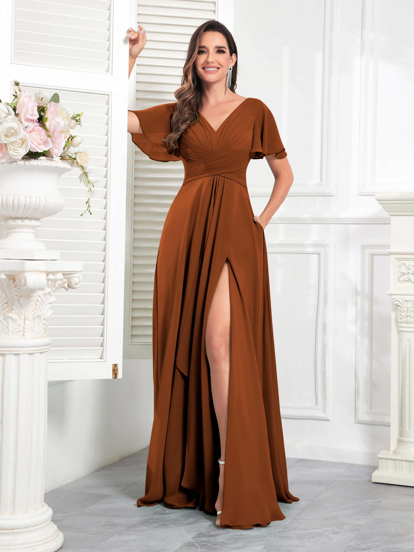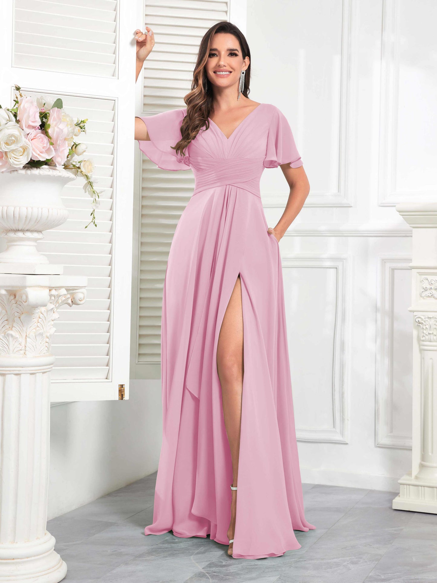 • Mollyevers' Modest A-Line Short Sleeves Ruffles Maxi Chiffon Bridesmaid Dress combines elegance and comfort. Featuring delicate ruffles, short sleeves, a flattering A-line silhouette, and handy pockets, this chiffon dress offers timeless beauty and practicality for your bridesmaids on your special day.