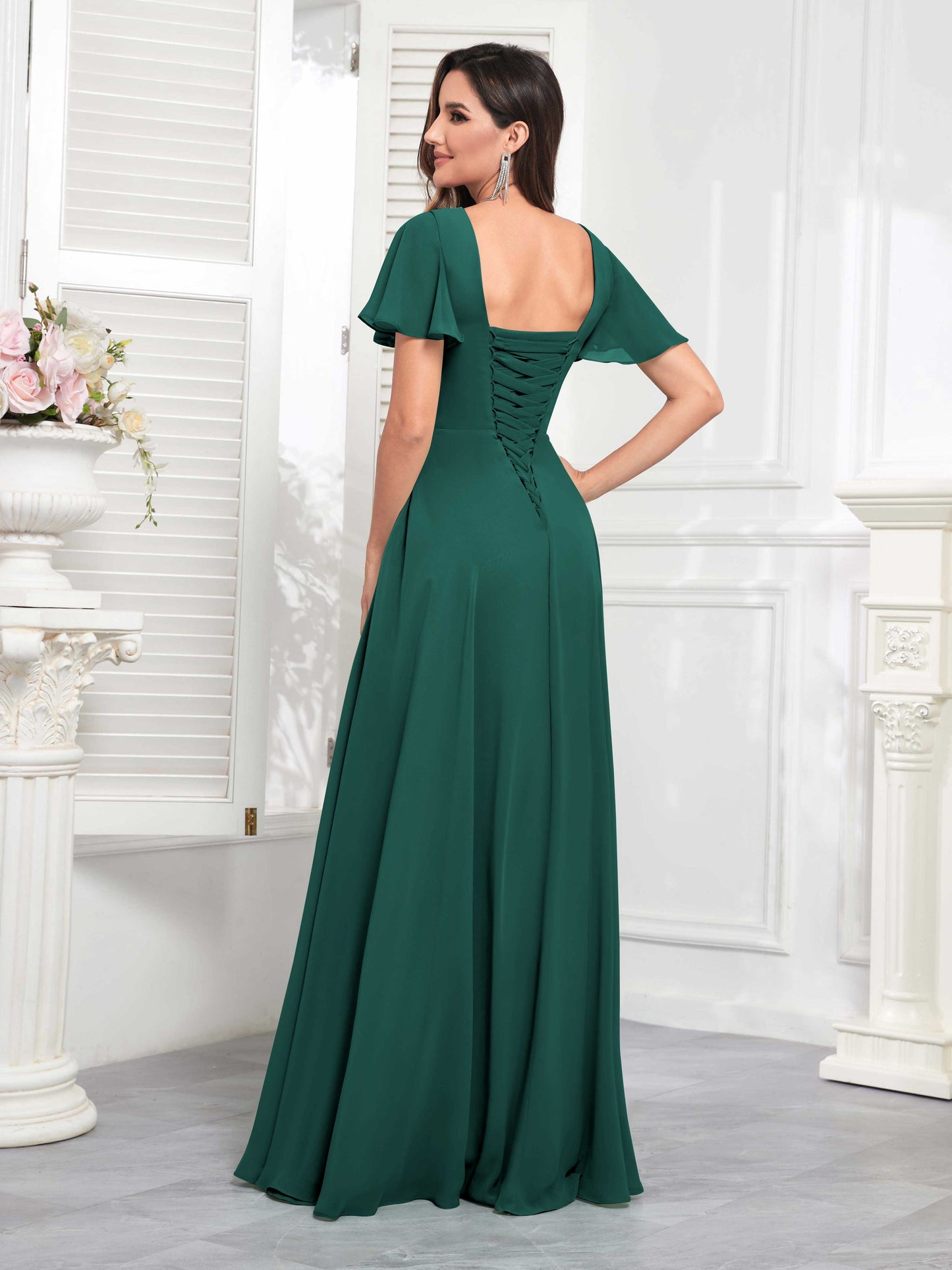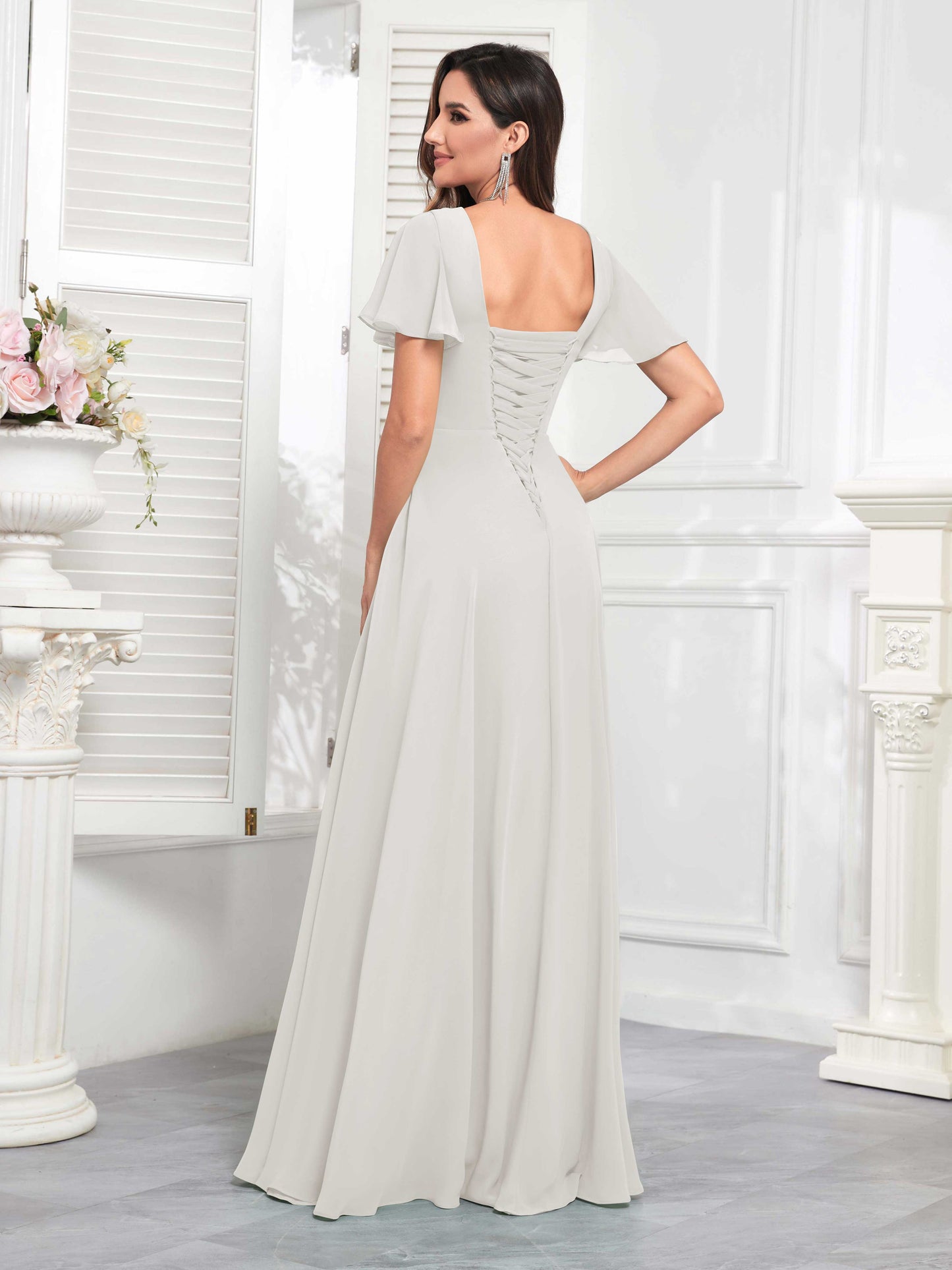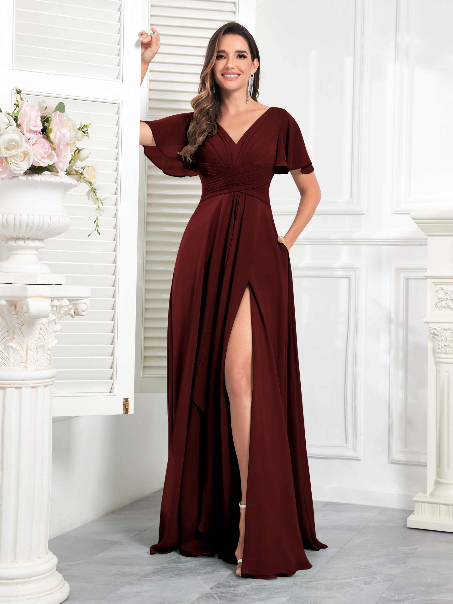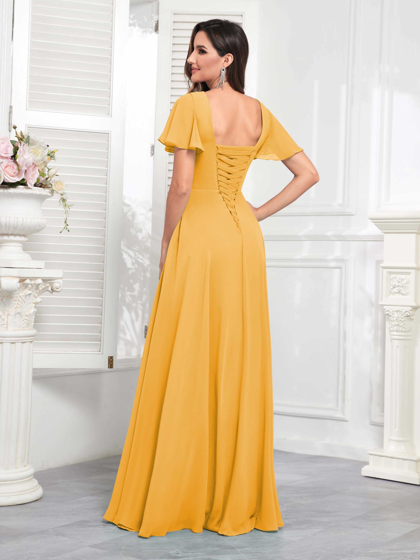 • Mollyevers' Modest A-Line Short Sleeves Ruffles Maxi Chiffon Bridesmaid Dress combines elegance and comfort. Featuring delicate ruffles, short sleeves, a flattering A-line silhouette, and handy pockets, this chiffon dress offers timeless beauty and practicality for your bridesmaids on your special day.