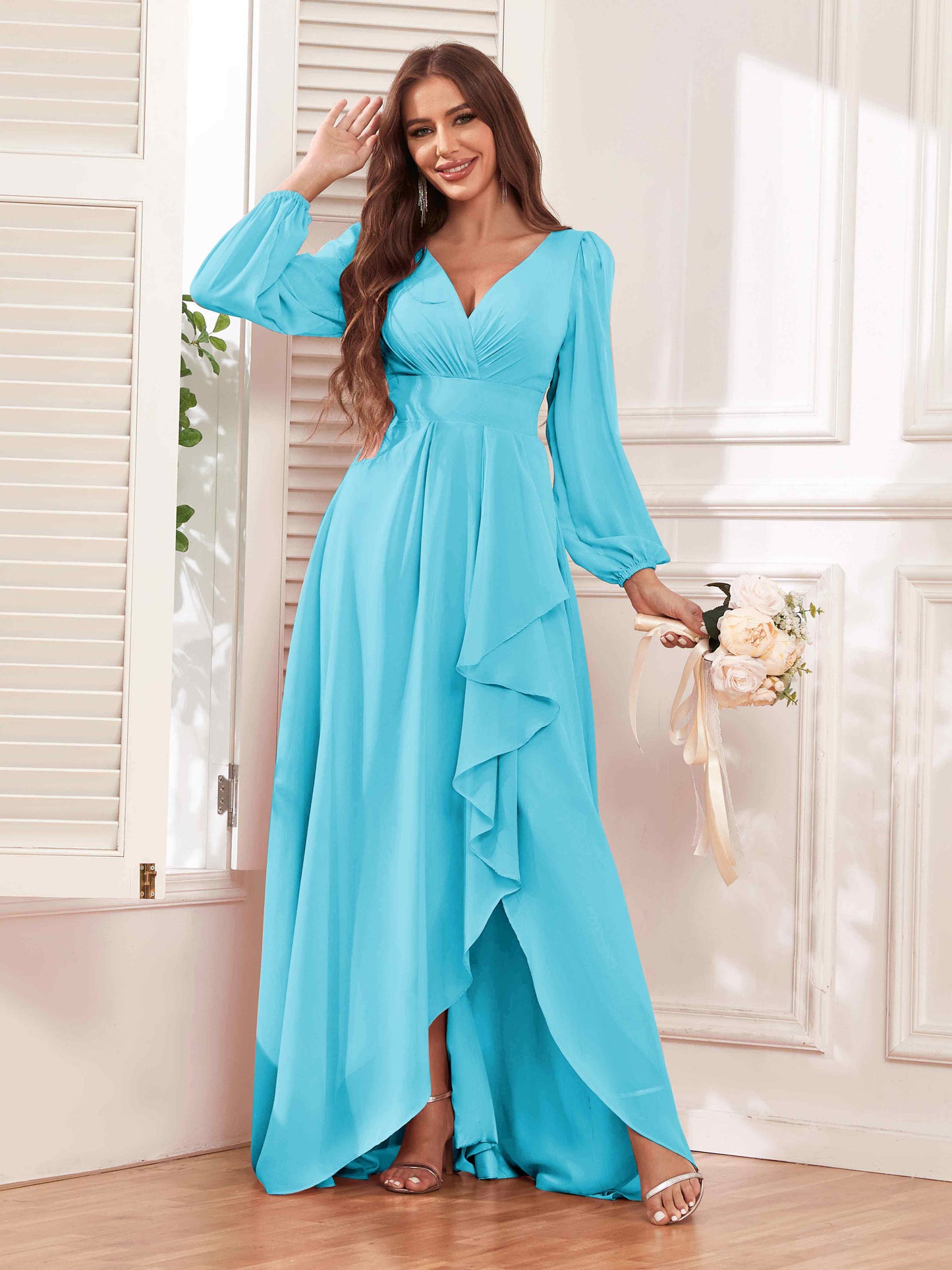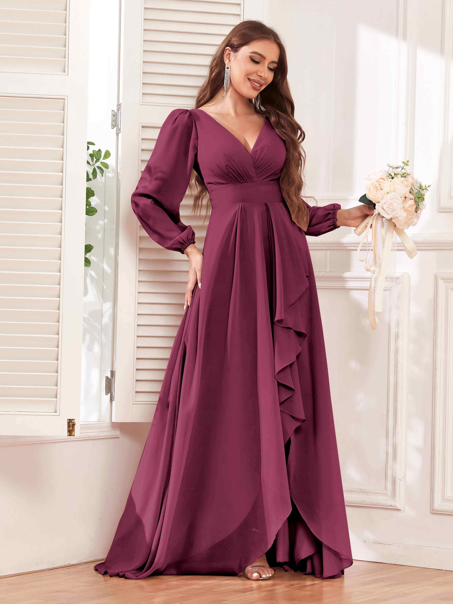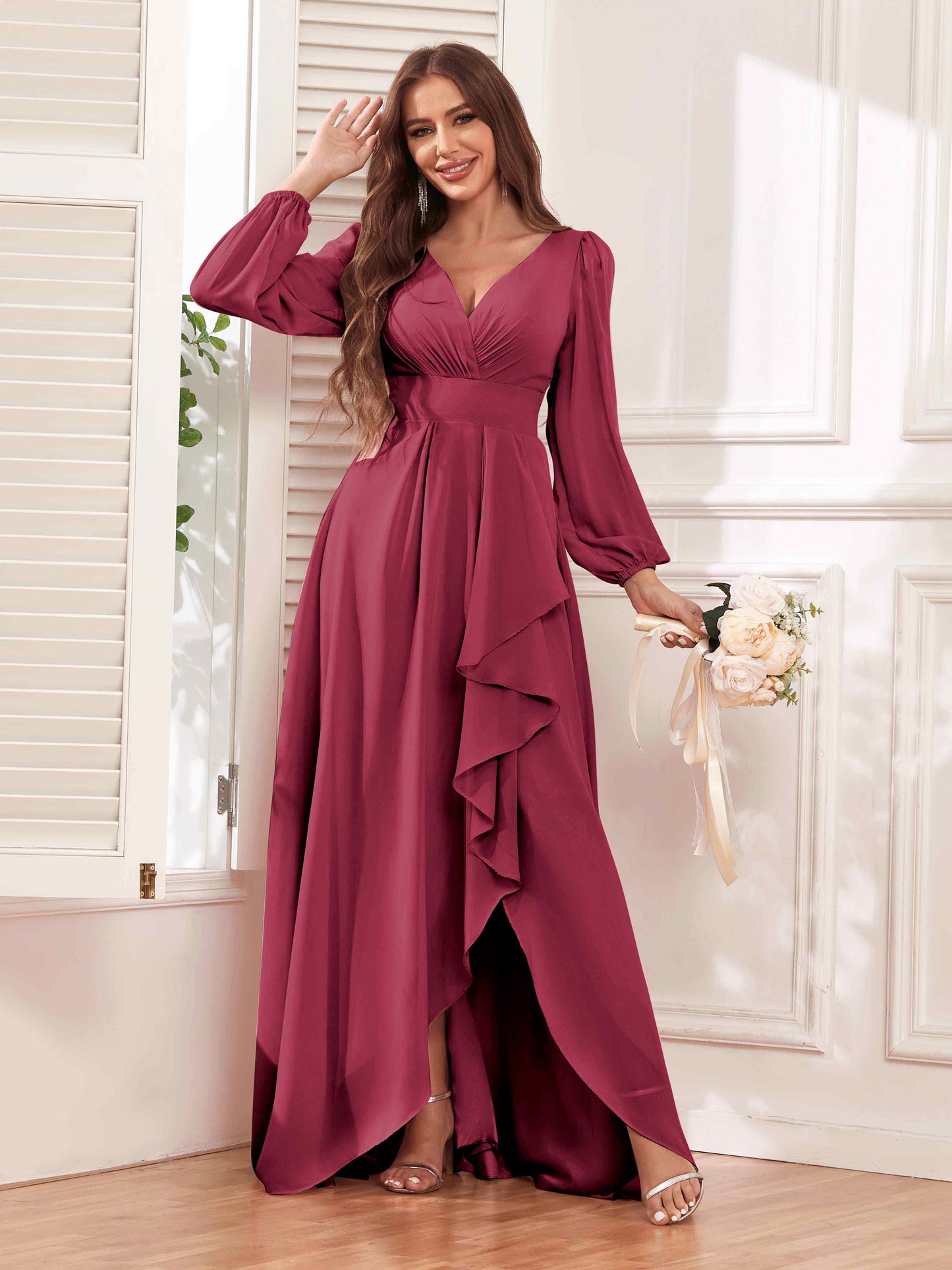 • Embrace modesty and femininity with Mollyevers' chiffon bridesmaid dress featuring ruffled details, long sleeves, and a V-neckline. The ruffled details create a romantic look, while the long sleeves provide coverage. This dress is perfect for those who want to look elegant and refined while supporting the bride.