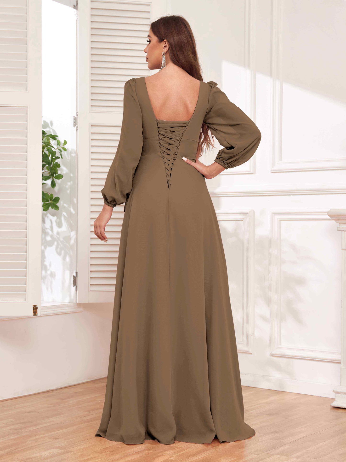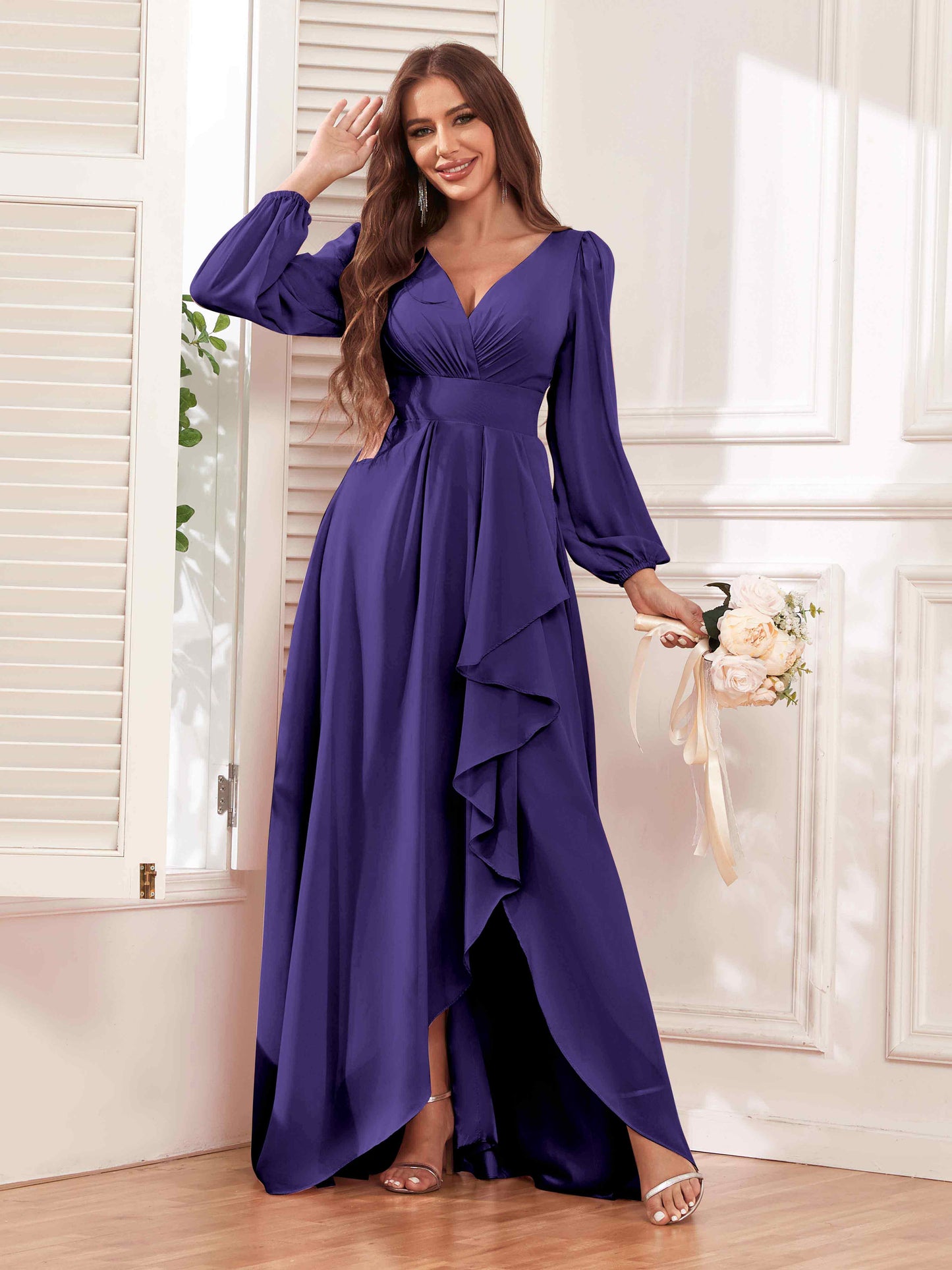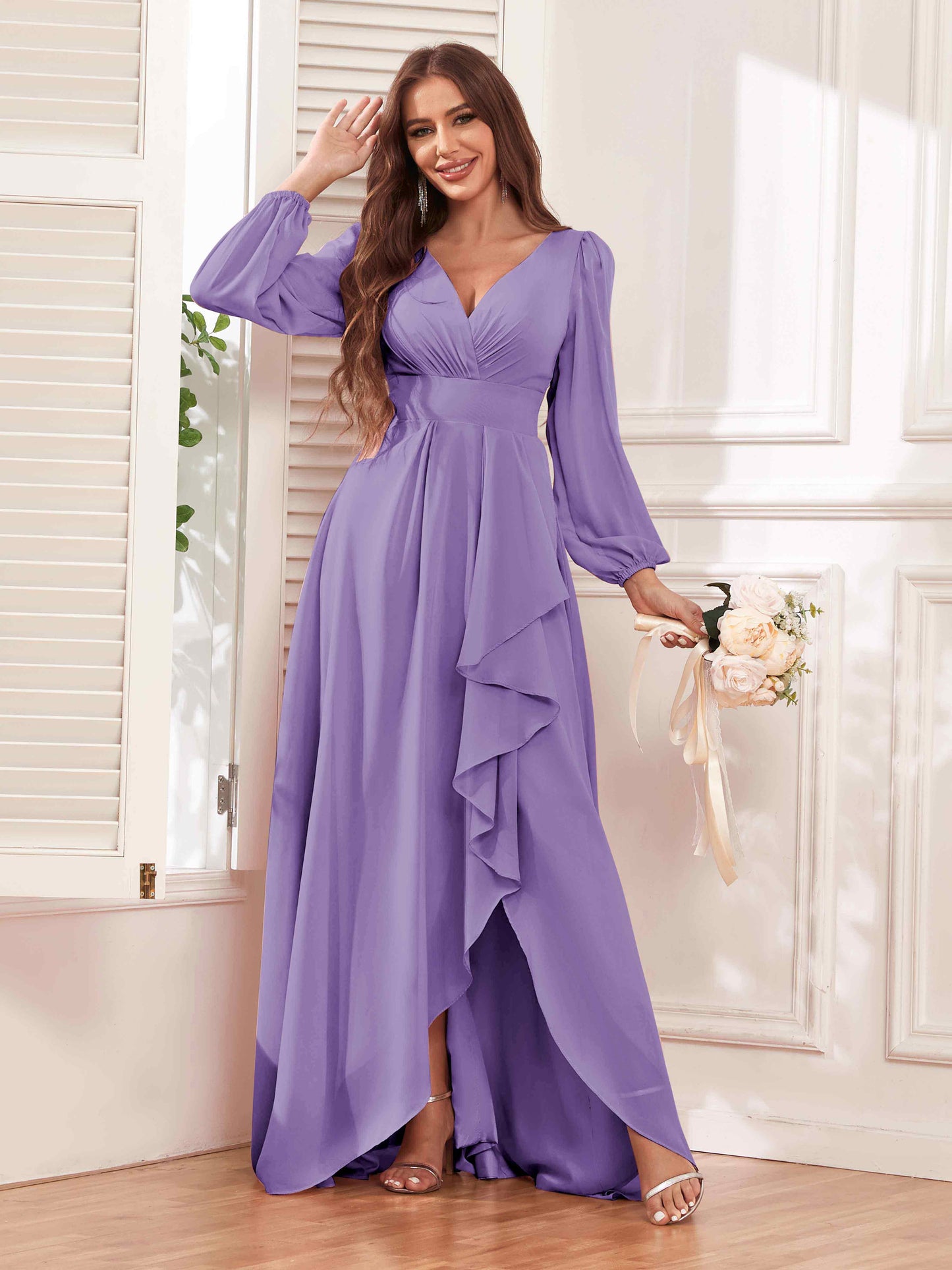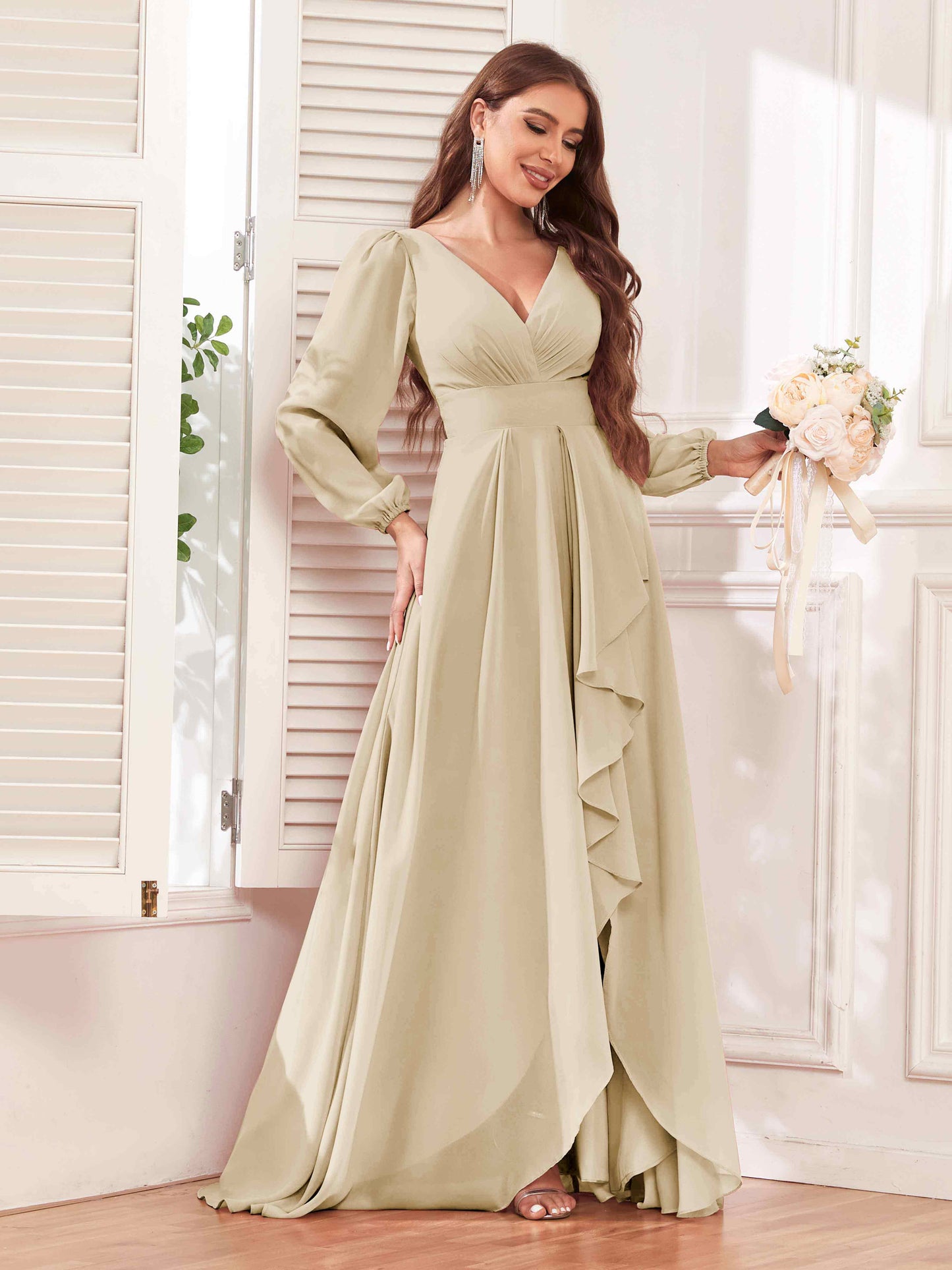 • Embrace modesty and femininity with Mollyevers' chiffon bridesmaid dress featuring ruffled details, long sleeves, and a V-neckline. The ruffled details create a romantic look, while the long sleeves provide coverage. This dress is perfect for those who want to look elegant and refined while supporting the bride.